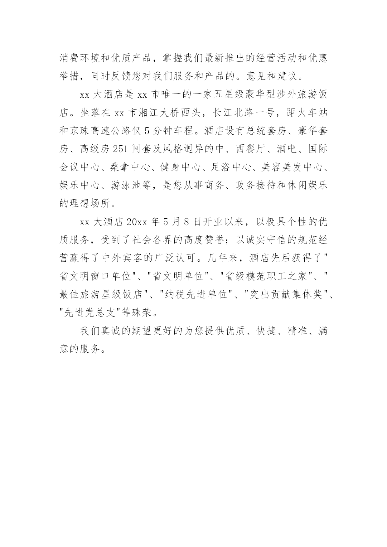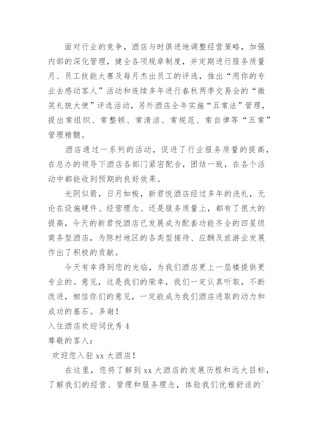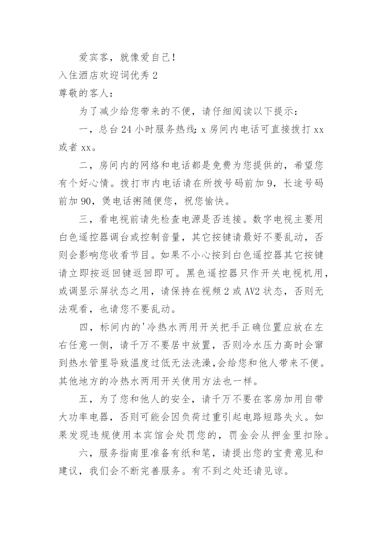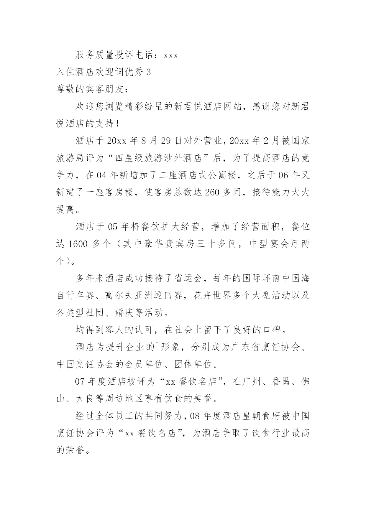 入住酒店欢迎词优秀入住酒店欢迎词优秀随着社会不断地进步,我们可以使用欢迎词的机会越来越多,按照惯例和程序,在节庆活动开幕式上,常常要由一位东道主方面的要员向来宾敬致一篇热情洋溢的欢迎词。来参考自己需要的欢迎词吧!下面是小编收集整理的入住酒店欢迎词优秀,欢迎大家借鉴与参考,希望对大家有所帮助。入住酒店欢迎词优秀1各位亲爱的朋友们:欢迎您光临xx酒店,“有朋自远方来,不亦乐乎”,能有机会为阁下提供服务是我们xx酒店全体员工的荣幸!xx酒店取得今天的业绩,承蒙社会各界朋友的关心支持。在此,我谨代表中天xx酒店全体员工对您一直以来的关心和鼎力支持致以最诚挚的感谢和崇高的敬意。xx酒店将一直秉承“体验殷勤待客之道,感受至尊非凡礼遇”的服务理念,力求做到让每一位宾客倍感温馨舒适,让远离家乡的您感觉到自己就在朋友中间。xx酒店人人始终相信,对爱的渴望是所有人的本能,我们将首先把我们的.爱心奉献给我们的员工,再通过我们的员工将这份爱传递给每一位宾客。我们将全力以赴使我们的员工能普遍拥有一颗爱心,用这份爱心为您创造温暖和快乐!爱宾客,就像爱自己!入住酒店欢迎词优秀2尊敬的客人:为了减少给您带来的不便,请仔细阅读以下提示:一,总台24小时服务热线:x房间内电话可直接拨打xx或者xx。二,房间内的网络和电话都是免费为您提供的,希望您有个好心情。拨打市内电话请在所拨号码前加9,长途号码前加90,煲电话粥随便您,祝您愉快。三,看电视前请先检查电源是否连接。数字电视主要用白色遥控器调台或控制音量,其它按键请最好不要乱动,否则会影响您收看节目。如果不小心按到白色遥控器其它按键请立即按返回键返回即可。黑色遥控器只作开关电视机用,或调显示屏状态之用,请保持在视频2或AV2状态,否则无法观看,也请您不要乱动。四,标间内的'冷热水两用开关把手正确位置应放在左右任意一侧,请千万不要居中放置,否则冷水压力高时会窜到热水管里导致温度过低无法洗澡,会给您和他人带来不便。其他地方的冷热水两用开关使用方法也一样。五,为了您和他人的安全,请千万不要在客房加用自带大功率电器,否则可能会因负荷过重引起电路短路失火。如果发现违规使用本宾馆会处罚您的,罚金会从押金里扣除。六,服务指南里准备有纸和笔,请提出您的宝贵意见和建议,我们会不断完善服务。有不到之处还请见谅。服务质量投诉电话:xxx入住酒店欢迎词优秀3尊敬的宾客朋友:欢迎您浏览精彩纷呈的新君悦酒店网站,感谢您对新君悦酒店的支持!酒店于20xx年8月29日对外营业,20xx年2月被国家旅游局评为“四星级旅游涉外酒店”后,为了提高酒店的竞争力,在04年新增加了二座酒店式公寓楼,之后于06年又新建了一座客房楼,使客房总数达260多间,接待能力大大提高。酒店于05年将餐饮扩大经营,增加了经营面积,餐位达1600多个(其中豪华贵宾房三十多间,中型宴会厅两个)。多年来酒店成功接待了省运会,每年的国际环南中国海自行车赛、高尔夫亚洲巡回赛,花卉世界多个大型活动以及各类型社团、婚庆等活动。均得到客人的认可,在社会上留下了良好的口碑。酒店为提升企业的`形象,分别成为广东省烹饪协会、中国烹饪协会的会员单位、团体单位。07年度酒店被评为“xx餐饮名店”,在广州、番禺、佛山、大良等周边地区享有饮食的美誉。经过全体员工的共同努力,08年度酒店皇朝食府被中国烹饪协会评为“xx餐饮名店”,为酒店争取了饮食行业最高的荣誉。面对行业的竞争,酒店与时俱进地调整经营策略,加强内部的深化管理,健全各项规章制度,并定期进行服务质量月、员工技能大赛及每月杰出员工的评选,推出“用你的专业去感动客人”活动和连续多年进行春秋两季交易会的“微笑礼貌大使”评选活动,另外酒店全年实施“五常法”管理,提出常组织、常整顿、常清洁、常规范、常自律等“五常”管理精髓。酒店通过一系列的活动,促进了行业服务质量的提高,在总办的领导下酒店各部门紧密配合,团结一致,在各个活动中都能收到预期的良好效果。光阴似箭,日月如梭,新君悦酒店经过多年的洗礼,无论在设施硬件、经营理念、还是服务质量上,都有了很大的提高,今天的新君悦酒店已发展成为配套功能齐全的四星级商务型酒店,为陈村地区的各类型接待、应酬及旅游业发展作出了积极的贡献。今天有幸得到您的光临,为我们酒店更上一层楼提供更专业的。意见,这是我们的荣幸,我们一定认真听取,不断改进,相信你们的意见,一定能成为我们酒店进取的动力和成功的基石。多谢!入住酒店欢迎词优秀4尊敬的客人:欢迎您入驻xx大酒店!在这里,您将了解到xx大酒店的发展历程和远大目标,了解我们的经营、管理和服务理念,体验我们优雅舒适的`消费环境和优质产品,掌握我们最新推出的经营活动和优惠举措,同时反馈您对我们服务和产品的。意见和建议。xx大酒店是xx市唯一的一家五星级豪华型涉外旅游饭店。坐落在xx