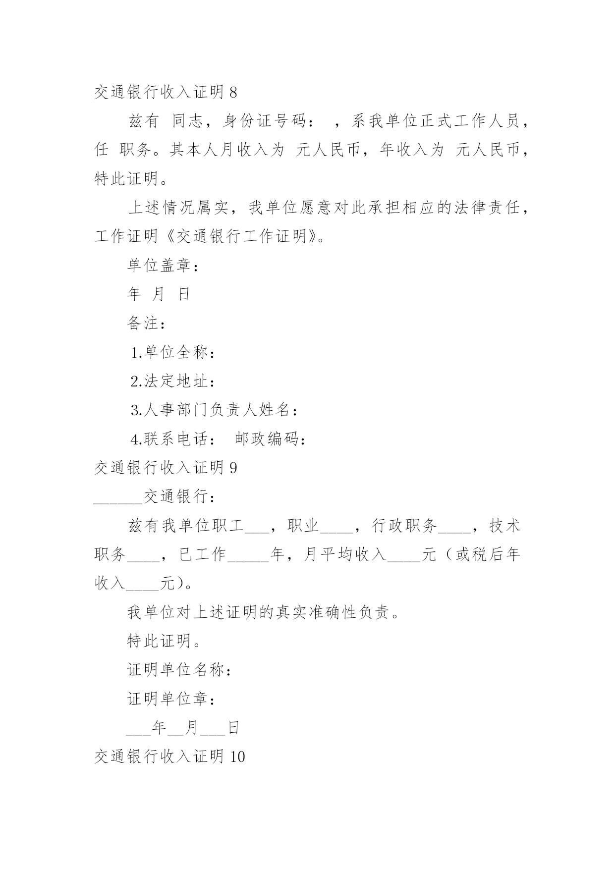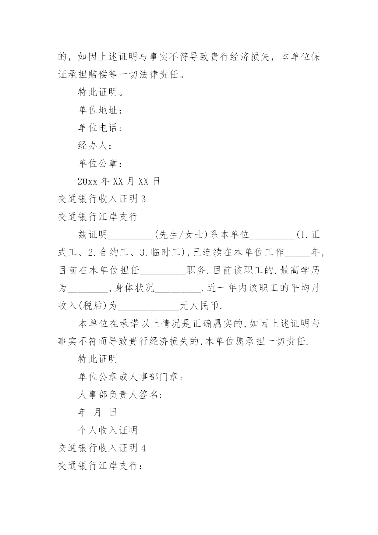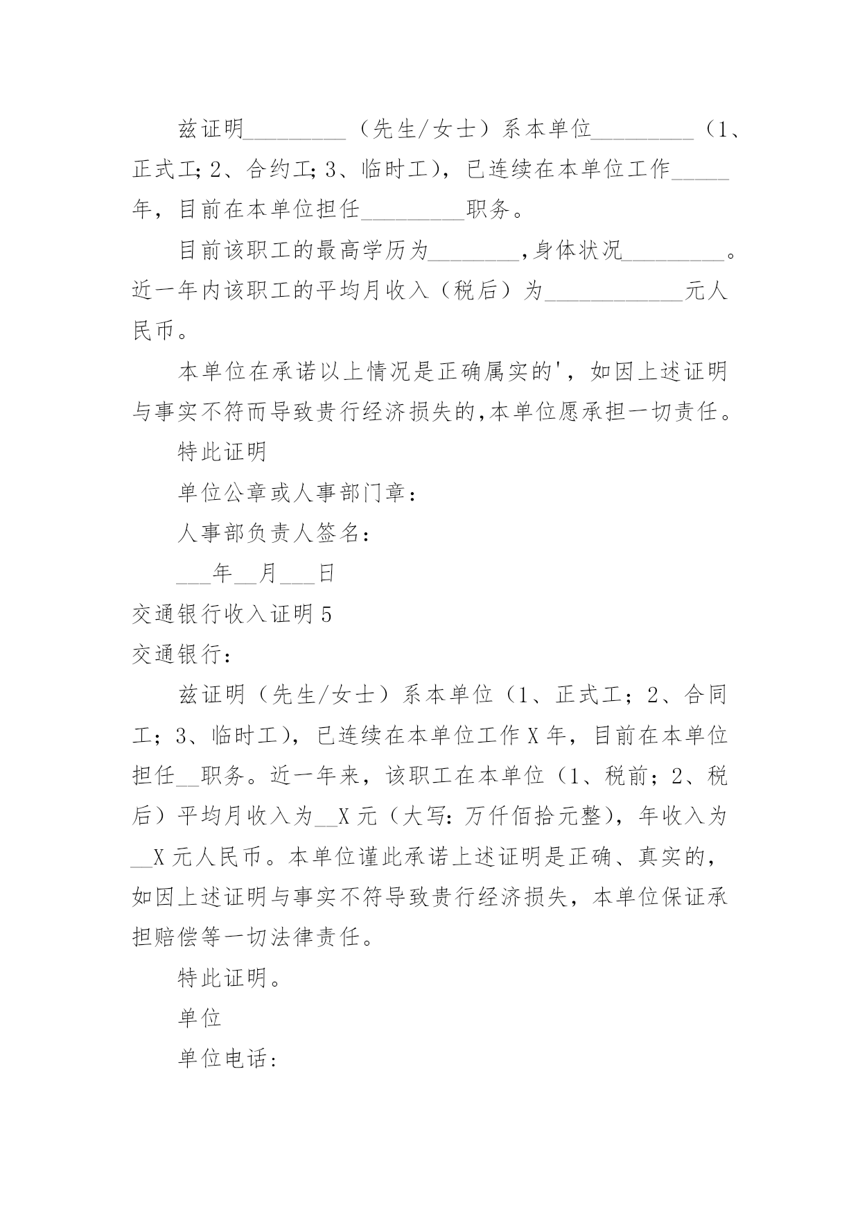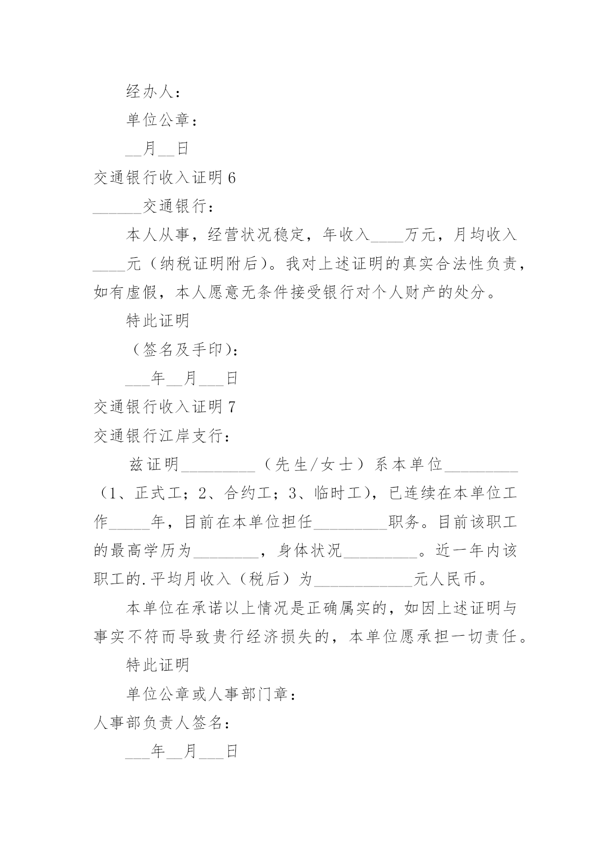 交通银行收入证明交通银行收入证明在学习、工作或生活中,大家都经常接触到证明吧,当我们要想证明某个事实是真的时,最好的办法就是出具证明。拟起证明来就毫无头绪?以下是小编为大家收集的交通银行收入证明,欢迎大家借鉴与参考,希望对大家有所帮助。交通银行收入证明1______银行:兹___先生/女士为个体经营户(小规模纳税人),现已经营___年,任法人代表,现在的每月的主营业务收入为_____。联系电话联系人个体经营户名称个体经营户地址交通银行收入证明2交通银行:兹证明(先生/女士)系本单位(1、正式工;2、合同工;3、临时工),已连续在本单位工作X年,目前在本单位担任XX职务。近一年来,该职工在本单位(1、税前;2、税后)平均月收入为XXX元(大写:万仟佰拾元整),年收入为XXX元人民币。本单位谨此承诺上述证明是正确、真实的,如因上述证明与事实不符导致贵行经济损失,本单位保证承担赔偿等一切法律责任。特此证明。单位地址:单位电话:经办人:单位公章:20xx年XX月XX日交通银行收入证明3交通银行江岸支行兹证明_________(先生/女士)系本单位_________(1.正式工、2.合约工、3.临时工),已连续在本单位工作_____年,目前在本单位担任_________职务.目前该职工的.最高学历为________,身体状况_________.近一年内该职工的平均月收入(税后)为____________元人民币.本单位在承诺以上情况是正确属实的,如因上述证明与事实不符而导致贵行经济损失的,本单位愿承担一切责任.特此证明单位公章或人事部门章:人事部负责人签名:年月日个人收入证明交通银行收入证明4交通银行江岸支行:兹证明_________(先生/女士)系本单位_________(1、正式工;2、合约工;3、临时工),已连续在本单位工作_____年,目前在本单位担任_________职务。目前该职工的最高学历为________,身体状况_________。近一年内该职工的平均月收入(税后)为____________元人民币。本单位在承诺以上情况是正确属实的',如因上述证明与事实不符而导致贵行经济损失的,本单位愿承担一切责任。特此证明单位公章或人事部门章:人事部负责人签名:___年__月___日交通银行收入证明5交通银行:兹证明(先生/女士)系本单位(1、正式工;2、合同工;3、临时工),已连续在本单位工作X年,目前在本单位担任__职务。近一年来,该职工在本单位(1、税前;2、税后)平均月收入为__X元(大写:万仟佰拾元整),年收入为__X元人民币。本单位谨此承诺上述证明是正确、真实的,如因上述证明与事实不符导致贵行经济损失,本单位保证承担赔偿等一切法律责任。特此证明。单位单位电话:经办人:单位公章:__月__日交通银行收入证明6______交通银行:本人从事,经营状况稳定,年收入____万元,月均收入____元(纳税证明附后)。我对上述证明的真实合法性负责,如有虚假,本人愿意无条件接受银行对个人财产的处分。特此证明(签名及手印):___年__月___日交通银行收入证明7交通银行江岸支行:兹证明_________(先生/女士)系本单位_________(1、正式工;2、合约工;3、临时工),已连续在本单位工作_____年,目前在本单位担任_________职务。目前该职工的最高学历为________,身体状况_________。近一年内该职工的.平均月收入(税后)为____________元人民币。本单位在承诺以上情况是正确属实的,如因上述证明与事实不符而导致贵行经济损失的,本单位愿承担一切责任。特此证明单位公章或人事部门章:人事部负责人签名:___年__月___日交通银行收入证明8兹有同志,身份证号码:,系我单位正式工作人员,任职务。其本人月收入为元人民币,年收入为元人民币,特此证明。上述情况属实,我单位愿意对此承担相应的法律责任,工作证明《交通银行工作证明》。单位盖章:年月日备注:⒈单位全称:⒉法定地址:⒊人事部门负责人姓名:⒋联系电话:邮政编码:交通银行收入证明9______交通银行:兹有我单位职工___,职业____,行政职务____,技术职务____,已工作_____年,月平均收入____元(或税后年收入____元)。我单位对上述证明的真实准确性负责。特此证明。证明单位名称:证明单位章:___年__月___日交通银行收入证明10兹证明____________是我公司员工,在____________部门任____________职务。至今为止,一年以来总收入约为_______________元。特此证明。本证明仅用于证明我公司员工的工作及在我公司的工资收入,不作为我公司对该员工任何形势的`担保文件。盖章:日期:_________年_