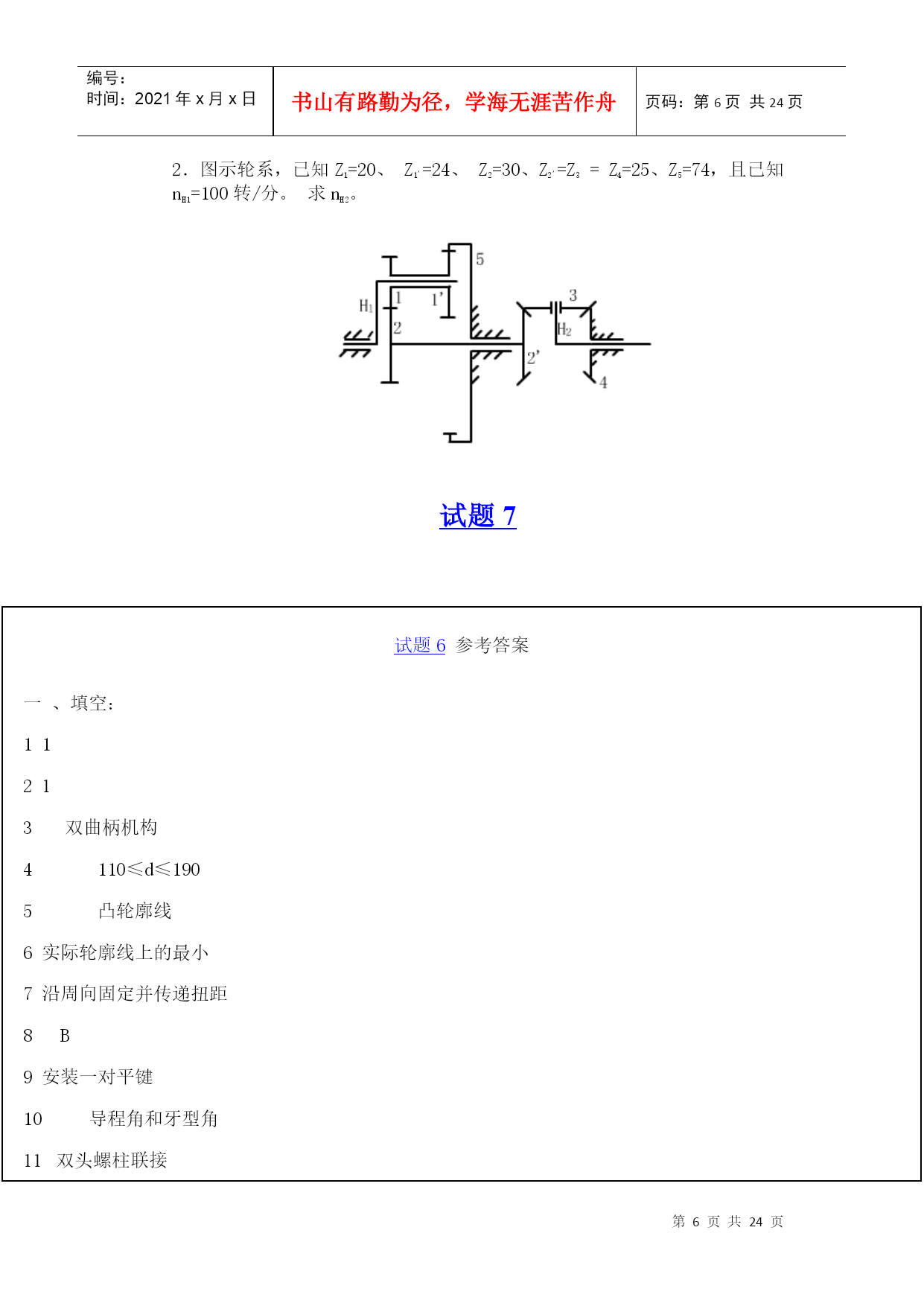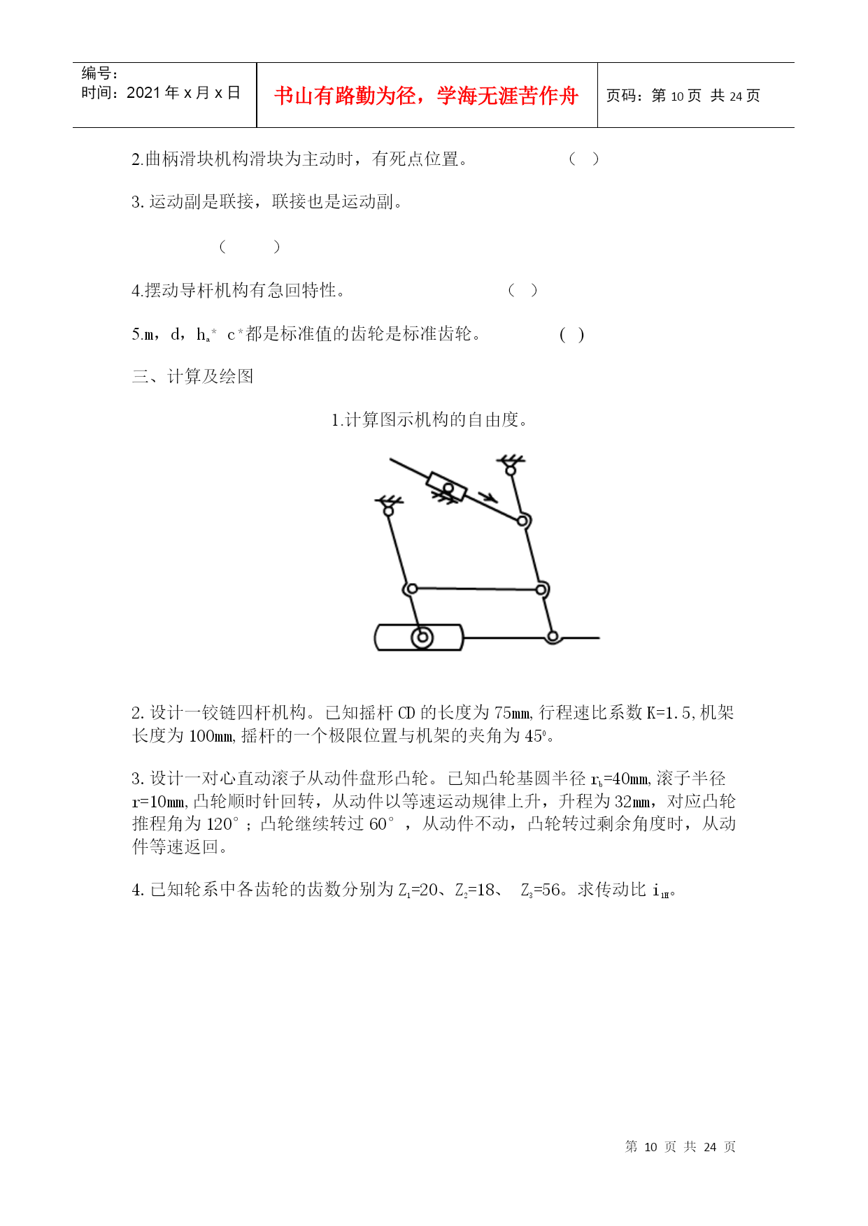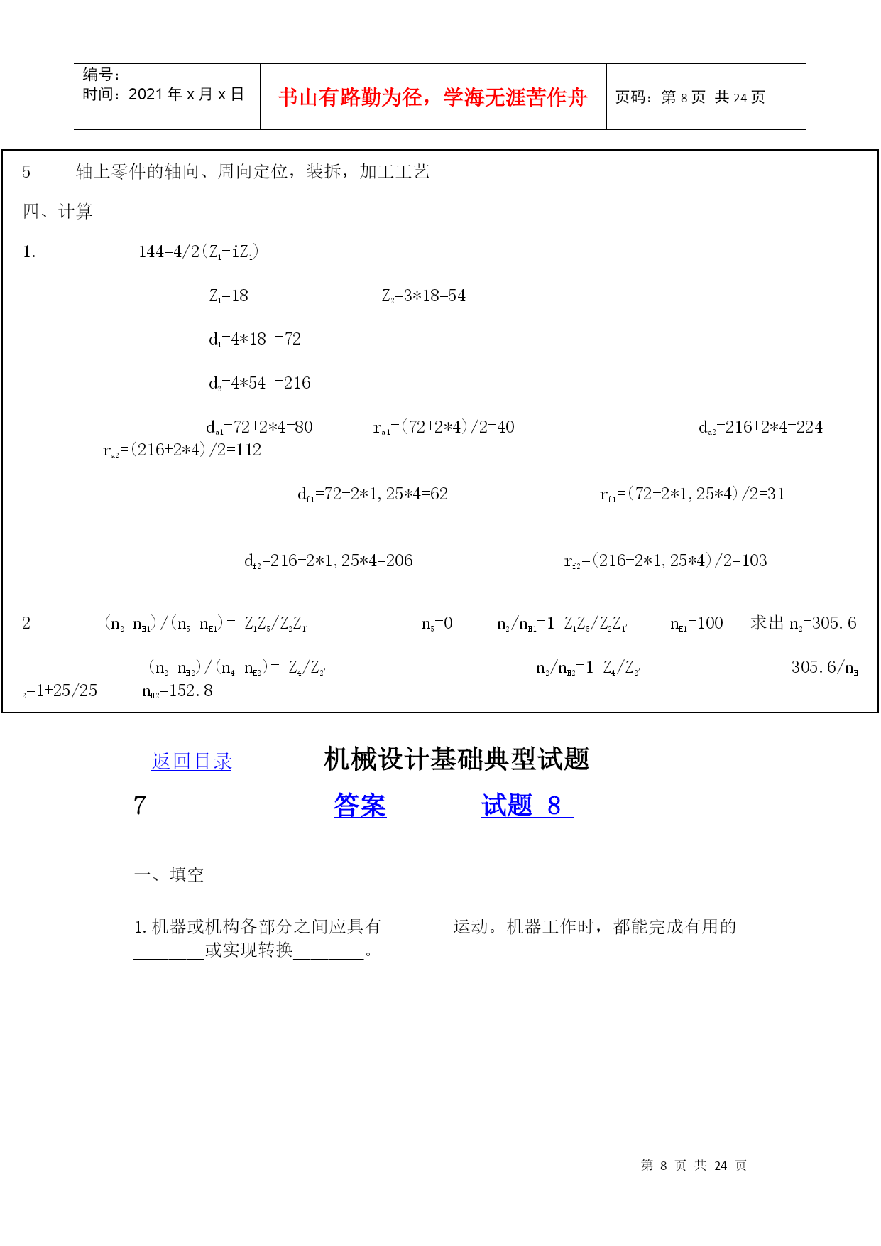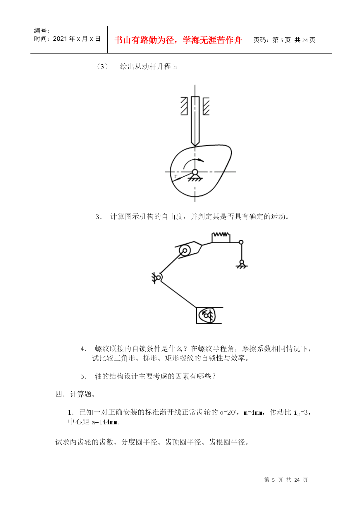 编号:时间:2021年x月x日书山有路勤为径,学海无涯苦作舟页码:第PAGE24页共NUMPAGES24页第PAGE\*MERGEFORMAT24页共NUMPAGES\*MERGEFORMAT24页HYPERLINK"http://www.xihangzh.com/jxkj/xitiji/index.htm"返回目录机械设计基础典型试题6HYPERLINK"http://www.xihangzh.com/jxkj/xitiji/answer6.htm"答案HYPERLINK"http://www.xihangzh.com/jxkj/xitiji/shitiku/page7.htm"试题7一、填空1.图示机构中有_____个虚约束。(A)0(B)1(C)2(D)33.平面四杆机构中,若各杆长度分别为a=40、b=60、c=60、d=70。当以a为机架,则此四杆机构为_________。4.在双曲柄机构中,已知三杆长度为a=80,b=150,c=120,则d杆长度为________。(A)d<110(B)110≤d≤190(c)d<1905.凸轮机构从动杆的运动规律,是由凸轮_____所决定的。(A)转速(B)轮廓曲线(C)形状6.凸轮机构中,基圆半径是指凸轮转动中心至______向径。(A)理论轮廓线上的最大(B)实际轮廓线上的最大(C)理论轮廓线上的最小(D)实际轮廓线上的最小7.键联接的主要用途是使轮与轮毂之间________(A)沿轴向固定并传递轴向力(B)沿轴向可作相对滑动并具由导向性(C)沿周向固定并传递扭距(D)安装拆卸方便8.A、B、C三种类型的普通平键b、h、h相同,则工作中受挤压面积最大的应属____型。9.平键联接所能传递的最大扭距为T,现要传递的扭距为1.5T,则应_______。(A)把键长增大到1.5倍(B)把键宽增加到1.5倍(C)把键高增加到1.5倍(D)安装一对平键10.拧紧螺母的效率,主要与螺母的______有关(A)导程角(B)线数(C)螺距和牙型角(D)导程角和牙型角11.采用螺纹联接时,若被联接件总厚度较大,且材料较软,在需要经常装拆的情况下宜采用________。(A)螺栓联接(B)双头螺柱联接(C)螺钉联接12.普通螺栓联接中的松螺纹和紧螺纹之间的主要区别是:松螺纹联接中的螺纹部分不存在_____作用。(A)拉伸(B)扭转(C)剪切(D)弯曲13.被联接件受横向外力作用时,如采用普通螺栓联接则螺栓可能的失效形式为_________。(A)剪切与剂压破坏(B)拉断(C)拉扭断裂14.三角带传动和平皮带传动相比较,。其主要优点是___________。(A)在传递相同功率时尺寸较小(B)传动效率高(C)带的寿命长(D)带的价格便宜15.国标规定:三角带有_____________七种类型传递能力最大的为____型。最小的为___型。代号A1000表示________________。16.带的传动中的有效圆周Ft_________。(A)随负载的增加而增加(B)随负载的增加而减少(C)与负载无关17.带传动的中心距与小带轮的直径一定时,若增大传动比。则小带轮包角_______。(A)增大(B)减小(C)不变18.汽车下部,由发动机、变速器、通过万向联轴器带动后轮差速器的轴,是______。(A)心轴(B)转轴(C)传动轴19.渐开线齿廓形状取决于________直径大小。20.一个齿轮上的圆有________。(A)齿顶圆,齿根圆(B)齿顶圆,齿根圆,分度圆,基圆(C)齿顶圆,节圆,基圆。齿根圆(D)齿顶圆,分度圆,节圆,齿根圆,基圆,21.渐开线标准直齿圆柱齿轮传动,其正确啮合条件为__________。22.两轴在空间交错900的传动,如已知传递载荷及传动比都较大,则宜选用_______。(A)螺旋齿轮传动(B)斜齿圆锥齿轮传动(C)蜗轮蜗杆传动23.当两轴距离较远,且要求传动比准确,宜采用_______。(A)带传动(B)一对齿轮传动(C)轮系传动24.一渐开线标准直齿圆柱齿轮,跨6个齿与跨7个齿所测的公法线长度分别为42.14mmy与49.52mm,则该齿轮模数为________。25.闭式硬齿面齿轮传动的强度设计,首先按__________强度条件计算出_________。二,判断1.()根据曲柄存在的条件已判定铰接四杆机构中存在曲柄,则此机构是不会成为双摇杆机构的。2.()普通平键联接是依靠键的上下两面的摩擦力来传递扭距的。3.()三角形螺纹具有较好的自锁性能。螺纹之间的摩擦力及支承面之间的摩擦力都能阻止螺母的松脱。所以就