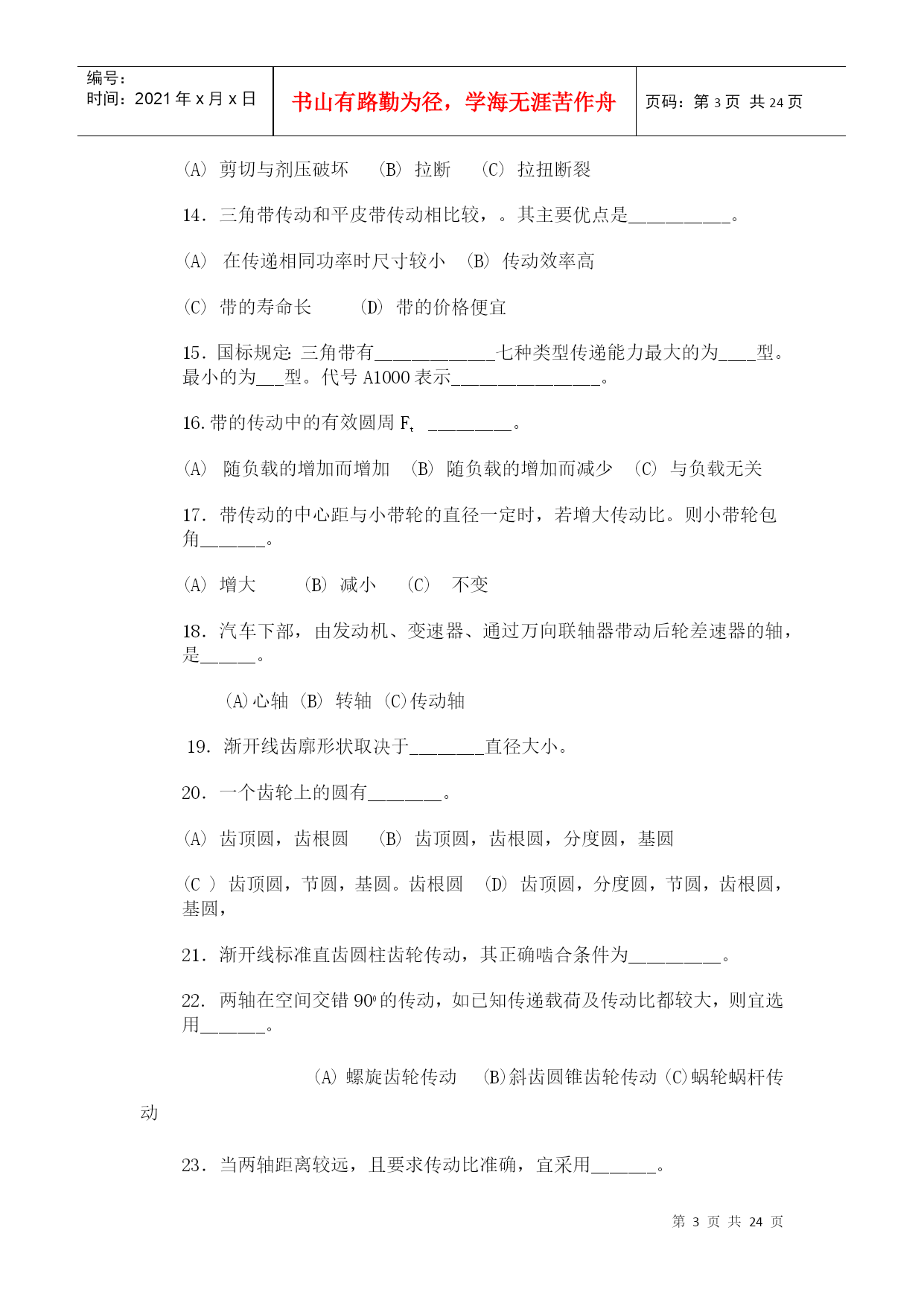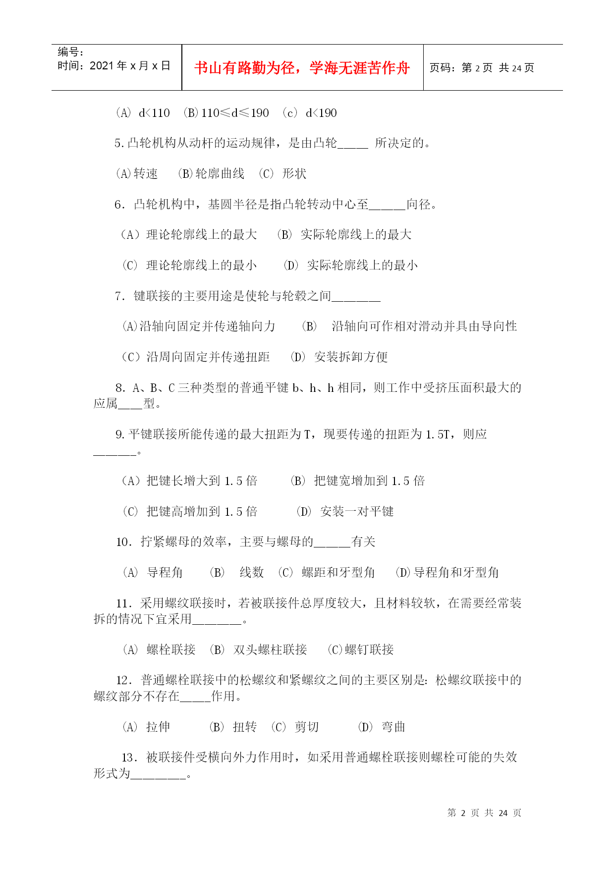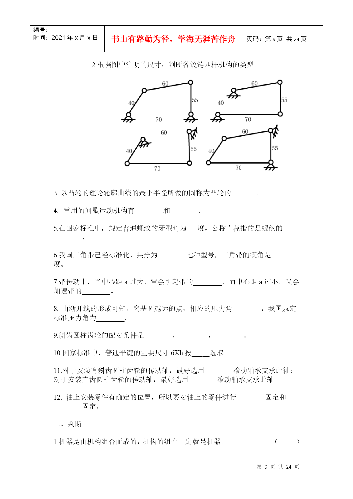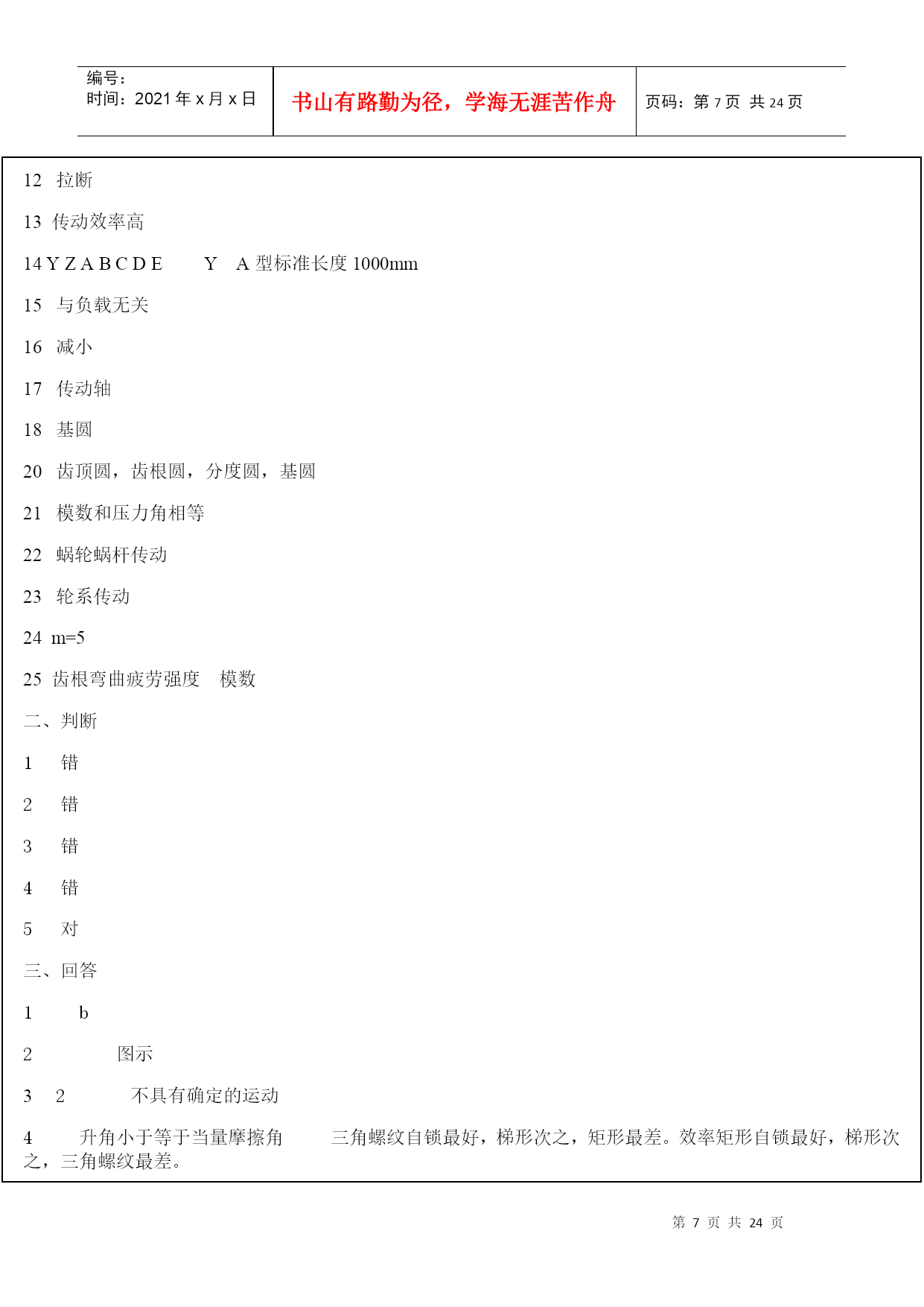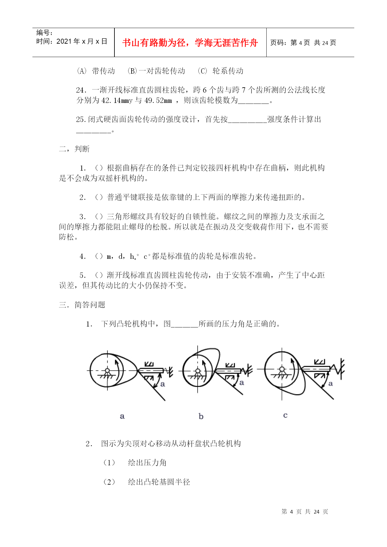 编号:时间:2021年x月x日书山有路勤为径,学海无涯苦作舟页码:第PAGE24页共NUMPAGES24页第PAGE\*MERGEFORMAT24页共NUMPAGES\*MERGEFORMAT24页HYPERLINK"http://www.xihangzh.com/jxkj/xitiji/index.htm"返回目录机械设计基础典型试题6HYPERLINK"http://www.xihangzh.com/jxkj/xitiji/answer6.htm"答案HYPERLINK"http://www.xihangzh.com/jxkj/xitiji/shitiku/page7.htm"试题7一、填空1.图示机构中有_____个虚约束。(A)0(B)1(C)2(D)33.平面四杆机构中,若各杆长度分别为a=40、b=60、c=60、d=70。当以a为机架,则此四杆机构为_________。4.在双曲柄机构中,已知三杆长度为a=80,b=150,c=120,则d杆长度为________。(A)d<110(B)110≤d≤190(c)d<1905.凸轮机构从动杆的运动规律,是由凸轮_____所决定的。(A)转速(B)轮廓曲线(C)形状6.凸轮机构中,基圆半径是指凸轮转动中心至______向径。(A)理论轮廓线上的最大(B)实际轮廓线上的最大(C)理论轮廓线上的最小(D)实际轮廓线上的最小7.键联接的主要用途是使轮与轮毂之间________(A)沿轴向固定并传递轴向力(B)沿轴向可作相对滑动并具由导向性(C)沿周向固定并传递扭距(D)安装拆卸方便8.A、B、C三种类型的普通平键b、h、h相同,则工作中受挤压面积最大的应属____型。9.平键联接所能传递的最大扭距为T,现要传递的扭距为1.5T,则应_______。(A)把键长增大到1.5倍(B)把键宽增加到1.5倍(C)把键高增加到1.5倍(D)安装一对平键10.拧紧螺母的效率,主要与螺母的______有关(A)导程角(B)线数(C)螺距和牙型角(D)导程角和牙型角11.采用螺纹联接时,若被联接件总厚度较大,且材料较软,在需要经常装拆的情况下宜采用________。(A)螺栓联接(B)双头螺柱联接(C)螺钉联接12.普通螺栓联接中的松螺纹和紧螺纹之间的主要区别是:松螺纹联接中的螺纹部分不存在_____作用。(A)拉伸(B)扭转(C)剪切(D)弯曲13.被联接件受横向外力作用时,如采用普通螺栓联接则螺栓可能的失效形式为_________。(A)剪切与剂压破坏(B)拉断(C)拉扭断裂14.三角带传动和平皮带传动相比较,。其主要优点是___________。(A)在传递相同功率时尺寸较小(B)传动效率高(C)带的寿命长(D)带的价格便宜15.国标规定:三角带有_____________七种类型传递能力最大的为____型。最小的为___型。代号A1000表示________________。16.带的传动中的有效圆周Ft_________。(A)随负载的增加而增加(B)随负载的增加而减少(C)与负载无关17.带传动的中心距与小带轮的直径一定时,若增大传动比。则小带轮包角_______。(A)增大(B)减小(C)不变18.汽车下部,由发动机、变速器、通过万向联轴器带动后轮差速器的轴,是______。(A)心轴(B)转轴(C)传动轴19.渐开线齿廓形状取决于________直径大小。20.一个齿轮上的圆有________。(A)齿顶圆,齿根圆(B)齿顶圆,齿根圆,分度圆,基圆(C)齿顶圆,节圆,基圆。齿根圆(D)齿顶圆,分度圆,节圆,齿根圆,基圆,21.渐开线标准直齿圆柱齿轮传动,其正确啮合条件为__________。22.两轴在空间交错900的传动,如已知传递载荷及传动比都较大,则宜选用_______。(A)螺旋齿轮传动(B)斜齿圆锥齿轮传动(C)蜗轮蜗杆传动23.当两轴距离较远,且要求传动比准确,宜采用_______。(A)带传动(B)一对齿轮传动(C)轮系传动24.一渐开线标准直齿圆柱齿轮,跨6个齿与跨7个齿所测的公法线长度分别为42.14mmy与49.52mm,则该齿轮模数为________。25.闭式硬齿面齿轮传动的强度设计,首先按__________强度条件计算出_________。二,判断1.()根据曲柄存在的条件已判定铰接四杆机构中存在曲柄,则此机构是不会成为双摇杆机构的。2.()普通平键联接是依靠键的上下两面的摩擦力来传递扭距的。3.()三角形螺纹具有较好的自锁性能。螺纹之间的摩擦力及支承面之间的摩擦力都能阻止螺母的松脱。所以就