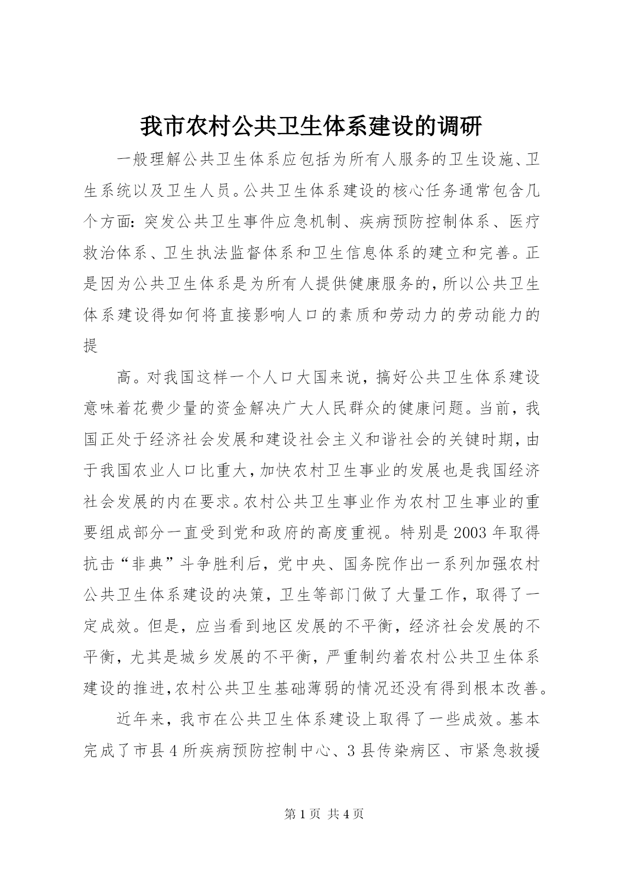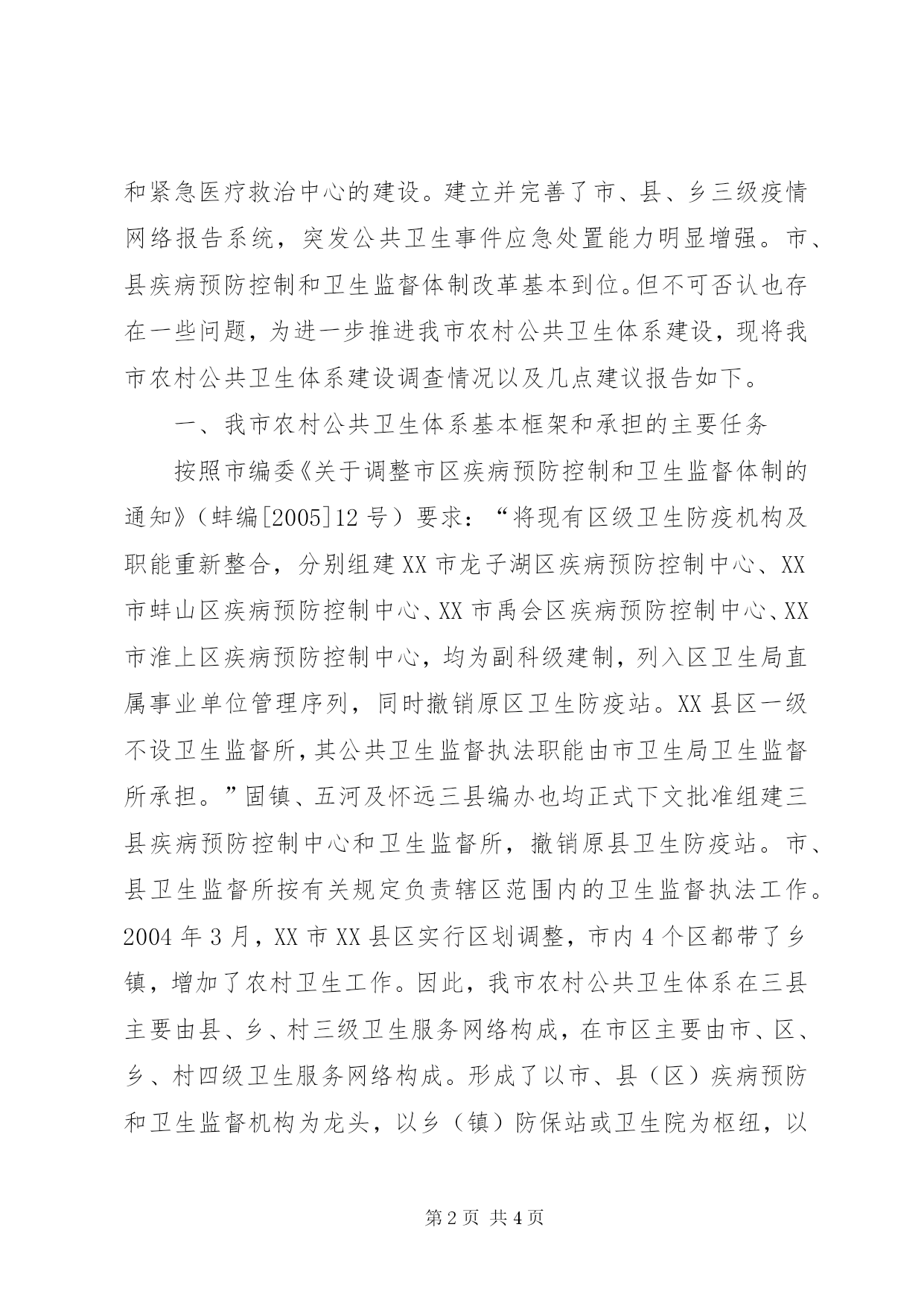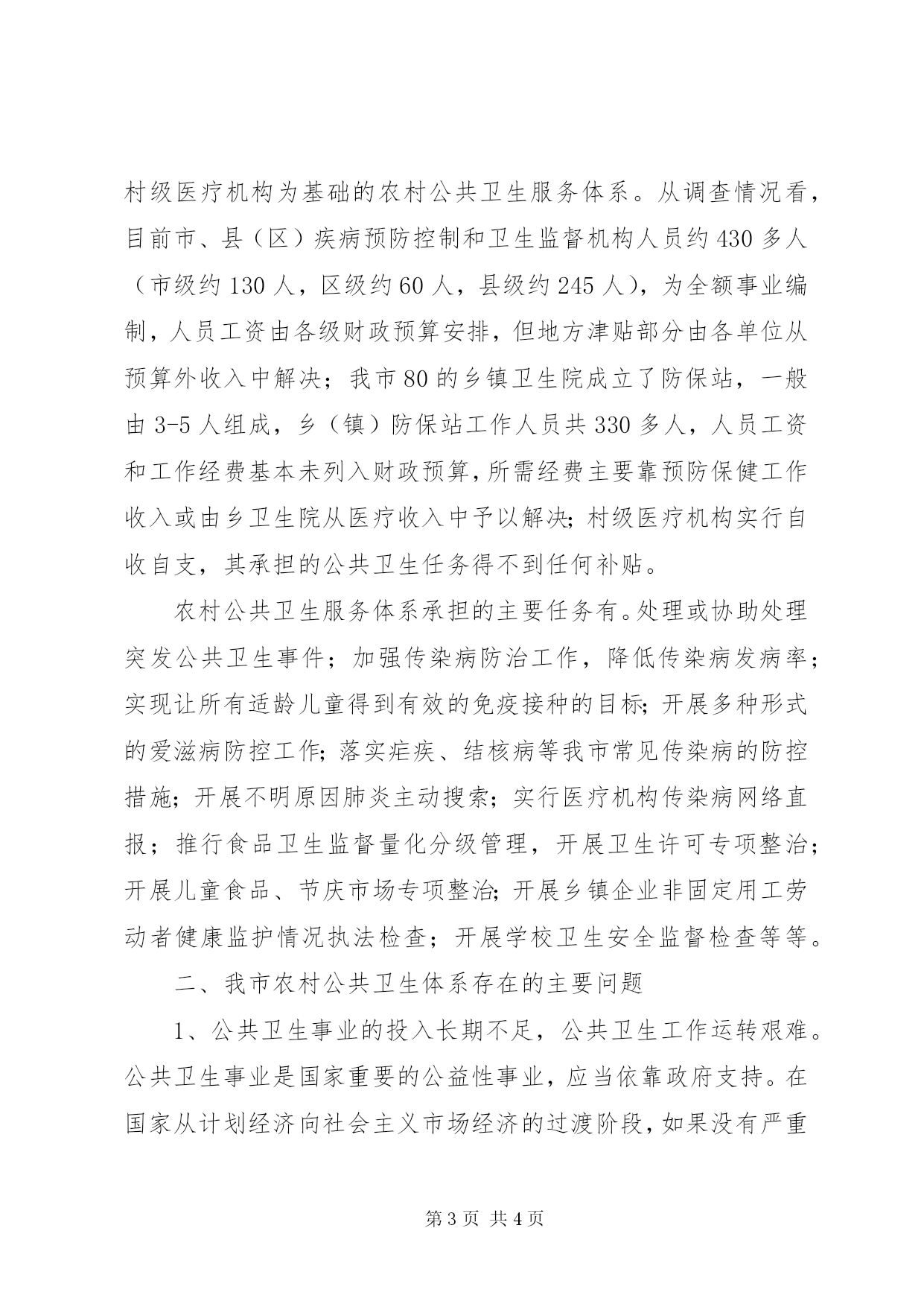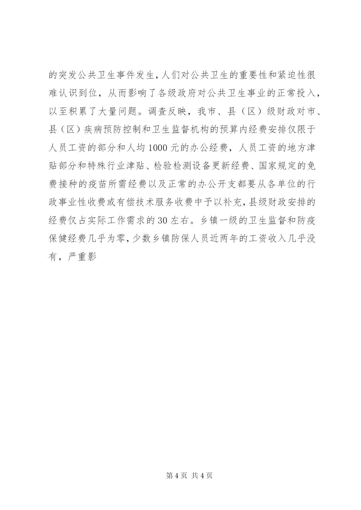 第PAGE\*Arabic\*MERGEFORMAT4页共NUMPAGES\*MERGEFORMAT4页我市农村公共卫生体系建设的调研一般理解公共卫生体系应包括为所有人服务的卫生设施、卫生系统以及卫生人员。公共卫生体系建设的核心任务通常包含几个方面:突发公共卫生事件应急机制、疾病预防控制体系、医疗救治体系、卫生执法监督体系和卫生信息体系的建立和完善。正是因为公共卫生体系是为所有人提供健康服务的,所以公共卫生体系建设得如何将直接影响人口的素质和劳动力的劳动能力的提高。对我国这样一个人口大国来说,搞好公共卫生体系建设意味着花费少量的资金解决广大人民群众的健康问题。当前,我国正处于经济社会发展和建设社会主义和谐社会的关键时期,由于我国农业人口比重大,加快农村卫生事业的发展也是我国经济社会发展的内在要求。农村公共卫生事业作为农村卫生事业的重要组成部分一直受到党和政府的高度重视。特别是2003年取得抗击“非典”斗争胜利后,党中央、国务院作出一系列加强农村公共卫生体系建设的决策,卫生等部门做了大量工作,取得了一定成效。但是,应当看到地区发展的不平衡,经济社会发展的不平衡,尤其是城乡发展的不平衡,严重制约着农村公共卫生体系建设的推进,农村公共卫生基础薄弱的情况还没有得到根本改善。近年来,我市在公共卫生体系建设上取得了一些成效。基本完成了市县4所疾病预防控制中心、3县传染病区、市紧急救援和紧急医疗救治中心的建设。建立并完善了市、县、乡三级疫情网络报告系统,突发公共卫生事件应急处置能力明显增强。市、县疾病预防控制和卫生监督体制改革基本到位。但不可否认也存在一些问题,为进一步推进我市农村公共卫生体系建设,现将我市农村公共卫生体系建设调查情况以及几点建议报告如下。一、我市农村公共卫生体系基本框架和承担的主要任务按照市编委《关于调整市区疾病预防控制和卫生监督体制的通知》(蚌编[2005]12号)要求:“将现有区级卫生防疫机构及职能重新整合,分别组建XX市龙子湖区疾病预防控制中心、XX市蚌山区疾病预防控制中心、XX市禹会区疾病预防控制中心、XX市淮上区疾病预防控制中心,均为副科级建制,列入区卫生局直属事业单位管理序列,同时撤销原区卫生防疫站。XX县区一级不设卫生监督所,其公共卫生监督执法职能由市卫生局卫生监督所承担。”固镇、五河及怀远三县编办也均正式下文批准组建三县疾病预防控制中心和卫生监督所,撤销原县卫生防疫站。市、县卫生监督所按有关规定负责辖区范围内的卫生监督执法工作。2004年3月,XX市XX县区实行区划调整,市内4个区都带了乡镇,增加了农村卫生工作。因此,我市农村公共卫生体系在三县主要由县、乡、村三级卫生服务网络构成,在市区主要由市、区、乡、村四级卫生服务网络构成。形成了以市、县(区)疾病预防和卫生监督机构为龙头,以乡(镇)防保站或卫生院为枢纽,以村级医疗机构为基础的农村公共卫生服务体系。从调查情况看,目前市、县(区)疾病预防控制和卫生监督机构人员约430多人(市级约130人,区级约60人,县级约245人),为全额事业编制,人员工资由各级财政预算安排,但地方津贴部分由各单位从预算外收入中解决;我市80的乡镇卫生院成立了防保站,一般由3-5人组成,乡(镇)防保站工作人员共330多人,人员工资和工作经费基本未列入财政预算,所需经费主要靠预防保健工作收入或由乡卫生院从医疗收入中予以解决;村级医疗机构实行自收自支,其承担的公共卫生任务得不到任何补贴。农村公共卫生服务体系承担的主要任务有。处理或协助处理突发公共卫生事件;加强传染病防治工作,降低传染病发病率;实现让所有适龄儿童得到有效的免疫接种的目标;开展多种形式的爱滋病防控工作;落实疟疾、结核病等我市常见传染病的防控措施;开展不明原因肺炎主动搜索;实行医疗机构传染病网络直报;推行食品卫生监督量化分级管理,开展卫生许可专项整治;开展儿童食品、节庆市场专项整治;开展乡镇企业非固定用工劳动者健康监护情况执法检查;开展学校卫生安全监督检查等等。二、我市农村公共卫生体系存在的主要问题1、公共卫生事业的投入长期不足,公共卫生工作运转艰难。公共卫生事业是国家重要的公益性事业,应当依靠政府支持。在国家从计划经济向社会主义市场经济的过渡阶段,如果没有严重的突发公共卫生事件发生,人们对公共卫生的重要性和紧迫性很难认识到位,从而影响了各级政府对公共卫生事业的正常投入,以至积累了大量问题。调查反映,我市、县(区)级财政对市、县(区)疾病预防控制和卫生监督机构的预算内经费安排仅限于人员工资的部分和人均1000元的办公经费,人员工资的地方津贴部分和特殊行业津贴、检验检测设备更新经费、国家规定的免费接种的疫苗所需经费以及正常的办公开支都要从各单位的行政事业性收费或有偿技术服务收费中予以补充,县级财政安排的经