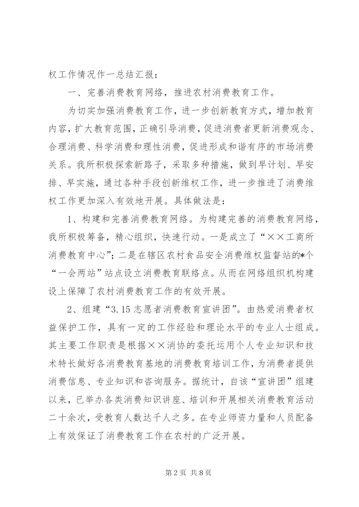 第PAGE\*Arabic\*MERGEFORMAT8页共NUMPAGES\*MERGEFORMAT8页工商所消费维权工作汇报编者按:本文主要从完善消费教育网络,推进农村消费教育工作;充分发挥职能,提供真实消费信息和维权服务;推行“多网整合”,提升监督网络作用;今后的工作思路进行讲述。其中,主要包括:构建和完善消费教育网络、组建“3.15志愿者消费教育宣讲团”、制订年度消费教育工作计划、我所多次会同相关部门和单位对相关商品和市场进行监督检查和消费调查、对成绩突出的监督站和监督员进行表彰奖励、在完善和发挥农村消费维权网络的同时,为适应新形势发展的需要,进一步提高保护消费者合法权益的工作水平,建立健全基层消费维权组织网络,提高维权能力、依托消费维权监督网络和消费教育网络,以消费教育为抓手,构建和推进消费指导体系建设、以维权网络为依托,进一步增强消费维权能力、以创建规范为基础,努力提高社会公信力等,具体材料请详见:**年以来,我所以“发挥监督网络作用,提升消费维权水平,深化消费教育工作,推进社会化监管程度”为主要工作方针开展消费者权益保护工作。截止**年12月,共受理调解消费者投诉*件,相较往年同比下降*%,已解决*件,移交其他部门*件,解决率为100%,直接为消费者挽回经济损失*万元,其中赔偿*万元;接受消费者咨询2587人次;发布《消费警示》*条;开展消费调查*次;参与各项监督检查和专项检查*次。现将**年以来消费维权工作情况作一总结汇报:一、完善消费教育网络,推进农村消费教育工作。为切实加强消费教育工作,进一步创新教育方式,增加教育内容,扩大教育范围,正确引导消费,促进消费者更新消费观念、合理消费、科学消费和理性消费,促进形成和谐有序的市场消费关系。我所积极探索新路子,采取多种措施,做到早计划、早安排、早实施,通过各种手段创新维权工作,进一步推进了消费维权工作更加深入有效地开展。具体做法是:1、构建和完善消费教育网络。为构建完善的消费教育网络,我所积极筹备,精心组织,快速行动。一是成立了“××工商所消费教育中心”;二是在辖区农村食品安全消费维权监督站的*个“一会两站”站点设立消费教育联络点。从而在网络组织机构建设上保障了农村消费教育工作的有效开展。2、组建“3.15志愿者消费教育宣讲团”。由热爱消费者权益保护工作,具有一定的工作经验和理论水平的专业人士组成。其主要工作职责是根据××消协的委托运用个人专业知识和技术特长做好各消费教育基地的消费教育培训工作,为消费者提供消费信息、专业知识和咨询服务。据统计,自该“宣讲团”组建以来,已举办各类消费知识讲座、培训和开展相关消费教育活动二十余次,受教育人数达千人之多。在专业师资力量和人员配备上有效保证了消费教育工作在农村的广泛开展。3、制订年度消费教育工作计划。我所制订了消费教育工作总体规划;消费教育基地制订了具体的消费教育课程和内容。有计划、分步骤地开展包括正确消费观的教育、权利意识的教育、消费科学知识的教育和先进消费文化的教育等内容的消费教育活动。把对农村消费维权监督员的培训和对农民及中小学生的消费教育作为今年的消费教育工作之重心,充分发挥农村消费维权网络和消费教育网络的“双网”作用,大张旗鼓地开展农村消费教育工作,切实营造起形式多样、渠道多种、参与广泛、力求实效的良好消费教育氛围。二、充分发挥职能,提供真实消费信息和维权服务为更有效地发挥消协的社会监督职能,向消费者提供更为真实详细的消费信息,我所多次会同相关部门和单位对相关商品和市场进行监督检查和消费调查,并利用互联网及时通报,为广大消费者提供了真实、准确的消费信息的同时也给相关经营单位敲响了警钟。1、为确保节日期间消费者能够安全、健康、放心消费,我所在春节、双周等节日期间会同有关部门对辖区食品市场进行了检查*次,检查经营户*户次,查获假冒伪劣商品*瓶袋。通过节日市场整顿,有力打击了不法分子的嚣张气焰,为广大消费者营造了一个和谐安全的消费环境。2、针对家装市场相对混乱的现状,我所于**年四月份对家装市场进行了一次消费调查,通过实际调查后发现,目前家装公司(单位)还存在以下普遍问题:一是家装资质问题非常突出。目前本地的家装公司(单位)均未取得相应的家装资质证;二是家装合同问题未能规范。被调查的十家家装单位与客户所签订的家装合同各不相同,没有一个统一的规范合同文本;三是家装专业人员问题。大部分家装公司(单位)并没有相对固定的持有相应资格证的项目经理和设计人员,施工人员也是临时雇佣的,整个家装队伍属于临时组合的“松散型”的。四是家装公司内部管理制度问题。大部分家装公司(单位)缺乏规范的管理制度和操作规程,有的甚至无任何的制度规范。三、推行“多网整合”,提升监督网络作用为充分整合各相关职能部门基层监管网络资源,实
