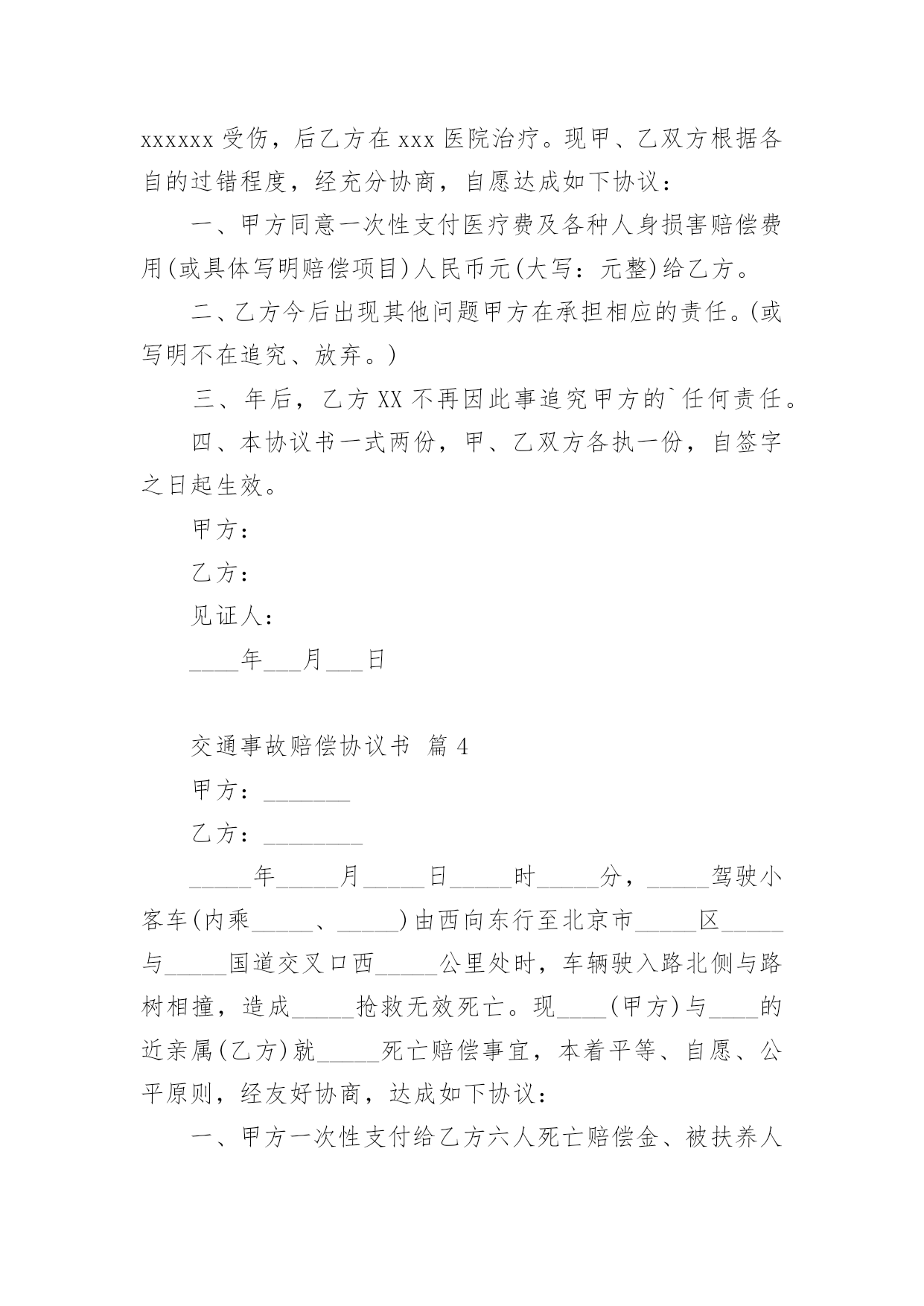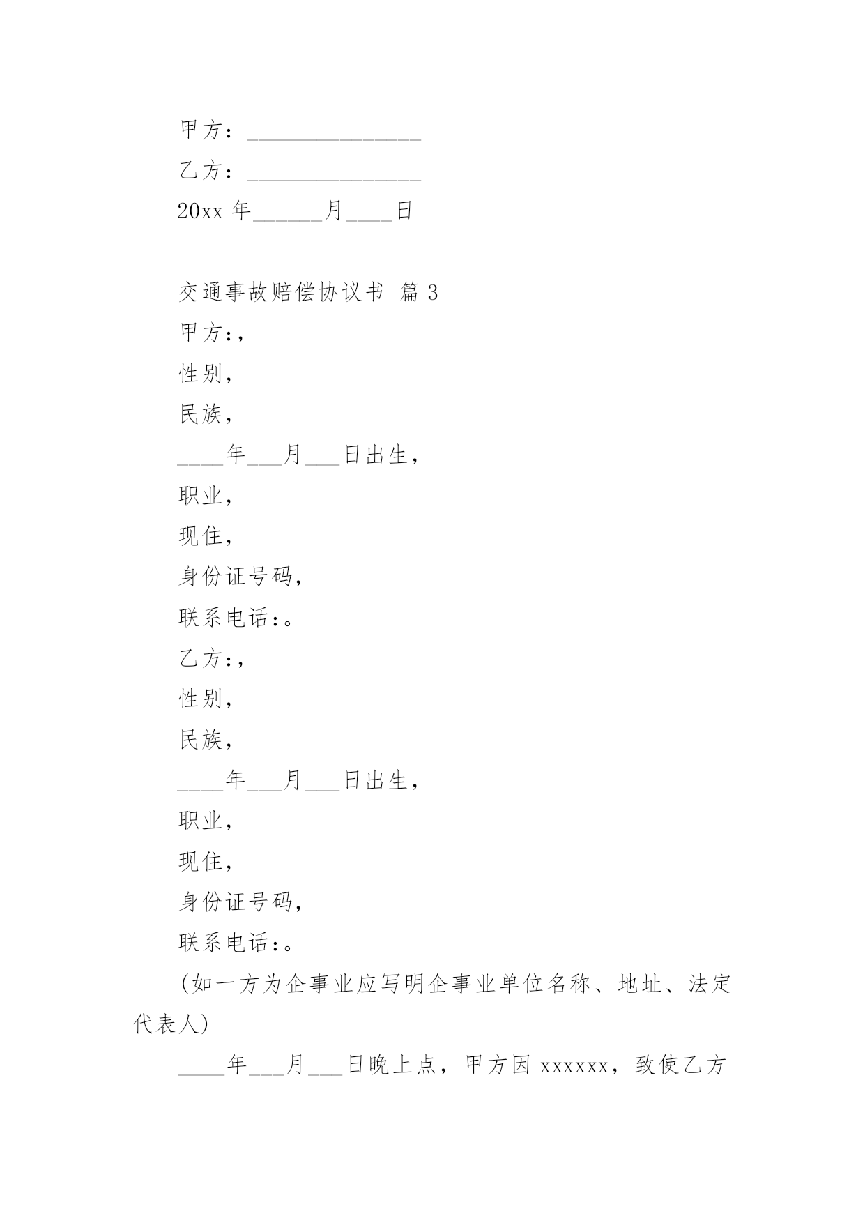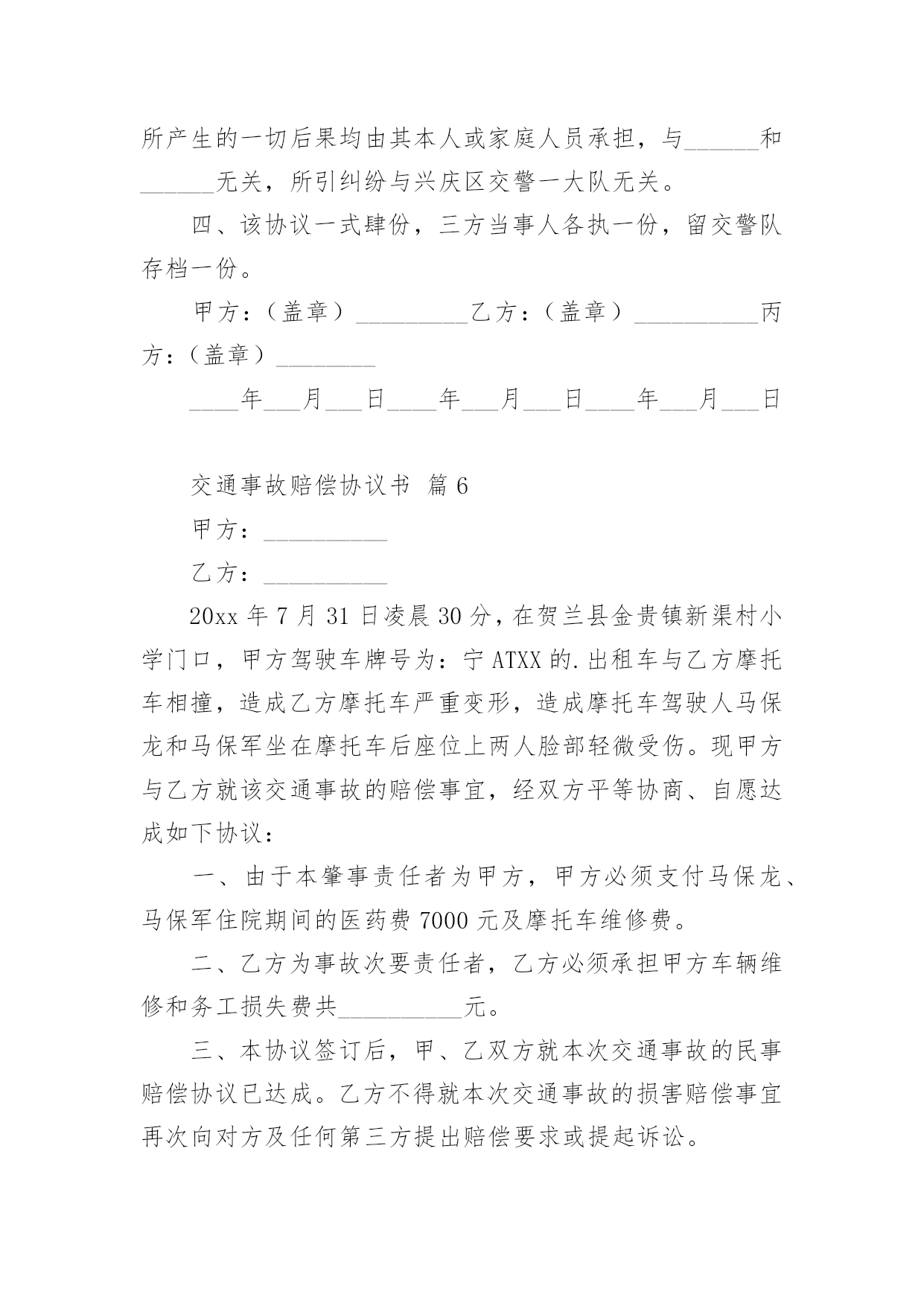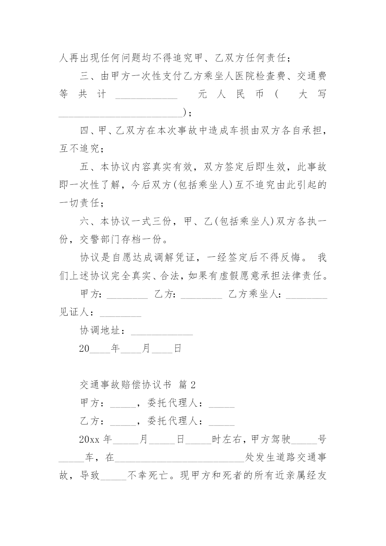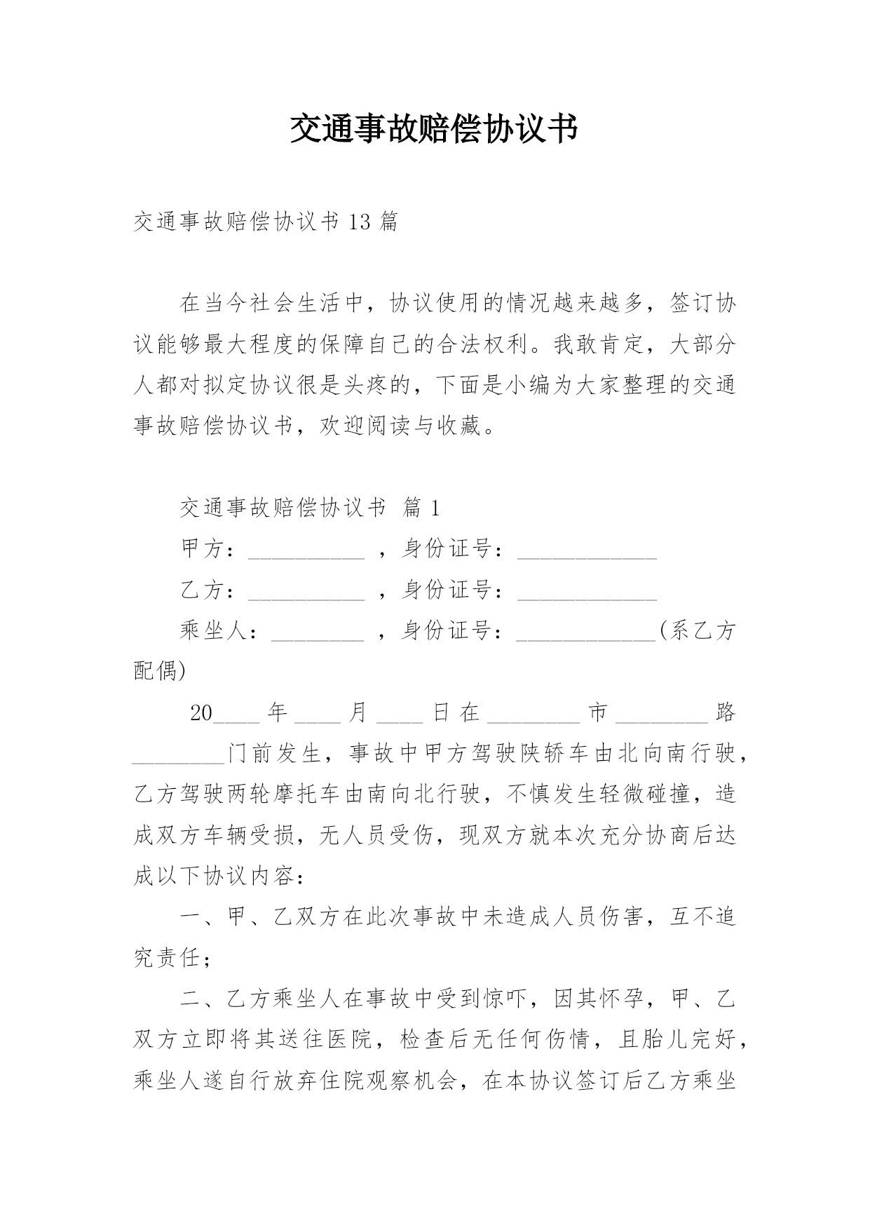 交通事故赔偿协议书交通事故赔偿协议书13篇在当今社会生活中,协议使用的情况越来越多,签订协议能够最大程度的保障自己的合法权利。我敢肯定,大部分人都对拟定协议很是头疼的,下面是小编为大家整理的交通事故赔偿协议书,欢迎阅读与收藏。交通事故赔偿协议书篇1甲方:__________,身份证号:____________乙方:__________,身份证号:____________乘坐人:________,身份证号:____________(系乙方配偶)20____年____月____日在________市________路________门前发生,事故中甲方驾驶陕轿车由北向南行驶,乙方驾驶两轮摩托车由南向北行驶,不慎发生轻微碰撞,造成双方车辆受损,无人员受伤,现双方就本次充分协商后达成以下协议内容:一、甲、乙双方在此次事故中未造成人员伤害,互不追究责任;二、乙方乘坐人在事故中受到惊吓,因其怀孕,甲、乙双方立即将其送往医院,检查后无任何伤情,且胎儿完好,乘坐人遂自行放弃住院观察机会,在本协议签订后乙方乘坐人再出现任何问题均不得追究甲、乙双方任何责任;三、由甲方一次性支付乙方乘坐人医院检查费、交通费等共计____________元人民币(大写________________________);四、甲、乙双方在本次事故中造成车损由双方各自承担,互不追究;五、本协议内容真实有效,双方签定后即生效,此事故即一次性了解,今后双方(包括乘坐人)互不追究由此引起的一切责任;六、本协议一式三份,甲、乙(包括乘坐人)双方各执一份,交警部门存档一份。协议是自愿达成调解凭证,一经签定后不得反悔。我们上述协议完全真实、合法,如果有虚假愿意承担法律责任。甲方:________乙方:________乙方乘坐人:________见证人:________协调地址:____________20____年____月____日交通事故赔偿协议书篇2甲方:_____,委托代理人:_____乙方:_____,委托代理人:_____20xx年_____月_____日_____时左右,甲方驾驶_____号_____车,在_________________________处发生道路交通事故,导致_____不幸死亡。现甲方和死者的所有近亲属经友好协商,本着平等、自愿、公平的原则,达成如下协议:一、甲方一次性赔偿乙方医疗费、抢救费、误工费、交通费、住宿费、丧葬费、被抚养人生活费、老人赡养费、死亡赔偿金、精神损害抚慰金等各项赔偿款共计人民币:_____圆整。二、死者_____的尸体由其家属自行安葬。三、上述款项支付给乙方所有近亲属后,由乙方所有近亲属内部自行分配、处理,其分配、处理的方式、后果与甲方无任何关系。四、乙方收到上述款项后,向甲方出具收据,并保证放弃对甲方在本次事故中所有的'追偿权。本协议签署后,本次事故为一次性全部处理终结,甲乙双方永不纠缠。五、根据甲方的真诚表示,乙方考虑到甲方之违法行为系过失所致,主观恶意小,社会危害轻,按照构建和谐社会的原则,本着治病救人的精神,乙方对甲方的行为给予谅解,不再追究甲方的一切责任,并希望司法机关或相关部门对甲方从轻、减轻或免于处罚。六、本协议甲乙双方已全文阅读并理解无误,甲乙双方完全明白本协议内容所涉及后果,甲乙双方对此协议处理结果完全满意,决不反悔。七、本协议一式份,甲乙双方各执一份,经甲乙双方签字和按指印后生效。甲方:_____乙方:_____见证方:_____签约日期:20xx年___月___日交通事故私了一次性赔偿简单协议书(通用5篇)5甲方:___________(___________),男,36岁,________________村人。乙方:___________(___________),男,22岁,________________学校,学员(原籍红花乡__________村)。交通事故基本事实及双方责任20xx年_______月_______日_______时_______分,甲方___________驾驶___________拖拉机与乙方___________驾驶的___________两轮摩托车在___________乡___________村___________路段发生相撞导致交通事故,造成乙方___________受伤,摩托车损害。经___________市公安局交通警察支队___________大队第___________号《交通事故认定书》认定,双方负同等责任。经甲、乙双方充分协商一致达成如下协议一、甲方___________自愿赔偿给乙方___________各项损失共计___________万元人民币(包括已经支付的___________元)。二、第一项的损失赔偿包括车辆损失赔偿。三、本协议签定时,甲方必