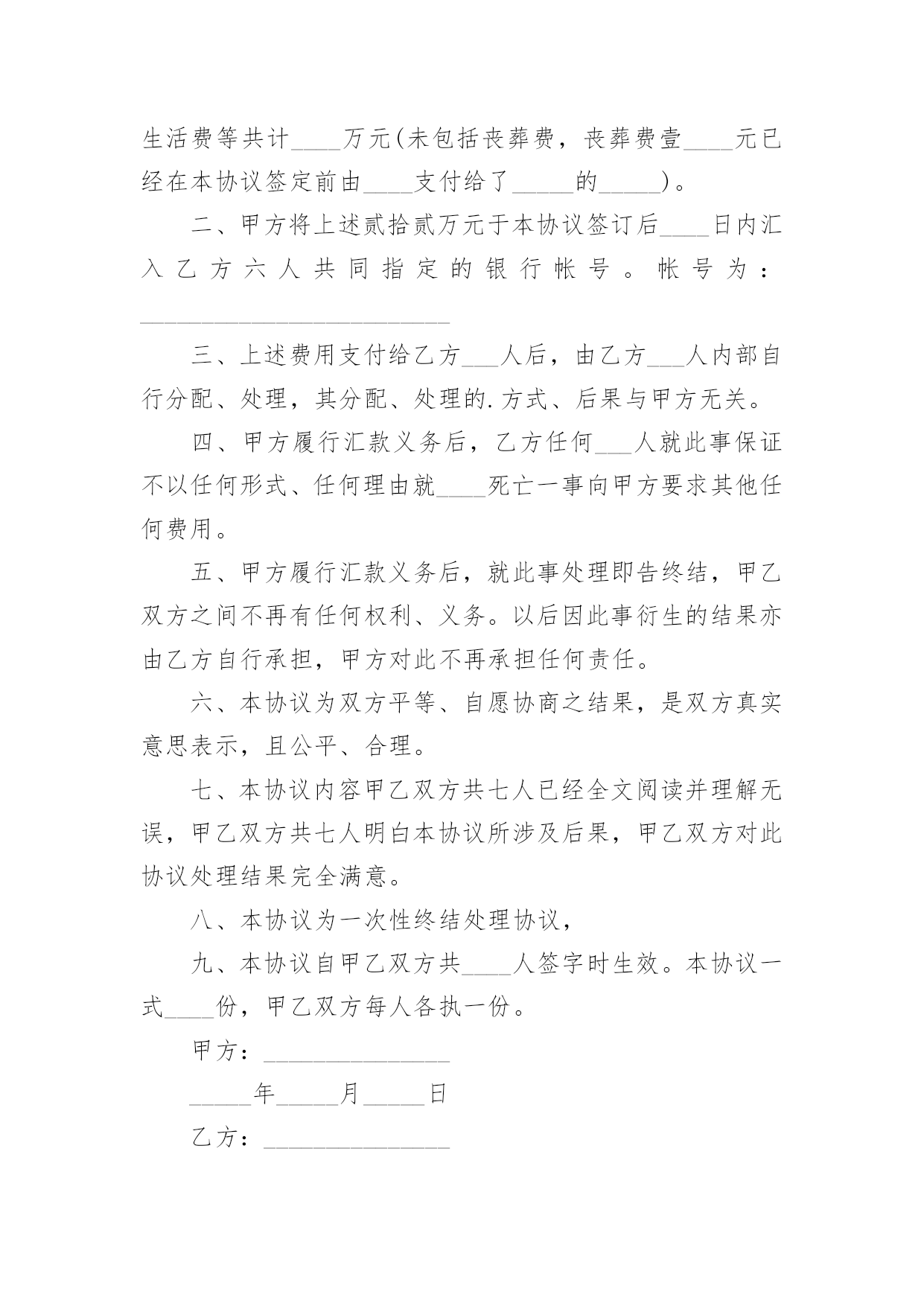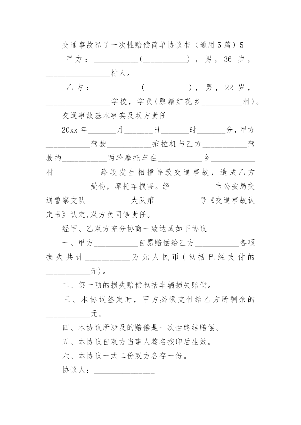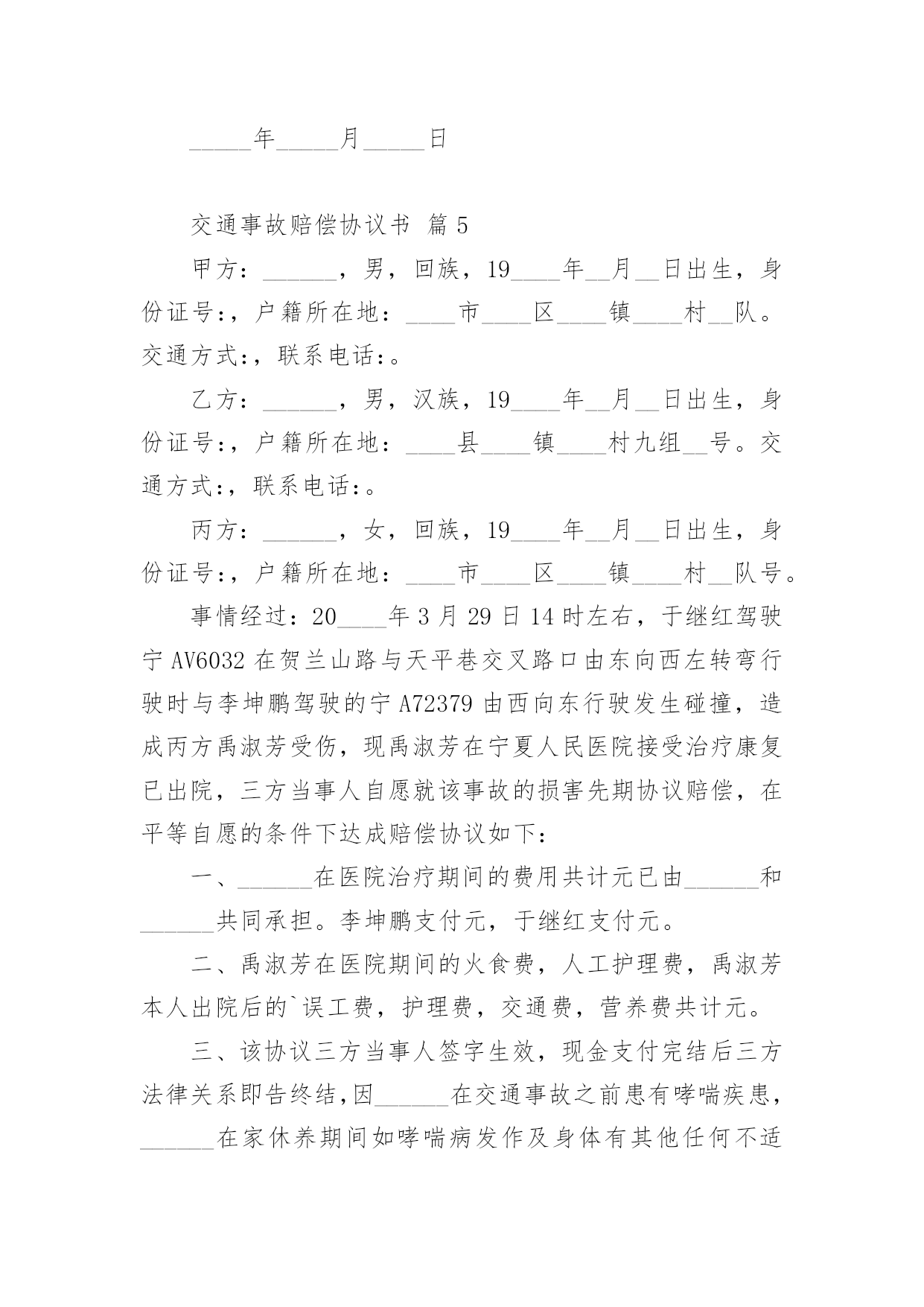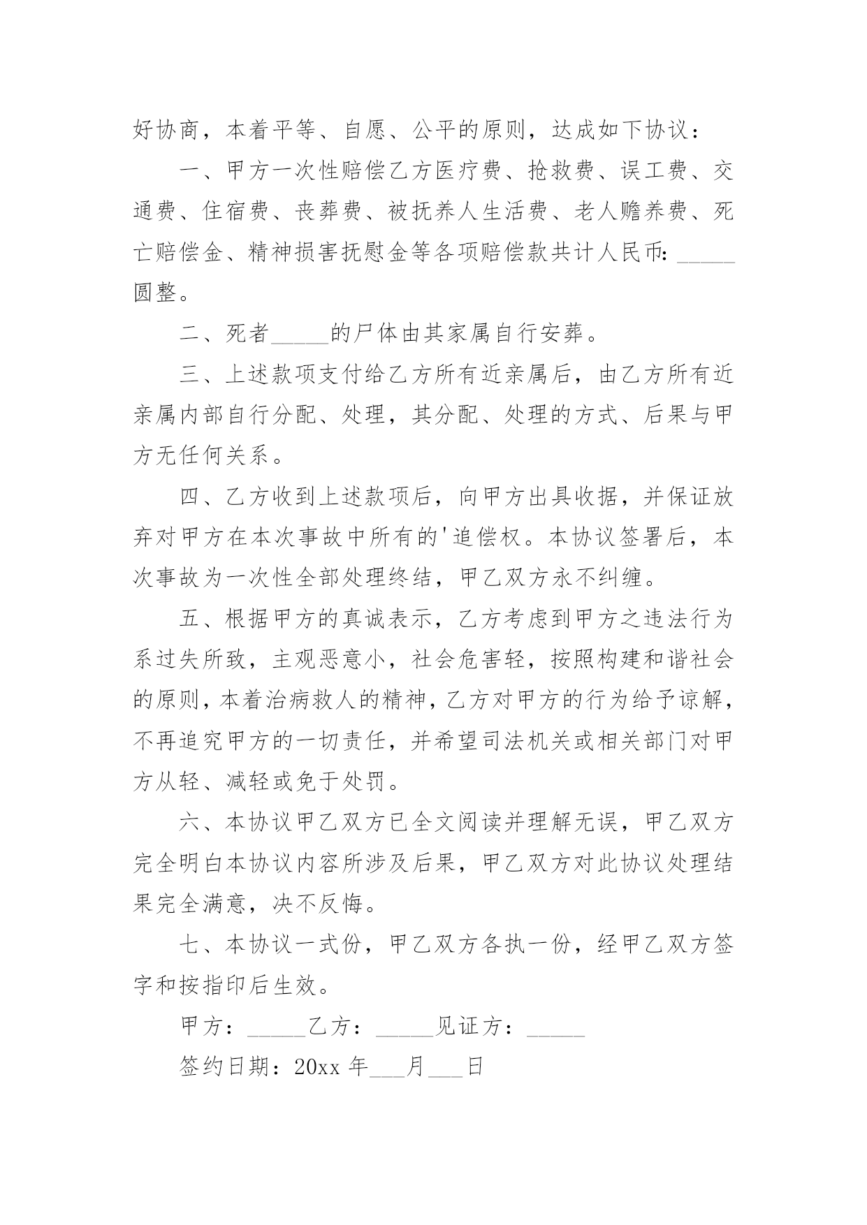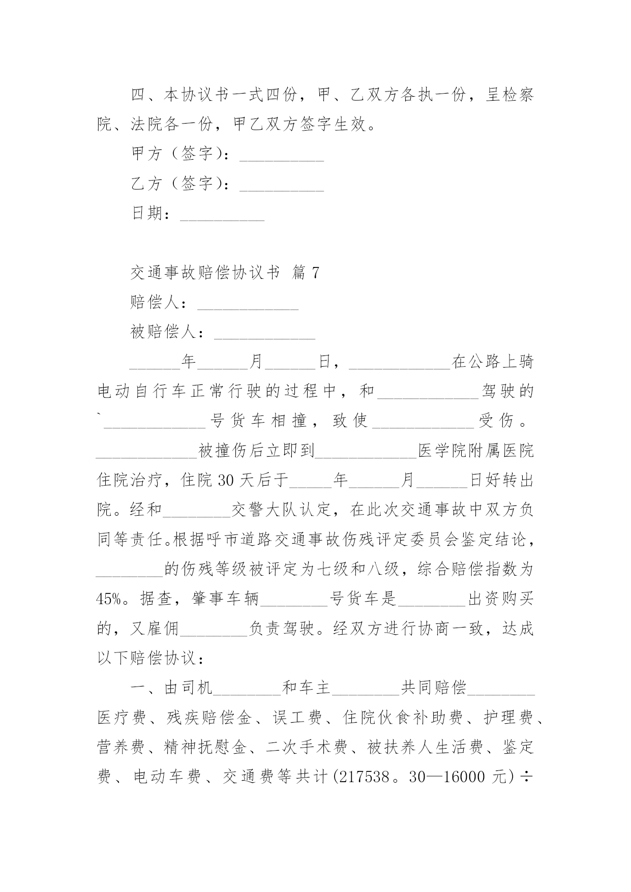 交通事故赔偿协议书交通事故赔偿协议书13篇在当今社会生活中,协议使用的情况越来越多,签订协议能够最大程度的保障自己的合法权利。我敢肯定,大部分人都对拟定协议很是头疼的,下面是小编为大家整理的交通事故赔偿协议书,欢迎阅读与收藏。交通事故赔偿协议书篇1甲方:__________,身份证号:____________乙方:__________,身份证号:____________乘坐人:________,身份证号:____________(系乙方配偶)20____年____月____日在________市________路________门前发生,事故中甲方驾驶陕轿车由北向南行驶,乙方驾驶两轮摩托车由南向北行驶,不慎发生轻微碰撞,造成双方车辆受损,无人员受伤,现双方就本次充分协商后达成以下协议内容:一、甲、乙双方在此次事故中未造成人员伤害,互不追究责任;二、乙方乘坐人在事故中受到惊吓,因其怀孕,甲、乙双方立即将其送往医院,检查后无任何伤情,且胎儿完好,乘坐人遂自行放弃住院观察机会,在本协议签订后乙方乘坐人再出现任何问题均不得追究甲、乙双方任何责任;三、由甲方一次性支付乙方乘坐人医院检查费、交通费等共计____________元人民币(大写________________________);四、甲、乙双方在本次事故中造成车损由双方各自承担,互不追究;五、本协议内容真实有效,双方签定后即生效,此事故即一次性了解,今后双方(包括乘坐人)互不追究由此引起的一切责任;六、本协议一式三份,甲、乙(包括乘坐人)双方各执一份,交警部门存档一份。协议是自愿达成调解凭证,一经签定后不得反悔。我们上述协议完全真实、合法,如果有虚假愿意承担法律责任。甲方:________乙方:________乙方乘坐人:________见证人:________协调地址:____________20____年____月____日交通事故赔偿协议书篇2甲方:_____,委托代理人:_____乙方:_____,委托代理人:_____20xx年_____月_____日_____时左右,甲方驾驶_____号_____车,在_________________________处发生道路交通事故,导致_____不幸死亡。现甲方和死者的所有近亲属经友好协商,本着平等、自愿、公平的原则,达成如下协议:一、甲方一次性赔偿乙方医疗费、抢救费、误工费、交通费、住宿费、丧葬费、被抚养人生活费、老人赡养费、死亡赔偿金、精神损害抚慰金等各项赔偿款共计人民币:_____圆整。二、死者_____的尸体由其家属自行安葬。三、上述款项支付给乙方所有近亲属后,由乙方所有近亲属内部自行分配、处理,其分配、处理的方式、后果与甲方无任何关系。四、乙方收到上述款项后,向甲方出具收据,并保证放弃对甲方在本次事故中所有的'追偿权。本协议签署后,本次事故为一次性全部处理终结,甲乙双方永不纠缠。五、根据甲方的真诚表示,乙方考虑到甲方之违法行为系过失所致,主观恶意小,社会危害轻,按照构建和谐社会的原则,本着治病救人的精神,乙方对甲方的行为给予谅解,不再追究甲方的一切责任,并希望司法机关或相关部门对甲方从轻、减轻或免于处罚。六、本协议甲乙双方已全文阅读并理解无误,甲乙双方完全明白本协议内容所涉及后果,甲乙双方对此协议处理结果完全满意,决不反悔。七、本协议一式份,甲乙双方各执一份,经甲乙双方签字和按指印后生效。甲方:_____乙方:_____见证方:_____签约日期:20xx年___月___日交通事故私了一次性赔偿简单协议书(通用5篇)5甲方:___________(___________),男,36岁,________________村人。乙方:___________(___________),男,22岁,________________学校,学员(原籍红花乡__________村)。交通事故基本事实及双方责任20xx年_______月_______日_______时_______分,甲方___________驾驶___________拖拉机与乙方___________驾驶的___________两轮摩托车在___________乡___________村___________路段发生相撞导致交通事故,造成乙方___________受伤,摩托车损害。经___________市公安局交通警察支队___________大队第___________号《交通事故认定书》认定,双方负同等责任。经甲、乙双方充分协商一致达成如下协议一、甲方___________自愿赔偿给乙方___________各项损失共计___________万元人民币(包括已经支付的___________元)。二、第一项的损失赔偿包括车辆损失赔偿。三、本协议签定时,甲方必