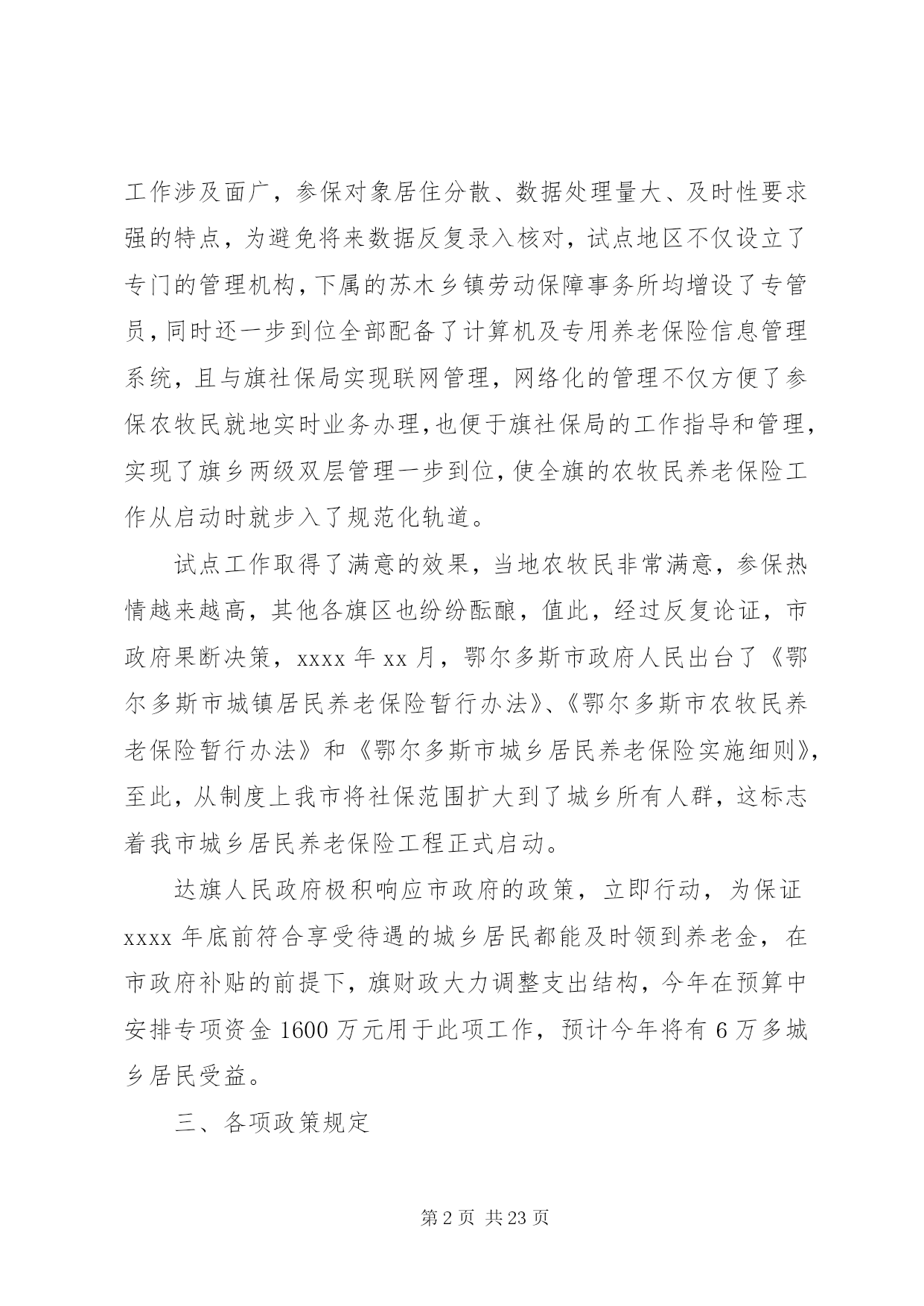 第PAGE\*Arabic\*MERGEFORMAT23页共NUMPAGES\*MERGEFORMAT23页保险调研报告范文4篇改革开放以来,伴随着党的各项惠民政策的出台,XX县区在不断实现经济大发展的同时,各项社会保障制度建设也取得了明显进展。以城镇职工基本养老保险、基本医疗保险、失业保险、工伤保险、生育保险、城市居民最低生活保障等为主要内容的社会保障体系基本框架已初步形成,但从总体上,社会保障的发展滞后于经济发展和社会进步的需要,突出表现在社会保障覆盖面窄,体系不健全,社会保障的发展滞后已制约了经济发展,也影响着社会和谐。一、基本情况XX县区现有总人口35万,符合参加城乡居民养老保险的人数为172524人(其中,农牧民159728人,城镇无业居民12796人,75周岁以上13836人,(农牧民13229、城镇无业居民607人)男60周岁、女55周岁已到龄人员41972人,男25-59周岁、女25-54周岁116716人)截止10月底全旗共有55499人参加了城乡居民养老保险,其中农牧民53267人,城镇居民2232人,75岁以上有7282人,到龄31907人,不到龄14078人,收缴养老保险金159512413元二、实行市级统筹为顺应时事的要求,鄂尔多斯市于xxx年初,率先在伊旗、准旗启动了农牧民养老保险工程试点工作,试点初期考虑到此项工作涉及面广,参保对象居住分散、数据处理量大、及时性要求强的特点,为避免将来数据反复录入核对,试点地区不仅设立了专门的管理机构,下属的苏木乡镇劳动保障事务所均增设了专管员,同时还一步到位全部配备了计算机及专用养老保险信息管理系统,且与旗社保局实现联网管理,网络化的管理不仅方便了参保农牧民就地实时业务办理,也便于旗社保局的工作指导和管理,实现了旗乡两级双层管理一步到位,使全旗的农牧民养老保险工作从启动时就步入了规范化轨道。试点工作取得了满意的效果,当地农牧民非常满意,参保热情越来越高,其他各旗区也纷纷酝酿,值此,经过反复论证,市政府果断决策,xxxx年xx月,鄂尔多斯市政府人民出台了《鄂尔多斯市城镇居民养老保险暂行办法》、《鄂尔多斯市农牧民养老保险暂行办法》和《鄂尔多斯市城乡居民养老保险实施细则》,至此,从制度上我市将社保范围扩大到了城乡所有人群,这标志着我市城乡居民养老保险工程正式启动。达旗人民政府极积响应市政府的政策,立即行动,为保证xxxx年底前符合享受待遇的城乡居民都能及时领到养老金,在市政府补贴的前提下,旗财政大力调整支出结构,今年在预算中安排专项资金1600万元用于此项工作,预计今年将有6万多城乡居民受益。三、各项政策规定(一)参保范围。凡具有XX县区户籍的城乡居民或外地迁来本市两年以上的,未参加城镇企业职工和个体工商户养老保险的年龄在25周岁以上,男性60周岁以下、女性55周岁以下的;未享受城镇职工社会保险待遇的男性年满60周岁、女性年满55周岁或以上的,均属参保对象。(二)领取养老金条件。参保人参加城乡居民养老保险男性年满60周岁、女性年满55周岁、其缴费年限累计满15年或以上的,即可按月领取养老金。男年满60周岁、女年满55周岁以上、75周岁以下的人员可一次性缴纳15年,且年龄每增一岁,缴费年限减少一年,最低不得少于5年,75周岁以上人员不缴费,直接从启动后的城乡居民养老基金中按月领取养老金。(三)缴费方法。从xx年起缴费的农牧民以我市xx年度农牧民人均纯收入为缴费基数、城镇无业居民以xx年我市城镇居民人均可支配收入(16200元)为基数,三年调整一次。(四)缴费比例。农牧民总缴费比例为18%,其中个人缴纳8%,财政补贴10%;城镇居民总缴费比例为16%,其中个人缴纳10%,财政补贴6%,财政补贴比例随着经济发展适时调整。还实行土地换社保的原则,鼓励农牧民自愿放弃土地草牧场经营权,享受城镇居民养老保险待遇,且财政补贴lo%来鼓励农牧民转移进城。(五)个人帐户。农牧民养老保险个人帐户按缴费基数的12%划人,城镇居民养老保险个人帐户按缴费基数的10%划入,个人帐户余额比照城镇企业基本养老保险个人帐户利率计息。(六)养老金计发办法与标准。由基本养老金(政府补贴养老金)和个人账户养老金两部分组成。基本养老金=到龄时我市当期月缴费基数times;实际缴费年限times;l%;个人账户养老金=个人账户存储额/计发月数(男139,女170)。启动时到龄的农牧民月领取养老金为200元,城镇无业居民为450元,以后计算不足的补齐到此标准。三年调整一次。(七)养老保险关系转移。全市户籍已参加城乡居民养老保险的,因正当理由在旗区之间迁移的,其养老保险关系也可以随之转移,迁入地社保局应准予转入。为了防止社保移民,凡正当理由从外盟市迁入鄂尔多斯市的,如其在原籍已参加城乡居民养