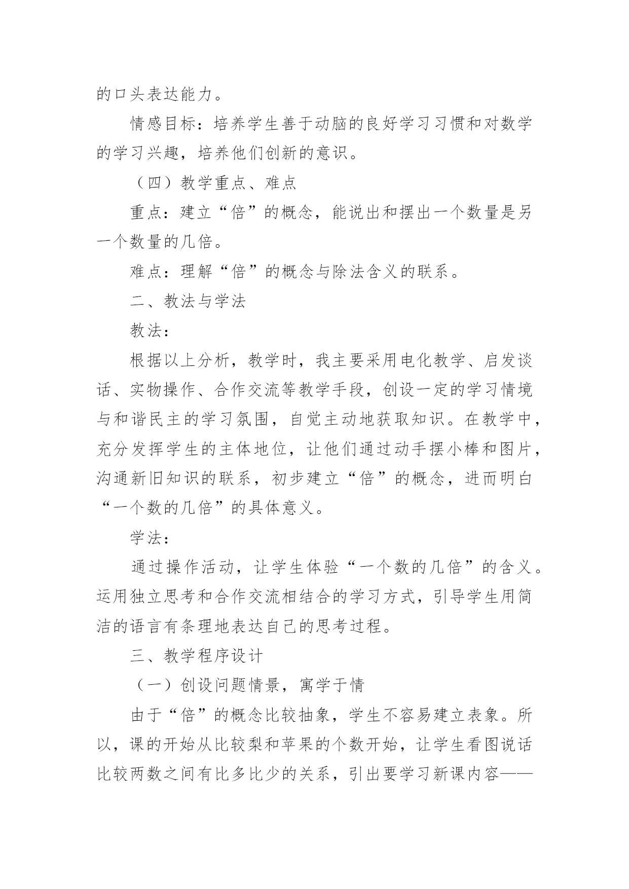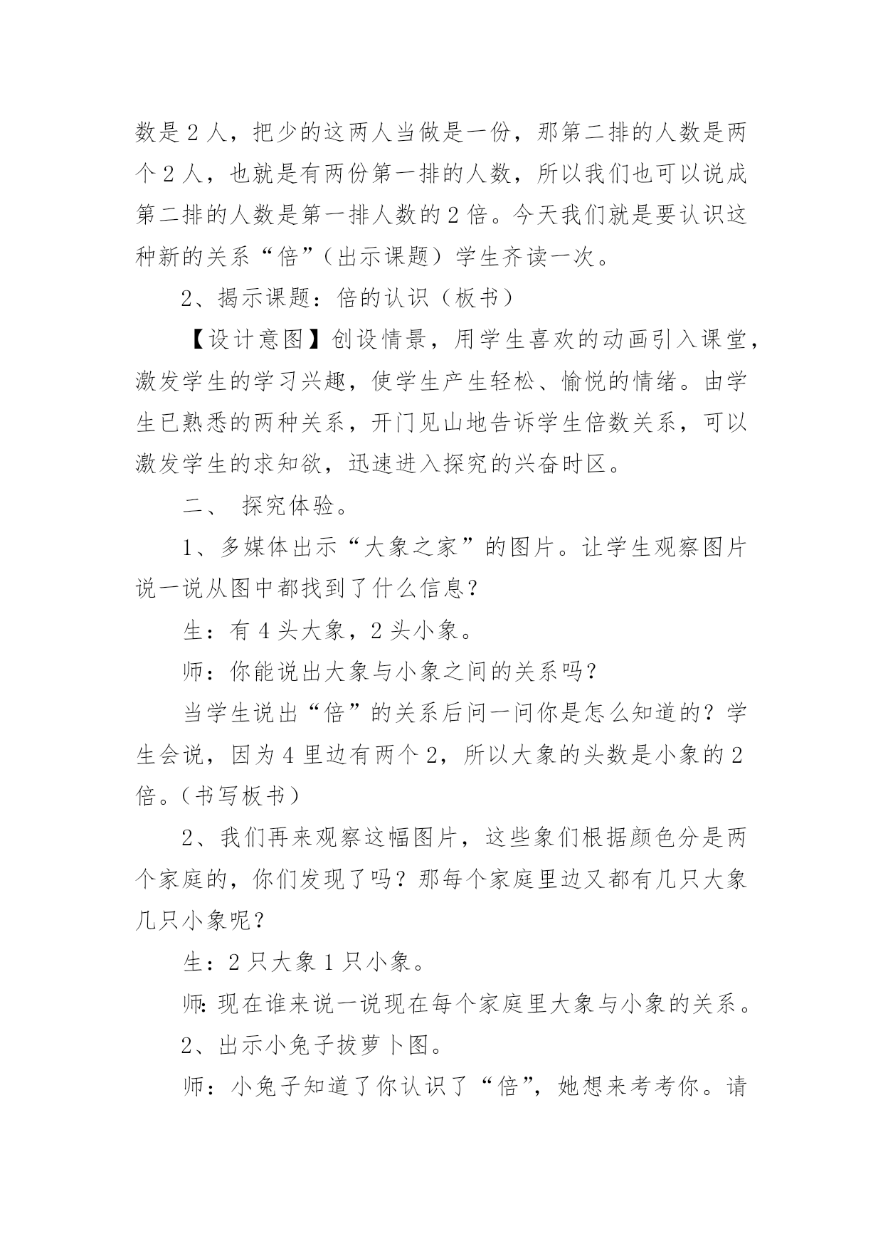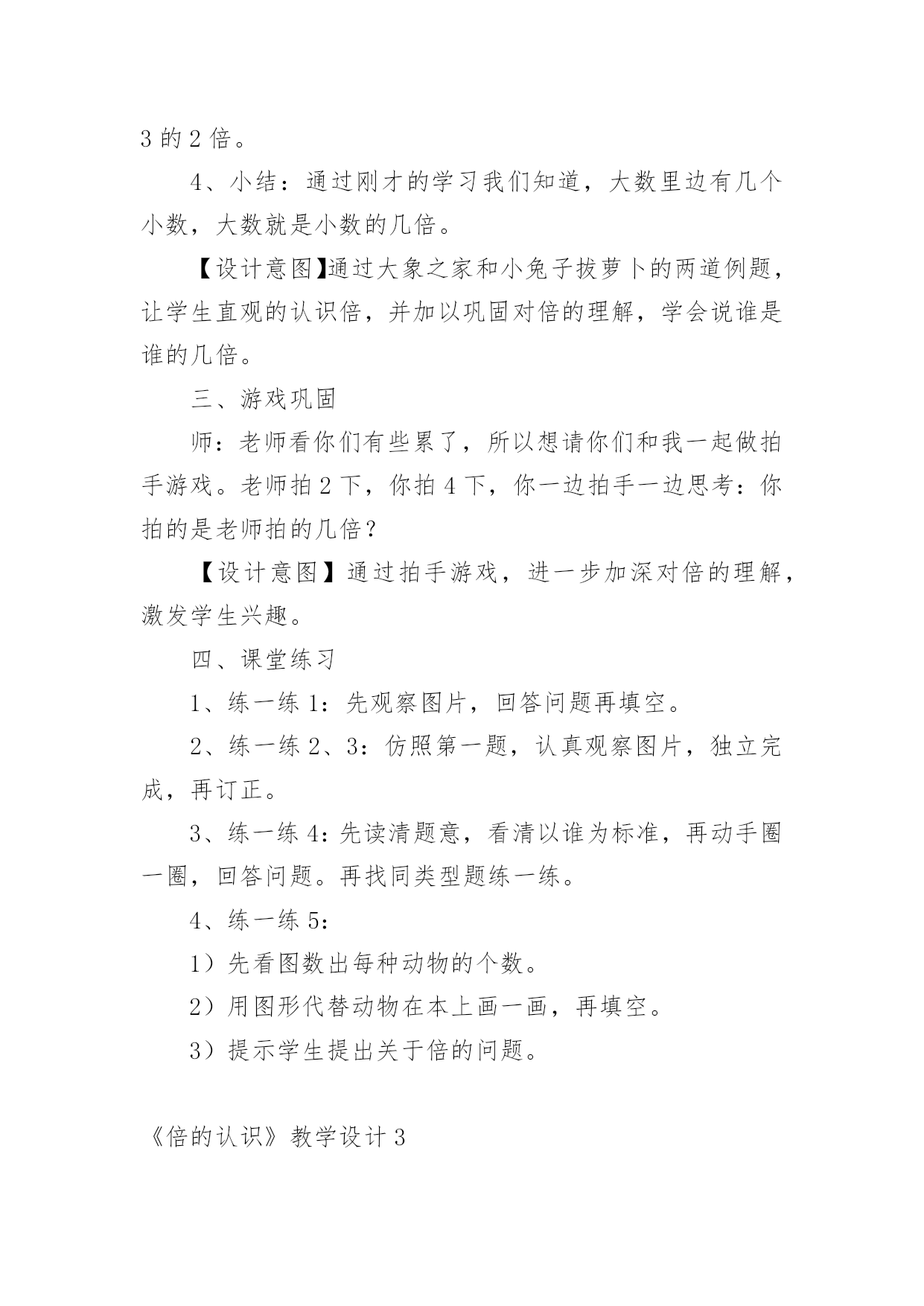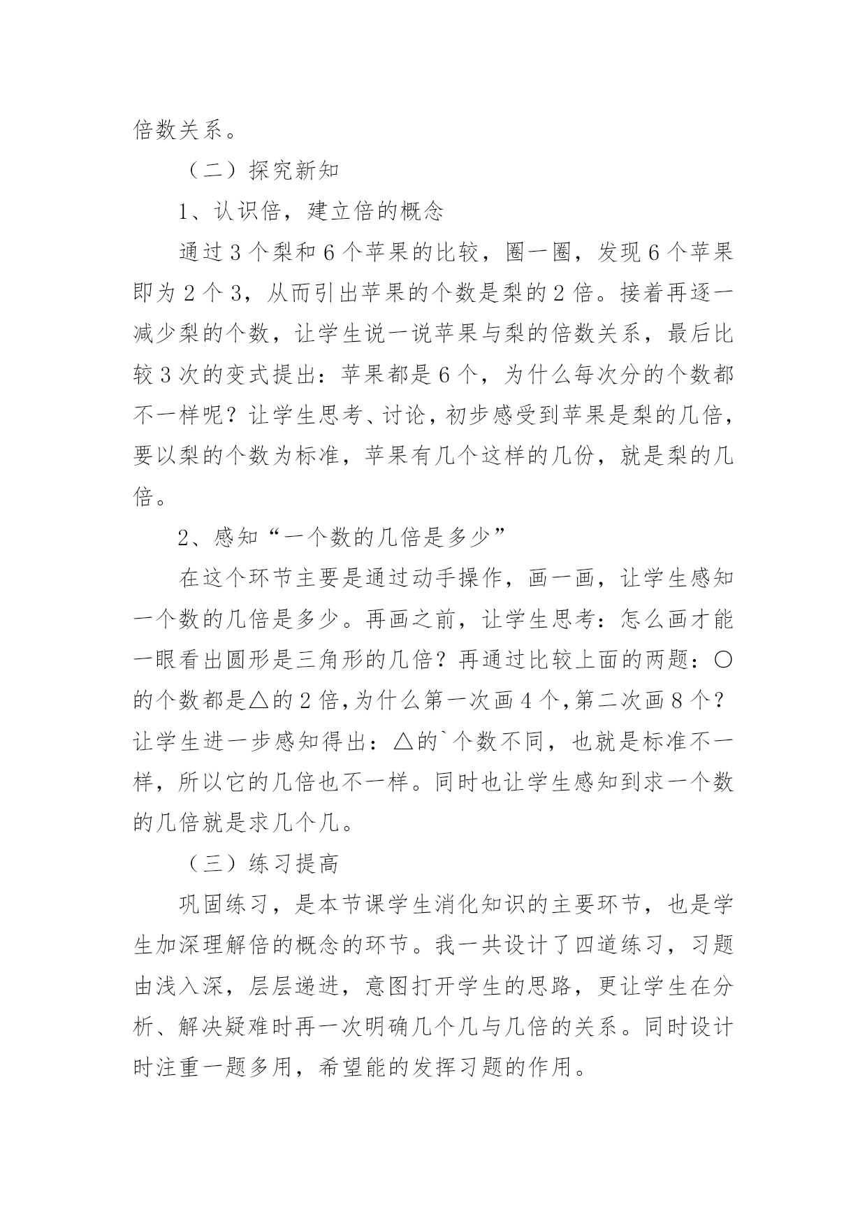 《倍的认识》教学设计作为一位不辞辛劳的人民教师,就有可能用到教学设计,教学设计是一个系统化规划教学系统的过程。那么大家知道规范的教学设计是怎么写的吗?下面是小编收集整理的《倍的认识》教学设计,仅供参考,大家一起来看看吧。《倍的认识》教学设计1一、教材(一)内容:人教版小学数学第三册例1、例2。(二)教材的地位及前后联系“倍的认识”是第三册第六单元“表内乘法和表内除法”的重要内容之一,教材从这里开始教学有关两个数的倍数关系的应用题。例1、例2是首先教学求一个数是另一个数的几倍的思维方法。教材以让学生实际操作为基础,联系一个数里面包含几个另一个数,使学生理解“倍”的概念。做到由浅入深,由具体到抽象,内容安排是科学的,符合学生的认知特点。(三)教学目标知识目标:初步建立“倍”的概念,知道“倍”是由两个数量比较得到的。能说出和摆出一个数量是另一个数量的几倍,理解“几倍”与“几个几”的联系。能力目标:培养学生观察、推理、迁移的能力及有条理的口头表达能力。情感目标:培养学生善于动脑的良好学习习惯和对数学的学习兴趣,培养他们创新的意识。(四)教学重点、难点重点:建立“倍”的概念,能说出和摆出一个数量是另一个数量的几倍。难点:理解“倍”的概念与除法含义的联系。二、教法与学法教法:根据以上分析,教学时,我主要采用电化教学、启发谈话、实物操作、合作交流等教学手段,创设一定的学习情境与和谐民主的学习氛围,自觉主动地获取知识。在教学中,充分发挥学生的主体地位,让他们通过动手摆小棒和图片,沟通新旧知识的联系,初步建立“倍”的概念,进而明白“一个数的几倍”的具体意义。学法:通过操作活动,让学生体验“一个数的几倍”的含义。运用独立思考和合作交流相结合的学习方式,引导学生用简洁的语言有条理地表达自己的思考过程。三、教学程序设计(一)创设问题情景,寓学于情由于“倍”的概念比较抽象,学生不容易建立表象。所以,课的开始从比较梨和苹果的个数开始,让学生看图说话比较两数之间有比多比少的关系,引出要学习新课内容——倍数关系。(二)探究新知1、认识倍,建立倍的概念通过3个梨和6个苹果的比较,圈一圈,发现6个苹果即为2个3,从而引出苹果的个数是梨的2倍。接着再逐一减少梨的个数,让学生说一说苹果与梨的倍数关系,最后比较3次的变式提出:苹果都是6个,为什么每次分的个数都不一样呢?让学生思考、讨论,初步感受到苹果是梨的几倍,要以梨的个数为标准,苹果有几个这样的几份,就是梨的几倍。2、感知“一个数的几倍是多少”在这个环节主要是通过动手操作,画一画,让学生感知一个数的几倍是多少。再画之前,让学生思考:怎么画才能一眼看出圆形是三角形的几倍?再通过比较上面的两题:○的个数都是△的2倍,为什么第一次画4个,第二次画8个?让学生进一步感知得出:△的`个数不同,也就是标准不一样,所以它的几倍也不一样。同时也让学生感知到求一个数的几倍就是求几个几。(三)练习提高巩固练习,是本节课学生消化知识的主要环节,也是学生加深理解倍的概念的环节。我一共设计了四道练习,习题由浅入深,层层递进,意图打开学生的思路,更让学生在分析、解决疑难时再一次明确几个几与几倍的关系。同时设计时注重一题多用,希望能的发挥习题的作用。第一题练习让学生承接上面的画一画,自己编出一道倍数关系的图,在编题的过程中进一步感受到把谁当做一份,有这样的几份就是几倍。再通过展示作品,在说理的过程中进一步提高对倍的认识。第二题练习设计为选择题,让学生在对与错的辨析中,进一步明确倍的概念。第三题练习为说一说,出示4个数字,让学生选择两个数说一说它们之间的倍数关系。从形象具体的图形到抽象的数字对于学生来说是一次小小的飞跃,通过这样的练习能锻炼学生的数感。第四题的练习是一道提高练习,将两个数的倍数关系拓展到三个数,需要学生更有序的进行思考。《倍的认识》教学设计2教学目标1、结合具体情境,经历认识“倍”的概念的过程。2、初步体会“倍”的含义,能根据直观事物回答简单的求倍数的问题。3、鼓励学生在教师的指导下,积极参与观察、讨论活动,对“倍”的知识充满好奇心。教学重难点体会“倍”的含义,能根据直观事物回答简单的求倍数的问题。教学过程课前三分钟1、师:我们已经学习了乘法口诀,现在考一考大家对口诀的掌握情况。(学生开火车回答并说出口诀)4×()=124×()=245×()=102×()=123×()=184×()=203×()=245×()=35()×4=83×()=274×()=16()×6=36【设计意图】通过观察图片回忆旧知,知道图片上表示的是几个几,从而引入新知“倍”的概念。二、情境导入,学习新知1、组织游戏,引入“倍”的概念师:刚才同学们对已经学过的知识掌握的还不错,所以老师想请同学们来参加一个活动。(点出人名)师:我让他们前后站成两排并一一对齐