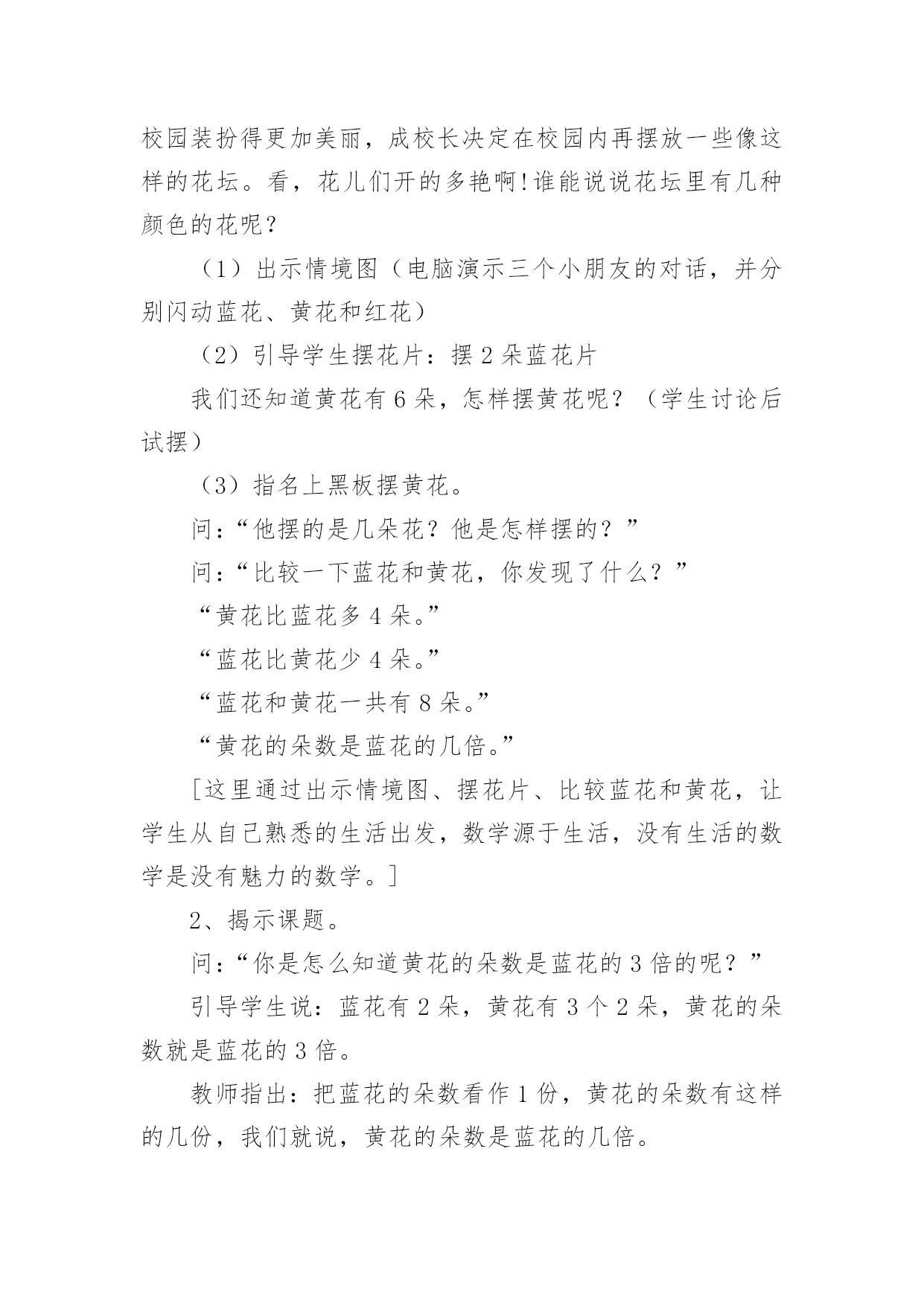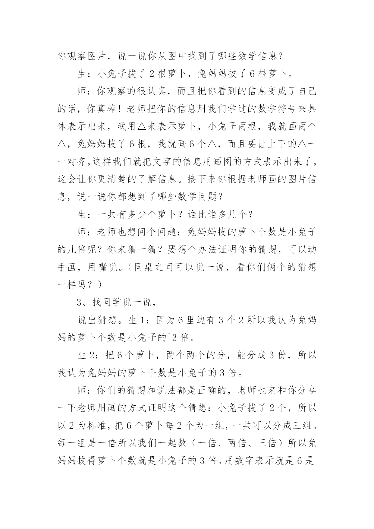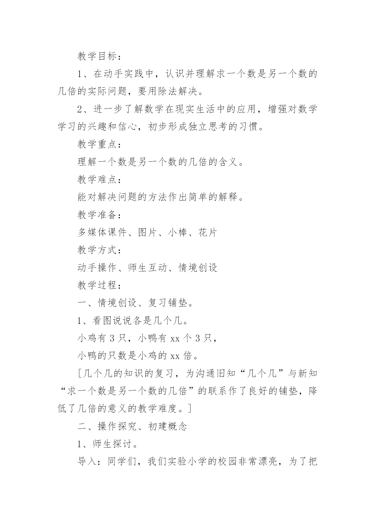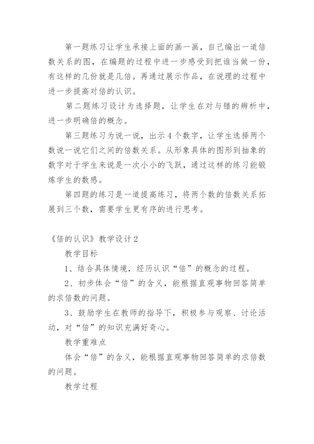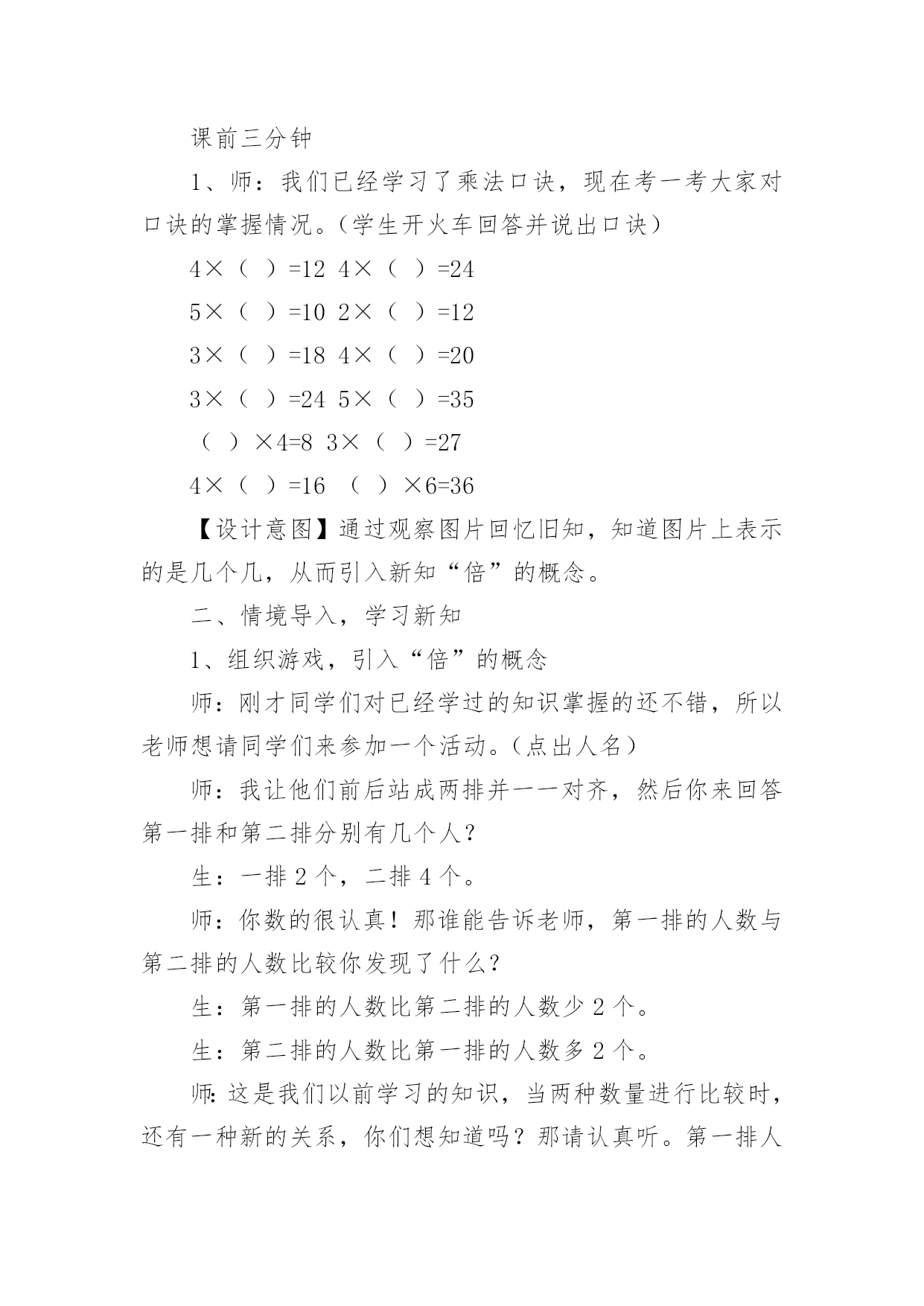 《倍的认识》教学设计作为一位不辞辛劳的人民教师,就有可能用到教学设计,教学设计是一个系统化规划教学系统的过程。那么大家知道规范的教学设计是怎么写的吗?下面是小编收集整理的《倍的认识》教学设计,仅供参考,大家一起来看看吧。《倍的认识》教学设计1一、教材(一)内容:人教版小学数学第三册例1、例2。(二)教材的地位及前后联系“倍的认识”是第三册第六单元“表内乘法和表内除法”的重要内容之一,教材从这里开始教学有关两个数的倍数关系的应用题。例1、例2是首先教学求一个数是另一个数的几倍的思维方法。教材以让学生实际操作为基础,联系一个数里面包含几个另一个数,使学生理解“倍”的概念。做到由浅入深,由具体到抽象,内容安排是科学的,符合学生的认知特点。(三)教学目标知识目标:初步建立“倍”的概念,知道“倍”是由两个数量比较得到的。能说出和摆出一个数量是另一个数量的几倍,理解“几倍”与“几个几”的联系。能力目标:培养学生观察、推理、迁移的能力及有条理的口头表达能力。情感目标:培养学生善于动脑的良好学习习惯和对数学的学习兴趣,培养他们创新的意识。(四)教学重点、难点重点:建立“倍”的概念,能说出和摆出一个数量是另一个数量的几倍。难点:理解“倍”的概念与除法含义的联系。二、教法与学法教法:根据以上分析,教学时,我主要采用电化教学、启发谈话、实物操作、合作交流等教学手段,创设一定的学习情境与和谐民主的学习氛围,自觉主动地获取知识。在教学中,充分发挥学生的主体地位,让他们通过动手摆小棒和图片,沟通新旧知识的联系,初步建立“倍”的概念,进而明白“一个数的几倍”的具体意义。学法:通过操作活动,让学生体验“一个数的几倍”的含义。运用独立思考和合作交流相结合的学习方式,引导学生用简洁的语言有条理地表达自己的思考过程。三、教学程序设计(一)创设问题情景,寓学于情由于“倍”的概念比较抽象,学生不容易建立表象。所以,课的开始从比较梨和苹果的个数开始,让学生看图说话比较两数之间有比多比少的关系,引出要学习新课内容——倍数关系。(二)探究新知1、认识倍,建立倍的概念通过3个梨和6个苹果的比较,圈一圈,发现6个苹果即为2个3,从而引出苹果的个数是梨的2倍。接着再逐一减少梨的个数,让学生说一说苹果与梨的倍数关系,最后比较3次的变式提出:苹果都是6个,为什么每次分的个数都不一样呢?让学生思考、讨论,初步感受到苹果是梨的几倍,要以梨的个数为标准,苹果有几个这样的几份,就是梨的几倍。2、感知“一个数的几倍是多少”在这个环节主要是通过动手操作,画一画,让学生感知一个数的几倍是多少。再画之前,让学生思考:怎么画才能一眼看出圆形是三角形的几倍?再通过比较上面的两题:○的个数都是△的2倍,为什么第一次画4个,第二次画8个?让学生进一步感知得出:△的`个数不同,也就是标准不一样,所以它的几倍也不一样。同时也让学生感知到求一个数的几倍就是求几个几。(三)练习提高巩固练习,是本节课学生消化知识的主要环节,也是学生加深理解倍的概念的环节。我一共设计了四道练习,习题由浅入深,层层递进,意图打开学生的思路,更让学生在分析、解决疑难时再一次明确几个几与几倍的关系。同时设计时注重一题多用,希望能的发挥习题的作用。第一题练习让学生承接上面的画一画,自己编出一道倍数关系的图,在编题的过程中进一步感受到把谁当做一份,有这样的几份就是几倍。再通过展示作品,在说理的过程中进一步提高对倍的认识。第二题练习设计为选择题,让学生在对与错的辨析中,进一步明确倍的概念。第三题练习为说一说,出示4个数字,让学生选择两个数说一说它们之间的倍数关系。从形象具体的图形到抽象的数字对于学生来说是一次小小的飞跃,通过这样的练习能锻炼学生的数感。第四题的练习是一道提高练习,将两个数的倍数关系拓展到三个数,需要学生更有序的进行思考。《倍的认识》教学设计2教学目标1、结合具体情境,经历认识“倍”的概念的过程。2、初步体会“倍”的含义,能根据直观事物回答简单的求倍数的问题。3、鼓励学生在教师的指导下,积极参与观察、讨论活动,对“倍”的知识充满好奇心。教学重难点体会“倍”的含义,能根据直观事物回答简单的求倍数的问题。教学过程课前三分钟1、师:我们已经学习了乘法口诀,现在考一考大家对口诀的掌握情况。(学生开火车回答并说出口诀)4×()=124×()=245×()=102×()=123×()=184×()=203×()=245×()=35()×4=83×()=274×()=16()×6=36【设计意图】通过观察图片回忆旧知,知道图片上表示的是几个几,从而引入新知“倍”的概念。二、情境导入,学习新知1、组织游戏,引入“倍”的概念师:刚才同学们对已经学过的知识掌握的还不错,所以老师想请同学们来参加一个活动。(点出人名)师:我让他们前后站成两排并一一对齐