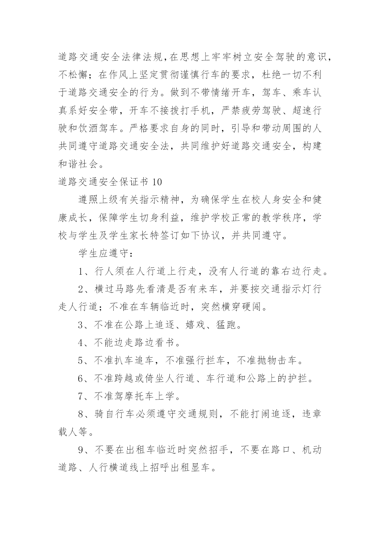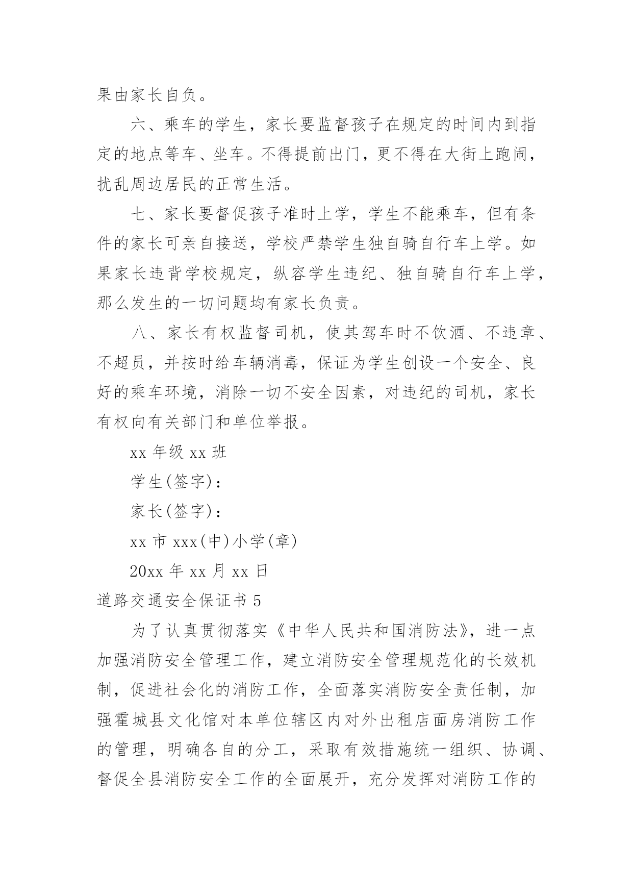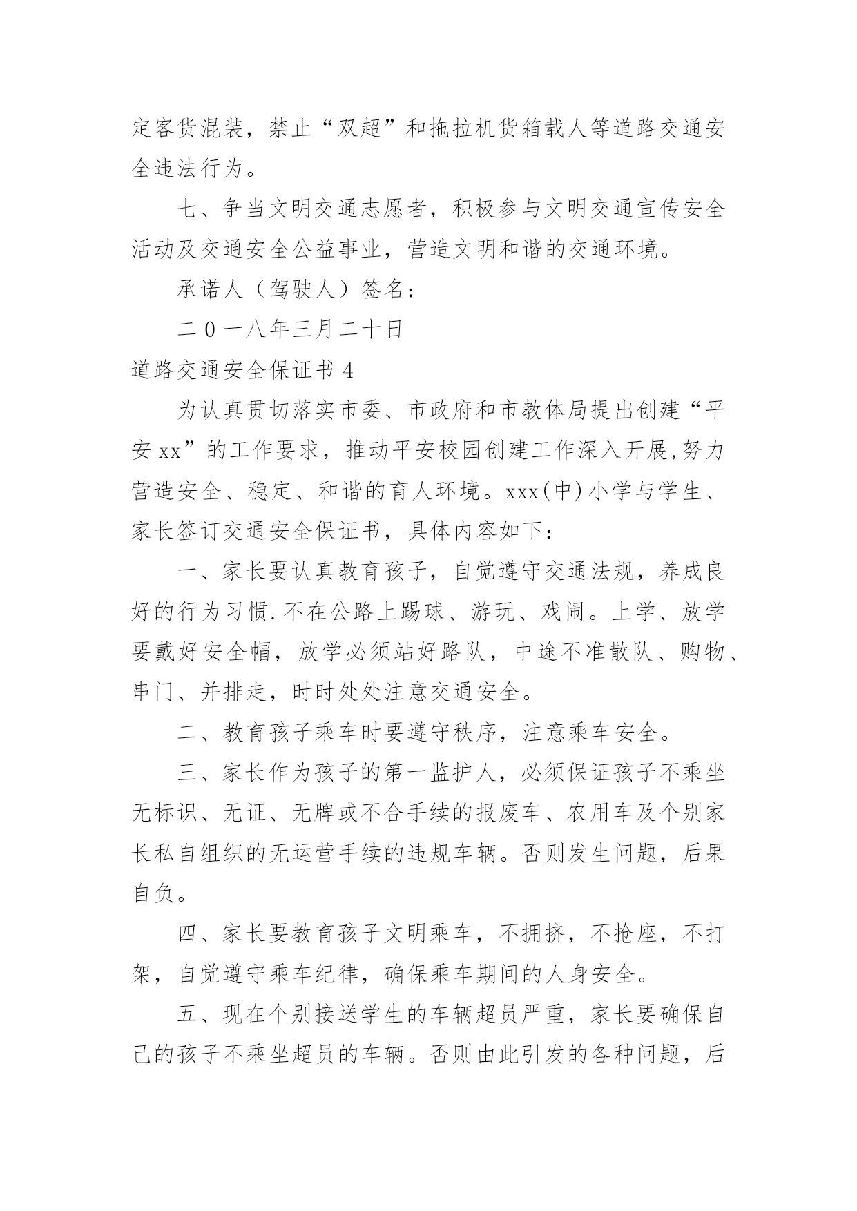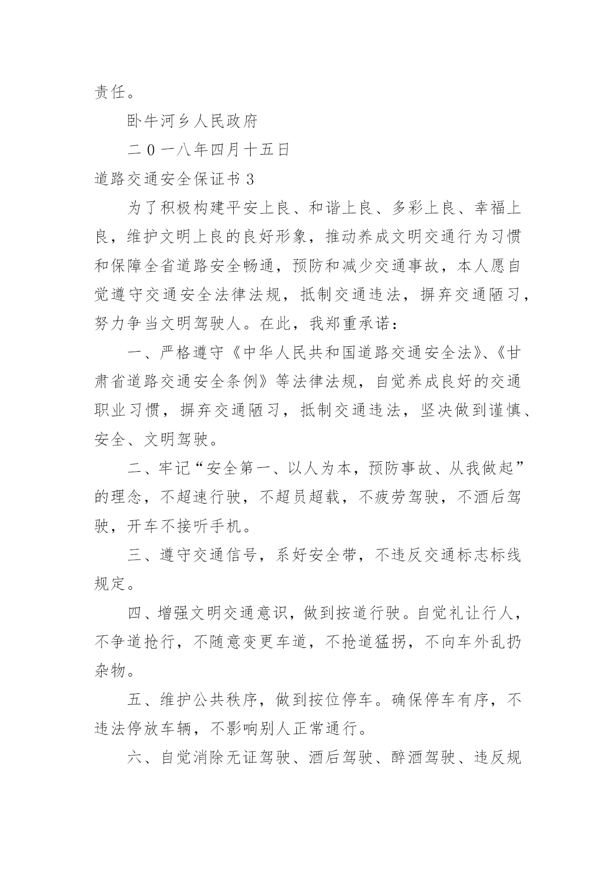 道路交通安全保证书道路交通安全保证书12篇在当下社会,保证书的使用成为日常生活的常态,保证书的具体行文需依照一般书信的格式。那么你真正懂得怎么写好保证书吗?下面是小编收集整理的道路交通安全保证书,供大家参考借鉴,希望可以帮助到有需要的朋友。道路交通安全保证书1一是公司对因工作需要外出办事的人员,实行统一派车制度,职工不得驾驶私有机动车办公事,不允许驾驶公车办私车,对违反规定者,发生交通事故由交通管理部门处理,公司不承担任何责任;二是公司专职驾驶员要认真学习《交通安全法》等法律法规。坚持出车前、行驶中、收车后的车辆检查,不开带病车,不酒后驾车,不无证驾车,不肇事逃逸,开文明车。自觉遵守单位的交通安全管理和日常管理;三是公司根据职工居住地区分布情况,配发了班车,因此,凡职工驾驶车辆、骑摩托车和自行车上下班者,属个人行为,如发生交通事故,公司不承担任何责任;四是根据钻二质安[20xx]4号和钻二[20xx]1号文《关于转发“关于禁止一线钻井职工在队期间回家的通知”的通知》的文件规定,钻井队职工在队上班和下班休息期间禁止回家,换班时职工必须统一乘坐公司安排的换班车,禁止驾车、骑摩托车和自车倒班,否则,发生交通事故公司不承担任何责任。为确保农村用车户生命财产安全,预防重特大道路交通事故的发生,用车户必须遵守以下规定:1、用车户必须具备驾驶车辆资格、证件齐全。2、无牌运营超过报废年限的车辆一律不得上路行驶。3、车辆驾乘人员必须严格遵守道路交通规则。4、非正式客运车辆一律禁止搭人载客。5、一律禁止把村屯内街道做为练习驾驶技术场所。如违反上述规定而造成意外交通事故,由用车户承担一切法律责任。xx乡人民政府20xx年x月xx日道路交通安全保证书2为确保农村用车户生命财产安全,预防重特大道路交通事故的发生,用车户必须遵守以下规定:1、用车户必须具备驾驶车辆资格、证件齐全。2、无牌运营超过报废年限的车辆一律不得上路行驶。3、车辆驾乘人员必须严格遵守道路交通规则。4、非正式客运车辆一律禁止搭人载客。5、一律禁止把村屯内街道做为练习驾驶技术场所。如违反上述规定而造成意外交通事故,由用车户承担一切法律责任。卧牛河乡人民政府二0一八年四月十五日道路交通安全保证书3为了积极构建平安上良、和谐上良、多彩上良、幸福上良,维护文明上良的良好形象,推动养成文明交通行为习惯和保障全省道路安全畅通,预防和减少交通事故,本人愿自觉遵守交通安全法律法规,抵制交通违法,摒弃交通陋习,努力争当文明驾驶人。在此,我郑重承诺:一、严格遵守《中华人民共和国道路交通安全法》、《甘肃省道路交通安全条例》等法律法规,自觉养成良好的交通职业习惯,摒弃交通陋习,抵制交通违法,坚决做到谨慎、安全、文明驾驶。二、牢记“安全第一、以人为本,预防事故、从我做起”的理念,不超速行驶,不超员超载,不疲劳驾驶,不酒后驾驶,开车不接听手机。三、遵守交通信号,系好安全带,不违反交通标志标线规定。四、增强文明交通意识,做到按道行驶。自觉礼让行人,不争道抢行,不随意变更车道,不抢道猛拐,不向车外乱扔杂物。五、维护公共秩序,做到按位停车。确保停车有序,不违法停放车辆,不影响别人正常通行。六、自觉消除无证驾驶、酒后驾驶、醉酒驾驶、违反规定客货混装,禁止“双超”和拖拉机货箱载人等道路交通安全违法行为。七、争当文明交通志愿者,积极参与文明交通宣传安全活动及交通安全公益事业,营造文明和谐的交通环境。承诺人(驾驶人)签名:二0一八年三月二十日道路交通安全保证书4为认真贯切落实市委、市政府和市教体局提出创建“平安xx”的工作要求,推动平安校园创建工作深入开展,努力营造安全、稳定、和谐的育人环境。xxx(中)小学与学生、家长签订交通安全保证书,具体内容如下:一、家长要认真教育孩子,自觉遵守交通法规,养成良好的行为习惯.不在公路上踢球、游玩、戏闹。上学、放学要戴好安全帽,放学必须站好路队,中途不准散队、购物、串门、并排走,时时处处注意交通安全。二、教育孩子乘车时要遵守秩序,注意乘车安全。三、家长作为孩子的第一监护人,必须保证孩子不乘坐无标识、无证、无牌或不合手续的报废车、农用车及个别家长私自组织的无运营手续的违规车辆。否则发生问题,后果自负。四、家长要教育孩子文明乘车,不拥挤,不抢座,不打架,自觉遵守乘车纪律,确保乘车期间的人身安全。五、现在个别接送学生的车辆超员严重,家长要确保自己的孩子不乘坐超员的车辆。否则由此引发的各种问题,后果由家长自负。六、乘车的学生,家长要监督孩子在规定的时间内到指定的地点等车、坐车。不得提前出门,更不得在大街上跑闹,扰乱周边居民的正常生活。七、家长要督促孩子准时上学,学生不能乘车,但有条件的家长可亲自接送,学校严禁学生独自骑自行车上学。如果家长违背学校规定,纵容学生违纪、独自骑自行车上学,那么发生的