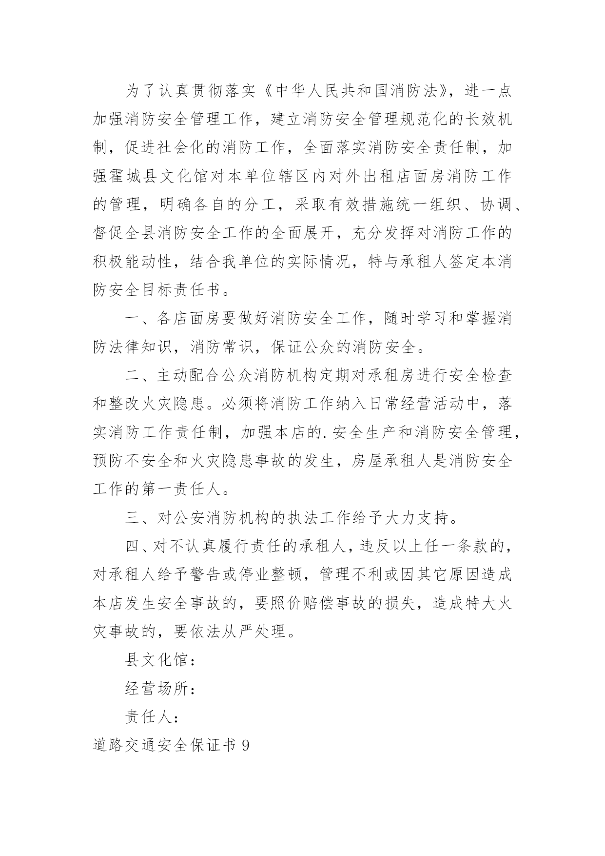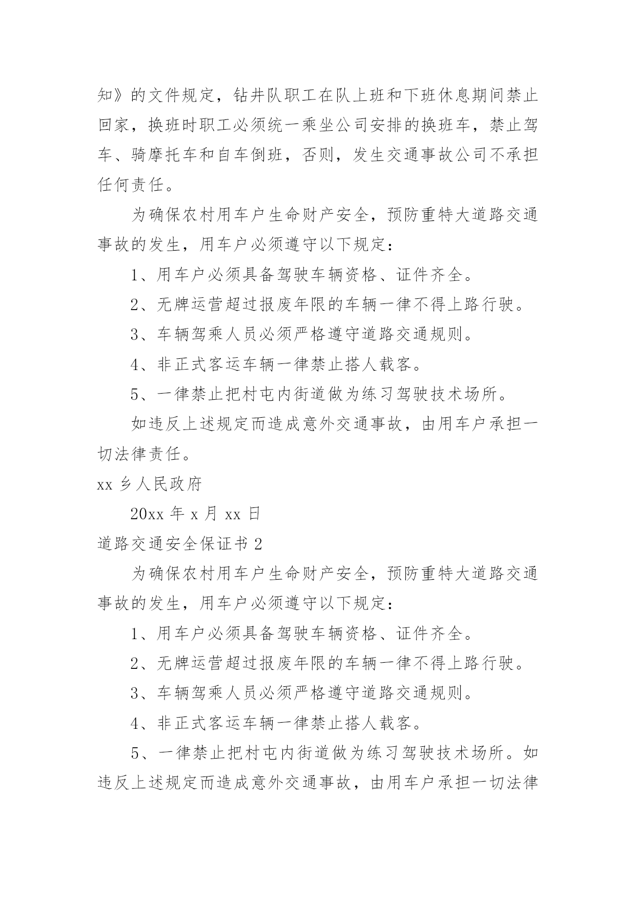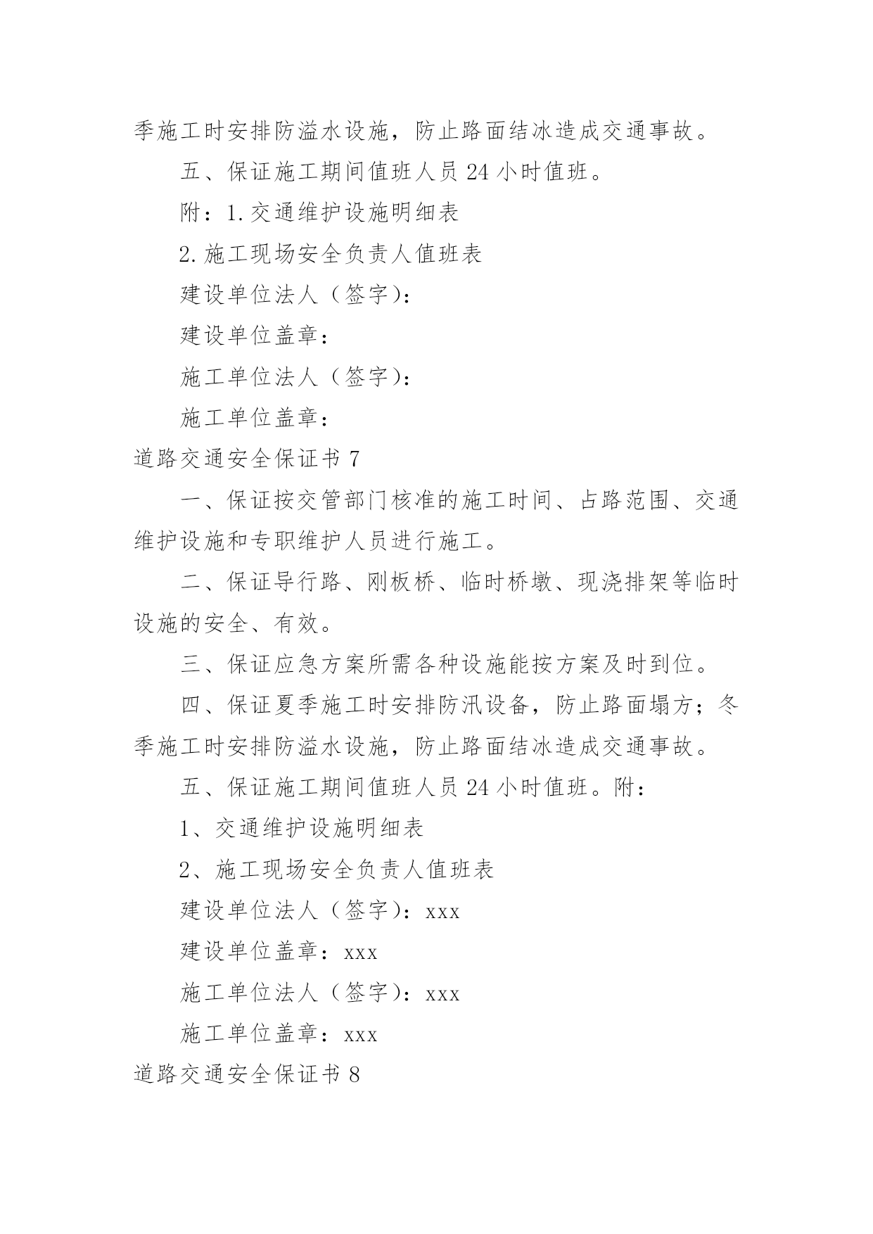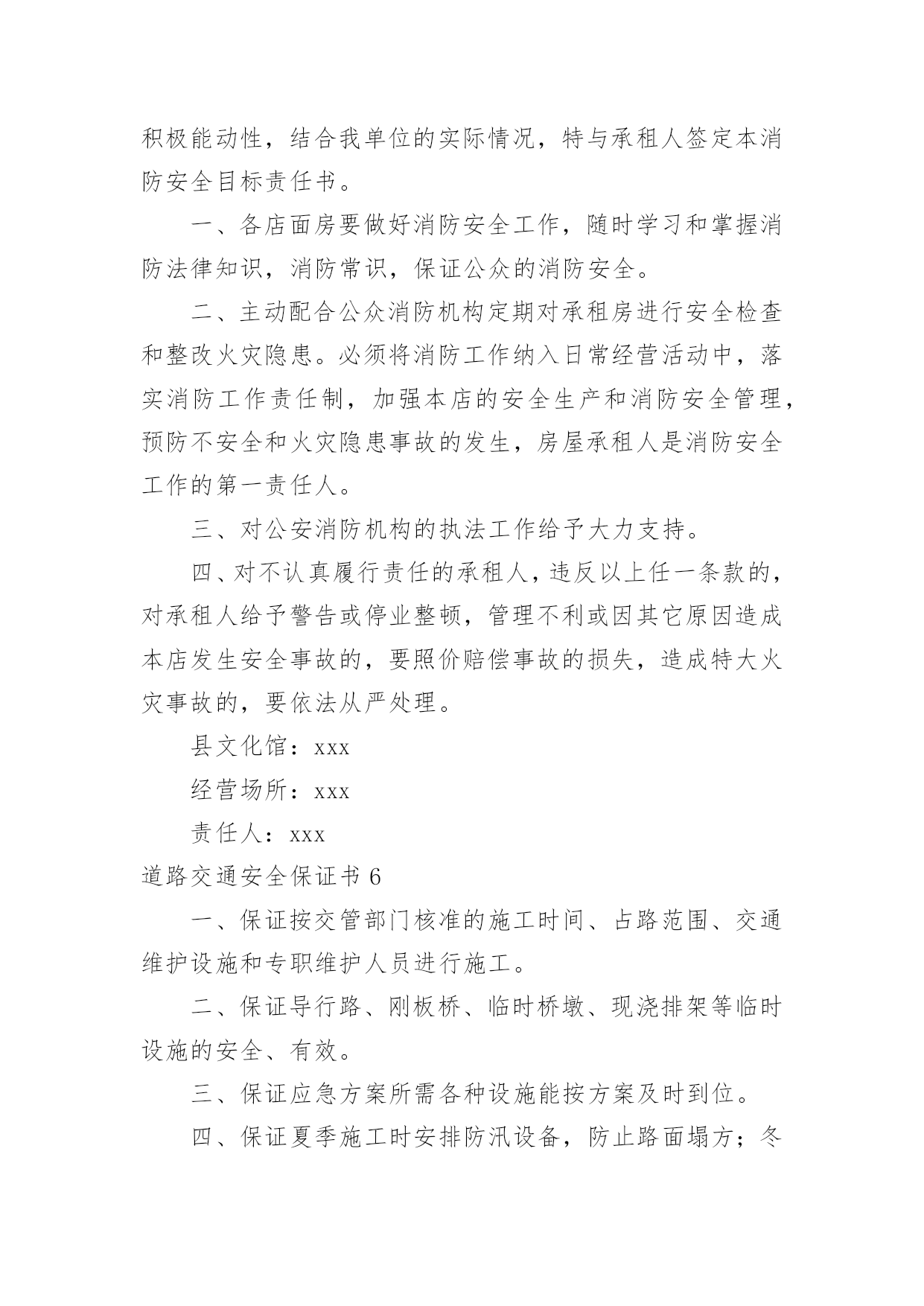 道路交通安全保证书道路交通安全保证书12篇在当下社会,保证书的使用成为日常生活的常态,保证书的具体行文需依照一般书信的格式。那么你真正懂得怎么写好保证书吗?下面是小编收集整理的道路交通安全保证书,供大家参考借鉴,希望可以帮助到有需要的朋友。道路交通安全保证书1一是公司对因工作需要外出办事的人员,实行统一派车制度,职工不得驾驶私有机动车办公事,不允许驾驶公车办私车,对违反规定者,发生交通事故由交通管理部门处理,公司不承担任何责任;二是公司专职驾驶员要认真学习《交通安全法》等法律法规。坚持出车前、行驶中、收车后的车辆检查,不开带病车,不酒后驾车,不无证驾车,不肇事逃逸,开文明车。自觉遵守单位的交通安全管理和日常管理;三是公司根据职工居住地区分布情况,配发了班车,因此,凡职工驾驶车辆、骑摩托车和自行车上下班者,属个人行为,如发生交通事故,公司不承担任何责任;四是根据钻二质安[20xx]4号和钻二[20xx]1号文《关于转发“关于禁止一线钻井职工在队期间回家的通知”的通知》的文件规定,钻井队职工在队上班和下班休息期间禁止回家,换班时职工必须统一乘坐公司安排的换班车,禁止驾车、骑摩托车和自车倒班,否则,发生交通事故公司不承担任何责任。为确保农村用车户生命财产安全,预防重特大道路交通事故的发生,用车户必须遵守以下规定:1、用车户必须具备驾驶车辆资格、证件齐全。2、无牌运营超过报废年限的车辆一律不得上路行驶。3、车辆驾乘人员必须严格遵守道路交通规则。4、非正式客运车辆一律禁止搭人载客。5、一律禁止把村屯内街道做为练习驾驶技术场所。如违反上述规定而造成意外交通事故,由用车户承担一切法律责任。xx乡人民政府20xx年x月xx日道路交通安全保证书2为确保农村用车户生命财产安全,预防重特大道路交通事故的发生,用车户必须遵守以下规定:1、用车户必须具备驾驶车辆资格、证件齐全。2、无牌运营超过报废年限的车辆一律不得上路行驶。3、车辆驾乘人员必须严格遵守道路交通规则。4、非正式客运车辆一律禁止搭人载客。5、一律禁止把村屯内街道做为练习驾驶技术场所。如违反上述规定而造成意外交通事故,由用车户承担一切法律责任。卧牛河乡人民政府二0一八年四月十五日道路交通安全保证书3为了积极构建平安上良、和谐上良、多彩上良、幸福上良,维护文明上良的良好形象,推动养成文明交通行为习惯和保障全省道路安全畅通,预防和减少交通事故,本人愿自觉遵守交通安全法律法规,抵制交通违法,摒弃交通陋习,努力争当文明驾驶人。在此,我郑重承诺:一、严格遵守《中华人民共和国道路交通安全法》、《甘肃省道路交通安全条例》等法律法规,自觉养成良好的交通职业习惯,摒弃交通陋习,抵制交通违法,坚决做到谨慎、安全、文明驾驶。二、牢记“安全第一、以人为本,预防事故、从我做起”的理念,不超速行驶,不超员超载,不疲劳驾驶,不酒后驾驶,开车不接听手机。三、遵守交通信号,系好安全带,不违反交通标志标线规定。四、增强文明交通意识,做到按道行驶。自觉礼让行人,不争道抢行,不随意变更车道,不抢道猛拐,不向车外乱扔杂物。五、维护公共秩序,做到按位停车。确保停车有序,不违法停放车辆,不影响别人正常通行。六、自觉消除无证驾驶、酒后驾驶、醉酒驾驶、违反规定客货混装,禁止“双超”和拖拉机货箱载人等道路交通安全违法行为。七、争当文明交通志愿者,积极参与文明交通宣传安全活动及交通安全公益事业,营造文明和谐的交通环境。承诺人(驾驶人)签名:二0一八年三月二十日道路交通安全保证书4为认真贯切落实市委、市政府和市教体局提出创建“平安xx”的工作要求,推动平安校园创建工作深入开展,努力营造安全、稳定、和谐的育人环境。xxx(中)小学与学生、家长签订交通安全保证书,具体内容如下:一、家长要认真教育孩子,自觉遵守交通法规,养成良好的行为习惯.不在公路上踢球、游玩、戏闹。上学、放学要戴好安全帽,放学必须站好路队,中途不准散队、购物、串门、并排走,时时处处注意交通安全。二、教育孩子乘车时要遵守秩序,注意乘车安全。三、家长作为孩子的第一监护人,必须保证孩子不乘坐无标识、无证、无牌或不合手续的报废车、农用车及个别家长私自组织的无运营手续的违规车辆。否则发生问题,后果自负。四、家长要教育孩子文明乘车,不拥挤,不抢座,不打架,自觉遵守乘车纪律,确保乘车期间的人身安全。五、现在个别接送学生的车辆超员严重,家长要确保自己的孩子不乘坐超员的车辆。否则由此引发的各种问题,后果由家长自负。六、乘车的学生,家长要监督孩子在规定的时间内到指定的地点等车、坐车。不得提前出门,更不得在大街上跑闹,扰乱周边居民的正常生活。七、家长要督促孩子准时上学,学生不能乘车,但有条件的家长可亲自接送,学校严禁学生独自骑自行车上学。如果家长违背学校规定,纵容学生违纪、独自骑自行车上学,那么发生的
