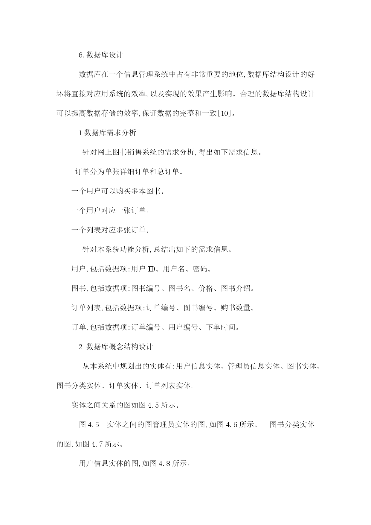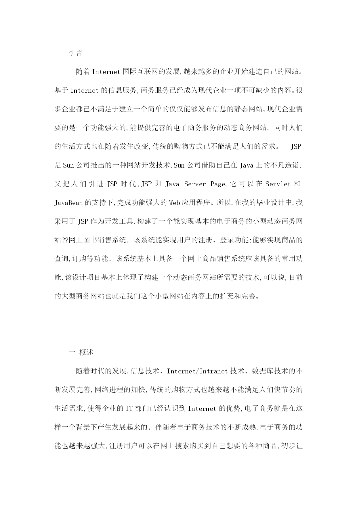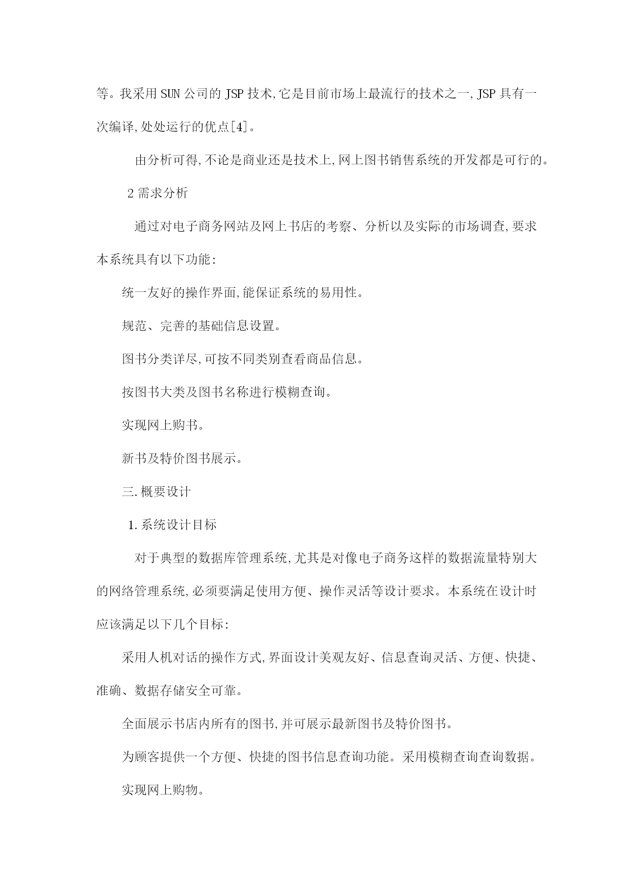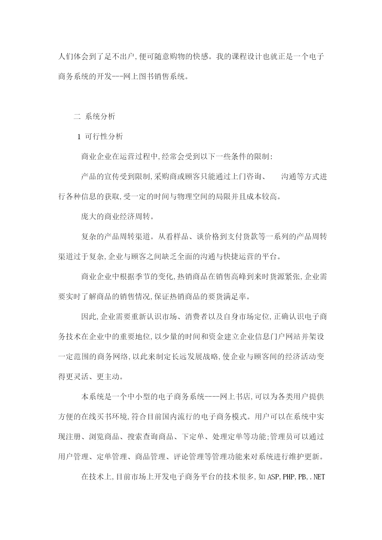 网上图书销售系统的设计与实现课程设计报告(常用版)(可以直接使用,可编辑完整版资料,欢迎下载)网上图书销售系统的设计与实现课程设计报告网上图书销售系统的设计与实现克拉玛依职业职业技术学院信息工程系计算机网络技术指导老师:陈晓华田娟学生:陈峰曹曙炜金川穆凯黛斯加勒努尔徐磊目录引言1一概述1二系统分析11可行性分析12需求分析2三.概要设计21.系统设计目标22.系统设计思想33.系统功能模块划分34.系统结构设计55.系统功能简介61系统基本功能66.数据库设计71数据库需求分析72数据库概念结构设计77.数据库逻辑结构设计9四.详细设计121.开发技术简介12(1)JSP简介12(2)JSP的运行原理12(3)JSP页面的组成134JavaBean技术介绍145JSP的运行环境142.系统主要文件153.详细设计及说明152字符处理Bean的编写173实现图书分类实体Bean204实现订单实体Bean215实现订单列表的Bean226实现购物车实体的Bean237管理用户登录Bean的编写238管理图书Bean的编写259管理图书分类Bean2910管理用户的Bean3011管理订单的Bean314.客户界面设计351界面头、界面尾设计352用户登陆模块设计353在线购书功能模块设计374我的购物车功能模块设计375订单信息功能模块设计425.管理界面设计431界面头、界面尾设计432管理员登陆功能模块设计434订单管理功能模块设计445用户管理功能模块设计45五.系统使用451.服务器的配置及环境的搭建452.进入前台473.进入后台47六.总结47致谢48参考文献48引言随着Internet国际互联网的发展,越来越多的企业开始建造自己的网站。基于Internet的信息服务,商务服务已经成为现代企业一项不可缺少的内容。很多企业都已不满足于建立一个简单的仅仅能够发布信息的静态网站。现代企业需要的是一个功能强大的,能提供完善的电子商务服务的动态商务网站。同时人们的生活方式也在随着发生改变,传统的购物方式已不能满足人们的需求。JSP是Sun公司推出的一种网站开发技术,Sun公司借助自己在Java上的不凡造诣,又把人们引进JSP时代,JSP即JavaServerPage,它可以在Servlet和JavaBean的支持下,完成功能强大的Web应用程序。所以,在我的毕业设计中,我采用了JSP作为开发工具,构建了一个能实现基本的电子商务的小型动态商务网站??网上图书销售系统。该系统能实现用户的注册、登录功能;能够实现商品的查询,订购等功能。该系统基本上具备一个网上商品销售系统应该具备的常用功能,该设计项目基本上体现了构建一个动态商务网站所需要的技术,可以说,目前的大型商务网站也就是我们这个小型网站在内容上的扩充和完善。一概述随着时代的发展,信息技术、Internet/Intranet技术、数据库技术的不断发展完善,网络进程的加快,传统的购物方式也越来越不能满足人们快节奏的生活需求,使得企业的IT部门已经认识到Internet的优势,电子商务就是在这样一个背景下产生发展起来的。伴随着电子商务技术的不断成熟,电子商务的功能也越来越强大,注册用户可以在网上搜索购买到自己想要的各种商品,初步让人们体会到了足不出户,便可随意购物的快感。我的课程设计也就正是一个电子商务系统的开发---网上图书销售系统。二系统分析1可行性分析商业企业在运营过程中,经常会受到以下一些条件的限制:产品的宣传受到限制,采购商或顾客只能通过上门咨询、沟通等方式进行各种信息的获取,受一定的时间与物理空间的局限并且成本较高。庞大的商业经济周转。复杂的产品周转渠道。从看样品、谈价格到支付货款等一系列的产品周转渠道过于复杂,企业与顾客之间缺乏全面的沟通与快捷运营的平台。商业企业中根据季节的变化,热销商品在销售高峰到来时货源紧张,企业需要实时了解商品的销售情况,保证热销商品的要货满足率。因此,企业需要重新认识市场、消费者以及自身市场定位,正确认识电子商务技术在企业中的重要地位,以少量的时间和资金建立企业信息门户网站并架设一定范围的商务网络,以此来制定长远发展战略,使企业与顾客间的经济活动变得更灵活、更主动。本系统是一个中小型的电子商务系统----网上书店,可以为各类用户提供方便的在线买书环境,符合目前国内流行的电子商务模式。用户可以在系统中实现注册、浏览商品、搜索查询商品、下定单、处理定单等功能;管理员可以通过用户管理、