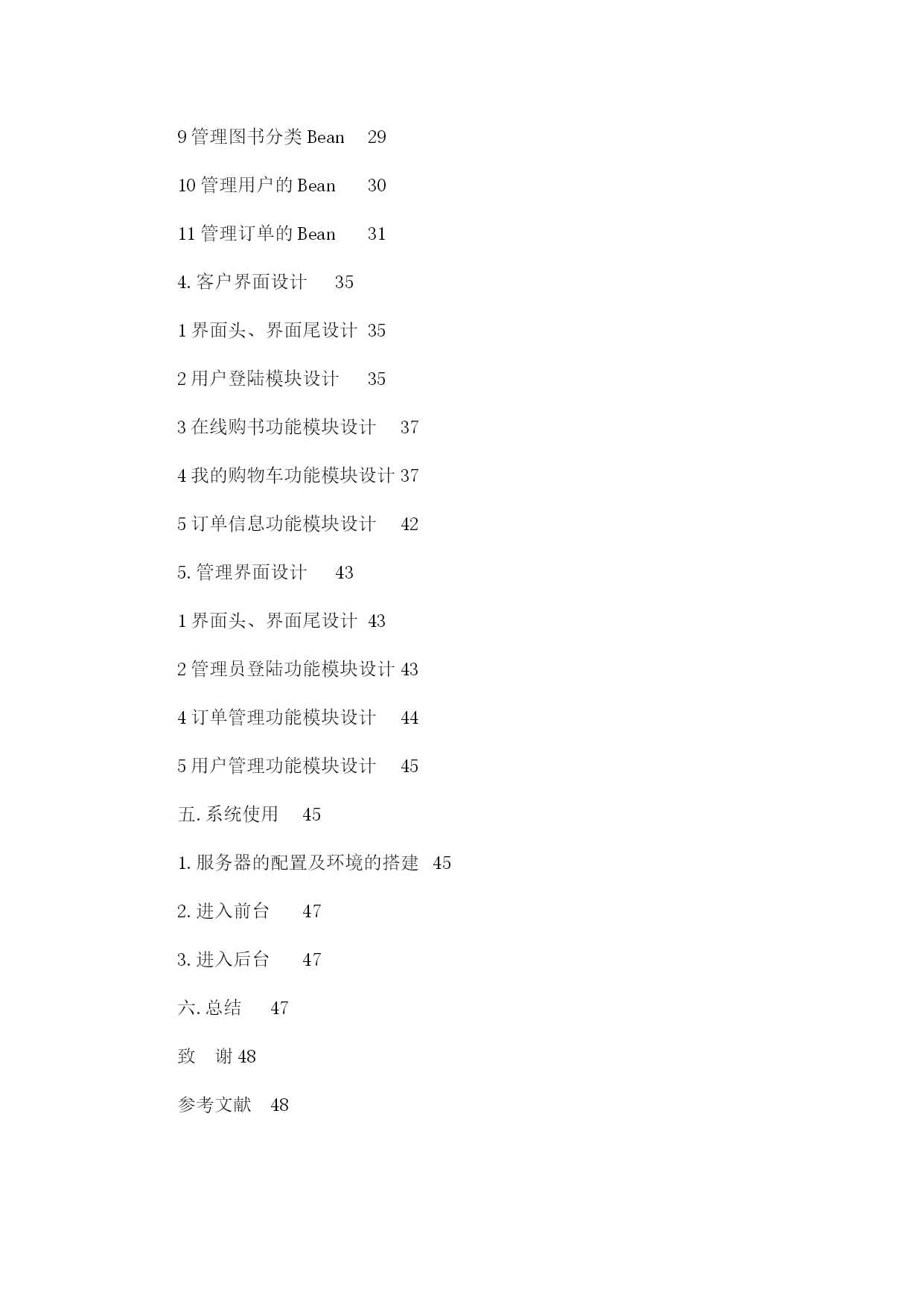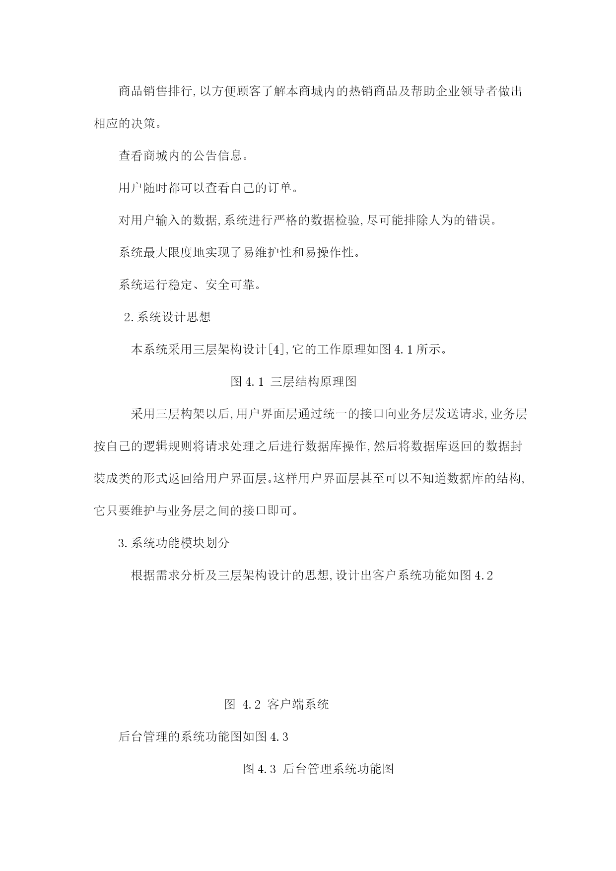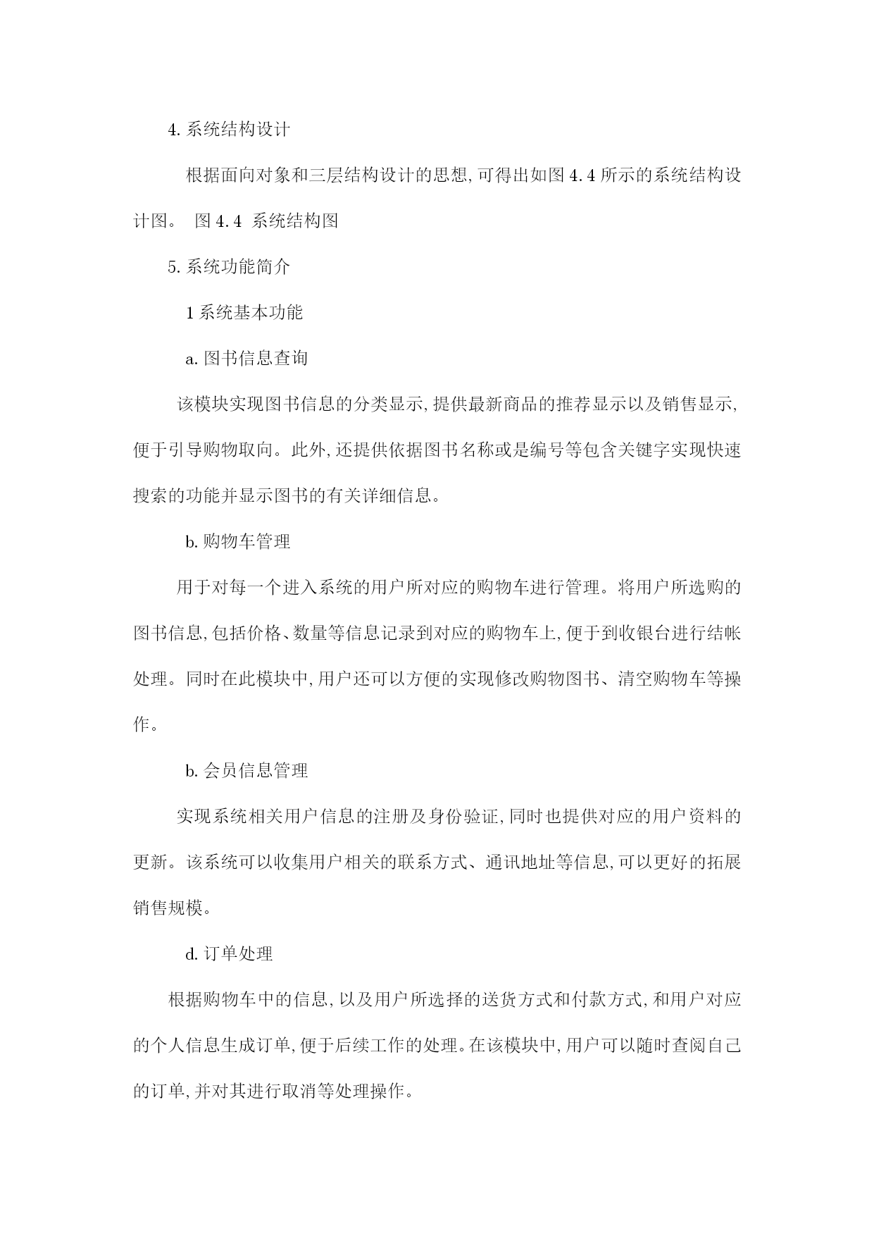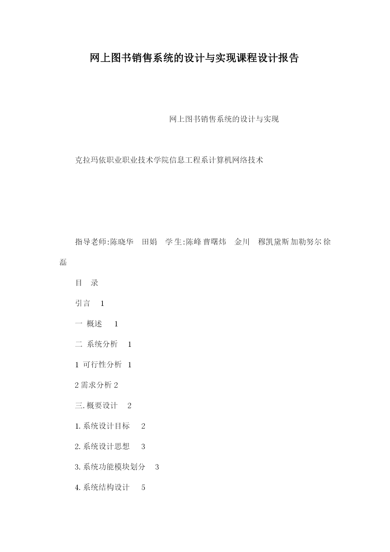 网上图书销售系统的设计与实现课程设计报告(常用版)(可以直接使用,可编辑完整版资料,欢迎下载)网上图书销售系统的设计与实现课程设计报告网上图书销售系统的设计与实现克拉玛依职业职业技术学院信息工程系计算机网络技术指导老师:陈晓华田娟学生:陈峰曹曙炜金川穆凯黛斯加勒努尔徐磊目录引言1一概述1二系统分析11可行性分析12需求分析2三.概要设计21.系统设计目标22.系统设计思想33.系统功能模块划分34.系统结构设计55.系统功能简介61系统基本功能66.数据库设计71数据库需求分析72数据库概念结构设计77.数据库逻辑结构设计9四.详细设计121.开发技术简介12(1)JSP简介12(2)JSP的运行原理12(3)JSP页面的组成134JavaBean技术介绍145JSP的运行环境142.系统主要文件153.详细设计及说明152字符处理Bean的编写173实现图书分类实体Bean204实现订单实体Bean215实现订单列表的Bean226实现购物车实体的Bean237管理用户登录Bean的编写238管理图书Bean的编写259管理图书分类Bean2910管理用户的Bean3011管理订单的Bean314.客户界面设计351界面头、界面尾设计352用户登陆模块设计353在线购书功能模块设计374我的购物车功能模块设计375订单信息功能模块设计425.管理界面设计431界面头、界面尾设计432管理员登陆功能模块设计434订单管理功能模块设计445用户管理功能模块设计45五.系统使用451.服务器的配置及环境的搭建452.进入前台473.进入后台47六.总结47致谢48参考文献48引言随着Internet国际互联网的发展,越来越多的企业开始建造自己的网站。基于Internet的信息服务,商务服务已经成为现代企业一项不可缺少的内容。很多企业都已不满足于建立一个简单的仅仅能够发布信息的静态网站。现代企业需要的是一个功能强大的,能提供完善的电子商务服务的动态商务网站。同时人们的生活方式也在随着发生改变,传统的购物方式已不能满足人们的需求。JSP是Sun公司推出的一种网站开发技术,Sun公司借助自己在Java上的不凡造诣,又把人们引进JSP时代,JSP即JavaServerPage,它可以在Servlet和JavaBean的支持下,完成功能强大的Web应用程序。所以,在我的毕业设计中,我采用了JSP作为开发工具,构建了一个能实现基本的电子商务的小型动态商务网站??网上图书销售系统。该系统能实现用户的注册、登录功能;能够实现商品的查询,订购等功能。该系统基本上具备一个网上商品销售系统应该具备的常用功能,该设计项目基本上体现了构建一个动态商务网站所需要的技术,可以说,目前的大型商务网站也就是我们这个小型网站在内容上的扩充和完善。一概述随着时代的发展,信息技术、Internet/Intranet技术、数据库技术的不断发展完善,网络进程的加快,传统的购物方式也越来越不能满足人们快节奏的生活需求,使得企业的IT部门已经认识到Internet的优势,电子商务就是在这样一个背景下产生发展起来的。伴随着电子商务技术的不断成熟,电子商务的功能也越来越强大,注册用户可以在网上搜索购买到自己想要的各种商品,初步让人们体会到了足不出户,便可随意购物的快感。我的课程设计也就正是一个电子商务系统的开发---网上图书销售系统。二系统分析1可行性分析商业企业在运营过程中,经常会受到以下一些条件的限制:产品的宣传受到限制,采购商或顾客只能通过上门咨询、沟通等方式进行各种信息的获取,受一定的时间与物理空间的局限并且成本较高。庞大的商业经济周转。复杂的产品周转渠道。从看样品、谈价格到支付货款等一系列的产品周转渠道过于复杂,企业与顾客之间缺乏全面的沟通与快捷运营的平台。商业企业中根据季节的变化,热销商品在销售高峰到来时货源紧张,企业需要实时了解商品的销售情况,保证热销商品的要货满足率。因此,企业需要重新认识市场、消费者以及自身市场定位,正确认识电子商务技术在企业中的重要地位,以少量的时间和资金建立企业信息门户网站并架设一定范围的商务网络,以此来制定长远发展战略,使企业与顾客间的经济活动变得更灵活、更主动。本系统是一个中小型的电子商务系统----网上书店,可以为各类用户提供方便的在线买书环境,符合目前国内流行的电子商务模式。用户可以在系统中实现注册、浏览商品、搜索查询商品、下定单、处理定单等功能;管理员可以通过用户管理、