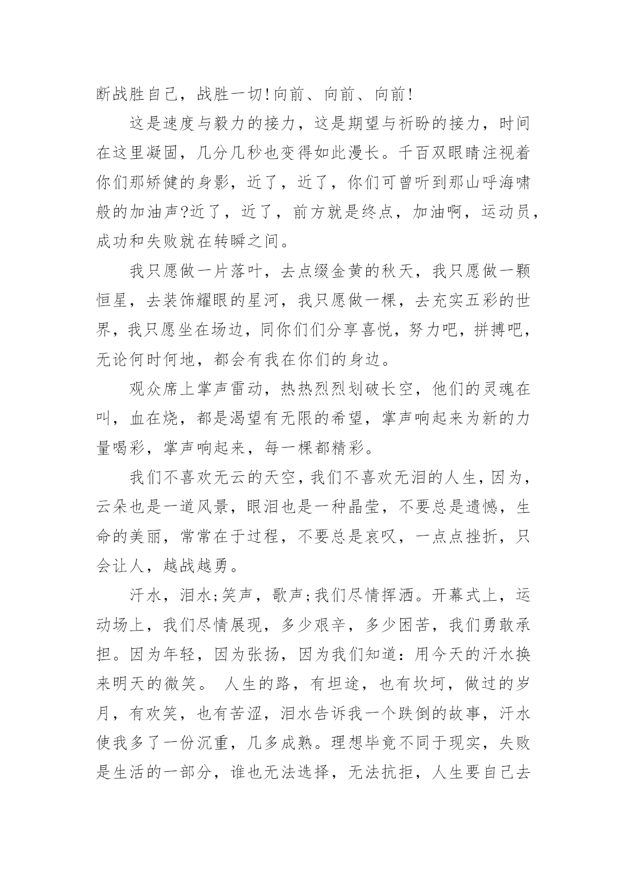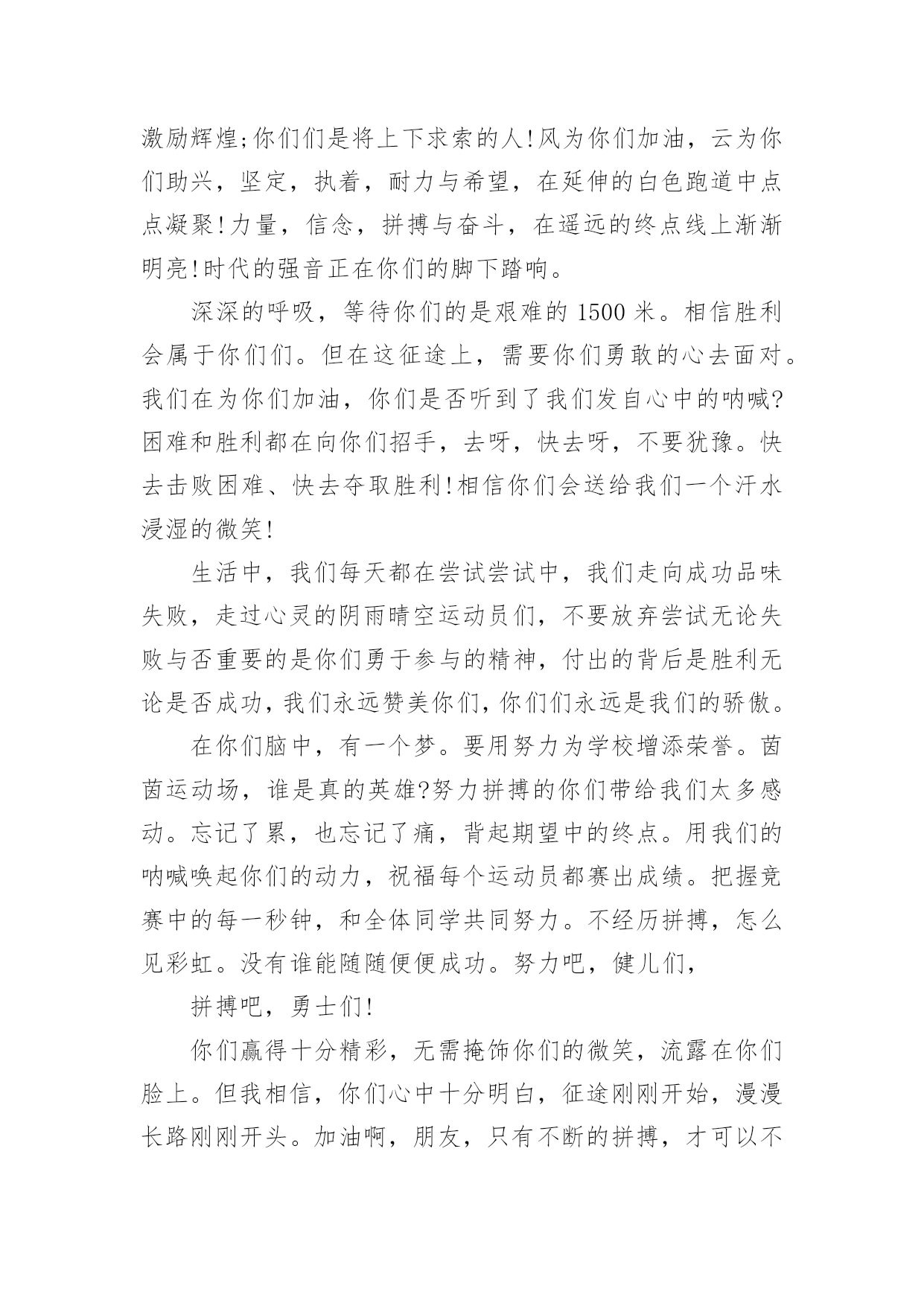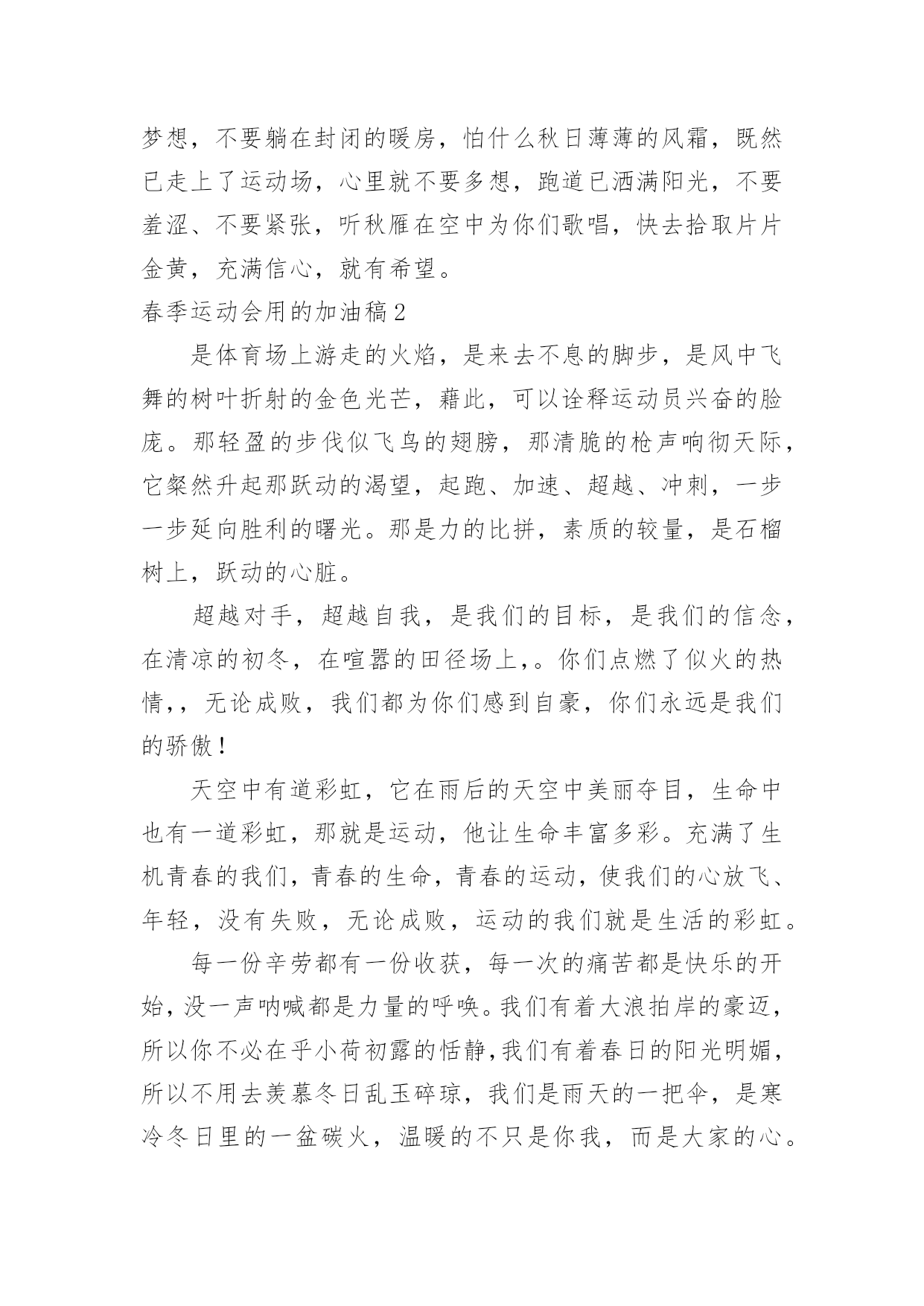 春季运动会用的加油稿春季运动会用的加油稿在学习、工作生活中,我们使用上加油稿的情况与日俱增,借助加油稿往往可以提升对方的气势。还是对加油稿一筹莫展吗?以下是小编帮大家整理的春季运动会用的加油稿,仅供参考,欢迎大家阅读。春季运动会用的加油稿1来吧,尽情释放你们的活力。你们的每一次冲刺,都叩动着我们的心弦;你们的每一次跨越,都吸引着我们的视线;你们的每一次起跳,都绷紧我们的神经。我们为你们呐喊,我们为你们自豪,我们为你们疯狂。青春的脚步,青春的速度,青春的活力,青春的激情,将会在你们们的身上尽情体现。迎接自我,挑战自我,战胜自我!我们相信你们们一定能行,加油吧,运动员!终点就在眼前!不为掌声的诠释,不为刻意的征服,只有辛勤的汗水化作追求的脚步,心中坚定的信念,脚下沉稳的步伐,你们用行动诉说着一个不变的真理,没有比脚更长的路,没有比人更高的山,希望在终点向你们招手,努力吧用你们坚韧不拔的毅志,去迎接终点的鲜花与掌声,相信成功属于你们。你们是运动场的心脏,跳动梦想;你们是漫长路的精神,激励辉煌;你们们是将上下求索的人!风为你们加油,云为你们助兴,坚定,执着,耐力与希望,在延伸的白色跑道中点点凝聚!力量,信念,拼搏与奋斗,在遥远的终点线上渐渐明亮!时代的强音正在你们的脚下踏响。深深的呼吸,等待你们的是艰难的1500米。相信胜利会属于你们们。但在这征途上,需要你们勇敢的心去面对。我们在为你们加油,你们是否听到了我们发自心中的呐喊?困难和胜利都在向你们招手,去呀,快去呀,不要犹豫。快去击败困难、快去夺取胜利!相信你们会送给我们一个汗水浸湿的微笑!生活中,我们每天都在尝试尝试中,我们走向成功品味失败,走过心灵的阴雨晴空运动员们,不要放弃尝试无论失败与否重要的是你们勇于参与的精神,付出的背后是胜利无论是否成功,我们永远赞美你们,你们们永远是我们的骄傲。在你们脑中,有一个梦。要用努力为学校增添荣誉。茵茵运动场,谁是真的英雄?努力拼搏的你们带给我们太多感动。忘记了累,也忘记了痛,背起期望中的终点。用我们的呐喊唤起你们的动力,祝福每个运动员都赛出成绩。把握竞赛中的每一秒钟,和全体同学共同努力。不经历拼搏,怎么见彩虹。没有谁能随随便便成功。努力吧,健儿们,拼搏吧,勇士们!你们赢得十分精彩,无需掩饰你们的微笑,流露在你们脸上。但我相信,你们心中十分明白,征途刚刚开始,漫漫长路刚刚开头。加油啊,朋友,只有不断的拼搏,才可以不断战胜自己,战胜一切!向前、向前、向前!这是速度与毅力的接力,这是期望与祈盼的接力,时间在这里凝固,几分几秒也变得如此漫长。千百双眼睛注视着你们那矫健的身影,近了,近了,你们可曾听到那山呼海啸般的加油声?近了,近了,前方就是终点,加油啊,运动员,成功和失败就在转瞬之间。我只愿做一片落叶,去点缀金黄的秋天,我只愿做一颗恒星,去装饰耀眼的星河,我只愿做一棵,去充实五彩的世界,我只愿坐在场边,同你们们分享喜悦,努力吧,拼搏吧,无论何时何地,都会有我在你们的身边。观众席上掌声雷动,热热烈烈划破长空,他们的灵魂在叫,血在烧,都是渴望有无限的希望,掌声响起来为新的力量喝彩,掌声响起来,每一棵都精彩。我们不喜欢无云的天空,我们不喜欢无泪的人生,因为,云朵也是一道风景,眼泪也是一种晶莹,不要总是遗憾,生命的美丽,常常在于过程,不要总是哀叹,一点点挫折,只会让人,越战越勇。汗水,泪水;笑声,歌声;我们尽情挥洒。开幕式上,运动场上,我们尽情展现,多少艰辛,多少困苦,我们勇敢承担。因为年轻,因为张扬,因为我们知道:用今天的汗水换来明天的微笑。人生的路,有坦途,也有坎坷,做过的岁月,有欢笑,也有苦涩,泪水告诉我一个跌倒的故事,汗水使我多了一份沉重,几多成熟。理想毕竟不同于现实,失败是生活的一部分,谁也无法选择,无法抗拒,人生要自己去拼搏,去奋斗,在风雨中百折不饶勇往直前。流泪不是失落,徘徊不是迷惑,成功属于那些战胜失败,坚持不懈,勇于追求梦想的人。是体育场上游走的火焰,是来去不息的脚步,是风中飞舞的树叶折射的金色光芒,藉此,可以诠释运动员兴奋的脸庞。那轻盈的步伐似飞鸟的翅膀,那清脆的枪声响彻天际,它粲然升起那跃动的渴望,起跑、加速、超越、冲刺,一步一步延向胜利的曙光。那是力的比拼,素质的较量,是石榴树上,跃动的心脏。超越对手,超越自我,是我们的目标,是我们的信念,在清凉的初冬,在喧嚣的田径场上,。你们们点燃了似火的热情,,无论成败,我们都为你们们感到自豪,你们们永远是我们的骄傲!天空中有道彩虹,它在雨后的天空中美丽夺目,生命中也有一道彩虹,那就是运动,他让生命丰富多彩。充满了生机青春的我们,青春的生命,青春的运动,使我们的心放飞、年轻,没有失败,无论成败,运动的我们就是生活的.彩虹。每一份辛劳都有一份收获,每一次的痛苦都是快乐的开始,没一声呐喊都是力量的呼