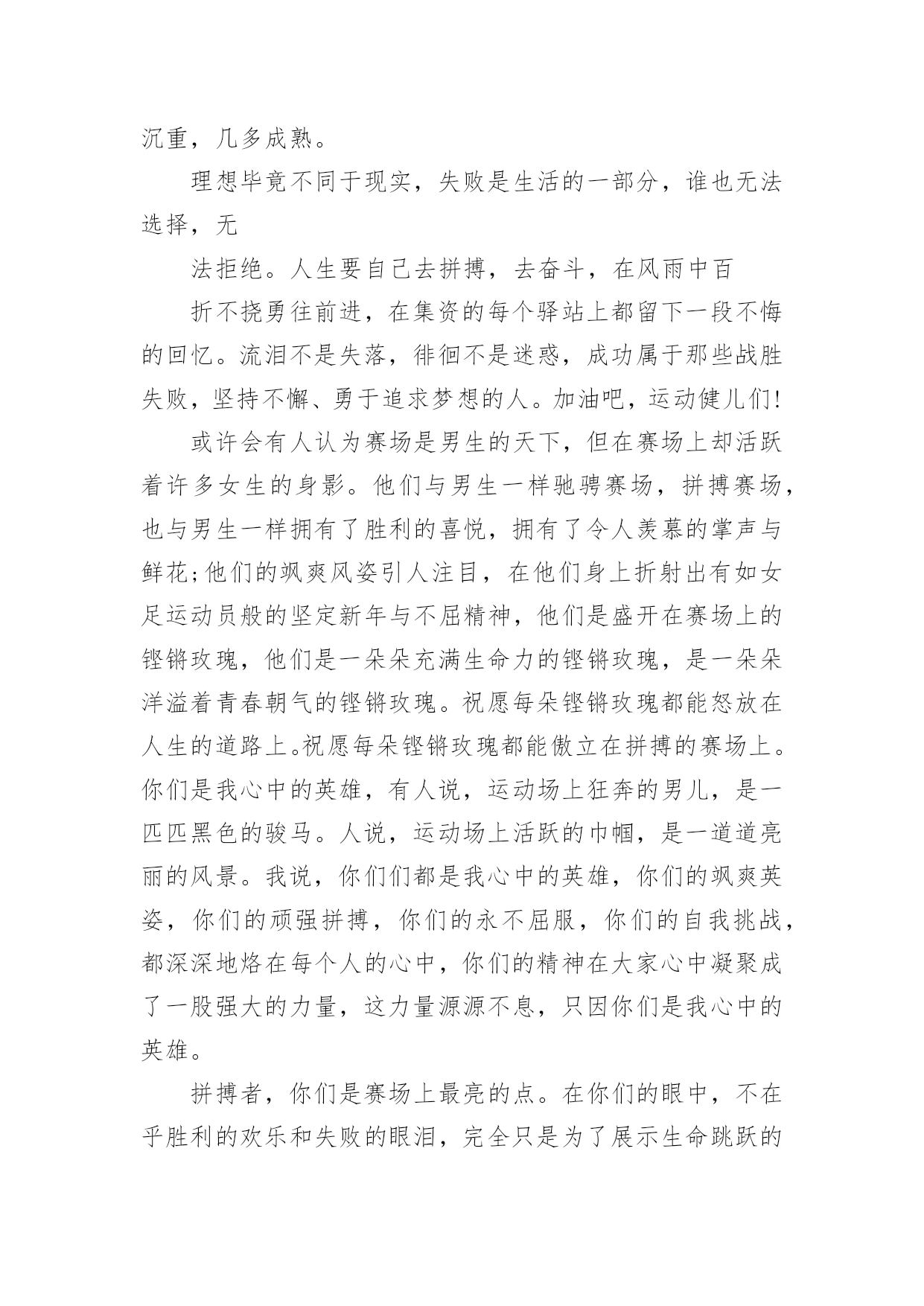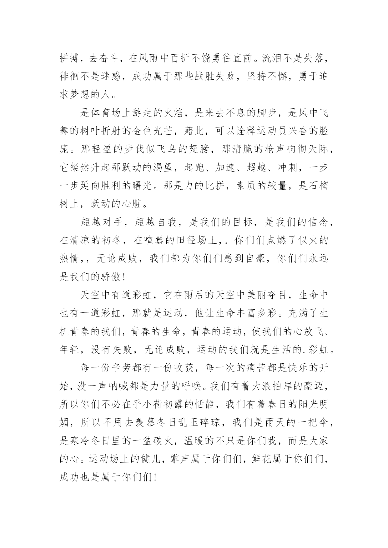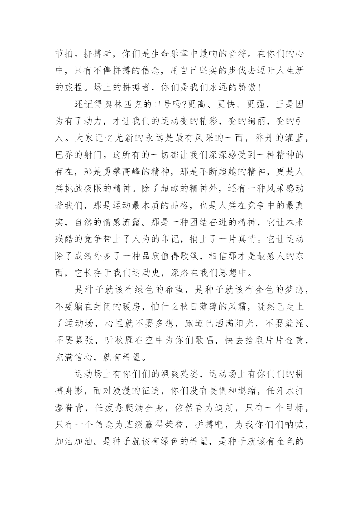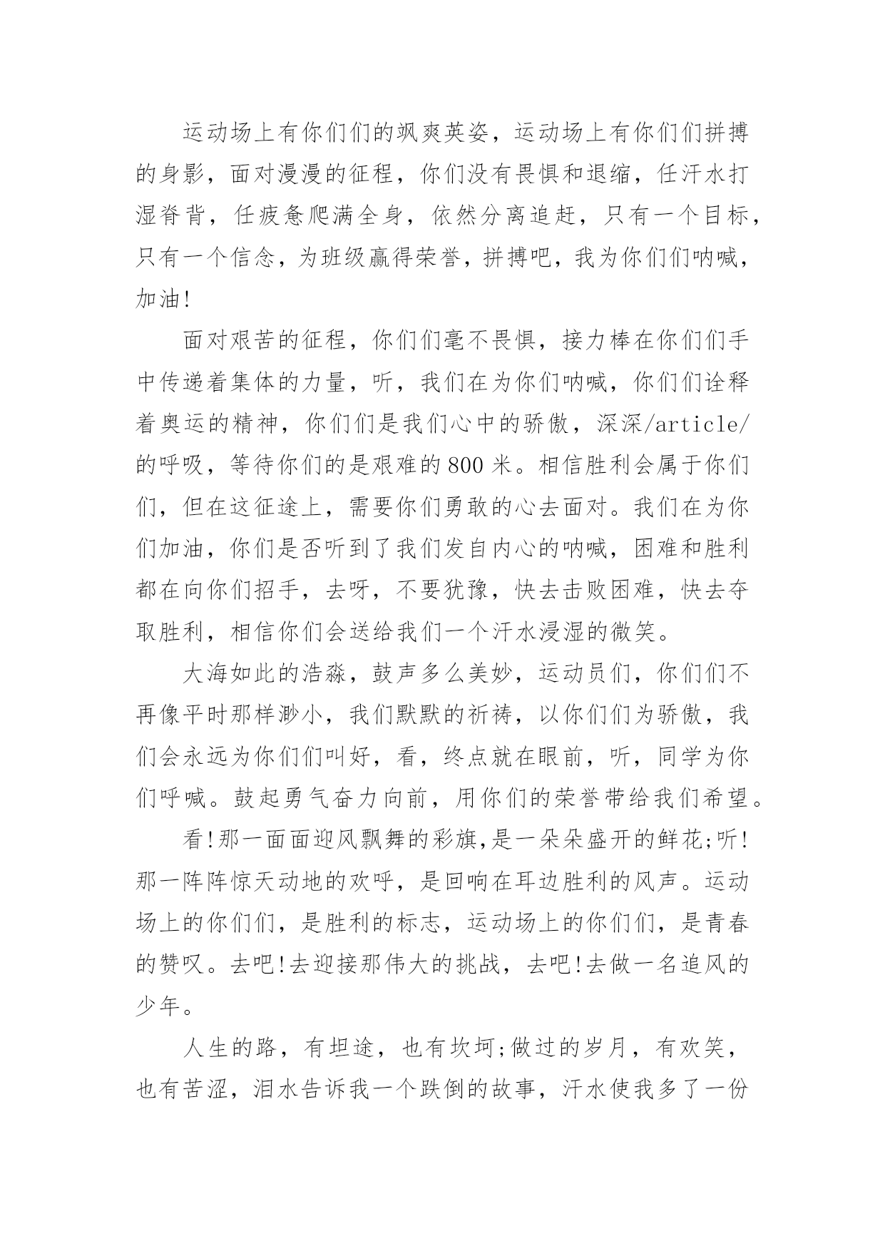 春季运动会用的加油稿春季运动会用的加油稿在学习、工作生活中,我们使用上加油稿的情况与日俱增,借助加油稿往往可以提升对方的气势。还是对加油稿一筹莫展吗?以下是小编帮大家整理的春季运动会用的加油稿,仅供参考,欢迎大家阅读。春季运动会用的加油稿1来吧,尽情释放你们的活力。你们的每一次冲刺,都叩动着我们的心弦;你们的每一次跨越,都吸引着我们的视线;你们的每一次起跳,都绷紧我们的神经。我们为你们呐喊,我们为你们自豪,我们为你们疯狂。青春的脚步,青春的速度,青春的活力,青春的激情,将会在你们们的身上尽情体现。迎接自我,挑战自我,战胜自我!我们相信你们们一定能行,加油吧,运动员!终点就在眼前!不为掌声的诠释,不为刻意的征服,只有辛勤的汗水化作追求的脚步,心中坚定的信念,脚下沉稳的步伐,你们用行动诉说着一个不变的真理,没有比脚更长的路,没有比人更高的山,希望在终点向你们招手,努力吧用你们坚韧不拔的毅志,去迎接终点的鲜花与掌声,相信成功属于你们。你们是运动场的心脏,跳动梦想;你们是漫长路的精神,激励辉煌;你们们是将上下求索的人!风为你们加油,云为你们助兴,坚定,执着,耐力与希望,在延伸的白色跑道中点点凝聚!力量,信念,拼搏与奋斗,在遥远的终点线上渐渐明亮!时代的强音正在你们的脚下踏响。深深的呼吸,等待你们的是艰难的1500米。相信胜利会属于你们们。但在这征途上,需要你们勇敢的心去面对。我们在为你们加油,你们是否听到了我们发自心中的呐喊?困难和胜利都在向你们招手,去呀,快去呀,不要犹豫。快去击败困难、快去夺取胜利!相信你们会送给我们一个汗水浸湿的微笑!生活中,我们每天都在尝试尝试中,我们走向成功品味失败,走过心灵的阴雨晴空运动员们,不要放弃尝试无论失败与否重要的是你们勇于参与的精神,付出的背后是胜利无论是否成功,我们永远赞美你们,你们们永远是我们的骄傲。在你们脑中,有一个梦。要用努力为学校增添荣誉。茵茵运动场,谁是真的英雄?努力拼搏的你们带给我们太多感动。忘记了累,也忘记了痛,背起期望中的终点。用我们的呐喊唤起你们的动力,祝福每个运动员都赛出成绩。把握竞赛中的每一秒钟,和全体同学共同努力。不经历拼搏,怎么见彩虹。没有谁能随随便便成功。努力吧,健儿们,拼搏吧,勇士们!你们赢得十分精彩,无需掩饰你们的微笑,流露在你们脸上。但我相信,你们心中十分明白,征途刚刚开始,漫漫长路刚刚开头。加油啊,朋友,只有不断的拼搏,才可以不断战胜自己,战胜一切!向前、向前、向前!这是速度与毅力的接力,这是期望与祈盼的接力,时间在这里凝固,几分几秒也变得如此漫长。千百双眼睛注视着你们那矫健的身影,近了,近了,你们可曾听到那山呼海啸般的加油声?近了,近了,前方就是终点,加油啊,运动员,成功和失败就在转瞬之间。我只愿做一片落叶,去点缀金黄的秋天,我只愿做一颗恒星,去装饰耀眼的星河,我只愿做一棵,去充实五彩的世界,我只愿坐在场边,同你们们分享喜悦,努力吧,拼搏吧,无论何时何地,都会有我在你们的身边。观众席上掌声雷动,热热烈烈划破长空,他们的灵魂在叫,血在烧,都是渴望有无限的希望,掌声响起来为新的力量喝彩,掌声响起来,每一棵都精彩。我们不喜欢无云的天空,我们不喜欢无泪的人生,因为,云朵也是一道风景,眼泪也是一种晶莹,不要总是遗憾,生命的美丽,常常在于过程,不要总是哀叹,一点点挫折,只会让人,越战越勇。汗水,泪水;笑声,歌声;我们尽情挥洒。开幕式上,运动场上,我们尽情展现,多少艰辛,多少困苦,我们勇敢承担。因为年轻,因为张扬,因为我们知道:用今天的汗水换来明天的微笑。人生的路,有坦途,也有坎坷,做过的岁月,有欢笑,也有苦涩,泪水告诉我一个跌倒的故事,汗水使我多了一份沉重,几多成熟。理想毕竟不同于现实,失败是生活的一部分,谁也无法选择,无法抗拒,人生要自己去拼搏,去奋斗,在风雨中百折不饶勇往直前。流泪不是失落,徘徊不是迷惑,成功属于那些战胜失败,坚持不懈,勇于追求梦想的人。是体育场上游走的火焰,是来去不息的脚步,是风中飞舞的树叶折射的金色光芒,藉此,可以诠释运动员兴奋的脸庞。那轻盈的步伐似飞鸟的翅膀,那清脆的枪声响彻天际,它粲然升起那跃动的渴望,起跑、加速、超越、冲刺,一步一步延向胜利的曙光。那是力的比拼,素质的较量,是石榴树上,跃动的心脏。超越对手,超越自我,是我们的目标,是我们的信念,在清凉的初冬,在喧嚣的田径场上,。你们们点燃了似火的热情,,无论成败,我们都为你们们感到自豪,你们们永远是我们的骄傲!天空中有道彩虹,它在雨后的天空中美丽夺目,生命中也有一道彩虹,那就是运动,他让生命丰富多彩。充满了生机青春的我们,青春的生命,青春的运动,使我们的心放飞、年轻,没有失败,无论成败,运动的我们就是生活的.彩虹。每一份辛劳都有一份收获,每一次的痛苦都是快乐的开始,没一声呐喊都是力量的呼