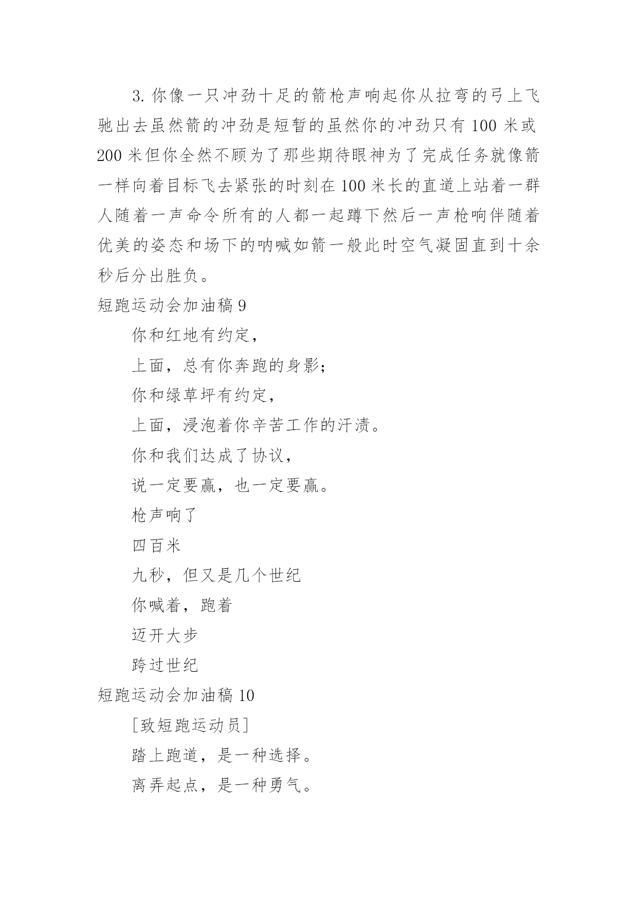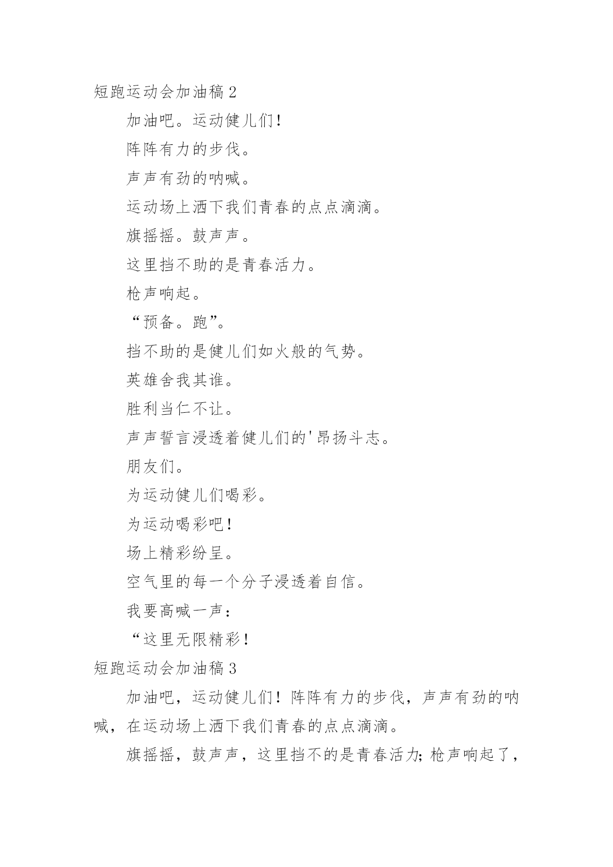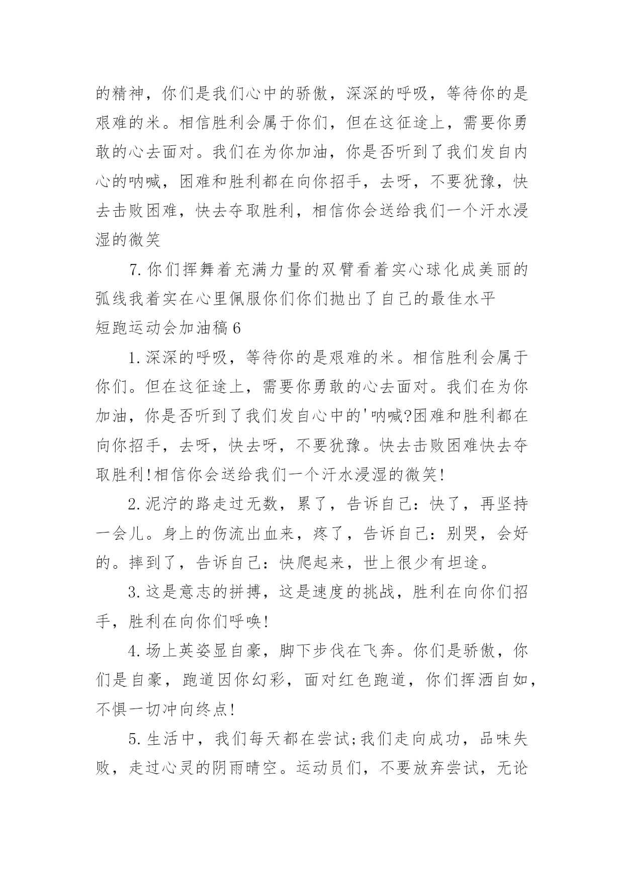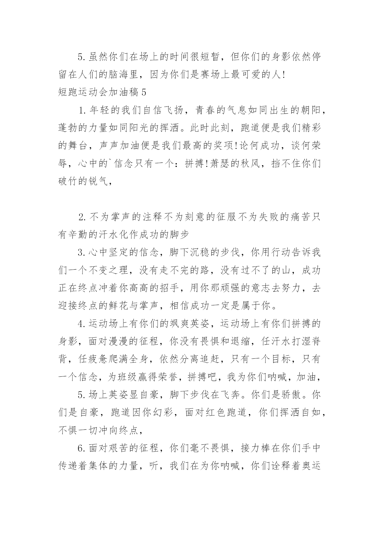 短跑运动会加油稿短跑运动会加油稿(集锦15篇)在学习、工作生活中,需要使用加油稿的场合越来越多,加油稿可以促进对方完成目标的进程。大家知道加油稿怎么写才正确吗?以下是小编收集整理的短跑运动会加油稿,供大家参考借鉴,希望可以帮助到有需要的朋友。短跑运动会加油稿1起跑线上你们一字排开健美的肌肉蕴含着爆发力量坚定的目光中充满了自信枪响了你们开始了并不长的征程笔直的跑道上有你们稳健的足迹不远的.终点将留下你们冲刺时矫捷的背影加油吧掌声将为你响起加油吧胜利和鲜花终将属于你们短跑运动会加油稿2加油吧。运动健儿们!阵阵有力的步伐。声声有劲的呐喊。运动场上洒下我们青春的点点滴滴。旗摇摇。鼓声声。这里挡不助的是青春活力。枪声响起。“预备。跑”。挡不助的是健儿们如火般的气势。英雄舍我其谁。胜利当仁不让。声声誓言浸透着健儿们的'昂扬斗志。朋友们。为运动健儿们喝彩。为运动喝彩吧!场上精彩纷呈。空气里的每一个分子浸透着自信。我要高喊一声:“这里无限精彩!短跑运动会加油稿3加油吧,运动健儿们!阵阵有力的步伐,声声有劲的呐喊,在运动场上洒下我们青春的点点滴滴。旗摇摇,鼓声声,这里挡不的是青春活力;枪声响起了,“预备起跑”,挡不助的是健儿们如火般的`气势啊。英雄舍我其谁,胜利当仁不让,声声誓言浸透着健儿们的昂扬斗志。朋友们,为运动健儿们喝彩,为运动喝彩吧!场上精彩纷呈,空气里的每一个分子浸透着自信。我要高喊一声:“这里无限精彩!短跑运动会加油稿41.一根小小的木棒,连接的是团结和友爱;一根小小的木棒,传递的是勇气和力量;一根小小的木棒,演绎的是奋斗和拼搏;加油吧!让这激动人心的时刻,一直回荡在我们心中!2.看!那一面面迎风飘舞的.彩旗,是一朵朵盛开的鲜花;听!那一阵阵惊天动地的欢呼,是回响在耳边胜利的风声。运动场上的你们,是胜利的标志,运动场上的你们,是青春的赞叹。去吧!去迎接那伟大的挑战,去吧!去做一名追风的少年。3.温暖的阳光洒在赛场上,男子乙组标枪的比赛即将开始。赛场上,一道道优美的弧线将轻盈地划过天空。健儿们用手中的标枪向距离的权限发起一轮又一轮的挑战。标枪在空中轻盈的姿态,是健儿们强健的力量和熟练的技巧的结合。谁能在这场激烈的竞争中获胜?让我们拭目以待,让我们为他们呐喊助威吧!只有将力量与技巧合二为一的人,才能获得胜利的桂冠!4.时间在流逝,赛道在延伸,成功在你面前展现心脏的跳动,热血在沸腾,辉煌在你脚下铸就。加油吧,健儿们!5.虽然你们在场上的时间很短暂,但你们的身影依然停留在人们的脑海里,因为你们是赛场上最可爱的人!短跑运动会加油稿51.年轻的我们自信飞扬,青春的气息如同出生的朝阳,蓬勃的力量如同阳光的挥洒。此时此刻,跑道便是我们精彩的舞台,声声加油便是我们最高的奖项!论何成功,谈何荣辱,心中的`信念只有一个:拼搏!萧瑟的秋风,挡不住你们破竹的锐气,2.不为掌声的注释不为刻意的征服不为失败的痛苦只有辛勤的汗水化作成功的脚步3.心中坚定的信念,脚下沉稳的步伐,你用行动告诉我们一个不变之理,没有走不完的路,没有过不了的山,成功正在终点冲着你高高的招手,用你那顽强的意志去努力,去迎接终点的鲜花与掌声,相信成功一定是属于你。4.运动场上有你们的飒爽英姿,运动场上有你们拼搏的身影,面对漫漫的征程,你没有畏惧和退缩,任汗水打湿脊背,任疲惫爬满全身,依然分离追赶,只有一个目标,只有一个信念,为班级赢得荣誉,拼搏吧,我为你们呐喊,加油,5.场上英姿显自豪,脚下步伐在飞奔。你们是骄傲。你们是自豪,跑道因你幻彩,面对红色跑道,你们挥洒自如,不惧一切冲向终点,6.面对艰苦的征程,你们毫不畏惧,接力棒在你们手中传递着集体的力量,听,我们在为你呐喊,你们诠释着奥运的精神,你们是我们心中的骄傲,深深的呼吸,等待你的是艰难的米。相信胜利会属于你们,但在这征途上,需要你勇敢的心去面对。我们在为你加油,你是否听到了我们发自内心的呐喊,困难和胜利都在向你招手,去呀,不要犹豫,快去击败困难,快去夺取胜利,相信你会送给我们一个汗水浸湿的微笑7.你们挥舞着充满力量的双臂看着实心球化成美丽的弧线我着实在心里佩服你们你们抛出了自己的最佳水平短跑运动会加油稿61.深深的呼吸,等待你的是艰难的米。相信胜利会属于你们。但在这征途上,需要你勇敢的心去面对。我们在为你加油,你是否听到了我们发自心中的'呐喊?困难和胜利都在向你招手,去呀,快去呀,不要犹豫。快去击败困难快去夺取胜利!相信你会送给我们一个汗水浸湿的微笑!2.泥泞的路走过无数,累了,告诉自己:快了,再坚持一会儿。身上的伤流出血来,疼了,告诉自己:别哭,会好的。摔到了,告诉自己:快爬起来,世上很少有坦途。3.这是意志的拼搏,这是速度的挑战,胜利在向你们招手,胜利在向你们呼唤!4.场上英姿显自豪,脚下步伐在飞奔。你们是骄傲,你们是自豪,跑道