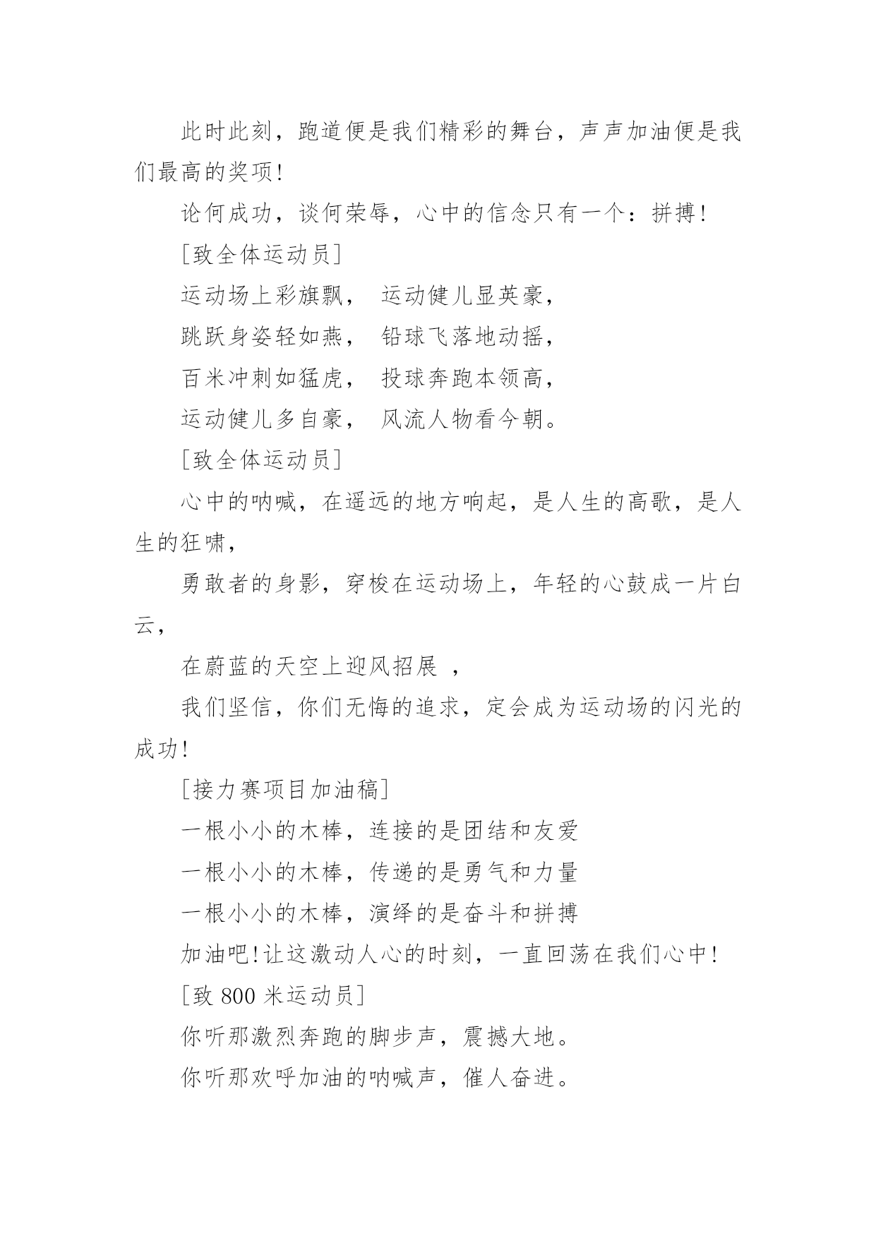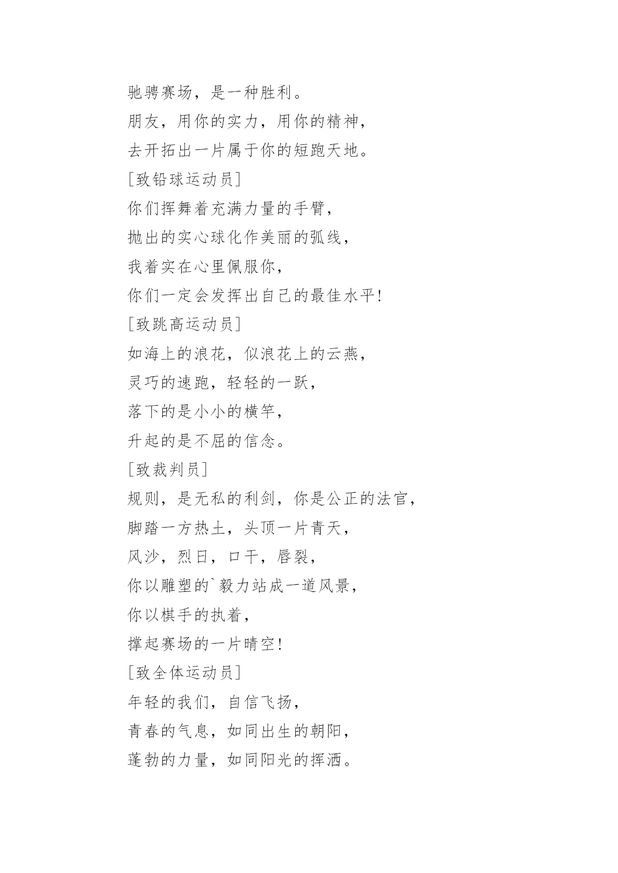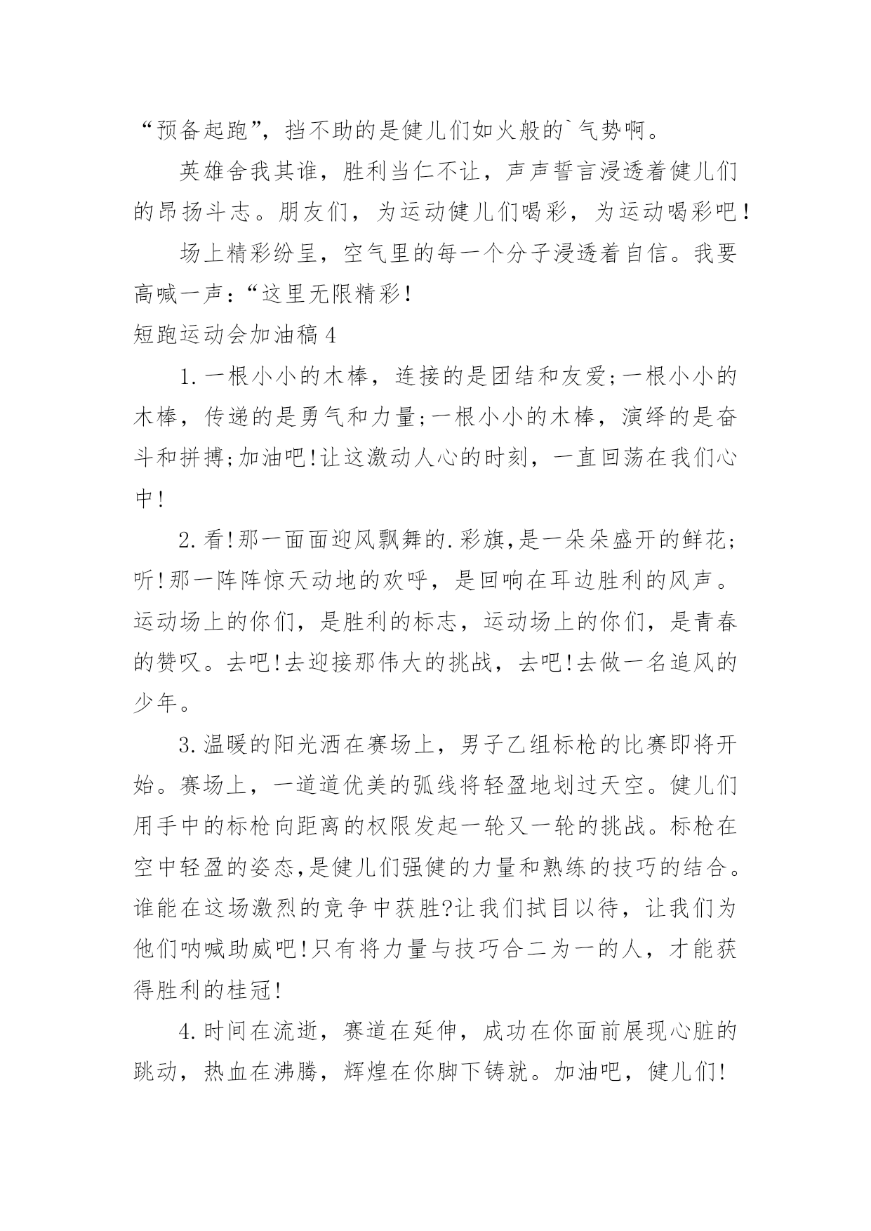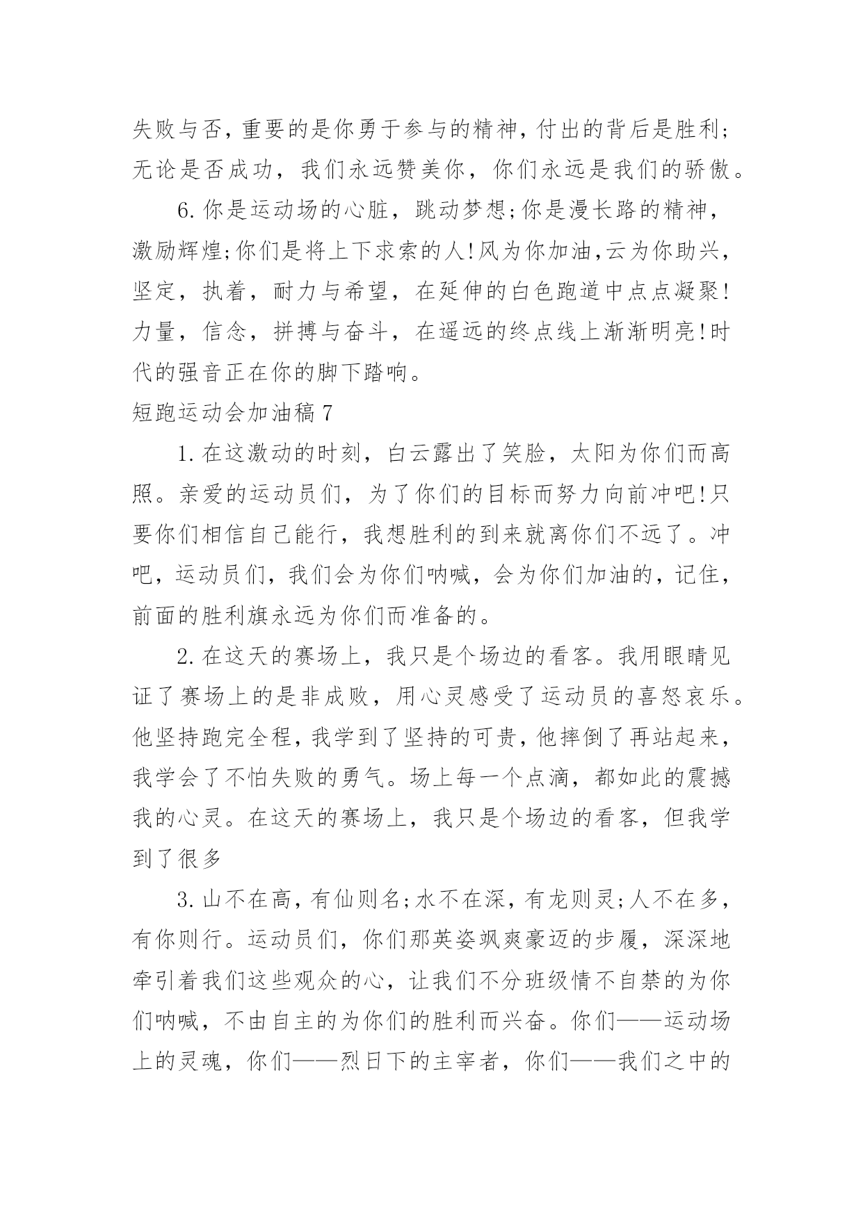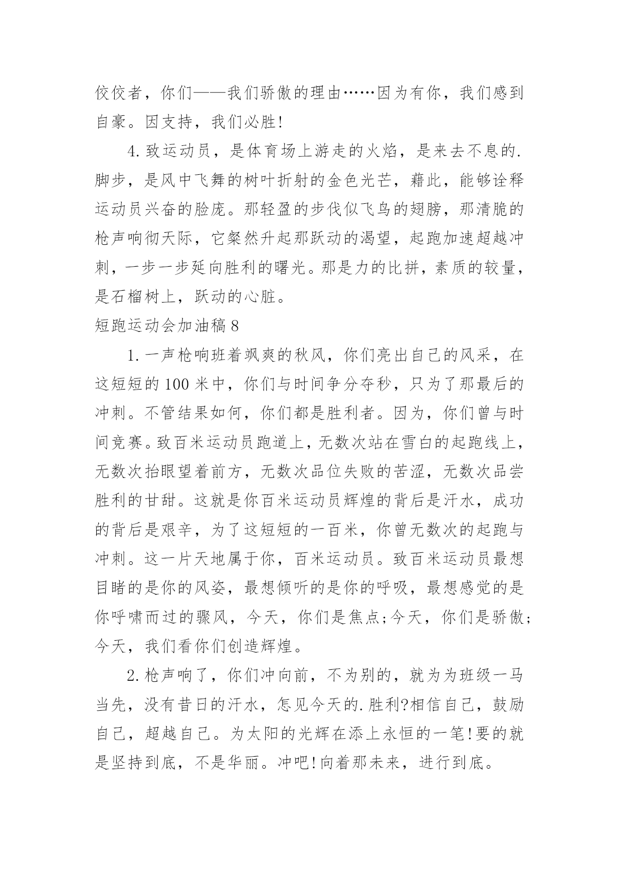 短跑运动会加油稿短跑运动会加油稿(集锦15篇)在学习、工作生活中,需要使用加油稿的场合越来越多,加油稿可以促进对方完成目标的进程。大家知道加油稿怎么写才正确吗?以下是小编收集整理的短跑运动会加油稿,供大家参考借鉴,希望可以帮助到有需要的朋友。短跑运动会加油稿1起跑线上你们一字排开健美的肌肉蕴含着爆发力量坚定的目光中充满了自信枪响了你们开始了并不长的征程笔直的跑道上有你们稳健的足迹不远的.终点将留下你们冲刺时矫捷的背影加油吧掌声将为你响起加油吧胜利和鲜花终将属于你们短跑运动会加油稿2加油吧。运动健儿们!阵阵有力的步伐。声声有劲的呐喊。运动场上洒下我们青春的点点滴滴。旗摇摇。鼓声声。这里挡不助的是青春活力。枪声响起。“预备。跑”。挡不助的是健儿们如火般的气势。英雄舍我其谁。胜利当仁不让。声声誓言浸透着健儿们的'昂扬斗志。朋友们。为运动健儿们喝彩。为运动喝彩吧!场上精彩纷呈。空气里的每一个分子浸透着自信。我要高喊一声:“这里无限精彩!短跑运动会加油稿3加油吧,运动健儿们!阵阵有力的步伐,声声有劲的呐喊,在运动场上洒下我们青春的点点滴滴。旗摇摇,鼓声声,这里挡不的是青春活力;枪声响起了,“预备起跑”,挡不助的是健儿们如火般的`气势啊。英雄舍我其谁,胜利当仁不让,声声誓言浸透着健儿们的昂扬斗志。朋友们,为运动健儿们喝彩,为运动喝彩吧!场上精彩纷呈,空气里的每一个分子浸透着自信。我要高喊一声:“这里无限精彩!短跑运动会加油稿41.一根小小的木棒,连接的是团结和友爱;一根小小的木棒,传递的是勇气和力量;一根小小的木棒,演绎的是奋斗和拼搏;加油吧!让这激动人心的时刻,一直回荡在我们心中!2.看!那一面面迎风飘舞的.彩旗,是一朵朵盛开的鲜花;听!那一阵阵惊天动地的欢呼,是回响在耳边胜利的风声。运动场上的你们,是胜利的标志,运动场上的你们,是青春的赞叹。去吧!去迎接那伟大的挑战,去吧!去做一名追风的少年。3.温暖的阳光洒在赛场上,男子乙组标枪的比赛即将开始。赛场上,一道道优美的弧线将轻盈地划过天空。健儿们用手中的标枪向距离的权限发起一轮又一轮的挑战。标枪在空中轻盈的姿态,是健儿们强健的力量和熟练的技巧的结合。谁能在这场激烈的竞争中获胜?让我们拭目以待,让我们为他们呐喊助威吧!只有将力量与技巧合二为一的人,才能获得胜利的桂冠!4.时间在流逝,赛道在延伸,成功在你面前展现心脏的跳动,热血在沸腾,辉煌在你脚下铸就。加油吧,健儿们!5.虽然你们在场上的时间很短暂,但你们的身影依然停留在人们的脑海里,因为你们是赛场上最可爱的人!短跑运动会加油稿51.年轻的我们自信飞扬,青春的气息如同出生的朝阳,蓬勃的力量如同阳光的挥洒。此时此刻,跑道便是我们精彩的舞台,声声加油便是我们最高的奖项!论何成功,谈何荣辱,心中的`信念只有一个:拼搏!萧瑟的秋风,挡不住你们破竹的锐气,2.不为掌声的注释不为刻意的征服不为失败的痛苦只有辛勤的汗水化作成功的脚步3.心中坚定的信念,脚下沉稳的步伐,你用行动告诉我们一个不变之理,没有走不完的路,没有过不了的山,成功正在终点冲着你高高的招手,用你那顽强的意志去努力,去迎接终点的鲜花与掌声,相信成功一定是属于你。4.运动场上有你们的飒爽英姿,运动场上有你们拼搏的身影,面对漫漫的征程,你没有畏惧和退缩,任汗水打湿脊背,任疲惫爬满全身,依然分离追赶,只有一个目标,只有一个信念,为班级赢得荣誉,拼搏吧,我为你们呐喊,加油,5.场上英姿显自豪,脚下步伐在飞奔。你们是骄傲。你们是自豪,跑道因你幻彩,面对红色跑道,你们挥洒自如,不惧一切冲向终点,6.面对艰苦的征程,你们毫不畏惧,接力棒在你们手中传递着集体的力量,听,我们在为你呐喊,你们诠释着奥运的精神,你们是我们心中的骄傲,深深的呼吸,等待你的是艰难的米。相信胜利会属于你们,但在这征途上,需要你勇敢的心去面对。我们在为你加油,你是否听到了我们发自内心的呐喊,困难和胜利都在向你招手,去呀,不要犹豫,快去击败困难,快去夺取胜利,相信你会送给我们一个汗水浸湿的微笑7.你们挥舞着充满力量的双臂看着实心球化成美丽的弧线我着实在心里佩服你们你们抛出了自己的最佳水平短跑运动会加油稿61.深深的呼吸,等待你的是艰难的米。相信胜利会属于你们。但在这征途上,需要你勇敢的心去面对。我们在为你加油,你是否听到了我们发自心中的'呐喊?困难和胜利都在向你招手,去呀,快去呀,不要犹豫。快去击败困难快去夺取胜利!相信你会送给我们一个汗水浸湿的微笑!2.泥泞的路走过无数,累了,告诉自己:快了,再坚持一会儿。身上的伤流出血来,疼了,告诉自己:别哭,会好的。摔到了,告诉自己:快爬起来,世上很少有坦途。3.这是意志的拼搏,这是速度的挑战,胜利在向你们招手,胜利在向你们呼唤!4.场上英姿显自豪,脚下步伐在飞奔。你们是骄傲,你们是自豪,跑道
