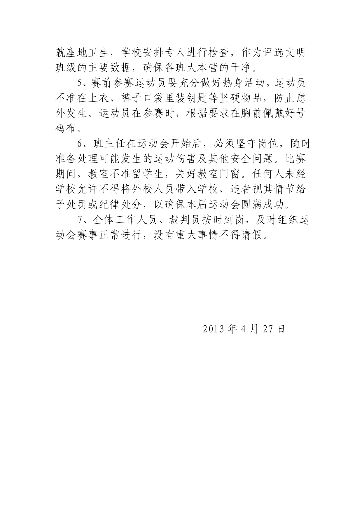 广河中学第四届春季田径运动会安全纪律卫生要求事项为了顺利完成本届运动会的各项任务,充分展示我校学生风采,杜绝意外事故的发生,再次对本届运动会安全纪律卫生做如下要求:1、全校师生必须服从大会安排,听从大会指挥,遵守大会纪律。2、比赛期间:上午8:00、下午2:00,各班学生在班主任的指挥和带领下,以班为单位按大会指定位置区域内就座,年级体育老师指引入座。班级可组织有特色的拉拉队,文明观看比赛,一律不得进入赛场内或比赛处围观比赛。(运动会期间各班保管好班级桌凳,如丢失各班赔偿。)3、各班主任按照运动会秩序册安排,组织并督促运动员准时参赛,不迟到,不缺席,严格遵守运动会规程、规则及制定的各项规定。比赛中必须尊重裁判,服从判决。贯彻“友谊第一,比赛第二”的方针,增进友谊,促进团结。严禁吵架等不文明事件发生。运动员因故批准请假,换人不换项,如有发现冒名顶替的,取消该两名(顶替与被顶替者)运动员所有项目的所得分。4、爱护运动场内的一切设备设施,爱护赛场内外清洁卫生,不准乱扔纸屑及饮料包装袋,禁止吃零食,禁止在大本营打扑克,班主任组织学生时时清扫本班就座地卫生,学校安排专人进行检查,作为评选文明班级的主要数据,确保各班大本营的干净。5、赛前参赛运动员要充分做好热身活动,运动员不准在上衣、裤子口袋里装钥匙等坚硬物品,防止意外发生。运动员在参赛时,根据要求在胸前佩戴好号码布。6、班主任在运动会开始后,必须坚守岗位,随时准备处理可能发生的运动伤害及其他安全问题。比赛期间,教室不准留学生,关好教室门窗。任何人未经学校允许不得将外校人员带入学校,违者视其情节给予处罚或纪律处分,以确保本届运动会圆满成功。7、全体工作人员、裁判员按时到岗,及时组织运动会赛事正常进行,没有重大事情不得请假。2013年4月27日