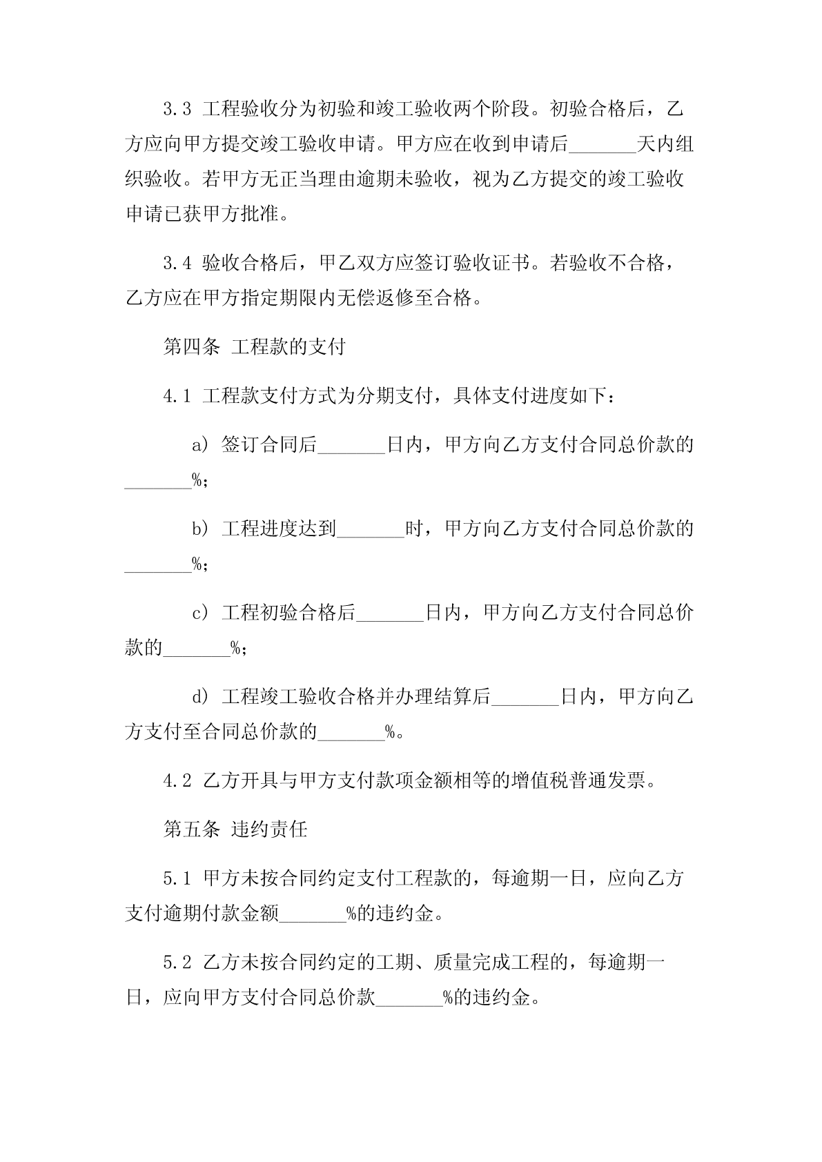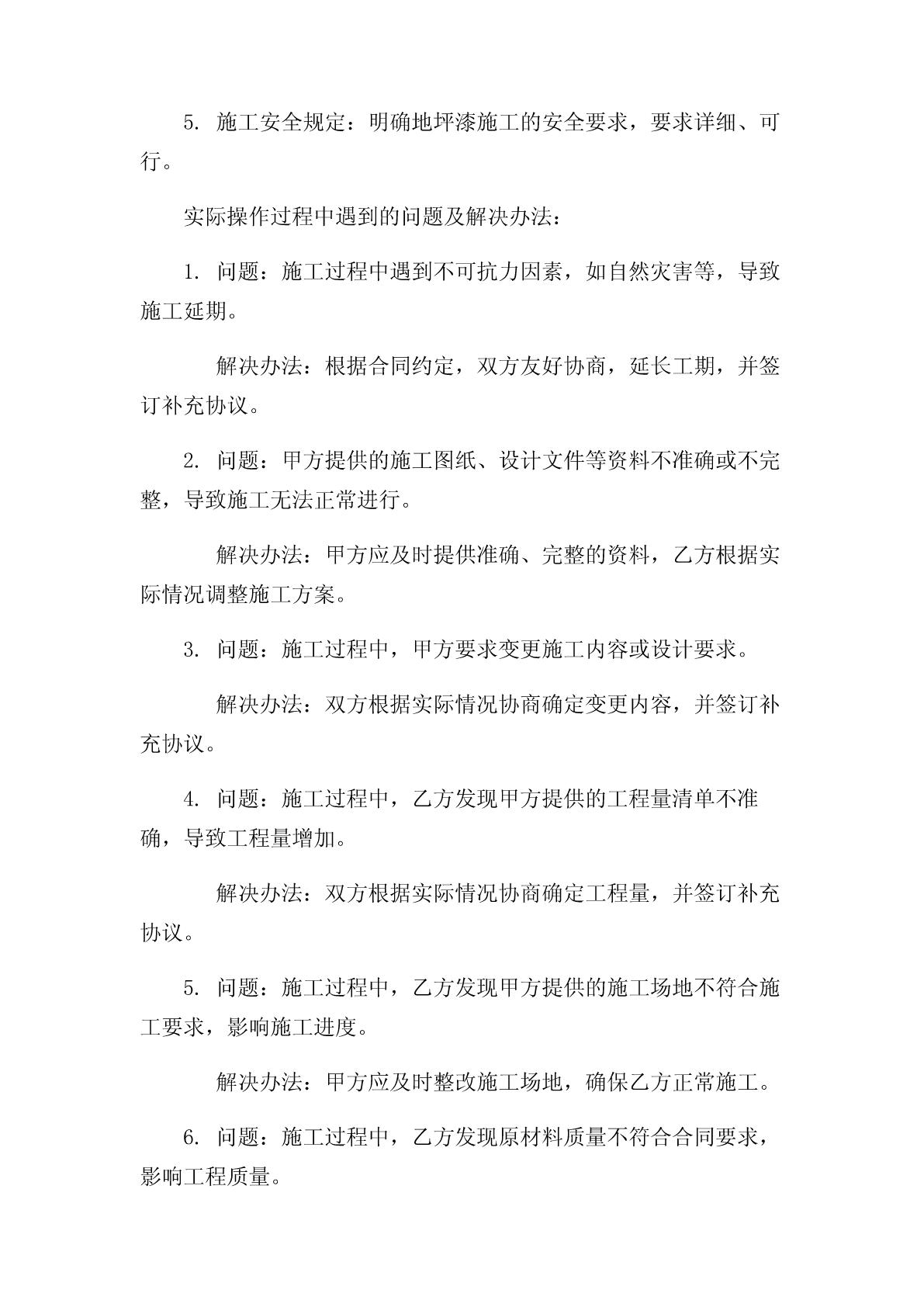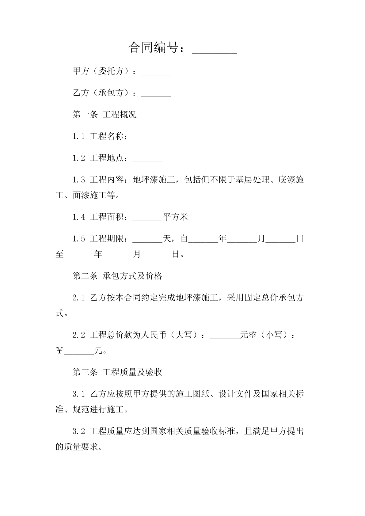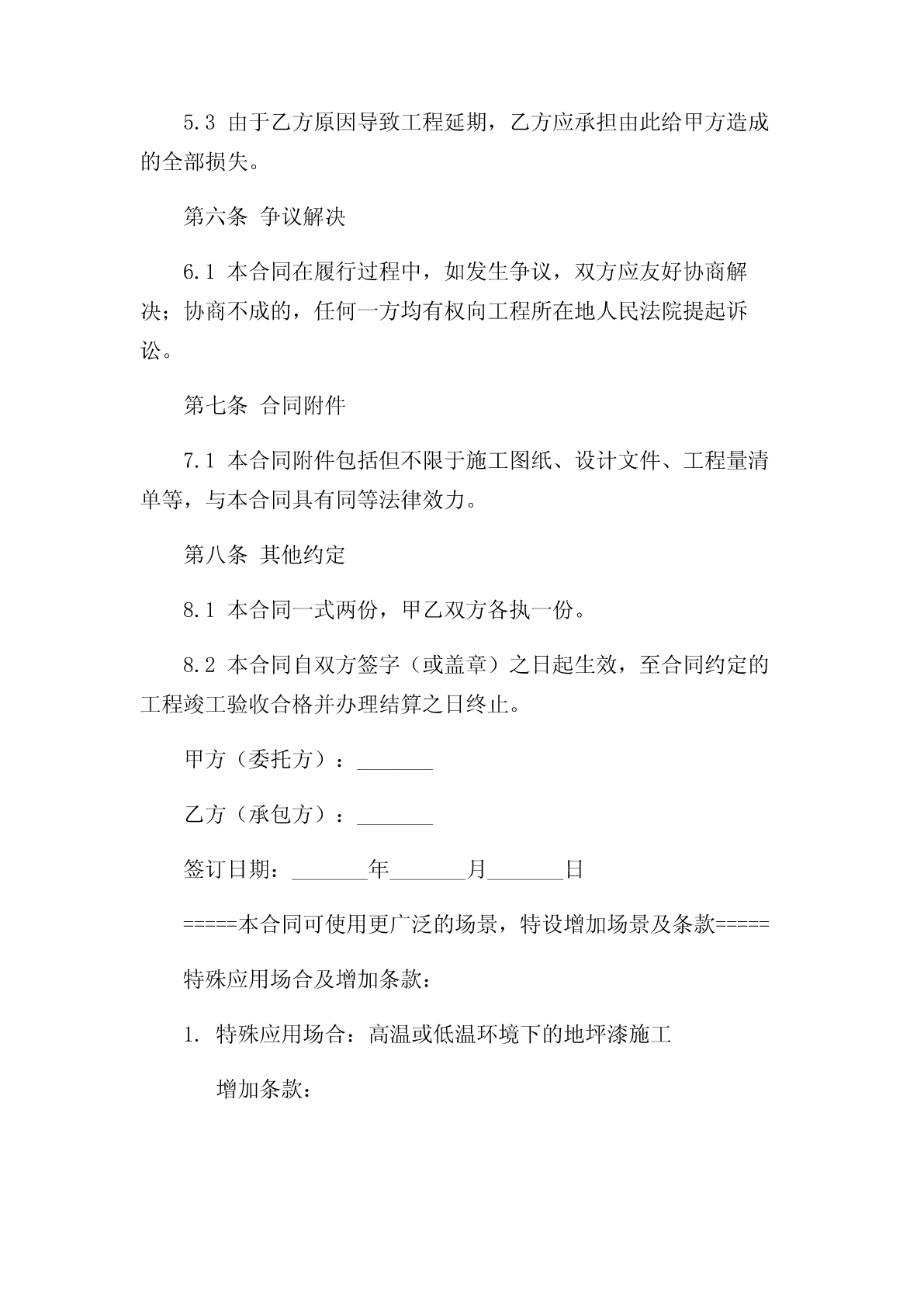 合同编号:_______甲方(委托方):_______乙方(承包方):_______第一条工程概况1.1工程名称:_______1.2工程地点:_______1.3工程内容:地坪漆施工,包括但不限于基层处理、底漆施工、面漆施工等。1.4工程面积:_______平方米1.5工程期限:_______天,自_______年_______月_______日至_______年_______月_______日。第二条承包方式及价格2.1乙方按本合同约定完成地坪漆施工,采用固定总价承包方式。2.2工程总价款为人民币(大写):_______元整(小写):¥_______元。第三条工程质量及验收3.1乙方应按照甲方提供的施工图纸、设计文件及国家相关标准、规范进行施工。3.2工程质量应达到国家相关质量验收标准,且满足甲方提出的质量要求。3.3工程验收分为初验和竣工验收两个阶段。初验合格后,乙方应向甲方提交竣工验收申请。甲方应在收到申请后_______天内组织验收。若甲方无正当理由逾期未验收,视为乙方提交的竣工验收申请已获甲方批准。3.4验收合格后,甲乙双方应签订验收证书。若验收不合格,乙方应在甲方指定期限内无偿返修至合格。第四条工程款的支付4.1工程款支付方式为分期支付,具体支付进度如下:a)签订合同后_______日内,甲方向乙方支付合同总价款的_______%;b)工程进度达到_______时,甲方向乙方支付合同总价款的_______%;c)工程初验合格后_______日内,甲方向乙方支付合同总价款的_______%;d)工程竣工验收合格并办理结算后_______日内,甲方向乙方支付至合同总价款的_______%。4.2乙方开具与甲方支付款项金额相等的增值税普通发票。第五条违约责任5.1甲方未按合同约定支付工程款的,每逾期一日,应向乙方支付逾期付款金额_______%的违约金。5.2乙方未按合同约定的工期、质量完成工程的,每逾期一日,应向甲方支付合同总价款_______%的违约金。5.3由于乙方原因导致工程延期,乙方应承担由此给甲方造成的全部损失。第六条争议解决6.1本合同在履行过程中,如发生争议,双方应友好协商解决;协商不成的,任何一方均有权向工程所在地人民法院提起诉讼。第七条合同附件7.1本合同附件包括但不限于施工图纸、设计文件、工程量清单等,与本合同具有同等法律效力。第八条其他约定8.1本合同一式两份,甲乙双方各执一份。8.2本合同自双方签字(或盖章)之日起生效,至合同约定的工程竣工验收合格并办理结算之日终止。甲方(委托方):_______乙方(承包方):_______签订日期:_______年_______月_______日=====本合同可使用更广泛的场景,特设增加场景及条款=====特殊应用场合及增加条款:1.特殊应用场合:高温或低温环境下的地坪漆施工增加条款:a)乙方应根据环境温度变化,调整施工材料及施工工艺,确保工程质量。b)甲方应提供适宜的施工环境,如温度控制设备等,确保乙方正常施工。c)由于环境温度原因导致施工延期,乙方不承担违约责任。2.特殊应用场合:有毒有害物质场所的地坪漆施工增加条款:a)乙方应采取有效措施,确保施工过程中有毒有害物质的排放符合国家相关标准。b)甲方应为乙方提供必要的防护设备,确保施工人员的人身安全。c)由于有毒有害物质原因导致施工延期,乙方不承担违约责任。3.特殊应用场合:高空作业的地坪漆施工增加条款:a)乙方应采取有效措施,确保高空作业的安全。b)甲方应为乙方提供必要的高空作业设备,如脚手架等。c)由于高空作业原因导致施工延期,乙方不承担违约责任。4.特殊应用场合:施工过程中需保护现有设施的地坪漆施工增加条款:a)乙方在施工过程中应采取有效措施,保护甲方现有设施不受损坏。b)甲方应为乙方提供现有设施的详细资料,以便乙方制定施工方案。c)由于保护现有设施原因导致施工延期,乙方不承担违约责任。5.特殊应用场合:紧急情况下的地坪漆施工增加条款:a)乙方应在接到甲方紧急施工通知后,尽快安排施工人员及设备进场施工。b)甲方应为乙方提供必要的施工条件,如临时住宿、交通等。c)由于紧急情况原因导致施工延期,乙方不承担违约责任。附件列表及要求说明:1.施工图纸:应包括地坪漆施工的具体方案、尺寸、材料等信