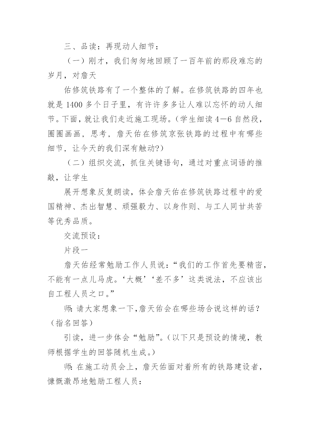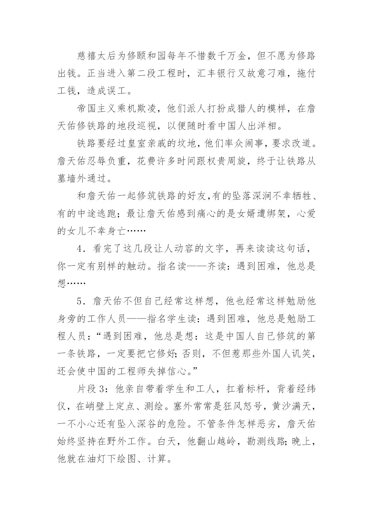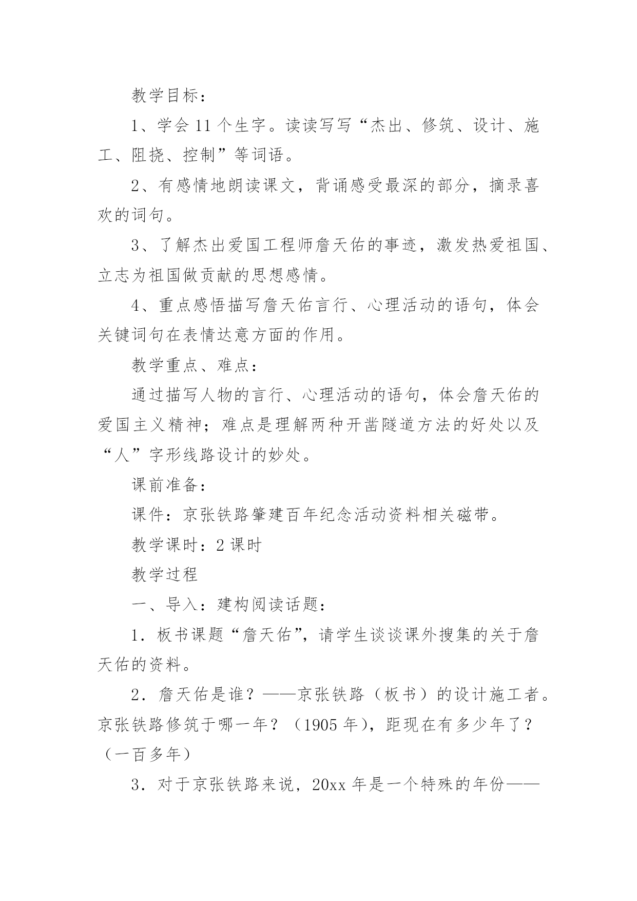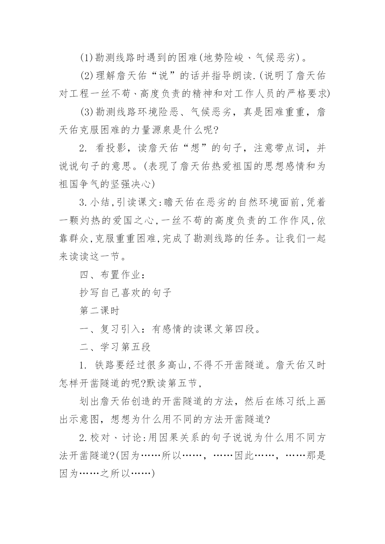 詹天佑教学设计詹天佑教学设计在教学工作者开展教学活动前,总不可避免地需要编写教学设计,教学设计是根据课程标准的要求和教学对象的特点,将教学诸要素有序安排,确定合适的教学方案的设想和计划。那么问题来了,教学设计应该怎么写?以下是小编帮大家整理的詹天佑教学设计,希望对大家有所帮助。詹天佑教学设计1教学目标1、学会十个生字,能正确读写下列词语:施工、阻挠、控制、居庸关、嘲笑、毅然、勘测、勉励、测绘、泥浆、竣工、藐视、攀山越岭、赞叹不已。2、有感情的朗读课文,背诵自己喜欢的部分。3、感悟课文内容,体会詹天佑的爱国精神和创新精神。4、注意收集有关资料。教学重点结合具体事例,认识詹天佑的爱国精神和创新精神。教学难点理解火车是怎样爬坡的。教学方法自学辅导法课时安排二课时教学过程第一课时一、直接引入课题:1.交流收集到的有关詹天佑的资料,说说自己对他的了解。2、交流预习的收获和疑惑。二、初读课文,整体感知:1、指名读课文,思考课文主要写了詹天佑的那些事?2、评价交流。3、填空:詹天佑是一个____样的人。三、细读课文,感受精神:(一)默读课文思考:詹天佑在什么情况下,主持修筑京张铁路的?课文是主要选取了铁路施工过程中哪几件典型事例来写的?讨论,板书:勘测线路开凿隧道设计线路(二)学习第四段。1、轻声读第四节,思考:詹天佑在勘测线路时遇到什么困难?分别用“—”、“﹏﹏”、“……”划出詹天佑说的﹑做的﹑想的句子,并想想句子的意思。2、检查﹑讨论。(1)勘测线路时遇到的困难(地势险峻﹑气候恶劣)。(2)理解詹天佑“说”的话并指导朗读.(说明了詹天佑对工程一丝不苟﹑高度负责的精神和对工作人员的严格要求)(3)勘测线路环境险恶、气候恶劣,真是困难重重,詹天佑克服困难的力量源泉是什么呢?2.看投影,读詹天佑“想”的句子,注意带点词,并说说句子的意思。(表现了詹天佑热爱祖国的思想感情和为祖国争气的坚强决心)3.小结,引读课文:瞻天佑在恶劣的自然环境面前,凭着一颗灼热的爱国之心,一丝不苟的高度负责的工作作风,依靠群众,克服重重困难,完成了勘测线路的任务。让我们一起来读读这一节。四、布置作业:抄写自己喜欢的句子第二课时一、复习引入:有感情的读课文第四段。二、学习第五段1.铁路要经过很多高山,不得不开凿隧道。詹天佑又时怎样开凿隧道的呢?默读第五节,划出詹天佑创造的开凿隧道的方法,然后在练习纸上画出示意图,想想为什么用不同的方法开凿隧道?2.校对﹑讨论:用因果关系的句子说说为什么用不同方法开凿隧道?(因为……所以……,……因此……,……那是因为……之所以……)3.媒体出示:“从两端向中间凿井法”、“中部凿井法”的`示意图。三、学习第六段詹天佑创造了开凿隧道的新方法,提高了工作效率﹑缩短了工期,这是他才华的表现,他还有更杰出的表现呢﹗1.那就是他还设计了一种“人”字型线路(投影),解决了火车爬陡坡的难题。请大家自学第六段,看看插图,想想火车是怎样爬坡的。2.在小组内用自己的话说一说,进一步体会詹天佑的杰出才华和创造精神。四、小结:隧道的高速施工和“人”字型线路的高速设计,这在世界筑路史上也是罕见的。直到现在,公路、铁路的修筑中,还运用着詹天佑创造的开凿隧道的方法。五、总结全文。1.京张铁路不满四年就全线竣工这一事实,也充分说明了詹天佑的确是一位杰出的爱国工程师!请大家快速浏览全文,谈谈学习收获。2.德育渗透:生活在祖国日益繁荣昌盛的今天,我们也应该像詹天佑那样,从小热爱祖国,立志为祖国的四化建设作贡献。五、作业练习:1、画出詹天佑创造的开凿隧道的示意图。2、用自己的话写一写火车是怎样爬坡的。詹天佑教学设计2教学目标:1、学会11个生字。读读写写“杰出、修筑、设计、施工、阻挠、控制”等词语。2、有感情地朗读课文,背诵感受最深的部分,摘录喜欢的词句。3、了解杰出爱国工程师詹天佑的事迹,激发热爱祖国、立志为祖国做贡献的思想感情。4、重点感悟描写詹天佑言行、心理活动的语句,体会关键词句在表情达意方面的作用。教学重点、难点:通过描写人物的言行、心理活动的语句,体会詹天佑的爱国主义精神;难点是理解两种开凿隧道方法的好处以及“人”字形线路设计的妙处。课前准备:课件:京张铁路肇建百年纪念活动资料相关磁带。教学课时:2课时教学过程一、导入:建构阅读话题:1.板书课题“詹天佑”,请学生谈谈课外搜集的关于詹天佑的资料。2.詹天佑是谁?——京张铁路(板书)的设计施工者。京张铁路修筑于哪一年?(1905年),距现在有多少年了?(一百多年)3.对于京张铁路来说,20xx年是一个特殊的年份——京张铁路动工整整一百周年!为了纪念这一伟大时刻,北京市和河北省政府举行了一系列大型活动。请看大屏幕:10月15日,张家口市文化广场举行纪念大会暨大型文艺演出。10月15日上午,张家口火车南站举行詹天佑铜