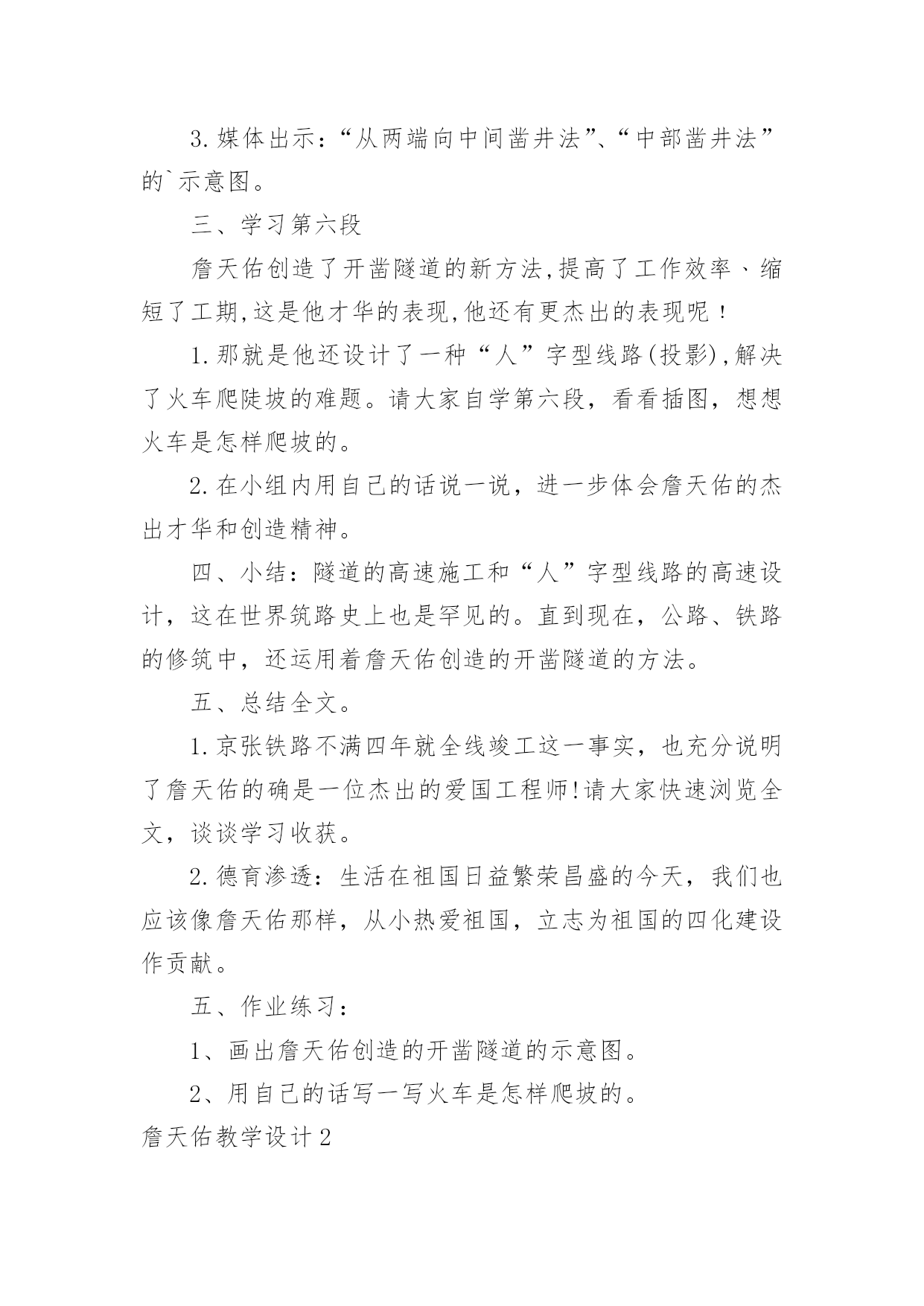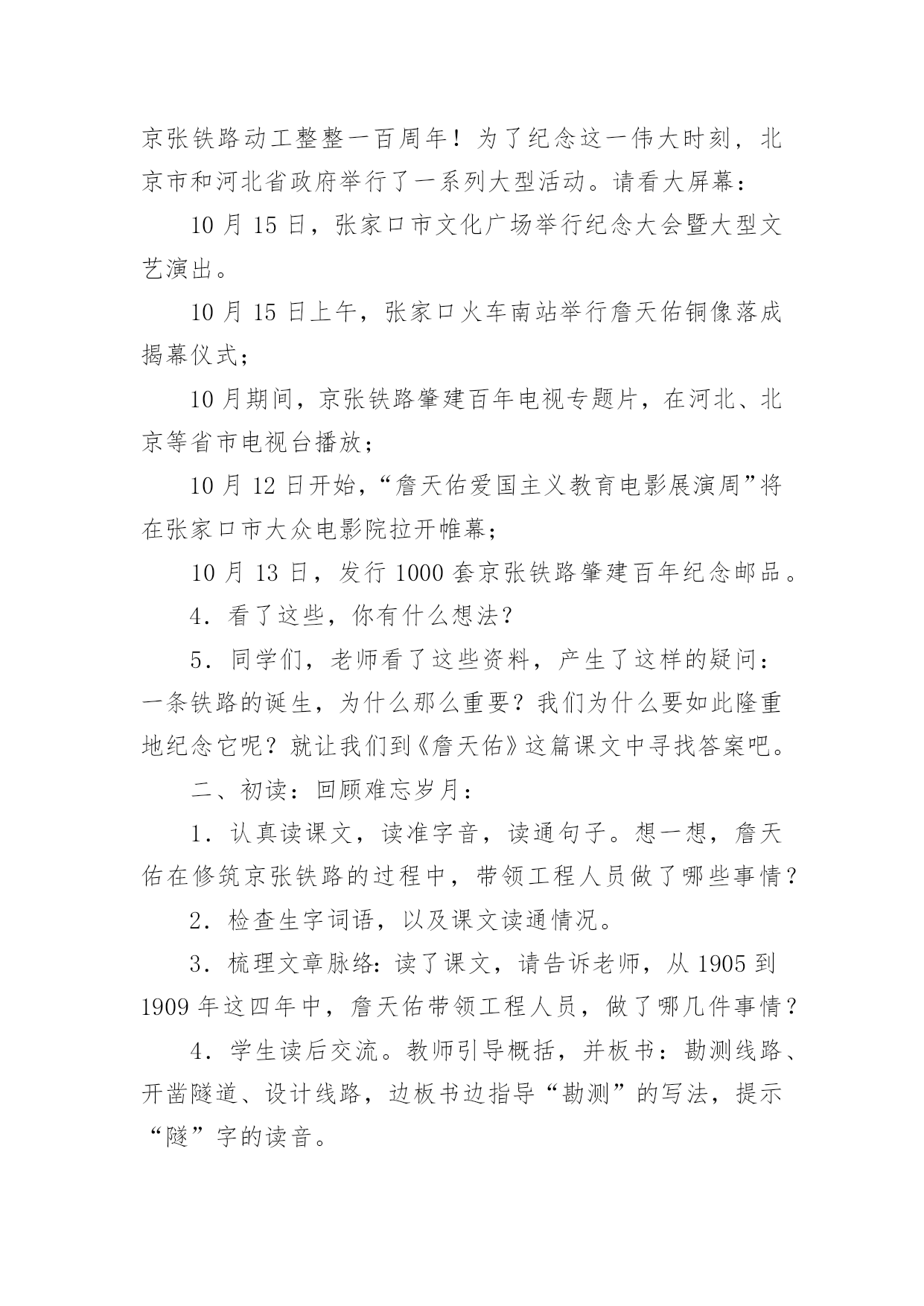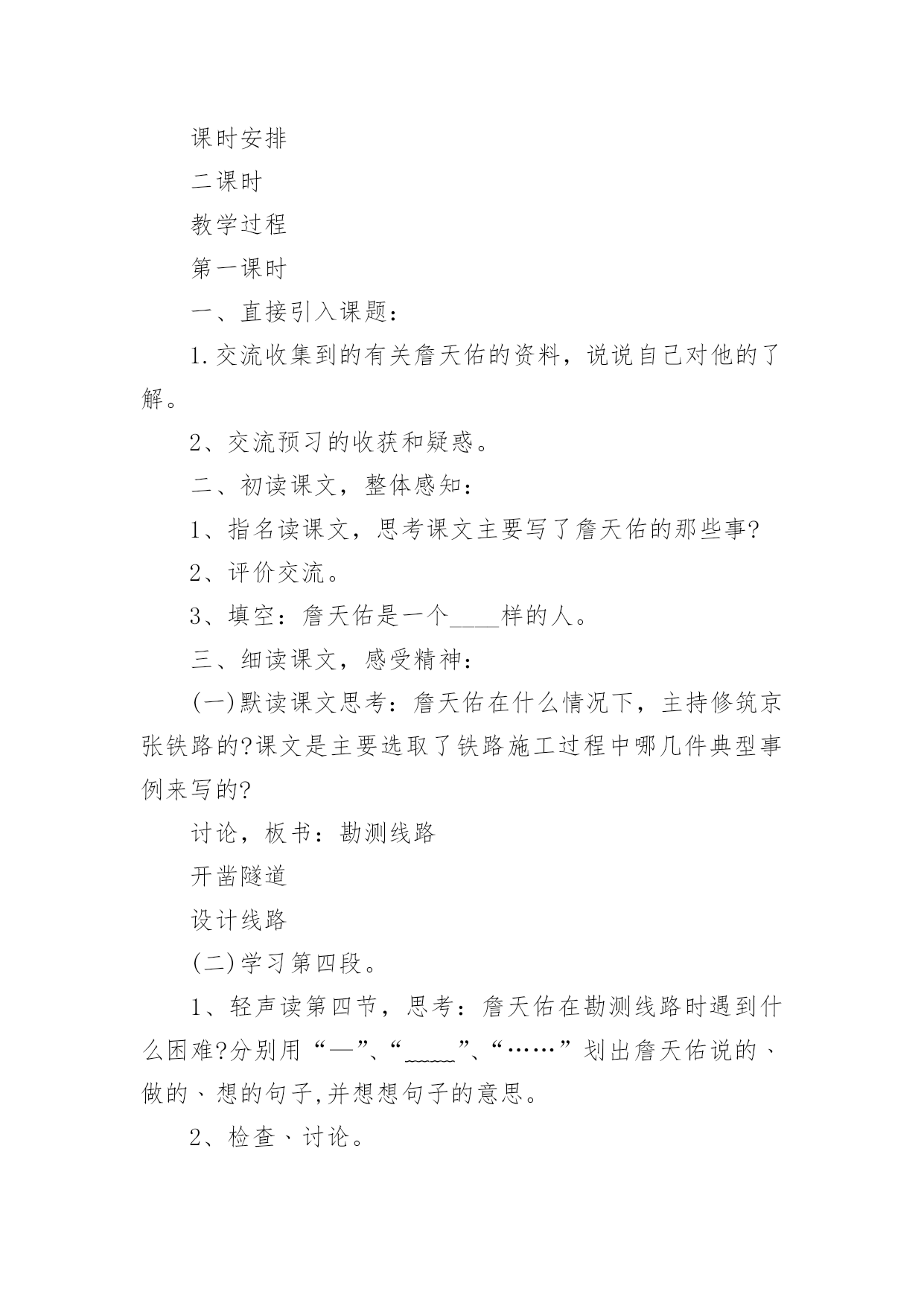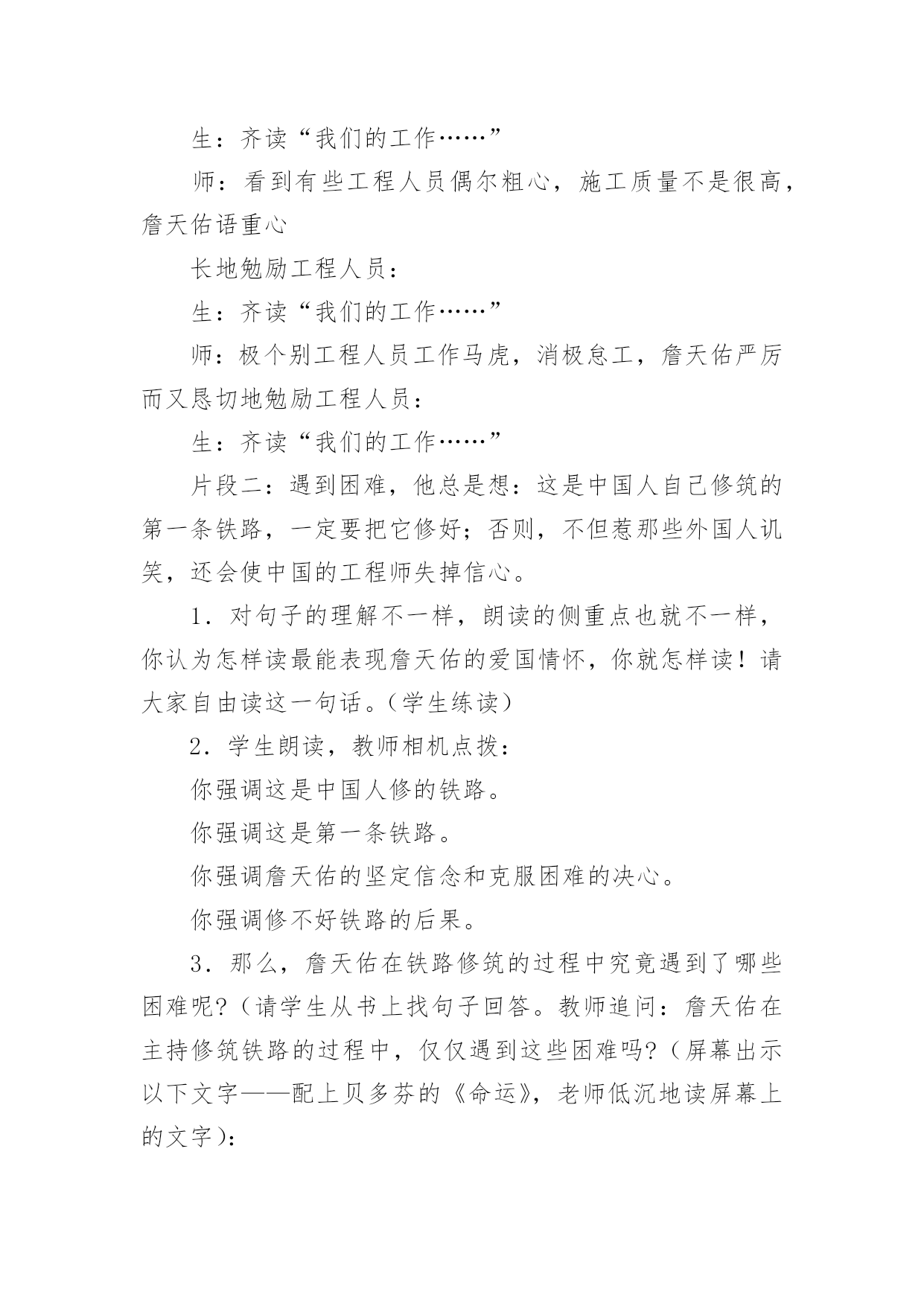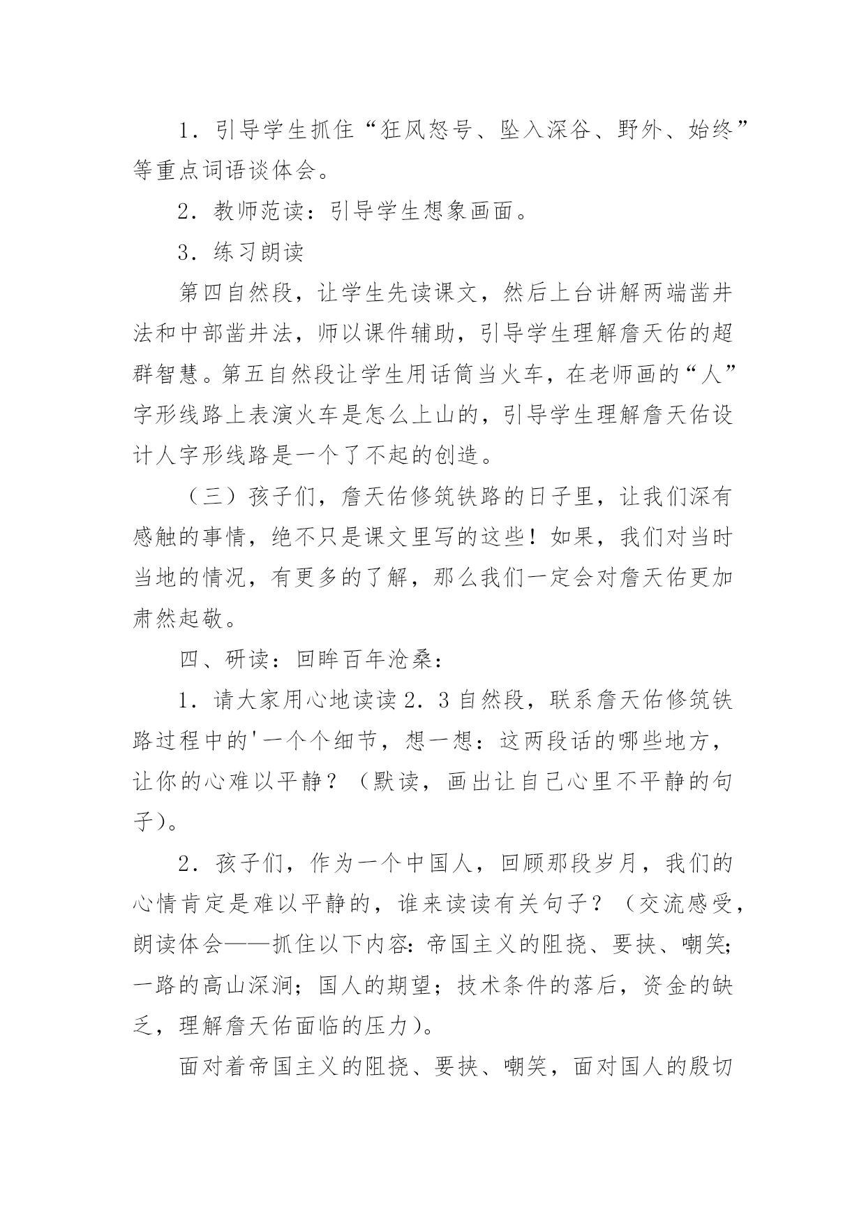 詹天佑教学设计詹天佑教学设计在教学工作者开展教学活动前,总不可避免地需要编写教学设计,教学设计是根据课程标准的要求和教学对象的特点,将教学诸要素有序安排,确定合适的教学方案的设想和计划。那么问题来了,教学设计应该怎么写?以下是小编帮大家整理的詹天佑教学设计,希望对大家有所帮助。詹天佑教学设计1教学目标1、学会十个生字,能正确读写下列词语:施工、阻挠、控制、居庸关、嘲笑、毅然、勘测、勉励、测绘、泥浆、竣工、藐视、攀山越岭、赞叹不已。2、有感情的朗读课文,背诵自己喜欢的部分。3、感悟课文内容,体会詹天佑的爱国精神和创新精神。4、注意收集有关资料。教学重点结合具体事例,认识詹天佑的爱国精神和创新精神。教学难点理解火车是怎样爬坡的。教学方法自学辅导法课时安排二课时教学过程第一课时一、直接引入课题:1.交流收集到的有关詹天佑的资料,说说自己对他的了解。2、交流预习的收获和疑惑。二、初读课文,整体感知:1、指名读课文,思考课文主要写了詹天佑的那些事?2、评价交流。3、填空:詹天佑是一个____样的人。三、细读课文,感受精神:(一)默读课文思考:詹天佑在什么情况下,主持修筑京张铁路的?课文是主要选取了铁路施工过程中哪几件典型事例来写的?讨论,板书:勘测线路开凿隧道设计线路(二)学习第四段。1、轻声读第四节,思考:詹天佑在勘测线路时遇到什么困难?分别用“—”、“﹏﹏”、“……”划出詹天佑说的﹑做的﹑想的句子,并想想句子的意思。2、检查﹑讨论。(1)勘测线路时遇到的困难(地势险峻﹑气候恶劣)。(2)理解詹天佑“说”的话并指导朗读.(说明了詹天佑对工程一丝不苟﹑高度负责的精神和对工作人员的严格要求)(3)勘测线路环境险恶、气候恶劣,真是困难重重,詹天佑克服困难的力量源泉是什么呢?2.看投影,读詹天佑“想”的句子,注意带点词,并说说句子的意思。(表现了詹天佑热爱祖国的思想感情和为祖国争气的坚强决心)3.小结,引读课文:瞻天佑在恶劣的自然环境面前,凭着一颗灼热的爱国之心,一丝不苟的高度负责的工作作风,依靠群众,克服重重困难,完成了勘测线路的任务。让我们一起来读读这一节。四、布置作业:抄写自己喜欢的句子第二课时一、复习引入:有感情的读课文第四段。二、学习第五段1.铁路要经过很多高山,不得不开凿隧道。詹天佑又时怎样开凿隧道的呢?默读第五节,划出詹天佑创造的开凿隧道的方法,然后在练习纸上画出示意图,想想为什么用不同的方法开凿隧道?2.校对﹑讨论:用因果关系的句子说说为什么用不同方法开凿隧道?(因为……所以……,……因此……,……那是因为……之所以……)3.媒体出示:“从两端向中间凿井法”、“中部凿井法”的`示意图。三、学习第六段詹天佑创造了开凿隧道的新方法,提高了工作效率﹑缩短了工期,这是他才华的表现,他还有更杰出的表现呢﹗1.那就是他还设计了一种“人”字型线路(投影),解决了火车爬陡坡的难题。请大家自学第六段,看看插图,想想火车是怎样爬坡的。2.在小组内用自己的话说一说,进一步体会詹天佑的杰出才华和创造精神。四、小结:隧道的高速施工和“人”字型线路的高速设计,这在世界筑路史上也是罕见的。直到现在,公路、铁路的修筑中,还运用着詹天佑创造的开凿隧道的方法。五、总结全文。1.京张铁路不满四年就全线竣工这一事实,也充分说明了詹天佑的确是一位杰出的爱国工程师!请大家快速浏览全文,谈谈学习收获。2.德育渗透:生活在祖国日益繁荣昌盛的今天,我们也应该像詹天佑那样,从小热爱祖国,立志为祖国的四化建设作贡献。五、作业练习:1、画出詹天佑创造的开凿隧道的示意图。2、用自己的话写一写火车是怎样爬坡的。詹天佑教学设计2教学目标:1、学会11个生字。读读写写“杰出、修筑、设计、施工、阻挠、控制”等词语。2、有感情地朗读课文,背诵感受最深的部分,摘录喜欢的词句。3、了解杰出爱国工程师詹天佑的事迹,激发热爱祖国、立志为祖国做贡献的思想感情。4、重点感悟描写詹天佑言行、心理活动的语句,体会关键词句在表情达意方面的作用。教学重点、难点:通过描写人物的言行、心理活动的语句,体会詹天佑的爱国主义精神;难点是理解两种开凿隧道方法的好处以及“人”字形线路设计的妙处。课前准备:课件:京张铁路肇建百年纪念活动资料相关磁带。教学课时:2课时教学过程一、导入:建构阅读话题:1.板书课题“詹天佑”,请学生谈谈课外搜集的关于詹天佑的资料。2.詹天佑是谁?——京张铁路(板书)的设计施工者。京张铁路修筑于哪一年?(1905年),距现在有多少年了?(一百多年)3.对于京张铁路来说,20xx年是一个特殊的年份——京张铁路动工整整一百周年!为了纪念这一伟大时刻,北京市和河北省政府举行了一系列大型活动。请看大屏幕:10月15日,张家口市文化广场举行纪念大会暨大型文艺演出。10月15日上午,张家口火车南站举行詹天佑铜