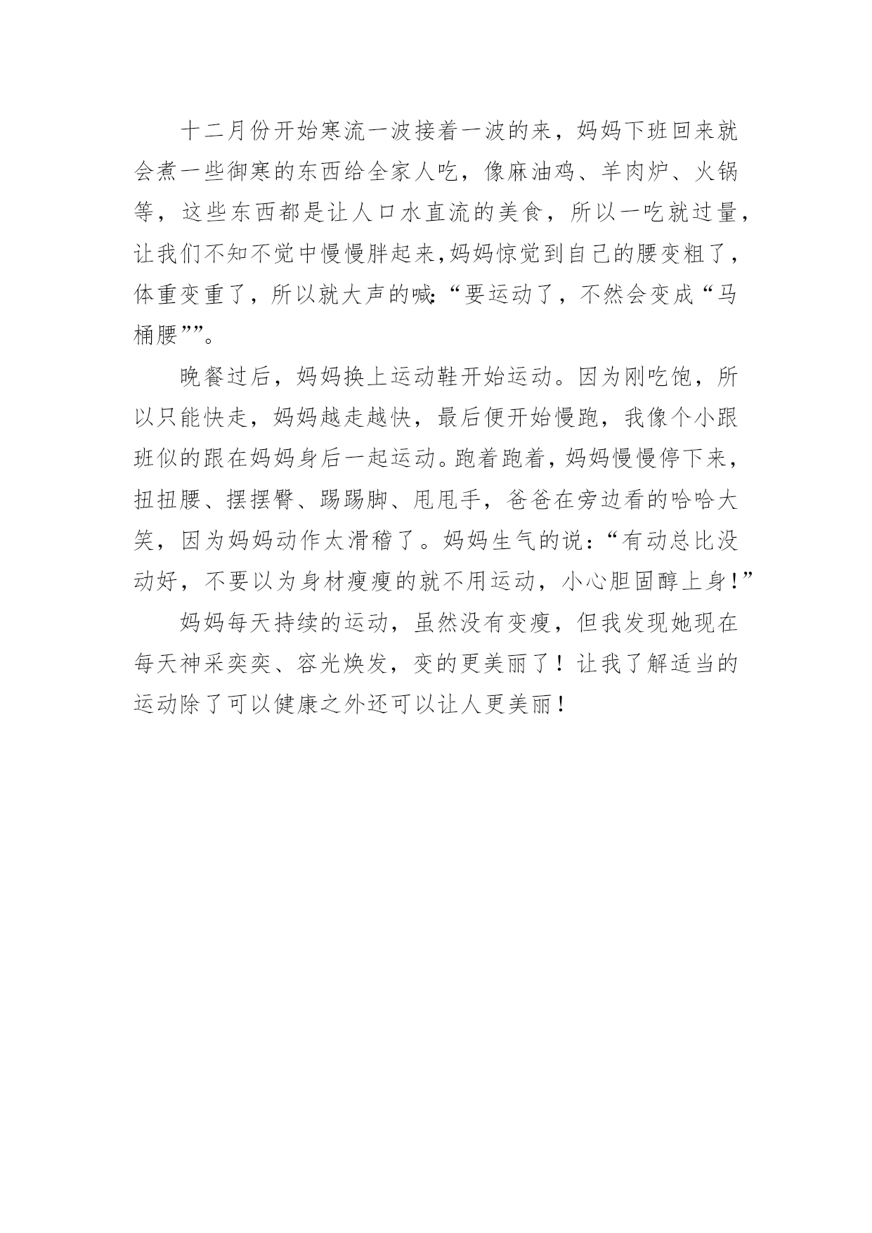 爱运动的妈妈作文关于爱运动的妈妈作文3篇在学习、工作、生活中,大家最不陌生的就是作文了吧,作文是从内部言语向外部言语的过渡,即从经过压缩的简要的、自己能明白的语言,向开展的、具有规范语法结构的、能为他人所理解的外部语言形式的转化。那么,怎么去写作文呢?以下是小编精心整理的爱运动的妈妈作文3篇,希望对大家有所帮助。爱运动的妈妈作文篇1大家都有自己独特的兴趣,妈妈的兴趣,就深深的影响了我。妈妈最大的兴趣就是做运动,所以她的身体一向都很好。每当我写完作业,就会问妈妈可不可以看电视,但她都说:“不要啦,看电视伤眼睛,走!我们去运动。”然后就拉着我,从家门口跑到距离约五百米远的便利商店。到了便利商店,我已经气喘如牛,她竟然还要我再跑更远。那时,我的汗已经滴得像在下雨一样了,恨不得拔腿就跑回家休息,免得累到倒地不起。有一天晚上,我在房间睡觉时,突然听到妈妈大喊:“依颖,到操场跑十三圈。”顿时我吓了一跳,然后跑到客厅继续睡。但是,过了不久,妈妈竟然跳下床,在家里跑起步来,由于她的眼睛是闭起来的,所以我猜她应该是在梦游,但这实在是太离谱了,因为这件事,我终于了解到妈妈爱运动的程度。妈妈因为爱运动,而拥有很健康的身体,也让我喜欢上了运动。但我觉得运动适当就好,所以我会建议她也去试试别的休闲方式,让她有更多样的乐趣。爱运动的妈妈作文篇2瞧!她有一个小小的嘴巴,有一对淡淡的眉毛,一头短发又黑又亮,她就是我爱运动的妈妈。星期六的傍晚,妈妈带我出去骑单轮自行车。我用脚一蹬,自行车滑出去了,机会到了,我急忙把另一只脚架上去。一开始,我还慢吞吞地骑,后来我故意想看看妈妈的跑步速度,一想到这里,我就开始加快速度,妈妈被我远远地甩在了后面,妈妈在后面一边追,一边叫我:“骑得慢一点!骑得慢一点!我跑不动了,你等等我呀!”后来妈妈渐渐地习惯了,开始加快脚步,我自言自语地说:“她一定追不上我的,我骑慢一点好了!”说完,忽然看见一个人影从我身边闪过,我仔细一看,惊讶地说:“这……这不是……是妈妈吗?这是,我又急又气,不服气地说:”不可能,一定有人帮你的。“妈妈说:“没有人来帮我,因为我习惯了。”我还没来得及加快速度,就看见了一个小黑点朝着晚霞不停地前进。虽然,我的.妈妈有时候也很唠叨,不过她也很不错的。我爱喜欢运动的妈妈。爱运动的妈妈作文篇3开始运动啰!这是妈妈吃完晚餐后说的第一句话。十二月份开始寒流一波接着一波的来,妈妈下班回来就会煮一些御寒的东西给全家人吃,像麻油鸡、羊肉炉、火锅等,这些东西都是让人口水直流的美食,所以一吃就过量,让我们不知不觉中慢慢胖起来,妈妈惊觉到自己的腰变粗了,体重变重了,所以就大声的喊:“要运动了,不然会变成“马桶腰””。晚餐过后,妈妈换上运动鞋开始运动。因为刚吃饱,所以只能快走,妈妈越走越快,最后便开始慢跑,我像个小跟班似的跟在妈妈身后一起运动。跑着跑着,妈妈慢慢停下来,扭扭腰、摆摆臀、踢踢脚、甩甩手,爸爸在旁边看的哈哈大笑,因为妈妈动作太滑稽了。妈妈生气的说:“有动总比没动好,不要以为身材瘦瘦的就不用运动,小心胆固醇上身!”妈妈每天持续的运动,虽然没有变瘦,但我发现她现在每天神采奕奕、容光焕发,变的更美丽了!让我了解适当的运动除了可以健康之外还可以让人更美丽!