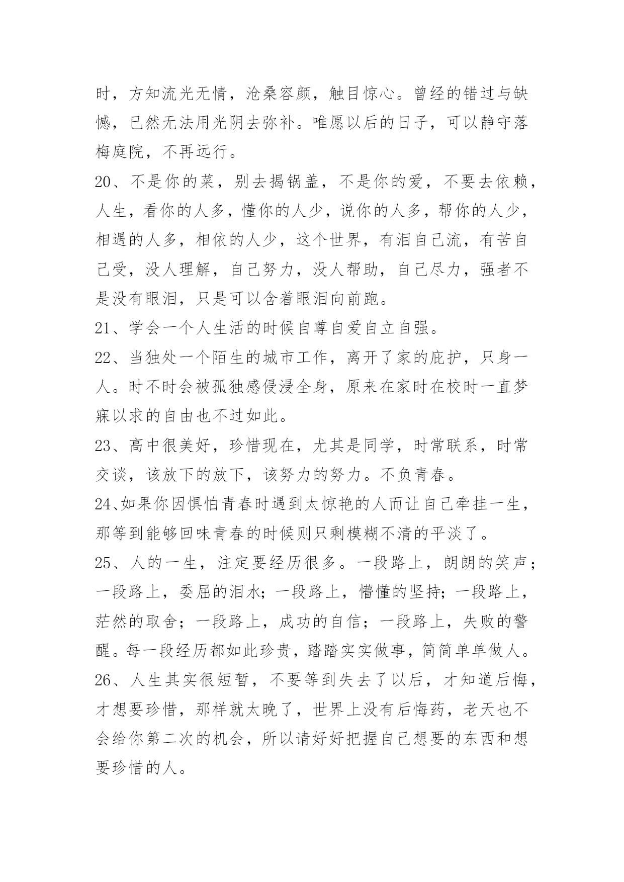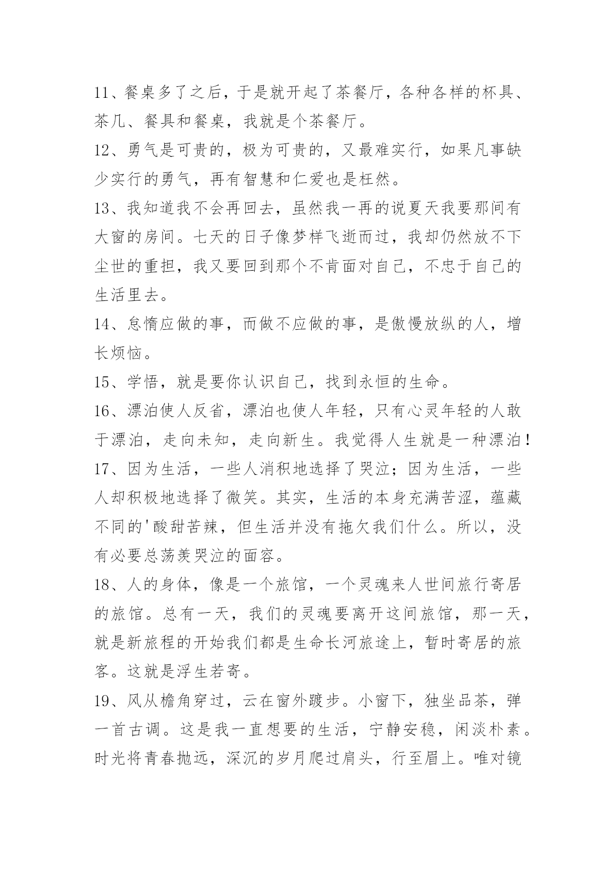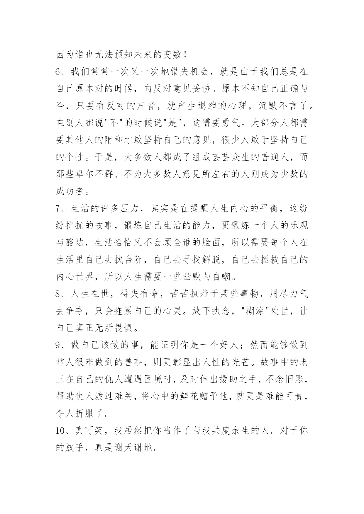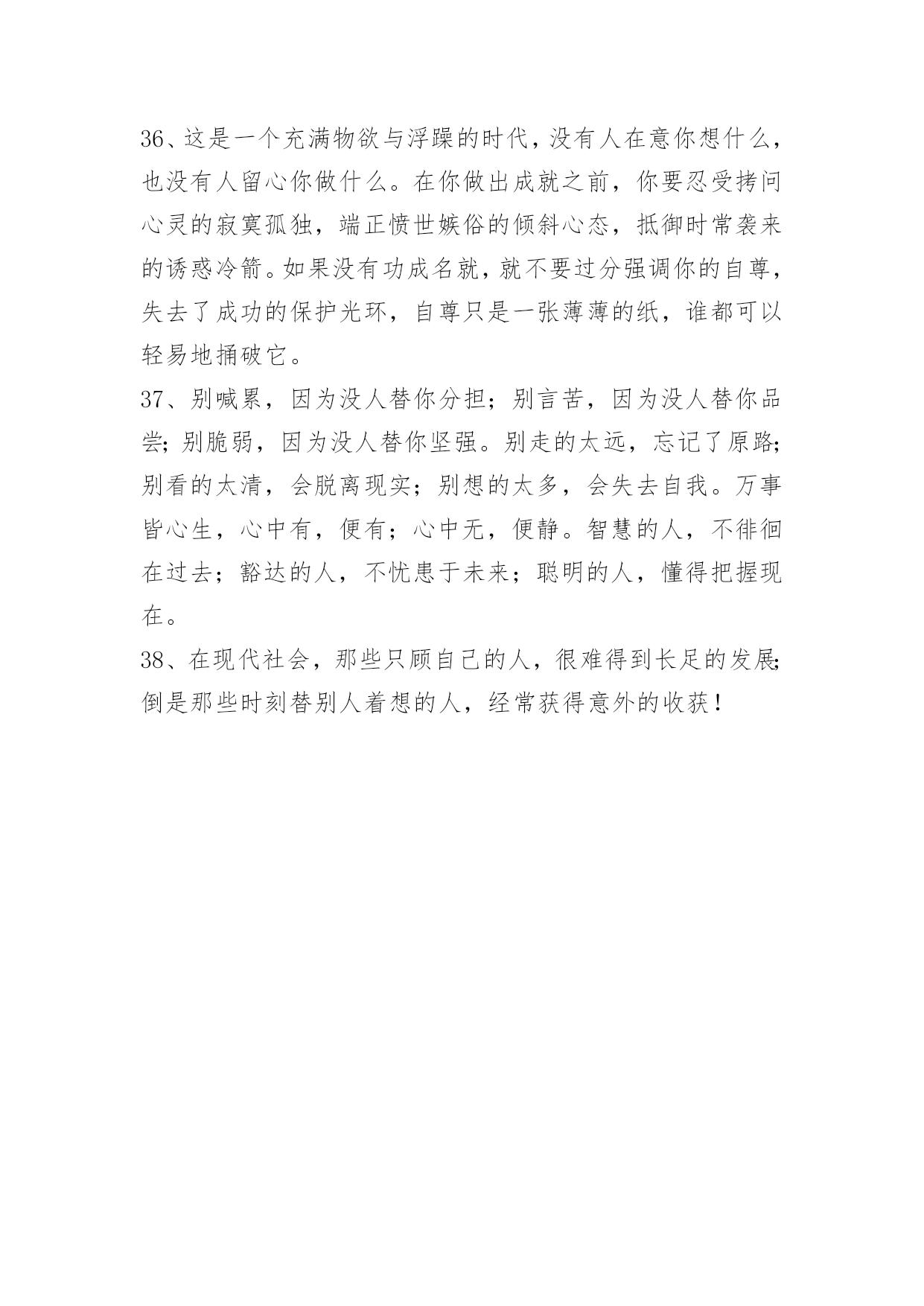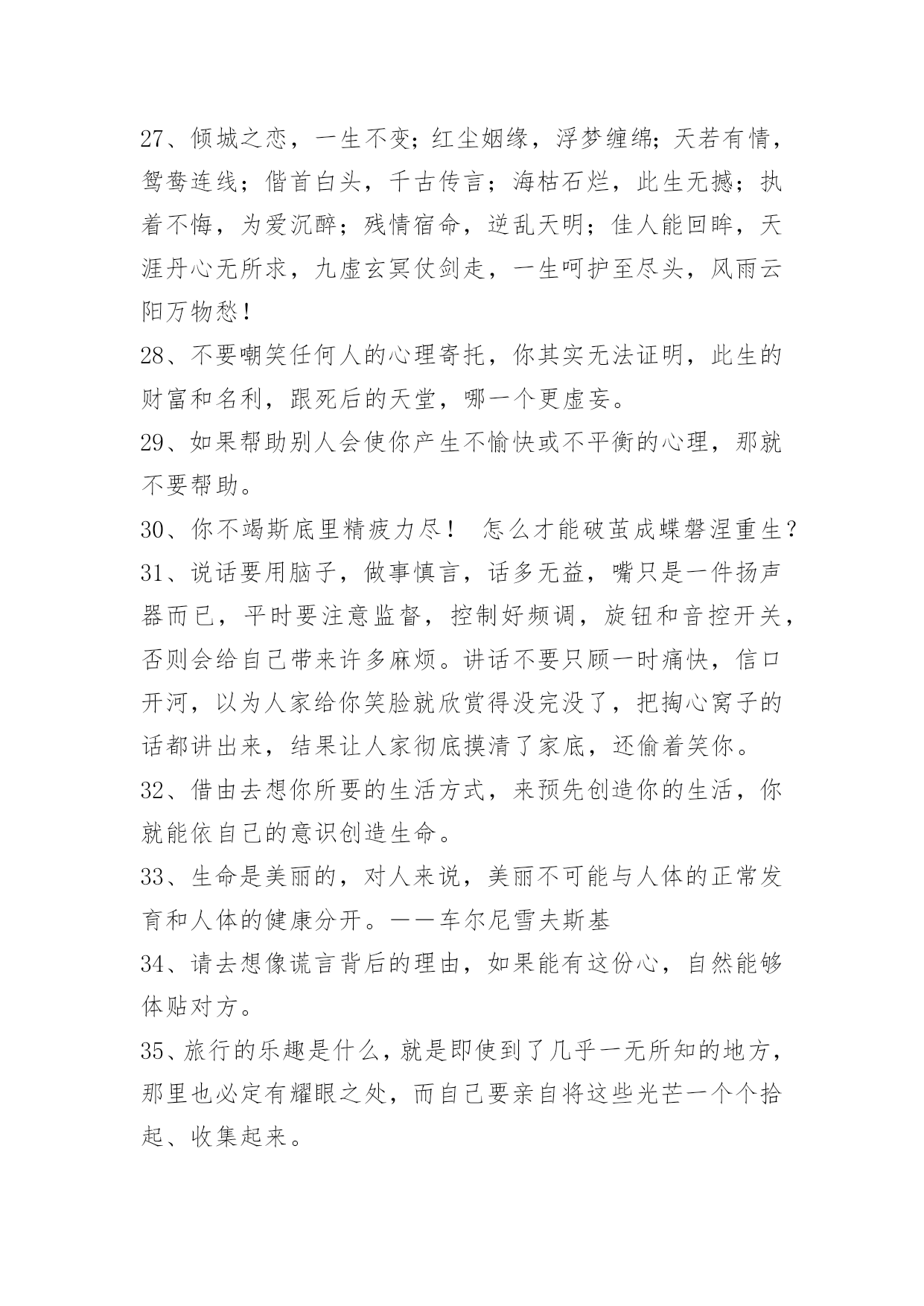人生的哲理语录38条通用人生的哲理语录锦集38条希望是一顿好的早餐,但是它是一顿坏的晚餐。以下是小编精心准备的人生的哲理语录38条,感兴趣的一起来看看吧。1、他曾经是我的梦,但梦毕竟不是爱,梦是美的,爱却是活生生的。2、人生在世,难免有顺境逆境。顺境时要淡,逆境时要忍,只要忍得过,再怎么不顺遂的事都会过去。而且,过去的失败,正是未来言行的借镜,是推动我们成功的力量。只要能记取过去的教训,改进现在,与人结缘,就会有无限的未来。3、外圆内方。厚德载物。心中长存善念。慈悲待人。智慧行事。忘功不忘过,忘怨不忘恩。大爱言善。能付出爱心就是福,能消除烦恼就是慧。外表美内心更须美。有了修养看人都顺眼。原谅别人就是善待自己。脾气大,嘴巴臭,心地再好也不算好人。计较少就会快乐。4、人生没有绝对的安稳,既然我们都是过客,就该携一颗从容淡泊的心,走过山重水复的流年,笑看风尘起落的人间。两个人一起总是比一个人温暖。人生底色都是无尽荒凉,但看透了这荒凉之后,一步步再往回走,人生,会一点点温暖起来。半夜听远处笛声,他吹的是绕春的情分,我听的是人生的惊蛰。5、不论是谁,最终选择要一起度过一辈子的人都需要勇气,因为谁也无法预知未来的变数!6、我们常常一次又一次地错失机会,就是由于我们总是在自己原本对的时候,向反对意见妥协。原本不知自己正确与否,只要有反对的声音,就产生退缩的心理,沉默不言了。在别人都说"不"的时候说"是",这需要勇气。大部分人都需要其他人的附和才敢坚持自己的意见,很少人敢于坚持自己的个性。于是,大多数人都成了组成芸芸众生的普通人,而那些卓尔不群、不为大多数人意见所左右的人则成为少数的成功者。7、生活的许多压力,其实是在提醒人生内心的平衡,这纷纷扰扰的故事,锻炼自己生活的能力,更锻炼一个人的乐观与豁达,生活恰恰又不会顾全谁的脸面,所以需要每个人在生活里自己去找台阶,自己去寻找解脱,自己去拯救自己的内心世界,所以人生需要一些幽默与自嘲。8、人生在世,得失有命,苦苦执着于某些事物,用尽力气去争夺,只会拖累自己的心灵。放下执念,"糊涂"处世,让自己真正无所畏惧。9、做自己该做的事,能证明你是一个好人;然而能够做到常人很难做到的善事,则更彰显出人性的光芒。故事中的老三在自己的仇人遭遇困境时,及时伸出援助之手,不念旧恶,帮助仇人渡过难关,将心中的鲜花赠予他,就更是难能可贵,令人折服了。10、真可笑,我居然把你当作了与我共度余生的人。对于你的放手,真是谢天谢地。11、餐桌多了之后,于是就开起了茶餐厅,各种各样的杯具、茶几、餐具和餐桌,我就是个茶餐厅。12、勇气是可贵的,极为可贵的,又最难实行,如果凡事缺少实行的勇气,再有智慧和仁爱也是枉然。13、我知道我不会再回去,虽然我一再的说夏天我要那间有大窗的房间。七天的日子像梦样飞逝而过,我却仍然放不下尘世的重担,我又要回到那个不肯面对自己,不忠于自己的生活里去。14、怠惰应做的事,而做不应做的事,是傲慢放纵的人,增长烦恼。15、学悟,就是要你认识自己,找到永恒的生命。16、漂泊使人反省,漂泊也使人年轻,只有心灵年轻的人敢于漂泊,走向未知,走向新生。我觉得人生就是一种漂泊!17、因为生活,一些人消积地选择了哭泣;因为生活,一些人却积极地选择了微笑。其实,生活的本身充满苦涩,蕴藏不同的'酸甜苦辣,但生活并没有拖欠我们什么。所以,没有必要总荡羡哭泣的面容。18、人的身体,像是一个旅馆,一个灵魂来人世间旅行寄居的旅馆。总有一天,我们的灵魂要离开这间旅馆,那一天,就是新旅程的开始我们都是生命长河旅途上,暂时寄居的旅客。这就是浮生若寄。19、风从檐角穿过,云在窗外踱步。小窗下,独坐品茶,弹一首古调。这是我一直想要的生活,宁静安稳,闲淡朴素。时光将青春抛远,深沉的岁月爬过肩头,行至眉上。唯对镜时,方知流光无情,沧桑容颜,触目惊心。曾经的错过与缺憾,已然无法用光阴去弥补。唯愿以后的日子,可以静守落梅庭院,不再远行。20、不是你的菜,别去揭锅盖,不是你的爱,不要去依赖,人生,看你的人多,懂你的人少,说你的人多,帮你的人少,相遇的人多,相依的人少,这个世界,有泪自己流,有苦自己受,没人理解,自己努力,没人帮助,自己尽力,强者不是没有眼泪,只是可以含着眼泪向前跑。21、学会一个人生活的时候自尊自爱自立自强。22、当独处一个陌生的城市工作,离开了家的庇护,只身一人。时不时会被孤独感侵浸全身,原来在家时在校时一直梦寐以求的自由也不过如此。23、高中很美好,珍惜现在,尤其是同学,时常联系,时常交谈,该放下的放下,该努力的努力。不负青春。24、如果你因惧怕青春时遇到太惊艳的人而让自己牵挂一生,那等到能够回味青春的时候则只剩模糊不清的平淡了。25、人的一生,注定要经历很多。一段路上,朗朗的笑声;一段路上,委屈的泪水;一段路上,懵懂的坚持;一