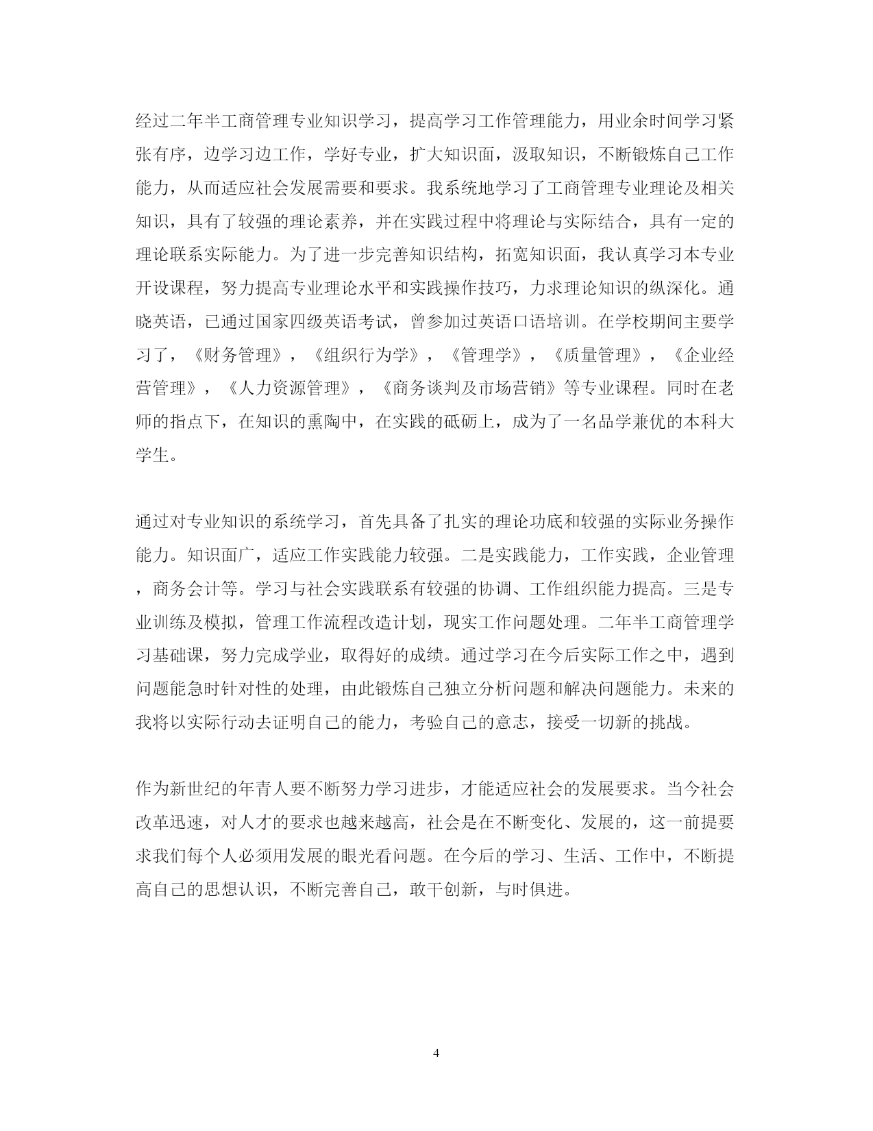 此资料由网络收集而来,如有侵权请告知上传者立即删除。资料共分享,我们负责传递知识。PAGEPAGE4工商管理自我鉴定范文工商管理自我鉴定应该怎么写呢?别再纠结了!下面由本小编精心整理的工商管理自我鉴定范文,希望可以帮到你哦!工商管理自我鉴定范文篇一我叫xxx,是成都理工大学xxx学院管理系工商管理专业的一名应届毕业生,大学四年是我一生的重要阶段,是我学习专业知识及提高各方面能力为以后谋生发展的重要阶段。我于XX年9月考入成都理工大学工程技术学院,通过四年的校园生涯和社会实践,我不断的挑战自我、充实自己,为实现今后人生的价值时刻准备着。四年里,对专业知识我一丝不苟,在学好本专业课程的同时我也特别注重对其他各科知识的学习与涉猎。图书馆、电子阅览室、期刊杂志室是我四年大学中去的最多的地方。为了将自己锻炼成一名各方面能力都具备的综合性复合型人才,四年里,我特别注重各方面能力的培养与锻炼,学校的各种活动我都热情、积极、踊跃的参加,在校期间,我严格要求自己,力争全面发展。学习上,认真听讲、刻苦作业、积极配合老师教学、踊跃参与教学实践,以优异的成绩顺利完成学业;工作生活上,作为学生干部,从参与到组织、从配合到管理、从监督到协调,大事小事,以服务同学为宗旨,以管理团结班级为己任,不论在学校领导、院系组织、同学之间、还是在社会实践活动中,到处都有我的身影。能力在实践中日趋形成、锻炼、提高、并得到肯定。思想道德方面,大学期间我系统全面地学习了马列主义、毛泽东思想、邓小平理论及xx同志的“三个代表”重要思想,不断用先进的理论武装自己的头脑,热爱祖国,拥护中国共产党的领导,坚持四项基本原则;自觉遵守《学生行为准则》和学校规则制度,尊敬师长,团结同学,关系集体;坚持真理,修正错误,自觉抵御封建迷信等错误倾向;树立集体主义为核心的人生价值观,正确处理国家、集体、个人三者之间的利益关系,当个人与集体、国家利益发生冲突的时候,坚持把国家、集体的利益放在第一位;在思想上和行动上与党中央保持一致,积极主动地向党组织靠拢。科学文化知识方面,我认真端正学习目的、学习态度,系统全面地学习了本专业的理论基础知识,同时把所学的理论知识应用于实践活动中,把所学知识转化为动手能力、应用能力和创造能力,力求理论和实践的统一。在学习和掌握本专业理论知识和应用技能的同时,还努力拓宽自己的知识面,培养自己其他方面的能力。在英语和技能方面,我努力学习参加并通过国家英语四级和计算机二级考试。身体和心理方面。大学四年里,我掌握了科学锻炼身体的基本技能,养成了良好的卫生习惯,积极参加院系和班级组织的各项体育活动,如乒乓球、篮球、排球、越野比赛等,身体检查健康,体育合格达标。心理方面,我锻炼坚强的意志品质,塑造健康人格,克服各种心理障碍,以适应社会发展要求。身为学生的我在修好学业的同时也注重于对社会的实践。本着学以致用,理论与实践相结合的原则,在校期间我参加了一系列的社会实践。XX年7月--8月暑假我在凉山州妇女儿童发展中心参加社会实践,虽然很苦很累,但是通过一个暑假的锻炼,我增强了与人接触、交往、沟通的能力。20xx年暑假我在攀枝花市市公安局辑毒支队做兼职,将近两个多月的辑毒生活给我上了一节生动鲜明的教育课,使我深深地明白了挣钱的艰难与生活的不易,更加懂得大学生应有的光荣与责任。通过各种社会实践,使我较早得融入了社会中去,尽管还没有走出学校大门,但是我已经有了对社会的初步理解与尝试,这些都是我在四年大学生活中知识以外沉甸甸的收获。自信来自实力。大学四年,我将自己塑造成了一个健康、充满自信的我,但同时我也认识到,当今社会变革迅速,对人才的要求也越来越高,社会是在不断变化、发展的,这一前提要求我们每个人必须用发展的眼光看问题。当然,我自身还有很多的缺点和不足,在今后的学习、生活、工作中,我会不断提高自己的思想认识,不断改正缺点,不断完善自己,以便适应社会的发展要求。工商管理自我鉴定范文篇二回望三年学校生活和社会实践里,有成功也有失败,我孜孜不倦,我孜孜不倦,不断地挑战自我,充实自己,为实现人生的价值打下坚实的基础。学习上,我热爱自己的专业,还还利用课余时间专修计算机专业知识,使我能轻松操作各种网络和办公软件。曾获过三等奖学金,在书法和体育运动都获得好成绩。英语、电脑、普通话等方面的等级考试已达标。除了在专业知识方面精益求精外,平时我还涉猎了大量网络编程、网络管理与维护、网页设计等知识。并且相信在以后理论与实际结合当中,能有更大提高。在生活上,我最大的特点是诚实守信,热心待人,勇于挑战自我,时间观念强,有着良好的生活习惯和正派作风。由于平易近人待人友好,所以一直以来与人相处甚是融洽.在工作上,对工作热情,任劳任怨,责任心强,具有良好的组织交际能力,和同