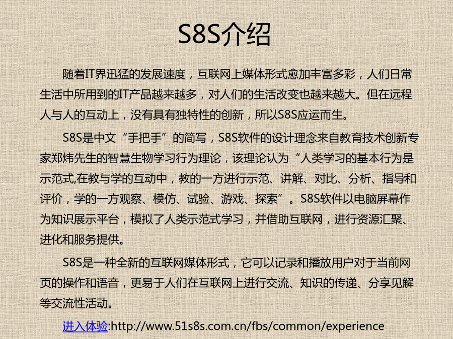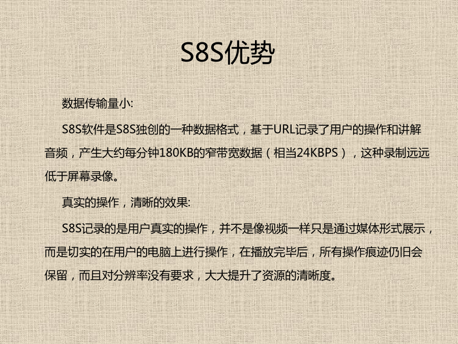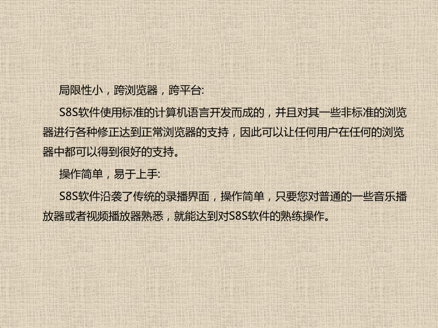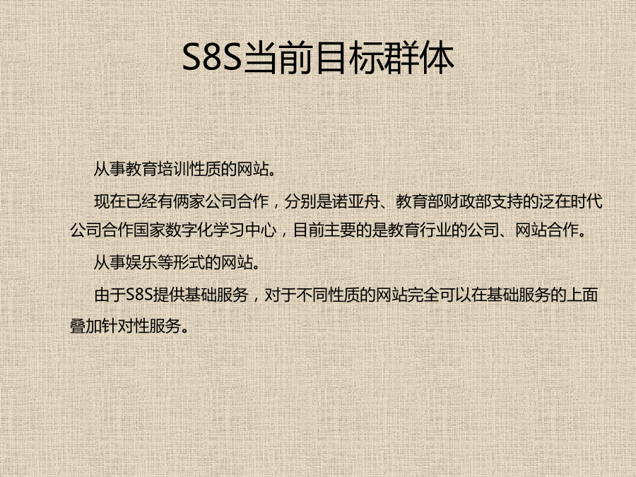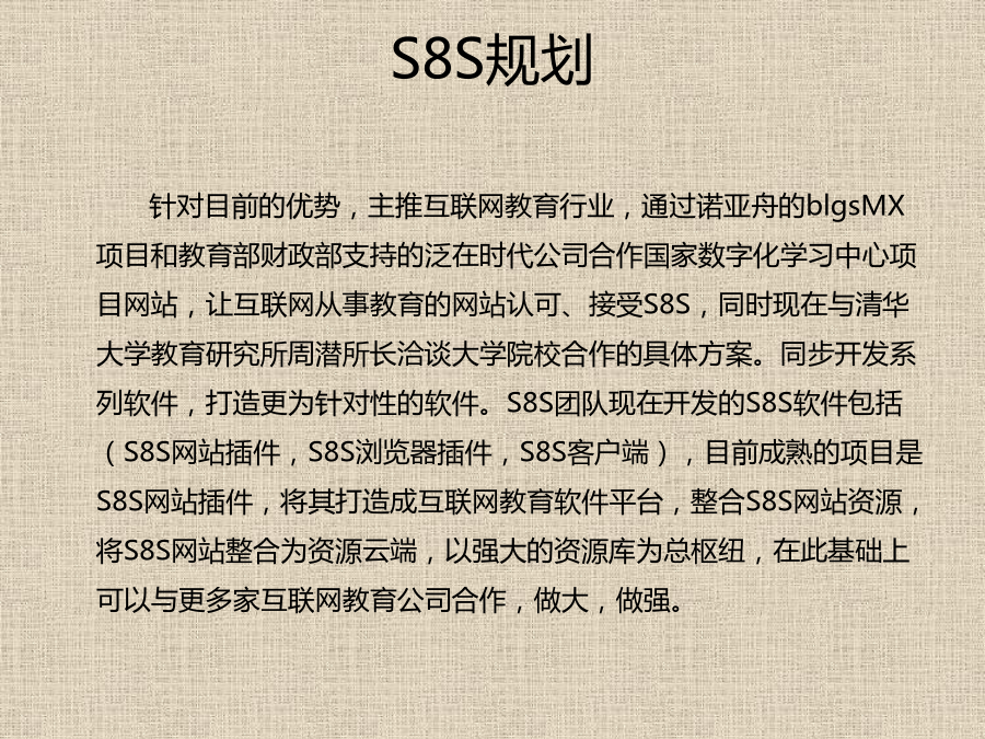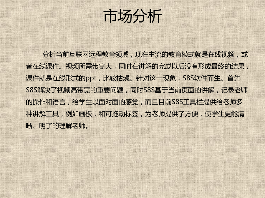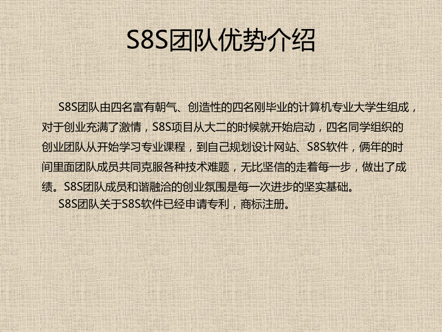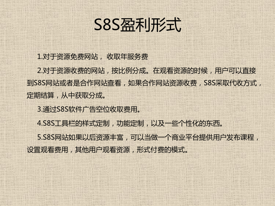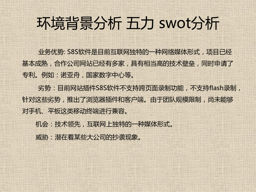 S8S商业计划书S8S介绍S8S优势局限性小,跨浏览器,跨平台:S8S软件使用标准的计算机语言开发而成的,并且对其一些非标准的浏览器进行各种修正达到正常浏览器的支持,因此可以让任何用户在任何的浏览器中都可以得到很好的支持。操作简单,易于上手:S8S软件沿袭了传统的录播界面,操作简单,只要您对普通的一些音乐播放器或者视频播放器熟悉,就能达到对S8S软件的熟练操作。S8S团队优势介绍S8S当前目标群体S8S规划环境背景分析五力swot分析市场分析S8S盈利形式投资分析S8S团队预算二.每年支出费用:合计250.5(万)办公场地租用:5(元/平米)*200(平米)*365(天)=36.5万带宽+服务器托管:34万/年带宽费用:5(服务器个数)*500(元/兆月)*10(带宽为10M)*12(月)=30万托管费用:5(服务器个数)*8000(元/年)=4万公司人员薪资:100万/年开发人员:8(名)60万/年高级开发人员:1(名)*20万/年,潜力程序员:4(名)*10万/年运营,推广人员(1名专职+4兼职):专职:1(名)*5万/年兼职:4(名)共计5万/年财会人员:1(名)*5万/年美术策划人员:1(名)*5万/年网页设计人员:1(名)*5万/年UI规划人员:1(名)*10万/年测试兼网管人员:1(名)*5万/年推广费用:50万备用资金:30万三.具体说明总投资:800万,启动资金:128.63万,年支出费用:250.5万。支撑开发时间:3年