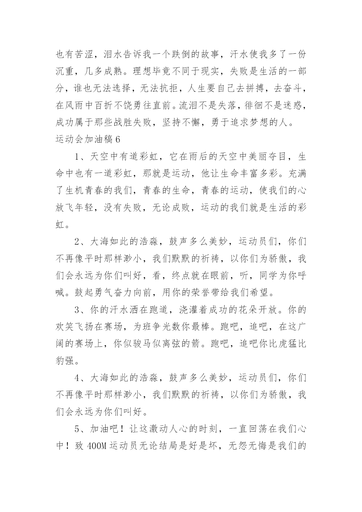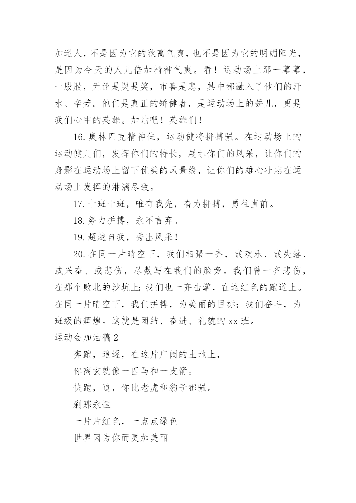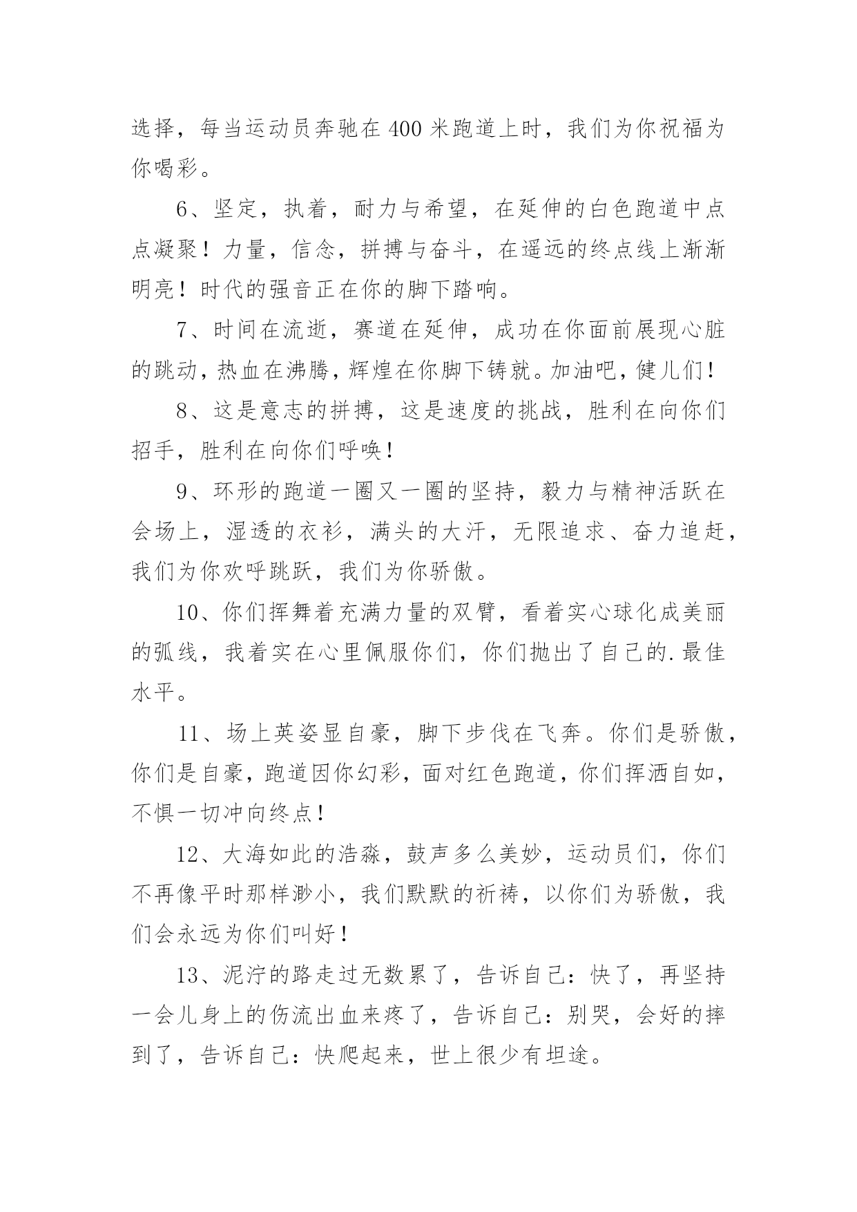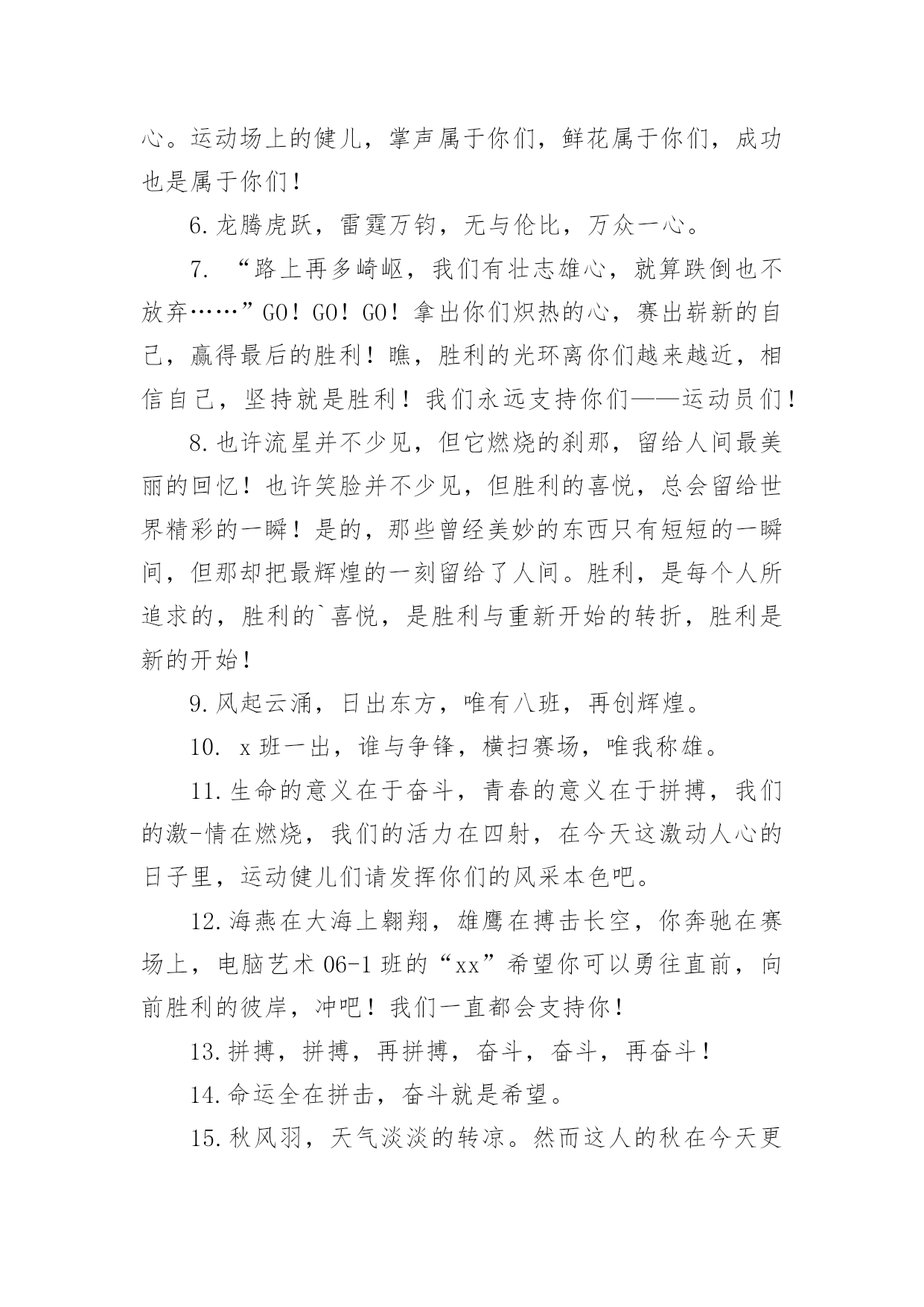 运动会加油稿运动会加油稿(经典)在当今社会生活中,我们需要用到加油稿的情形越来越多,借助加油稿可以更好地为他人加油打气。那么,怎么去写加油稿呢?下面是小编为大家整理的运动会加油稿,欢迎阅读,希望大家能够喜欢。运动会加油稿11.不卑不亢,奋发向上,生命辉煌,我们开创。2.龙腾虎跃,雷霆万钧,无与伦比,万众一心。3.青春无畏,逐梦扬威!4.沉甸甸的铅球,寄托着你的希望,奋力一抛的瞬间,一道闪亮的弧线划破美丽的长空,希望向前,再向前!你胜利了,望着远方红色的终点线,那是汗水铺成的路,泪水堆成的山,平时的努力与奋战,不就为这一瞬间,于是你们用尽全身力气,冲向那决定命运的红线,你胜利了,耳旁飘来了同学们的欢呼与赞叹。5.每一份辛劳都有一份收获,每一次的痛苦都是快乐的开始,没一声呐喊都是力量的呼唤。我们有着大浪拍岸的豪迈,所以你不必在乎小荷初露的恬静,我们有着春日的阳光明媚,所以不用去羡慕冬日乱玉碎琼,我们是雨天的一把伞,是寒冷冬日里的一盆碳火,温暖的不只是你我,而是大家的心。运动场上的健儿,掌声属于你们,鲜花属于你们,成功也是属于你们!6.龙腾虎跃,雷霆万钧,无与伦比,万众一心。7.“路上再多崎岖,我们有壮志雄心,就算跌倒也不放弃……”GO!GO!GO!拿出你们炽热的心,赛出崭新的自己,赢得最后的胜利!瞧,胜利的光环离你们越来越近,相信自己,坚持就是胜利!我们永远支持你们——运动员们!8.也许流星并不少见,但它燃烧的刹那,留给人间最美丽的回忆!也许笑脸并不少见,但胜利的喜悦,总会留给世界精彩的一瞬!是的,那些曾经美妙的东西只有短短的一瞬间,但那却把最辉煌的一刻留给了人间。胜利,是每个人所追求的,胜利的`喜悦,是胜利与重新开始的转折,胜利是新的开始!9.风起云涌,日出东方,唯有八班,再创辉煌。10.x班一出,谁与争锋,横扫赛场,唯我称雄。11.生命的意义在于奋斗,青春的意义在于拼搏,我们的激-情在燃烧,我们的活力在四射,在今天这激动人心的日子里,运动健儿们请发挥你们的风采本色吧。12.海燕在大海上翱翔,雄鹰在搏击长空,你奔驰在赛场上,电脑艺术06-1班的“xx”希望你可以勇往直前,向前胜利的彼岸,冲吧!我们一直都会支持你!13.拼搏,拼搏,再拼搏,奋斗,奋斗,再奋斗!14.命运全在拼击,奋斗就是希望。15.秋风羽,天气淡淡的转凉。然而这人的秋在今天更加迷人,不是因为它的秋高气爽,也不是因为它的明媚阳光,是因为今天的人儿倍加精神气爽。看!运动场上那一幕幕,一股股,无论是哭是笑,市喜是悲,其中都融入了他们的汗水、辛劳。他们是真正的矫健者,是运动场上的骄儿,更是我们心中的英雄。加油吧!英雄们!16.奥林匹克精神佳,运动健将拼搏强。在运动场上的运动健儿们,发挥你们的特长,展示你们的风采,让你们的身影在运动场上留下优美的风景线,让你们的雄心壮志在运动场上发挥的淋漓尽致。17.十班十班,唯有我先,奋力拼搏,勇往直前。18.努力拼搏,永不言弃。19.超越自我,秀出风采!20.在同一片晴空下,我们相聚一齐,或欢乐、或失落、或兴奋、或悲伤,尽数写在我们的脸旁。我们曾一齐悲伤,在那个败北的沙坑上;我们也一齐击掌,在这红色的跑道上。在同一片晴空下,我们拼搏,为美丽的目标;我们奋斗,为班级的辉煌。这就是团结、奋进、礼貌的xx班。运动会加油稿2奔跑,追逐,在这片广阔的土地上,你离玄就像一匹马和一支箭。快跑,追,你比老虎和豹子都强。刹那永恒一片片红色,一点点绿色世界因为你而更加美丽风在轻轻地歌唱成功,自由我陪你一起追求额上的寒珠折射的.不仅是阳光还有一种希望它,来自播种你看看台上一双双注视着你的眼睛运动会加油稿31、团结拼搏奋斗。2、挥动激情,放飞梦想,团结拼搏,树我雄风。3、励精图治,开拓进取,超越刘翔,从我做起。4、14礼貌守纪拥抱胜利5、青春如火,超越自我;机汽学子,勇创佳绩;6、15努力拼搏自强不息7、向参加校运会的体育健儿学习致敬!8、信笃志坚,奋起争先,机汽学子,再创辉煌。9、20班:这天的'骄傲将从这诞生,明日的太阳将从那里升起!10、拼搏追娶善学勤11、超越极限,超越自我。12、15班:15班,齐心进,运动会,创佳绩!13、与时俱进,奋力拼搏,齐心协力,争创一流。14、鸣奏青春旋律,抒写运动乐意!15、19班:团结友爱,勤奋好学,激情飞扬。16、向辛勤工作的全体裁判员工作人员致敬!17、青春如火,超越自我;机汽学子,勇创佳绩。18、九班九班,勇夺桂冠,齐心协力,共创辉煌。19、22班:展现青春风采!20、奋力拼搏,扬我班风,努力学习,勇争第一。21、心理健康加身体健康就是幸福。22、青春如火,超越自我,八年五班,奋勇拼搏。23、4,不要掉泪,不要屈服,哪怕胜利永远只是个未知数。24、16班:犯其至难,图其至远!25、扬体育精神,展青春风采!26、