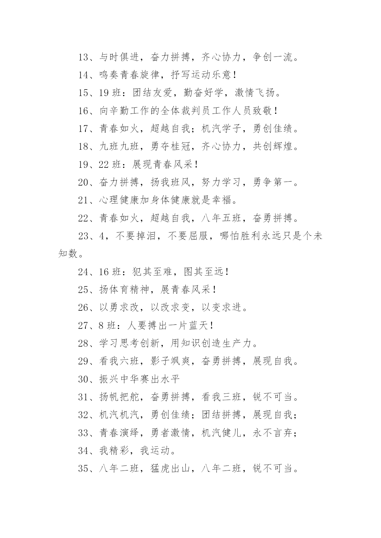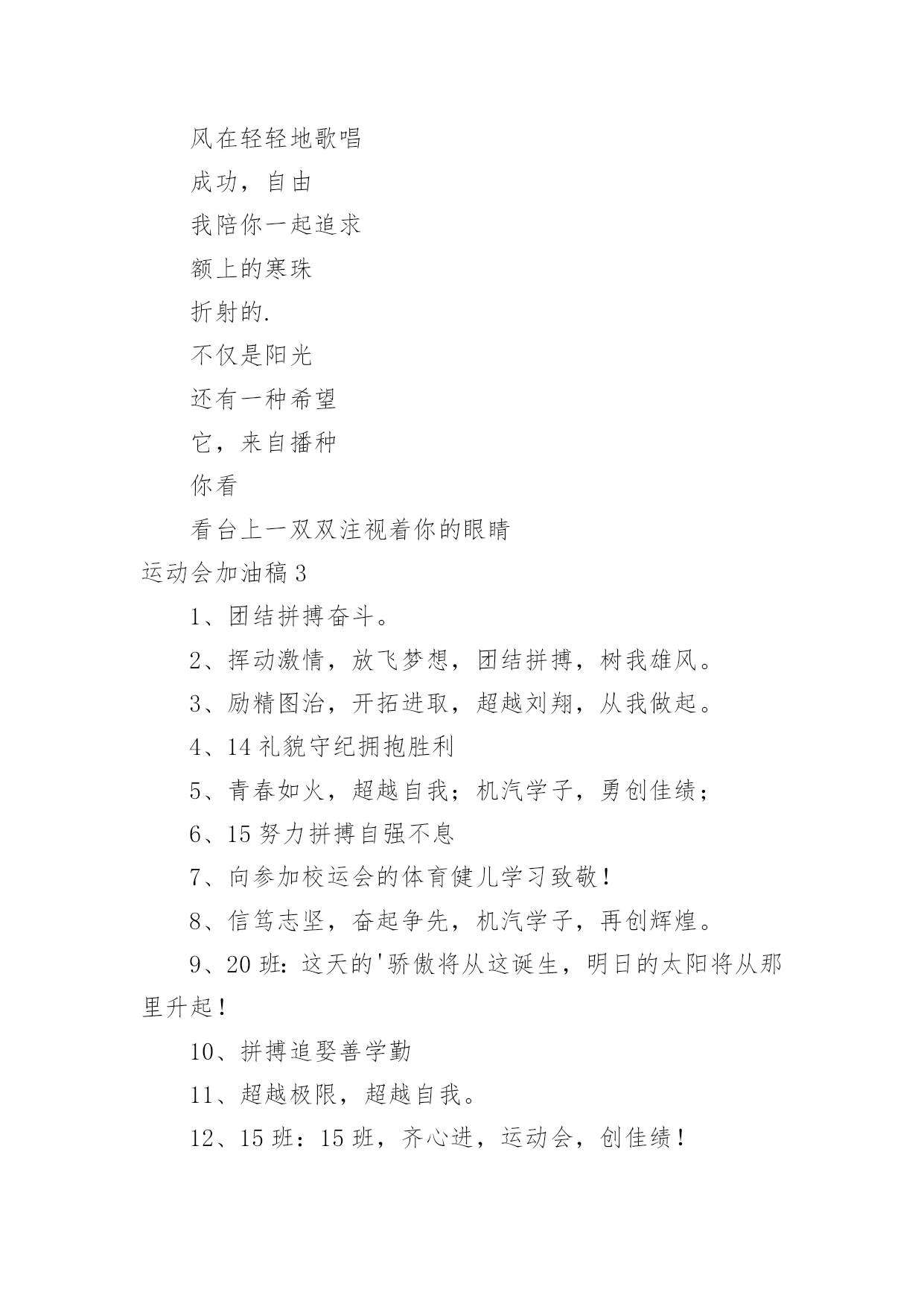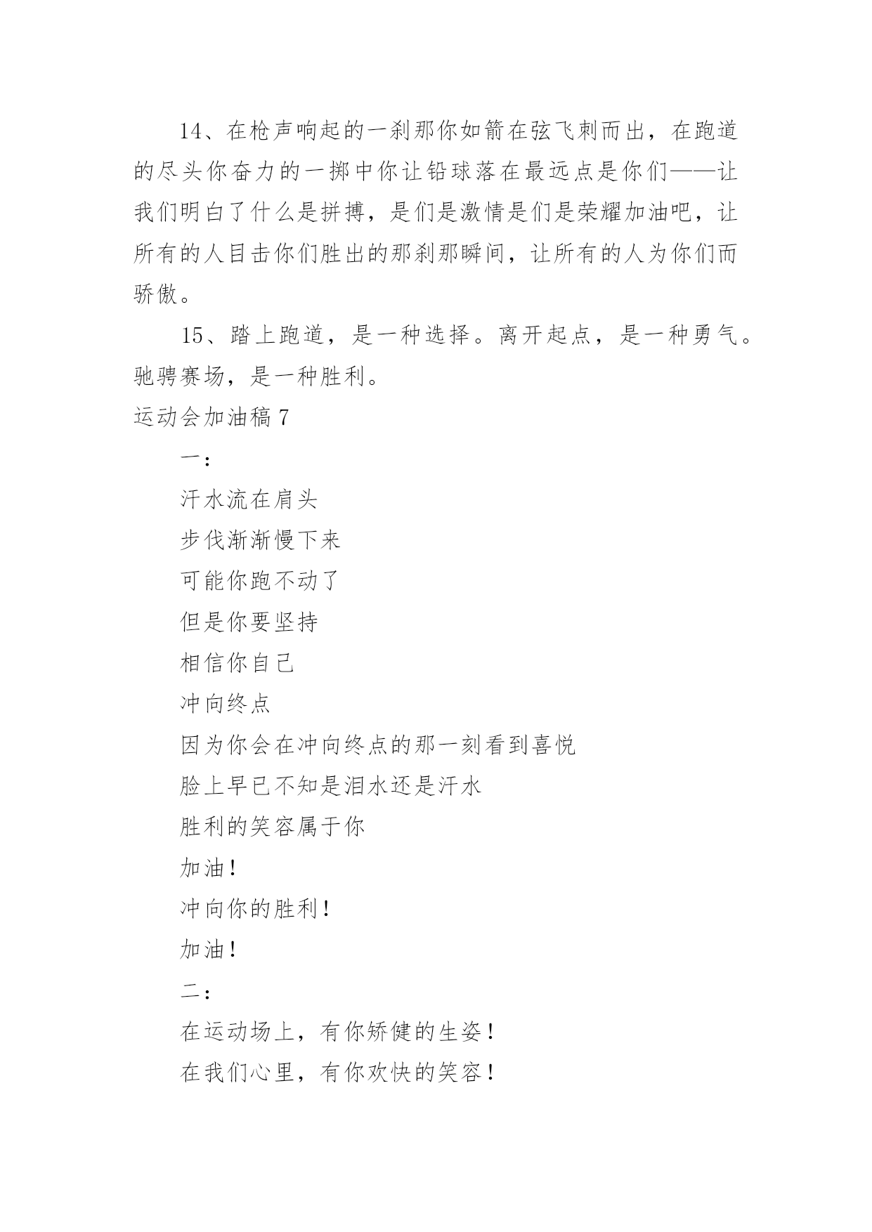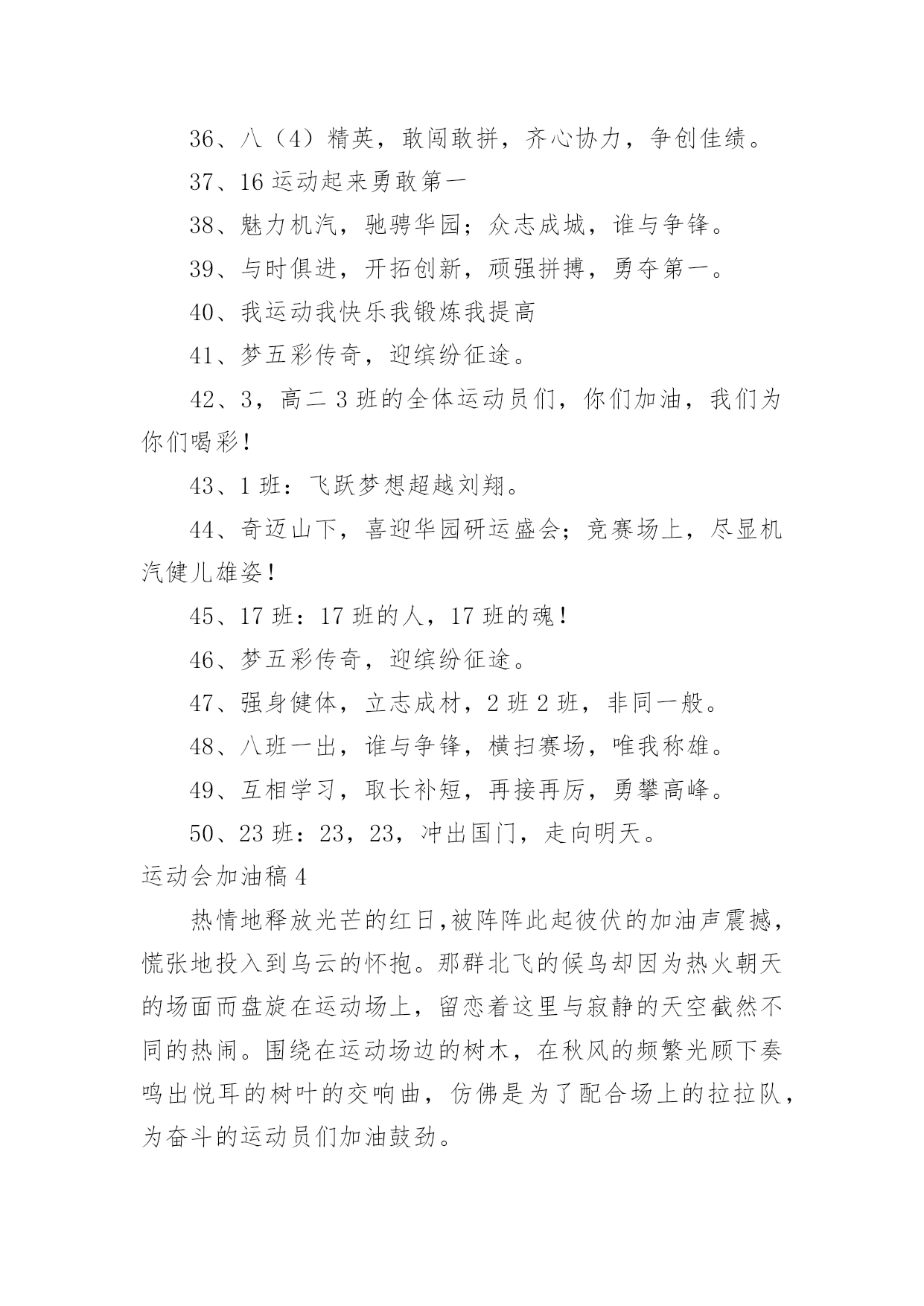 运动会加油稿运动会加油稿(经典)在当今社会生活中,我们需要用到加油稿的情形越来越多,借助加油稿可以更好地为他人加油打气。那么,怎么去写加油稿呢?下面是小编为大家整理的运动会加油稿,欢迎阅读,希望大家能够喜欢。运动会加油稿11.不卑不亢,奋发向上,生命辉煌,我们开创。2.龙腾虎跃,雷霆万钧,无与伦比,万众一心。3.青春无畏,逐梦扬威!4.沉甸甸的铅球,寄托着你的希望,奋力一抛的瞬间,一道闪亮的弧线划破美丽的长空,希望向前,再向前!你胜利了,望着远方红色的终点线,那是汗水铺成的路,泪水堆成的山,平时的努力与奋战,不就为这一瞬间,于是你们用尽全身力气,冲向那决定命运的红线,你胜利了,耳旁飘来了同学们的欢呼与赞叹。5.每一份辛劳都有一份收获,每一次的痛苦都是快乐的开始,没一声呐喊都是力量的呼唤。我们有着大浪拍岸的豪迈,所以你不必在乎小荷初露的恬静,我们有着春日的阳光明媚,所以不用去羡慕冬日乱玉碎琼,我们是雨天的一把伞,是寒冷冬日里的一盆碳火,温暖的不只是你我,而是大家的心。运动场上的健儿,掌声属于你们,鲜花属于你们,成功也是属于你们!6.龙腾虎跃,雷霆万钧,无与伦比,万众一心。7.“路上再多崎岖,我们有壮志雄心,就算跌倒也不放弃……”GO!GO!GO!拿出你们炽热的心,赛出崭新的自己,赢得最后的胜利!瞧,胜利的光环离你们越来越近,相信自己,坚持就是胜利!我们永远支持你们——运动员们!8.也许流星并不少见,但它燃烧的刹那,留给人间最美丽的回忆!也许笑脸并不少见,但胜利的喜悦,总会留给世界精彩的一瞬!是的,那些曾经美妙的东西只有短短的一瞬间,但那却把最辉煌的一刻留给了人间。胜利,是每个人所追求的,胜利的`喜悦,是胜利与重新开始的转折,胜利是新的开始!9.风起云涌,日出东方,唯有八班,再创辉煌。10.x班一出,谁与争锋,横扫赛场,唯我称雄。11.生命的意义在于奋斗,青春的意义在于拼搏,我们的激-情在燃烧,我们的活力在四射,在今天这激动人心的日子里,运动健儿们请发挥你们的风采本色吧。12.海燕在大海上翱翔,雄鹰在搏击长空,你奔驰在赛场上,电脑艺术06-1班的“xx”希望你可以勇往直前,向前胜利的彼岸,冲吧!我们一直都会支持你!13.拼搏,拼搏,再拼搏,奋斗,奋斗,再奋斗!14.命运全在拼击,奋斗就是希望。15.秋风羽,天气淡淡的转凉。然而这人的秋在今天更加迷人,不是因为它的秋高气爽,也不是因为它的明媚阳光,是因为今天的人儿倍加精神气爽。看!运动场上那一幕幕,一股股,无论是哭是笑,市喜是悲,其中都融入了他们的汗水、辛劳。他们是真正的矫健者,是运动场上的骄儿,更是我们心中的英雄。加油吧!英雄们!16.奥林匹克精神佳,运动健将拼搏强。在运动场上的运动健儿们,发挥你们的特长,展示你们的风采,让你们的身影在运动场上留下优美的风景线,让你们的雄心壮志在运动场上发挥的淋漓尽致。17.十班十班,唯有我先,奋力拼搏,勇往直前。18.努力拼搏,永不言弃。19.超越自我,秀出风采!20.在同一片晴空下,我们相聚一齐,或欢乐、或失落、或兴奋、或悲伤,尽数写在我们的脸旁。我们曾一齐悲伤,在那个败北的沙坑上;我们也一齐击掌,在这红色的跑道上。在同一片晴空下,我们拼搏,为美丽的目标;我们奋斗,为班级的辉煌。这就是团结、奋进、礼貌的xx班。运动会加油稿2奔跑,追逐,在这片广阔的土地上,你离玄就像一匹马和一支箭。快跑,追,你比老虎和豹子都强。刹那永恒一片片红色,一点点绿色世界因为你而更加美丽风在轻轻地歌唱成功,自由我陪你一起追求额上的寒珠折射的.不仅是阳光还有一种希望它,来自播种你看看台上一双双注视着你的眼睛运动会加油稿31、团结拼搏奋斗。2、挥动激情,放飞梦想,团结拼搏,树我雄风。3、励精图治,开拓进取,超越刘翔,从我做起。4、14礼貌守纪拥抱胜利5、青春如火,超越自我;机汽学子,勇创佳绩;6、15努力拼搏自强不息7、向参加校运会的体育健儿学习致敬!8、信笃志坚,奋起争先,机汽学子,再创辉煌。9、20班:这天的'骄傲将从这诞生,明日的太阳将从那里升起!10、拼搏追娶善学勤11、超越极限,超越自我。12、15班:15班,齐心进,运动会,创佳绩!13、与时俱进,奋力拼搏,齐心协力,争创一流。14、鸣奏青春旋律,抒写运动乐意!15、19班:团结友爱,勤奋好学,激情飞扬。16、向辛勤工作的全体裁判员工作人员致敬!17、青春如火,超越自我;机汽学子,勇创佳绩。18、九班九班,勇夺桂冠,齐心协力,共创辉煌。19、22班:展现青春风采!20、奋力拼搏,扬我班风,努力学习,勇争第一。21、心理健康加身体健康就是幸福。22、青春如火,超越自我,八年五班,奋勇拼搏。23、4,不要掉泪,不要屈服,哪怕胜利永远只是个未知数。24、16班:犯其至难,图其至远!25、扬体育精神,展青春风采!26、