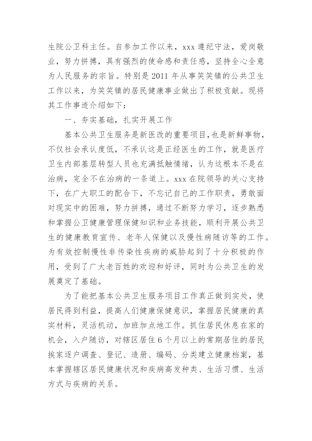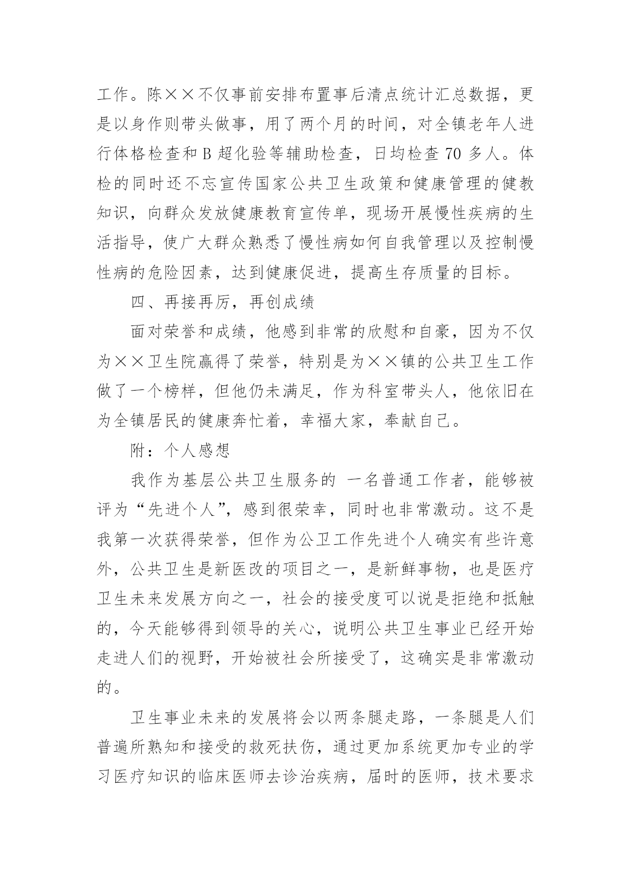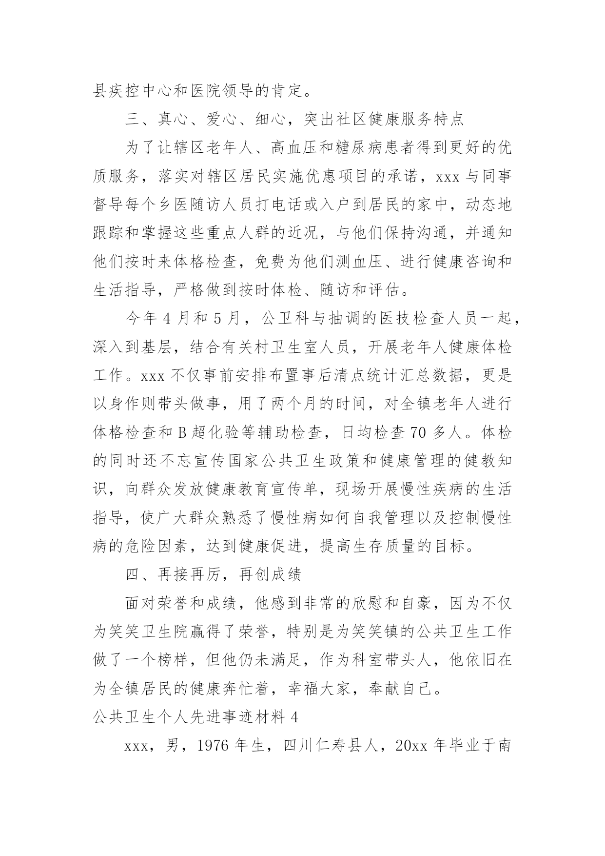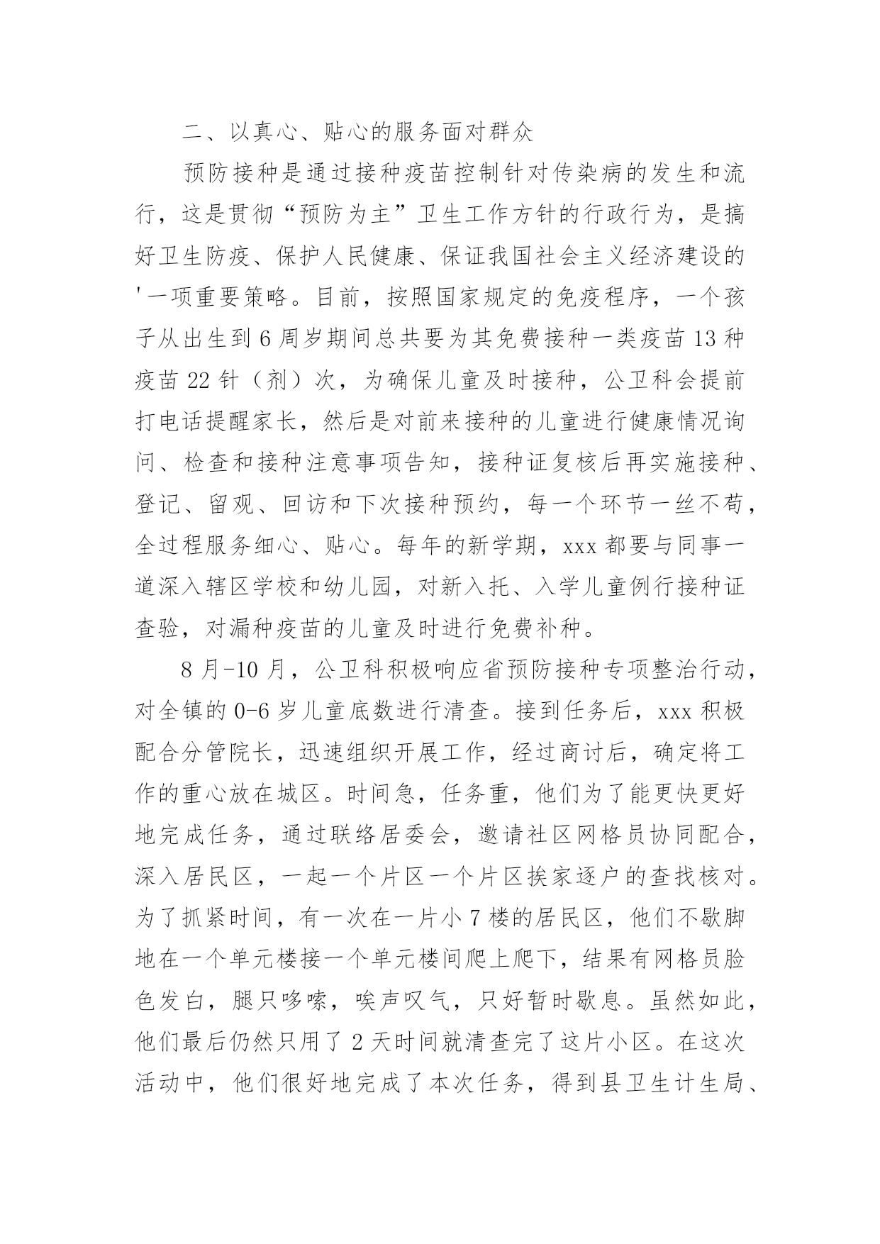公共卫生个人先进事迹材料公共卫生个人先进事迹材料在平凡的学习、工作、生活中,大家都有写事迹材料的经历,对事迹材料很是熟悉吧,事迹材料以先进对象的先进事迹为主要内容,以叙事为主要表达方式。一起来参考事迹材料是怎么写的吧,以下是小编为大家收集的公共卫生个人先进事迹材料,仅供参考,希望能够帮助到大家。公共卫生个人先进事迹材料1本人于1993年10月至20xx年在本院从事预防保健工作,20xx年至今从事公卫服务管理工作。转眼间,已在基层平凡的工作岗位上默默的工作了20年。工作中不骄不躁、不厌不烦、不吹不俸,始终踏踏实实、积极乐观、服从安排、勤恳努力、任劳任怨、刻苦学习、团结协作、刻苦耐劳、不计较个人得失、认真积极完成上级布置的'任务。我没有感人的事迹,只有平常的小事。自从公卫项目启动,刚接触缺乏经验,工作中难免会遇到这样那样问题。为能够更好做好工作,对新项目,首先要熟悉掌握服务规范及相关知识。因此院领导高度重视公卫知识培训,让我外出学习培训,回来并负责组织培训同事,通过爱医网教视频等对全体医护人员进行集中多次培训,督促同事学习,保证同事们熟悉掌握服务规范及相关知识。其次要有刻苦耐劳、勤劳协作、为人民服务思想精神。对一些思想上怕苦偷懒的同事,我常多做些,多累些、多关心、多开导、严把关,做好带头作用。我常和同事带着血压计等体检工具,不管下雨炎热,下乡走到每个自然村,对行动不便居民走家窜户,认真对他们踏实进行健康指导教育、随访等,常和同事整理着琐碎的资料,常和同事加班去完成任务。遇困难时苦服,碰疑问时思索请教,积极总结经验。领导的高度重视和我们团结协作、刻苦耐劳、不计较精神,共公卫生各项工作顺利开展。虽然每年重复做着平常的工作,但看到居民的健康,我们心里觉得很乐。虽然我们努力了,但也存在不足。昨天,我们努力了,明天,我们将更加努力。公共卫生个人先进事迹材料2陈××,男,汉族,XX年3月出生,XX年8月参加工作,大专文化,公卫医师,现任××镇卫生院公卫科主任。自参加工作以来,陈××遵纪守法,爱岗敬业,努力拼搏,具有强烈的使命感和责任感,坚持全心全意为人民服务的宗旨。特别是20xx年从事××镇的公共卫生工作以来,为××镇的居民健康事业做出了积极贡献。现将其工作事迹介绍如下:一、夯实基础,扎实开展工作基本公共卫生服务是新医改的重要项目,也是新鲜事物,不仅社会承认度低,不承认这是正经医生的工作,就是医疗卫生内部基层转型人员也充满抵触情绪,认为这根本不是在治病,完全不在治病的一条道上。陈××在院领导的关心支持下,在广大职工的配合下,不忘记自己的工作职责,勇敢面对现实中的困难,努力拼搏,通过不断努力学习,逐步熟悉和掌握公卫健康管理保健知识和业务技能,顺利开展公共卫生的健康教育宣传、老年人保健以及慢性病随访等的工作。为有效控制慢性非传染性疾病的威胁起到了十分积极的作用,受到了广大老百姓的欢迎和好评,同时为公共卫生的发展奠定了基础。为了能把基本公共卫生服务项目工作真正做到实处,使居民得到利益,提高人们健康保健意识,掌握居民健康的真实材料,灵活机动,加班加点地工作。抓住居民休息在家的机会,入户随访,对辖区居住6个月以上的常期居住的居民挨家逐户调查、登记、造册、编码、分类建立健康档案,基本掌握辖区居民健康状况和疾病高发种类、生活习惯、生活方式与疾病的关系。二、以真心、贴心的服务面对群众预防接种是通过接种疫苗控制针对传染病的发生和流行,这是贯彻“预防为主”卫生工作方针的行政行为,是搞好卫生防疫、保护人民健康、保证我国社会主义经济建设的一项重要策略。目前,按照国家规定的免疫程序,一个孩子从出生到6周岁期间总共要为其免费接种一类疫苗13种疫苗22针(剂)次,为确保儿童及时接种,公卫科会提前打电话提醒家长,然后是对前来接种的儿童进行健康情况询问、检查和接种注意事项告知,接种证复核后再实施接种、登记、留观、回访和下次接种预约,每一个环节一丝不苟,全过程服务细心、贴心。每年的.新学期,陈××都要与同事一道深入辖区学校和幼儿园,对新入托、入学儿童例行接种证查验,对漏种疫苗的儿童及时进行免费补种。20xx年8月-10月,公卫科积极响应省预防接种专项整治行动,对全镇的0-6岁儿童底数进行清查。接到任务后,陈××积极配合分管院长,迅速组织开展工作,经过商讨后,确定将工作的重心放在城区。时间急,任务重,他们为了能更快更好地完成任务,通过联络居委会,邀请社区网格员协同配合,深入居民区,一起一个片区一个片区挨家逐户的查找核对。为了抓紧时间,有一次在一片小7楼的居民区,他们不歇脚地在一个单元楼接一个单元楼间爬上爬下,结果有网格员脸色发白,腿只哆嗦,唉声叹气,只好暂时歇息。虽然如此,他们最后仍然只用了2天时间就清查完了这片小区。在这次活动中,他们很好地完成了本次任务,得到县卫生计生局、