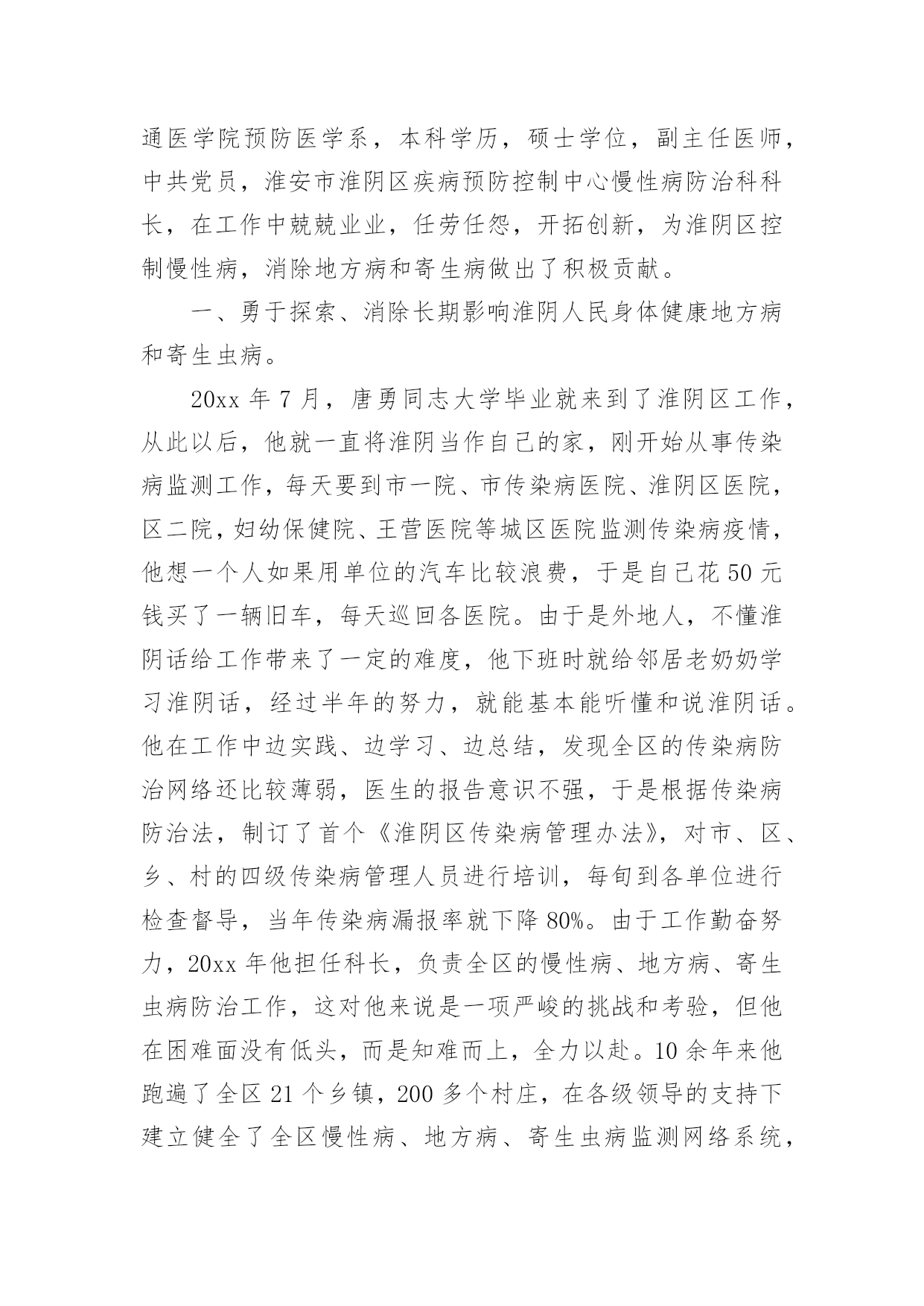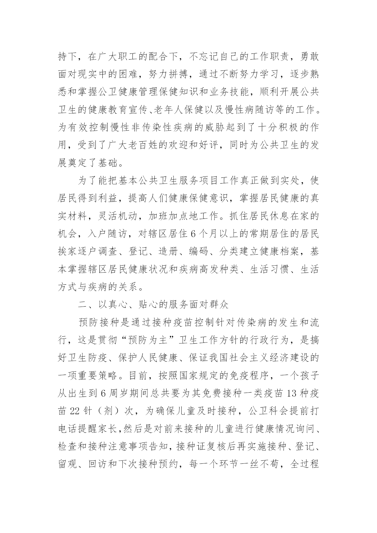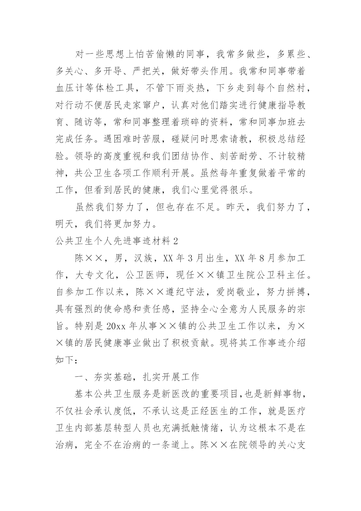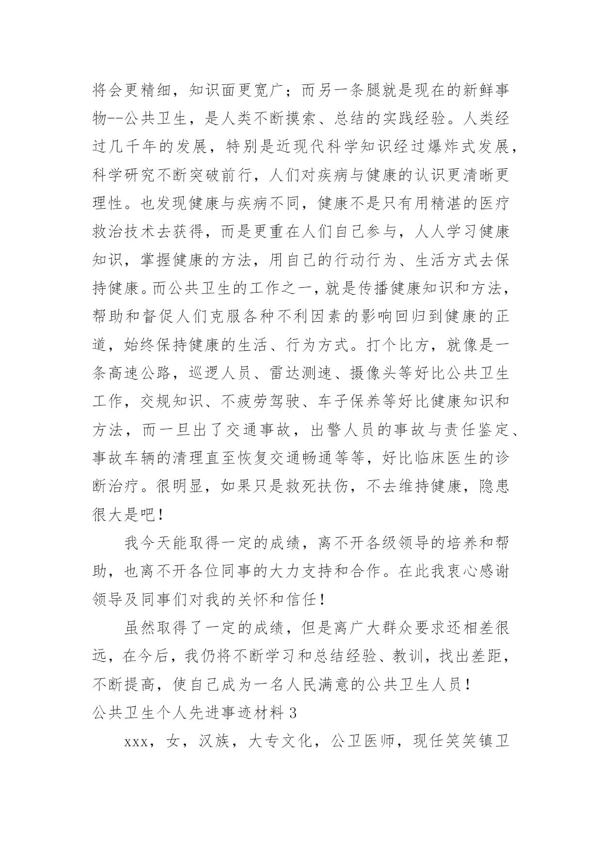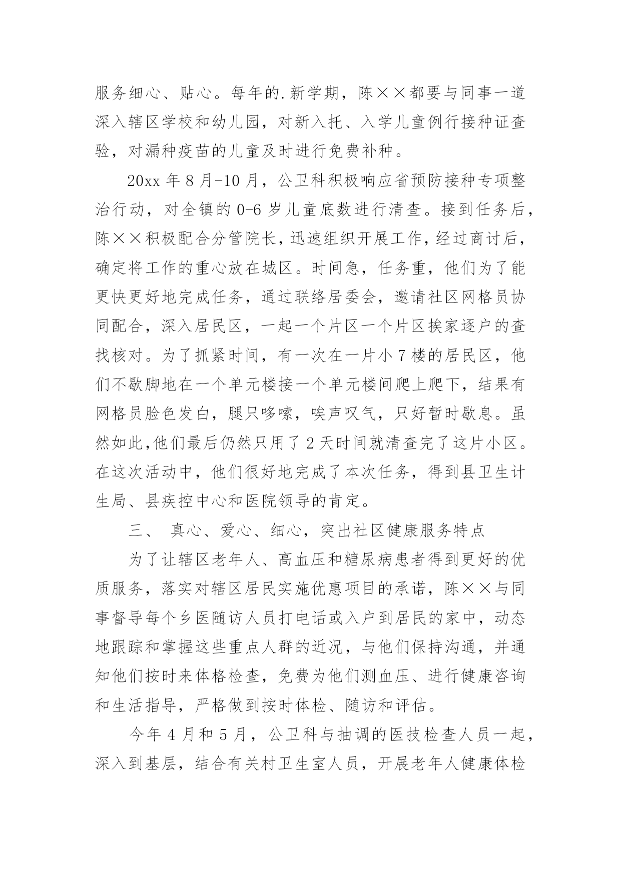 公共卫生个人先进事迹材料公共卫生个人先进事迹材料在平凡的学习、工作、生活中,大家都有写事迹材料的经历,对事迹材料很是熟悉吧,事迹材料以先进对象的先进事迹为主要内容,以叙事为主要表达方式。一起来参考事迹材料是怎么写的吧,以下是小编为大家收集的公共卫生个人先进事迹材料,仅供参考,希望能够帮助到大家。公共卫生个人先进事迹材料1本人于1993年10月至20xx年在本院从事预防保健工作,20xx年至今从事公卫服务管理工作。转眼间,已在基层平凡的工作岗位上默默的工作了20年。工作中不骄不躁、不厌不烦、不吹不俸,始终踏踏实实、积极乐观、服从安排、勤恳努力、任劳任怨、刻苦学习、团结协作、刻苦耐劳、不计较个人得失、认真积极完成上级布置的'任务。我没有感人的事迹,只有平常的小事。自从公卫项目启动,刚接触缺乏经验,工作中难免会遇到这样那样问题。为能够更好做好工作,对新项目,首先要熟悉掌握服务规范及相关知识。因此院领导高度重视公卫知识培训,让我外出学习培训,回来并负责组织培训同事,通过爱医网教视频等对全体医护人员进行集中多次培训,督促同事学习,保证同事们熟悉掌握服务规范及相关知识。其次要有刻苦耐劳、勤劳协作、为人民服务思想精神。对一些思想上怕苦偷懒的同事,我常多做些,多累些、多关心、多开导、严把关,做好带头作用。我常和同事带着血压计等体检工具,不管下雨炎热,下乡走到每个自然村,对行动不便居民走家窜户,认真对他们踏实进行健康指导教育、随访等,常和同事整理着琐碎的资料,常和同事加班去完成任务。遇困难时苦服,碰疑问时思索请教,积极总结经验。领导的高度重视和我们团结协作、刻苦耐劳、不计较精神,共公卫生各项工作顺利开展。虽然每年重复做着平常的工作,但看到居民的健康,我们心里觉得很乐。虽然我们努力了,但也存在不足。昨天,我们努力了,明天,我们将更加努力。公共卫生个人先进事迹材料2陈××,男,汉族,XX年3月出生,XX年8月参加工作,大专文化,公卫医师,现任××镇卫生院公卫科主任。自参加工作以来,陈××遵纪守法,爱岗敬业,努力拼搏,具有强烈的使命感和责任感,坚持全心全意为人民服务的宗旨。特别是20xx年从事××镇的公共卫生工作以来,为××镇的居民健康事业做出了积极贡献。现将其工作事迹介绍如下:一、夯实基础,扎实开展工作基本公共卫生服务是新医改的重要项目,也是新鲜事物,不仅社会承认度低,不承认这是正经医生的工作,就是医疗卫生内部基层转型人员也充满抵触情绪,认为这根本不是在治病,完全不在治病的一条道上。陈××在院领导的关心支持下,在广大职工的配合下,不忘记自己的工作职责,勇敢面对现实中的困难,努力拼搏,通过不断努力学习,逐步熟悉和掌握公卫健康管理保健知识和业务技能,顺利开展公共卫生的健康教育宣传、老年人保健以及慢性病随访等的工作。为有效控制慢性非传染性疾病的威胁起到了十分积极的作用,受到了广大老百姓的欢迎和好评,同时为公共卫生的发展奠定了基础。为了能把基本公共卫生服务项目工作真正做到实处,使居民得到利益,提高人们健康保健意识,掌握居民健康的真实材料,灵活机动,加班加点地工作。抓住居民休息在家的机会,入户随访,对辖区居住6个月以上的常期居住的居民挨家逐户调查、登记、造册、编码、分类建立健康档案,基本掌握辖区居民健康状况和疾病高发种类、生活习惯、生活方式与疾病的关系。二、以真心、贴心的服务面对群众预防接种是通过接种疫苗控制针对传染病的发生和流行,这是贯彻“预防为主”卫生工作方针的行政行为,是搞好卫生防疫、保护人民健康、保证我国社会主义经济建设的一项重要策略。目前,按照国家规定的免疫程序,一个孩子从出生到6周岁期间总共要为其免费接种一类疫苗13种疫苗22针(剂)次,为确保儿童及时接种,公卫科会提前打电话提醒家长,然后是对前来接种的儿童进行健康情况询问、检查和接种注意事项告知,接种证复核后再实施接种、登记、留观、回访和下次接种预约,每一个环节一丝不苟,全过程服务细心、贴心。每年的.新学期,陈××都要与同事一道深入辖区学校和幼儿园,对新入托、入学儿童例行接种证查验,对漏种疫苗的儿童及时进行免费补种。20xx年8月-10月,公卫科积极响应省预防接种专项整治行动,对全镇的0-6岁儿童底数进行清查。接到任务后,陈××积极配合分管院长,迅速组织开展工作,经过商讨后,确定将工作的重心放在城区。时间急,任务重,他们为了能更快更好地完成任务,通过联络居委会,邀请社区网格员协同配合,深入居民区,一起一个片区一个片区挨家逐户的查找核对。为了抓紧时间,有一次在一片小7楼的居民区,他们不歇脚地在一个单元楼接一个单元楼间爬上爬下,结果有网格员脸色发白,腿只哆嗦,唉声叹气,只好暂时歇息。虽然如此,他们最后仍然只用了2天时间就清查完了这片小区。在这次活动中,他们很好地完成了本次任务,得到县卫生计生局、
