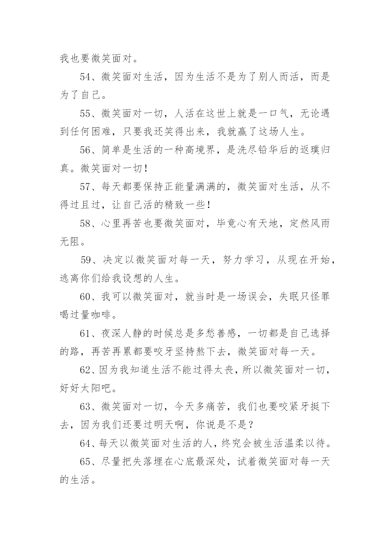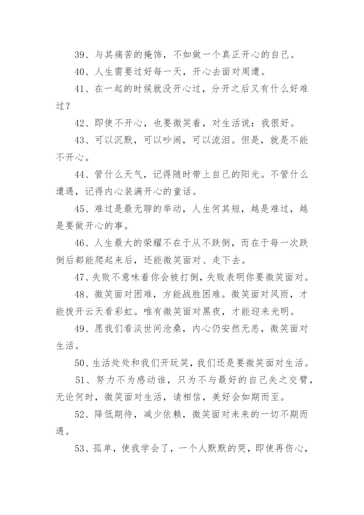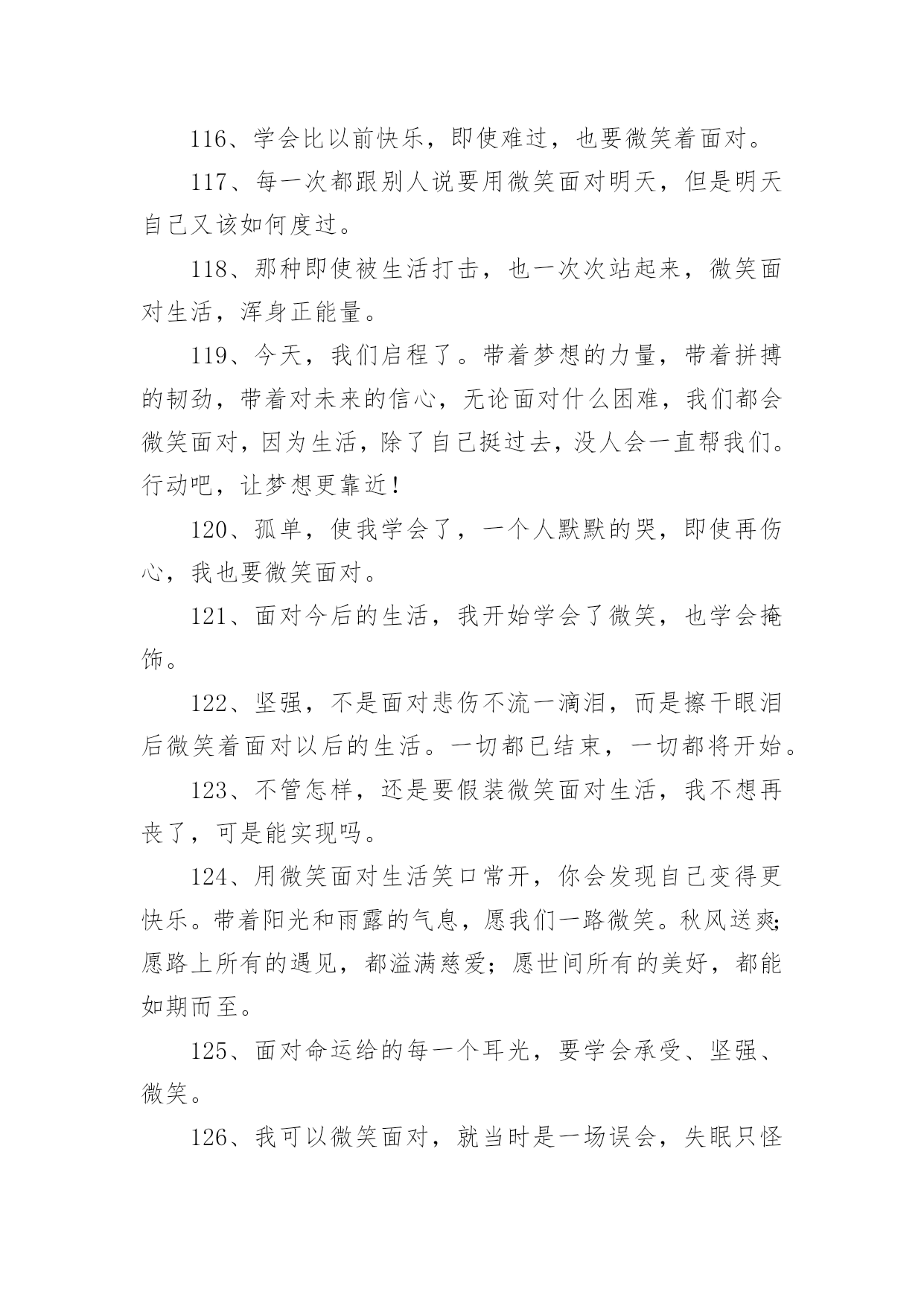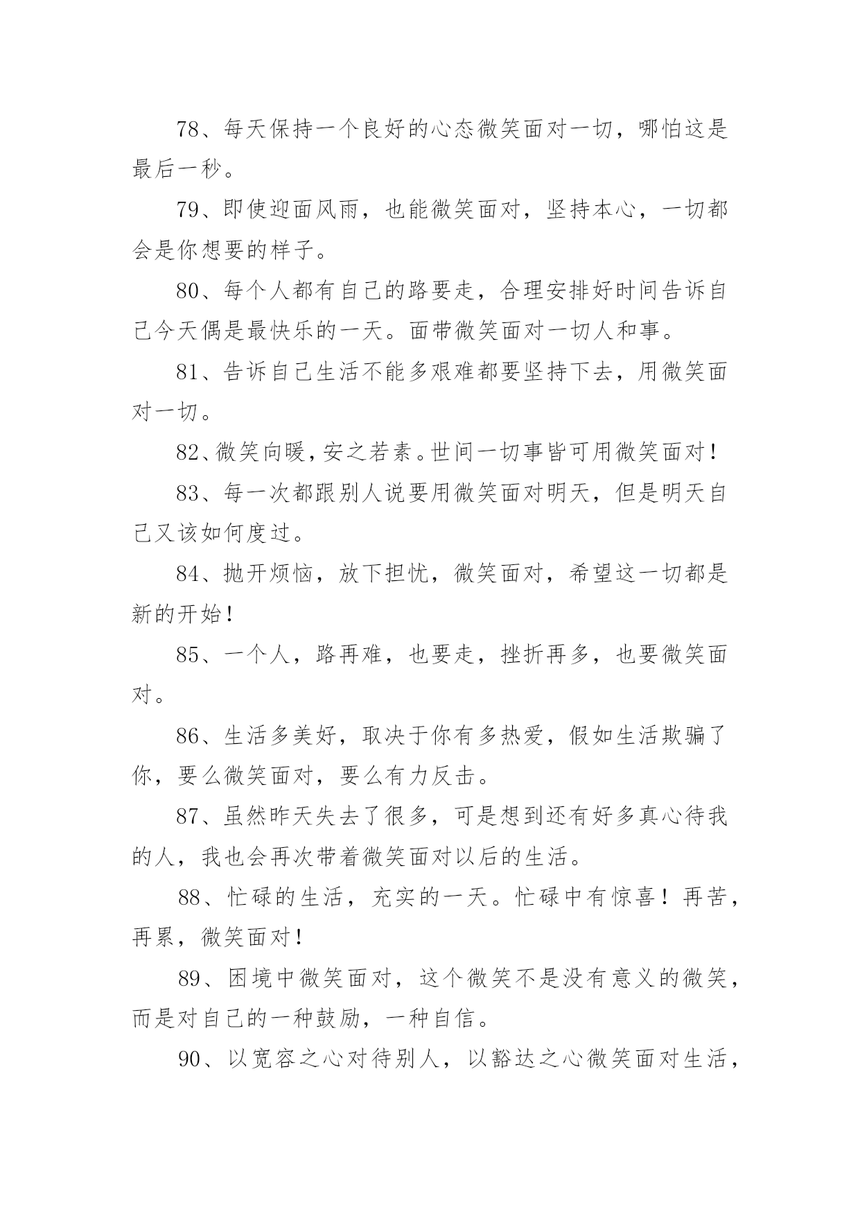 微笑的面对生活的句子微笑的面对生活的句子190句在平日的学习、工作和生活里,大家总免不了要接触或使用句子吧,句子可分为单句和复句,单句又可分为主谓句和非主谓句。究竟什么样的句子才是好的句子呢?以下是小编帮大家整理的微笑的面对生活的句子,仅供参考,大家一起来看看吧。1、微笑面对人生,你的人生就会面微笑对你微笑。2、失败不意味着你会被打倒,失败表明你要微笑面对。3、已经习惯了用微笑面对一切,可是你们说我没心没肺的时候心还是会痛。4、困境中微笑面对,这个微笑不是没有意义的微笑,而是对自己的一种鼓励,一种自信。5、微笑很简单,意义却深远;大家一起笑,世界更温暖。6、人生应该微笑面对生活,带着激情面对工作,带着真情面对家人,带着热情面对挑战。7、无论你喜不喜欢我,我都会在这里,微笑面对一切。8、即使迎面风雨,也能微笑面对,坚持本心,一切都会是你想要的样子。9、生活再苦,凡事再累,都请记得微笑面对一切!你的微笑决定着所有的原动力!10、告诉自己生活不能多艰难都要坚持下去,用微笑面对一切。11、喜欢啊,是清风,是朝露,是脸颊红红。是千万万人里再也装不下其他。12、生活就是面对真实的微笑,就是越过障碍注视将来。13、因为我知道生活不能过得太丧,所以微笑面对一切,好好拥抱太阳吧。14、笑容是支点,能力是杠杆,有这两样能撑起整个地球。15、人生的道路都是由心来描绘的。所以,无论自己处于多么严酷的境遇之中,心头都不应为悲观的思想所萦绕。——稻盛和夫日16、你给世界一个微笑,世界会给你许多微笑。17、常露笑容会给客人宾至如归的感觉!18、决定以微笑面对每一天,努力学习,从现在开始,逃离你们给我设想的人生19、时光飞逝,珍惜每一天的时光,充满正能量,传递阳光和温暖,微笑面对一切困难和挑战,善待身边的每一个人,你就是最快乐的人。20、即使迎面风雨,也能微笑面对,坚持本心,一切都会是你想要的样子。21、人与人之间真诚关怀的力量叫做微笑。22、忘记了它而微笑,远胜于记住它而愁苦。23、希望有一天,我可以不用对着手机和你说晚安,你就在我身边。24、美是力量,微笑是它的剑。25、别让游戏支配你的一切,要让自然拥抱你的生活,用微笑面对一切。26、微笑面对生活,因为生活不是为了别人而活,而是为了自己。27、微笑着面对失败,把每一次的失败都归结为一次尝试,不去自卑;把每一次的成功都想成一种幸运,不去自傲。28、最近非常不顺,好心累,精疲力竭克制自己,微笑面对一切。29、人的一生会经历许多的沧海桑田,经历许多的风吹雨打,但我们继续生活下去,坎坷困难在生活中都是常事,用微笑去面对生活,困难也就迎刃而解了。30、当你微笑时,世界爱了他,当他大笑时,世界便怕了他。——泰戈尔31、做一个开心的人,开心到别人见到你也会觉得开心。32、找不到解决问题的方法,那就找一个让自己笑的理由,世界有60亿人,但你却只有一个。33、一天很短,开心了就笑,不开心了就过会儿再笑。34、将手贴近胸口,听见扑通扑通的心跳。好开心,因为我还活着。35、既然伤心没有用,为什么还要不开心呢?36、输赢并不重要,开心才是真谛。37、越尴尬我越开心,冷眼与嘲笑我不屑。38、只要我还有力气呼吸,就一定会开心的微笑!39、与其痛苦的掩饰,不如做一个真正开心的自己。40、人生需要过好每一天,开心去面对周遭。41、在一起的时候就没开心过,分开之后又有什么好难过?42、即使不开心,也要微笑着,对生活说:我很好。43、可以沉默,可以吵闹,可以流泪。但是,就是不能不开心。44、管什么天气,记得随时带上自己的阳光。不管什么遭遇,记得内心装满开心的童话。45、难过是最无聊的举动,人生何其短,越是难过,越是要做开心的事。46、人生最大的荣耀不在于从不跌倒,而在于每一次跌倒后都能爬起来后,还能微笑面对、走下去。47、失败不意味着你会被打倒,失败表明你要微笑面对。48、微笑面对困难,方能战胜困难。微笑面对风雨,才能拨开云天看彩虹。唯有微笑面对黑夜,才能迎来光明。49、愿我们看淡世间沧桑,内心仍安然无恙,微笑面对生活。50、生活处处和我们开玩笑,我们还是要微笑面对生活。51、努力不为感动谁,只为不与最好的自己失之交臂,无论何时,微笑面对生活,请相信,美好会如期而至。52、降低期待,减少依赖,微笑面对未来的一切不期而遇。53、孤单,使我学会了,一个人默默的哭,即使再伤心,我也要微笑面对。54、微笑面对生活,因为生活不是为了别人而活,而是为了自己。55、微笑面对一切,人活在这世上就是一口气,无论遇到任何困难,只要我还笑得出来,我就赢了这场人生。56、简单是生活的一种高境界,是洗尽铅华后的返璞归真。微笑面对一切!57、每天都要保持正能量满满的,微笑面对生活,从不得过且过,让自己活的精致一些!58、心里再苦也要微笑面对,毕竟心有天地,定然风
