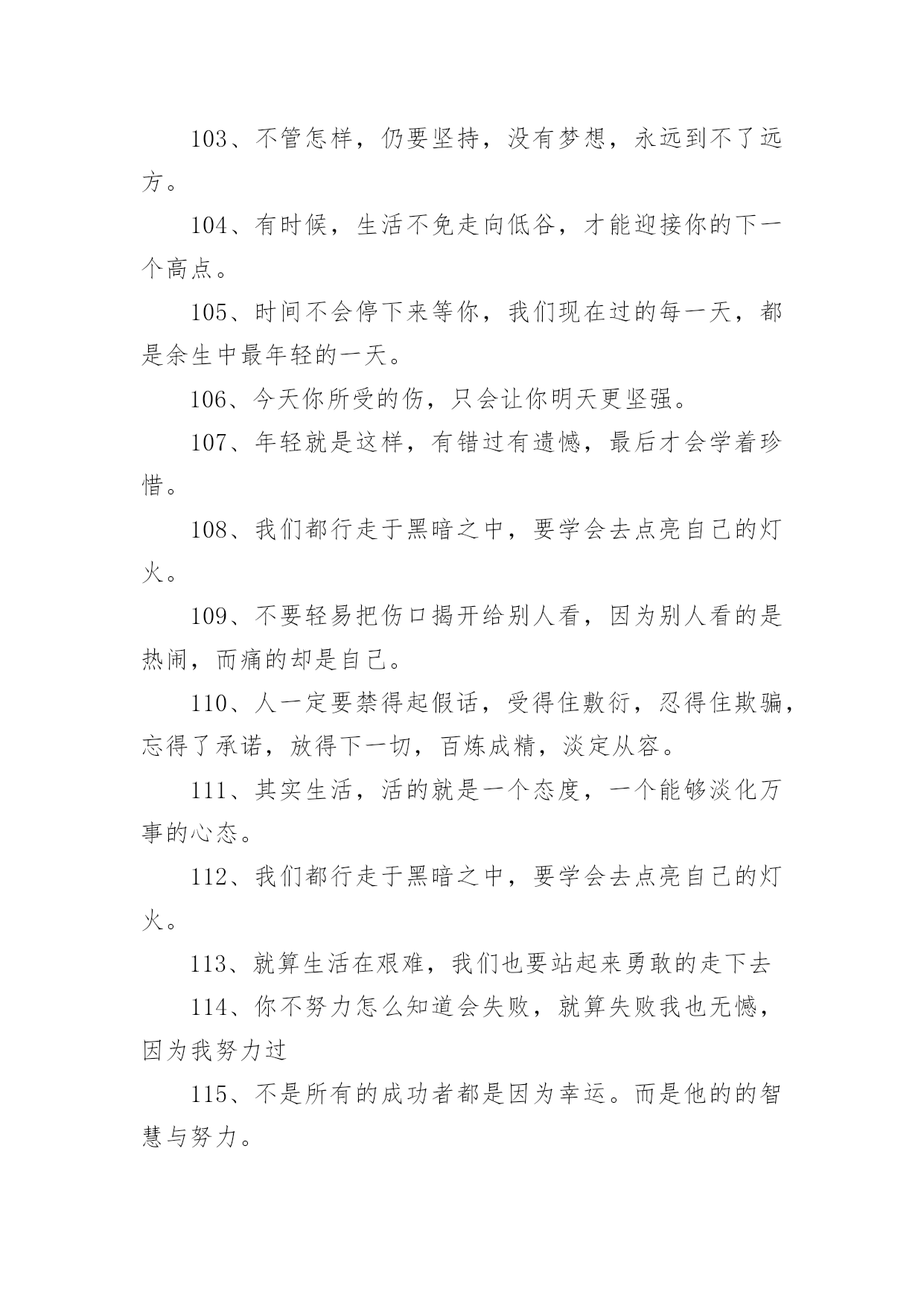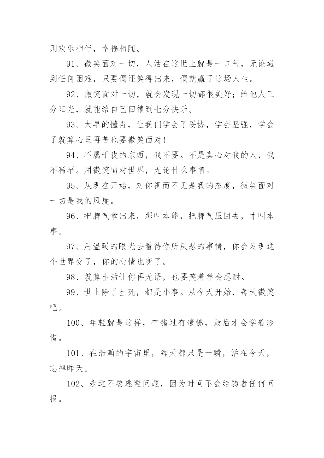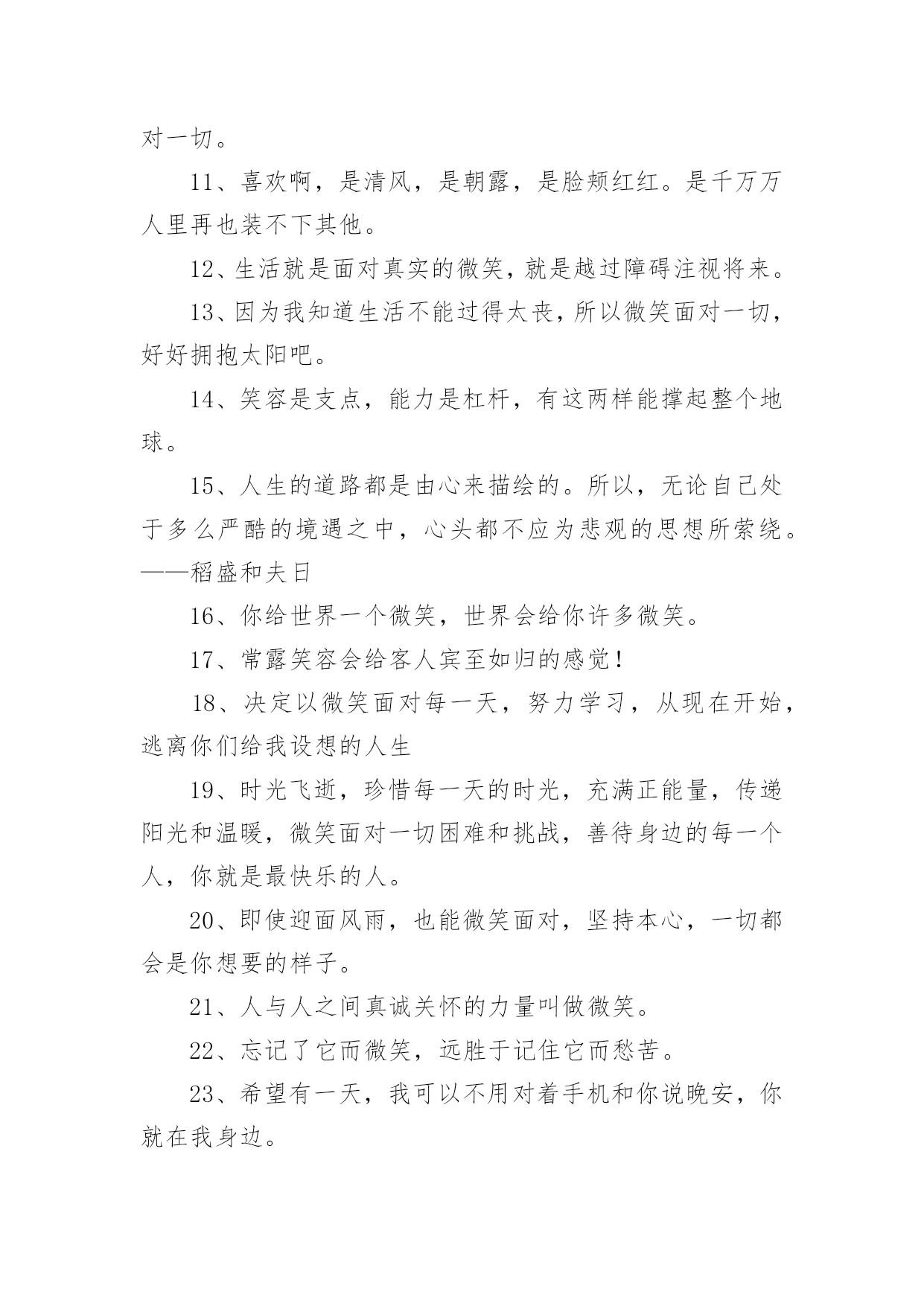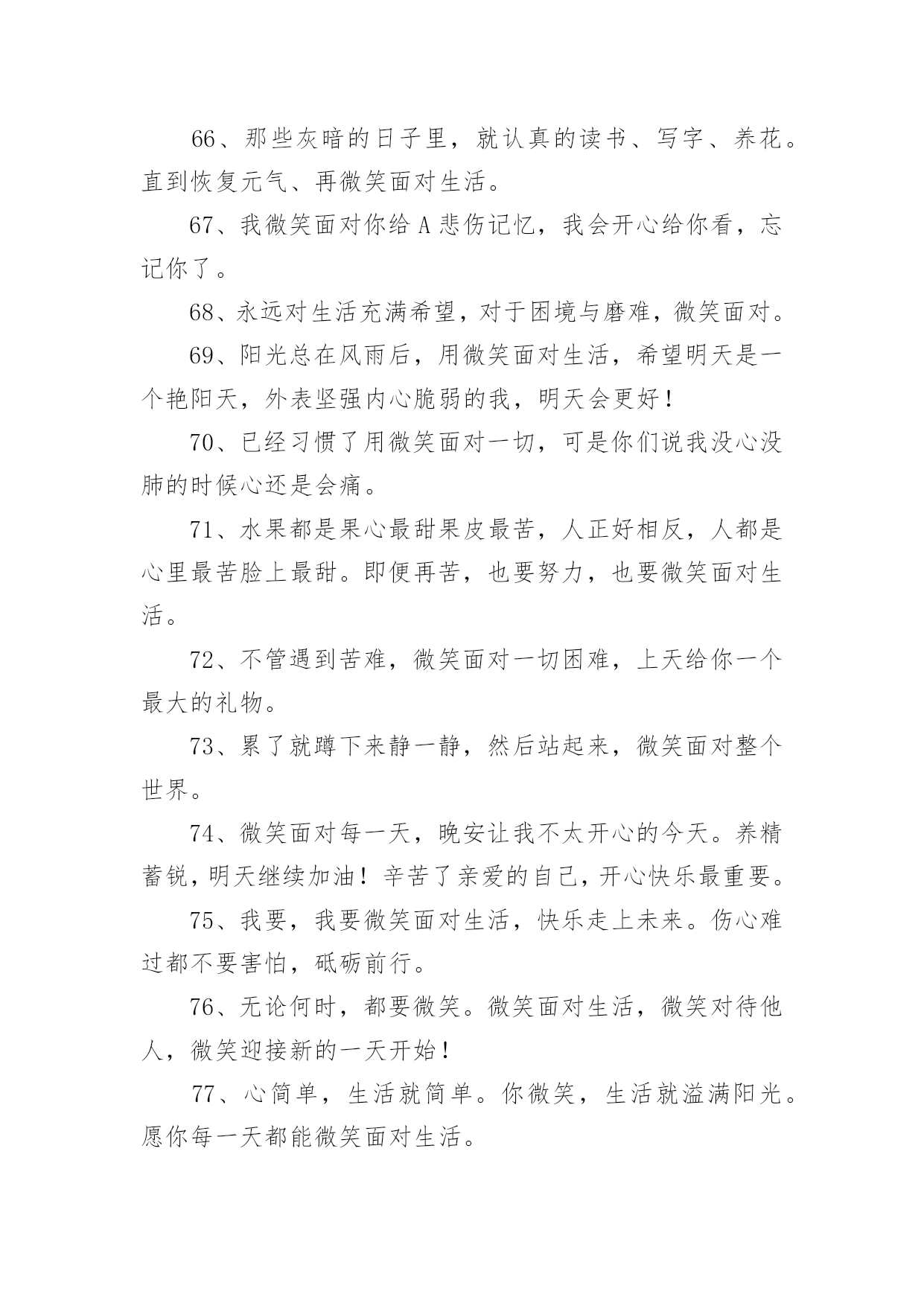 微笑的面对生活的句子微笑的面对生活的句子190句在平日的学习、工作和生活里,大家总免不了要接触或使用句子吧,句子可分为单句和复句,单句又可分为主谓句和非主谓句。究竟什么样的句子才是好的句子呢?以下是小编帮大家整理的微笑的面对生活的句子,仅供参考,大家一起来看看吧。1、微笑面对人生,你的人生就会面微笑对你微笑。2、失败不意味着你会被打倒,失败表明你要微笑面对。3、已经习惯了用微笑面对一切,可是你们说我没心没肺的时候心还是会痛。4、困境中微笑面对,这个微笑不是没有意义的微笑,而是对自己的一种鼓励,一种自信。5、微笑很简单,意义却深远;大家一起笑,世界更温暖。6、人生应该微笑面对生活,带着激情面对工作,带着真情面对家人,带着热情面对挑战。7、无论你喜不喜欢我,我都会在这里,微笑面对一切。8、即使迎面风雨,也能微笑面对,坚持本心,一切都会是你想要的样子。9、生活再苦,凡事再累,都请记得微笑面对一切!你的微笑决定着所有的原动力!10、告诉自己生活不能多艰难都要坚持下去,用微笑面对一切。11、喜欢啊,是清风,是朝露,是脸颊红红。是千万万人里再也装不下其他。12、生活就是面对真实的微笑,就是越过障碍注视将来。13、因为我知道生活不能过得太丧,所以微笑面对一切,好好拥抱太阳吧。14、笑容是支点,能力是杠杆,有这两样能撑起整个地球。15、人生的道路都是由心来描绘的。所以,无论自己处于多么严酷的境遇之中,心头都不应为悲观的思想所萦绕。——稻盛和夫日16、你给世界一个微笑,世界会给你许多微笑。17、常露笑容会给客人宾至如归的感觉!18、决定以微笑面对每一天,努力学习,从现在开始,逃离你们给我设想的人生19、时光飞逝,珍惜每一天的时光,充满正能量,传递阳光和温暖,微笑面对一切困难和挑战,善待身边的每一个人,你就是最快乐的人。20、即使迎面风雨,也能微笑面对,坚持本心,一切都会是你想要的样子。21、人与人之间真诚关怀的力量叫做微笑。22、忘记了它而微笑,远胜于记住它而愁苦。23、希望有一天,我可以不用对着手机和你说晚安,你就在我身边。24、美是力量,微笑是它的剑。25、别让游戏支配你的一切,要让自然拥抱你的生活,用微笑面对一切。26、微笑面对生活,因为生活不是为了别人而活,而是为了自己。27、微笑着面对失败,把每一次的失败都归结为一次尝试,不去自卑;把每一次的成功都想成一种幸运,不去自傲。28、最近非常不顺,好心累,精疲力竭克制自己,微笑面对一切。29、人的一生会经历许多的沧海桑田,经历许多的风吹雨打,但我们继续生活下去,坎坷困难在生活中都是常事,用微笑去面对生活,困难也就迎刃而解了。30、当你微笑时,世界爱了他,当他大笑时,世界便怕了他。——泰戈尔31、做一个开心的人,开心到别人见到你也会觉得开心。32、找不到解决问题的方法,那就找一个让自己笑的理由,世界有60亿人,但你却只有一个。33、一天很短,开心了就笑,不开心了就过会儿再笑。34、将手贴近胸口,听见扑通扑通的心跳。好开心,因为我还活着。35、既然伤心没有用,为什么还要不开心呢?36、输赢并不重要,开心才是真谛。37、越尴尬我越开心,冷眼与嘲笑我不屑。38、只要我还有力气呼吸,就一定会开心的微笑!39、与其痛苦的掩饰,不如做一个真正开心的自己。40、人生需要过好每一天,开心去面对周遭。41、在一起的时候就没开心过,分开之后又有什么好难过?42、即使不开心,也要微笑着,对生活说:我很好。43、可以沉默,可以吵闹,可以流泪。但是,就是不能不开心。44、管什么天气,记得随时带上自己的阳光。不管什么遭遇,记得内心装满开心的童话。45、难过是最无聊的举动,人生何其短,越是难过,越是要做开心的事。46、人生最大的荣耀不在于从不跌倒,而在于每一次跌倒后都能爬起来后,还能微笑面对、走下去。47、失败不意味着你会被打倒,失败表明你要微笑面对。48、微笑面对困难,方能战胜困难。微笑面对风雨,才能拨开云天看彩虹。唯有微笑面对黑夜,才能迎来光明。49、愿我们看淡世间沧桑,内心仍安然无恙,微笑面对生活。50、生活处处和我们开玩笑,我们还是要微笑面对生活。51、努力不为感动谁,只为不与最好的自己失之交臂,无论何时,微笑面对生活,请相信,美好会如期而至。52、降低期待,减少依赖,微笑面对未来的一切不期而遇。53、孤单,使我学会了,一个人默默的哭,即使再伤心,我也要微笑面对。54、微笑面对生活,因为生活不是为了别人而活,而是为了自己。55、微笑面对一切,人活在这世上就是一口气,无论遇到任何困难,只要我还笑得出来,我就赢了这场人生。56、简单是生活的一种高境界,是洗尽铅华后的返璞归真。微笑面对一切!57、每天都要保持正能量满满的,微笑面对生活,从不得过且过,让自己活的精致一些!58、心里再苦也要微笑面对,毕竟心有天地,定然风