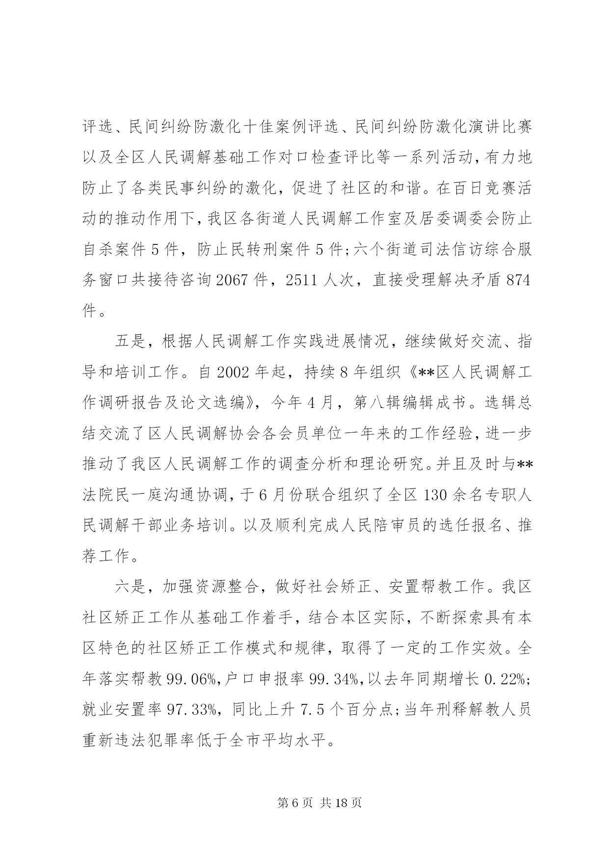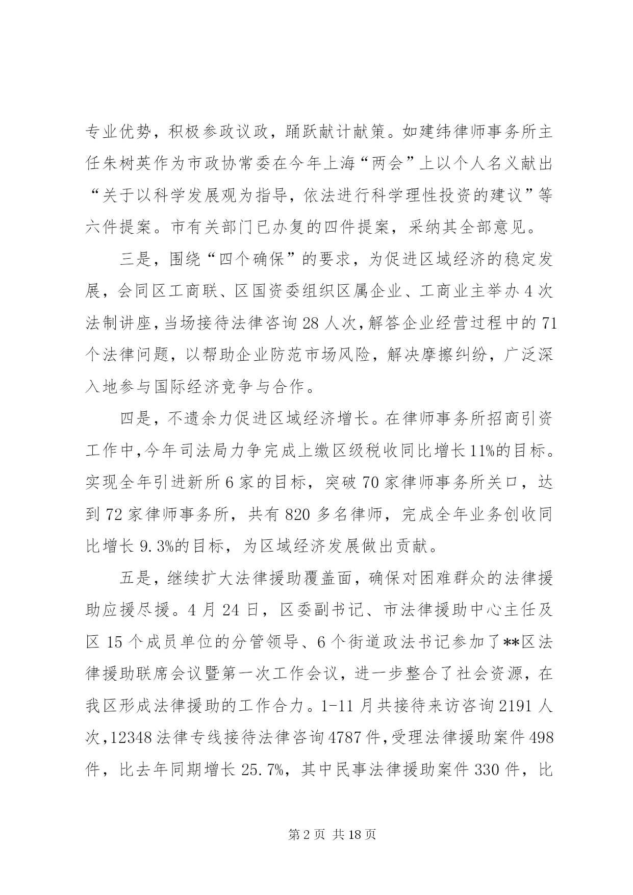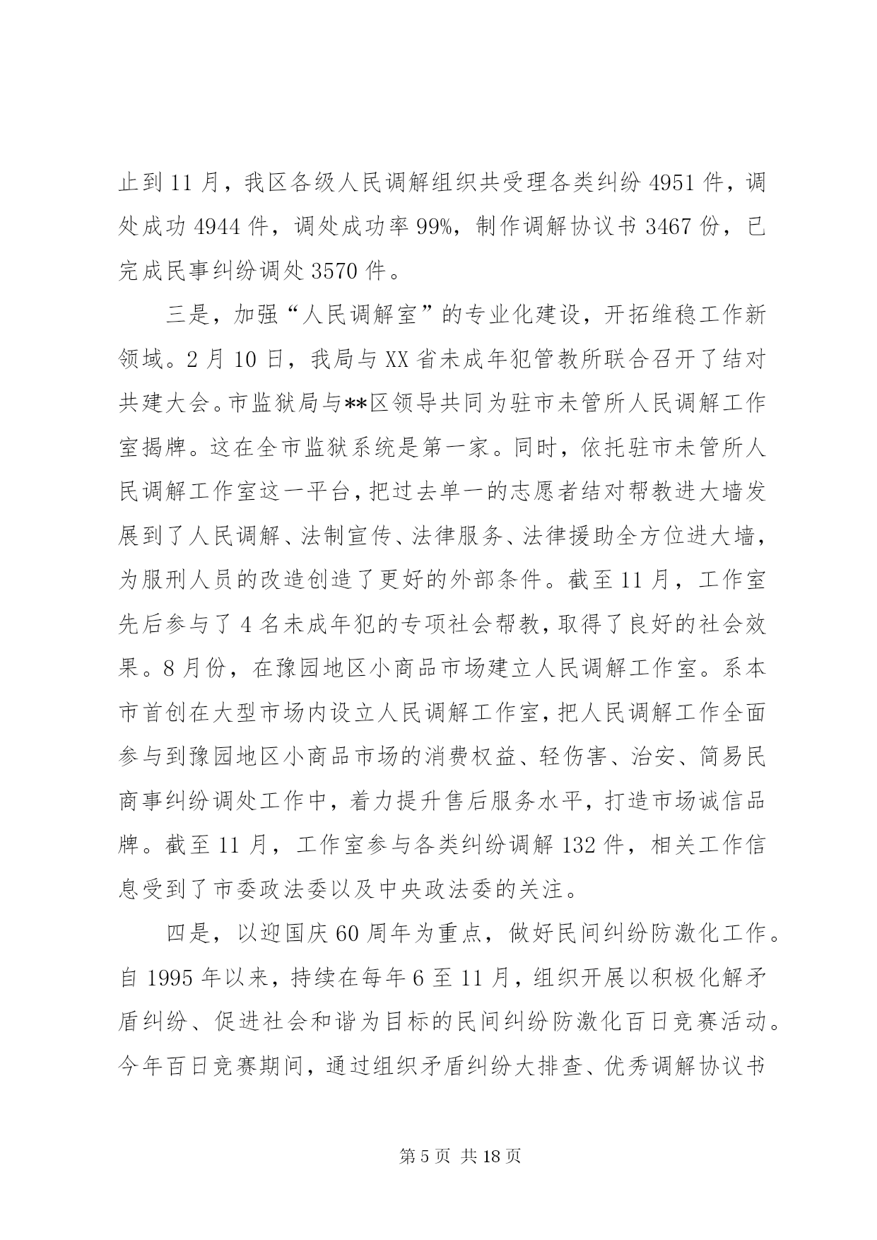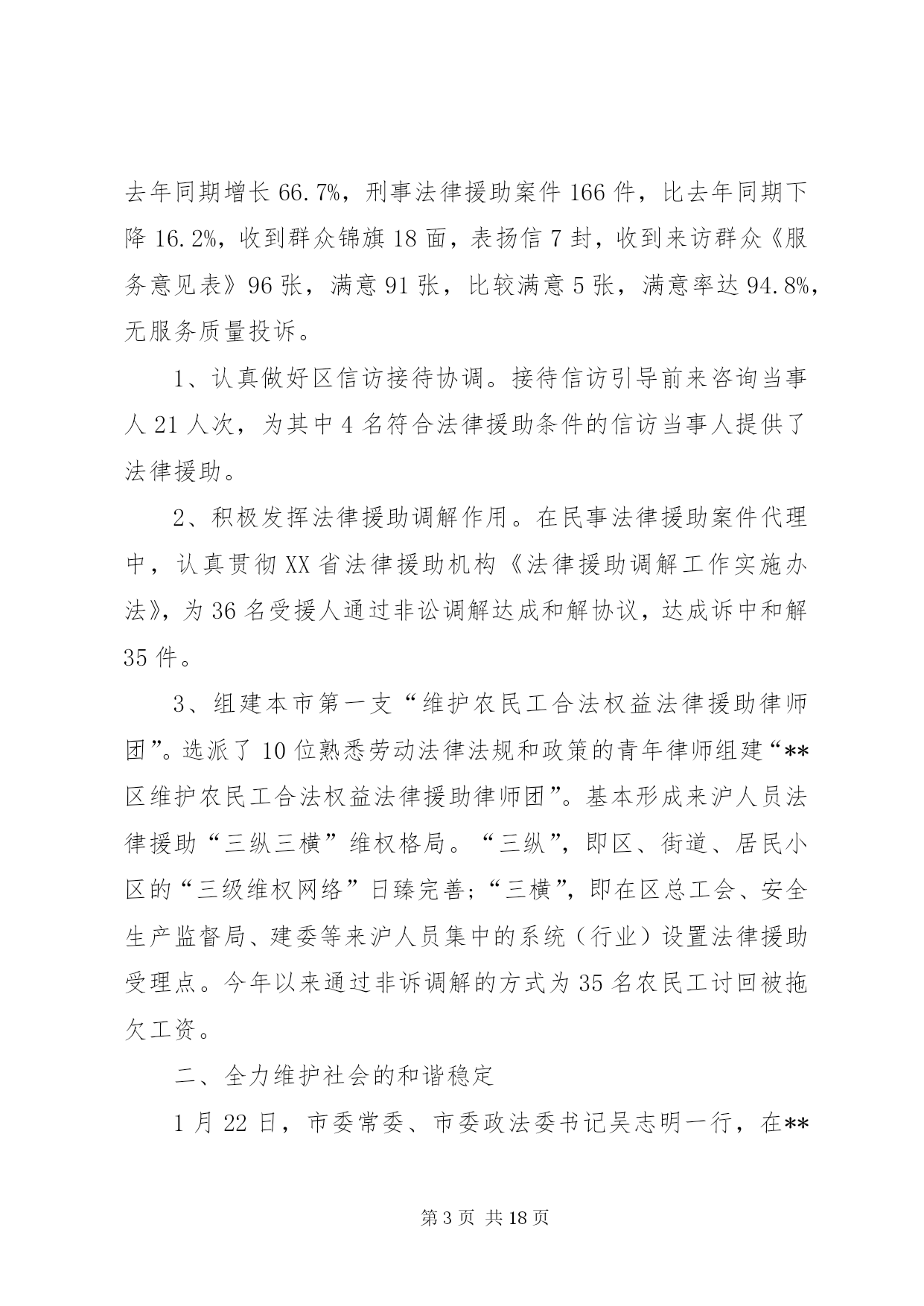第PAGE\*Arabic\*MERGEFORMAT18页共NUMPAGES\*MERGEFORMAT18页司法局办公室创先争优总结在市司法局和区委、区政府的正确领导下,在认真开展创先争优活动的推动下,我们主要做了以下工作:一、努力为保持经济平稳较快发展提供优质高效的法律服务一是,我们注重组织引导法律服务工作者密切关注经济形势发展变化,进一步做好区委、区政府的法律顾问工作,为政府运用法律手段加强和改善宏观调控服务。1、积极参与为世博提供法律服务和法律保障的活动。6月3日,在**区委书记王文涛、区长周伟与上海世博局开展“加强合作,共办世博”共建活动协议中,确定了司法局提供优质法律服务和法律保障的内容。并且根据世博局及项目处要求,由律师参与并完成审核20多个合同项目。2、年初,我局先后制定下发了《关于推进**律师参与世博法律服务的工作意见》、《关于加强**律师为企业提供法律服务的工作意见》、《关于加强律师事务所与各街道“结对”开展律师服务工作的实施意见》等5个文件,突出重点着力扩大法律服务和法律援助,着力提高律师队伍的思想政治素质,着力增强法制宣传教育的效果,更好地为实现经济社会又好又快发展,促进社会和谐稳定,提供良好的法律保障和法律服务。并且安排律师参与区领导信访接待以及个案化解法律咨询37次。二是,鼓励支持法律服务行业中的人大代表、政协委员发挥专业优势,积极参政议政,踊跃献计献策。如建纬律师事务所主任朱树英作为市政协常委在今年上海“两会”上以个人名义献出“关于以科学发展观为指导,依法进行科学理性投资的建议”等六件提案。市有关部门已办复的四件提案,采纳其全部意见。三是,围绕“四个确保”的要求,为促进区域经济的稳定发展,会同区工商联、区国资委组织区属企业、工商业主举办4次法制讲座,当场接待法律咨询28人次,解答企业经营过程中的71个法律问题,以帮助企业防范市场风险,解决摩擦纠纷,广泛深入地参与国际经济竞争与合作。四是,不遗余力促进区域经济增长。在律师事务所招商引资工作中,今年司法局力争完成上缴区级税收同比增长11%的目标。实现全年引进新所6家的目标,突破70家律师事务所关口,达到72家律师事务所,共有820多名律师,完成全年业务创收同比增长9.3%的目标,为区域经济发展做出贡献。五是,继续扩大法律援助覆盖面,确保对困难群众的法律援助应援尽援。4月24日,区委副书记、市法律援助中心主任及区15个成员单位的分管领导、6个街道政法书记参加了**区法律援助联席会议暨第一次工作会议,进一步整合了社会资源,在我区形成法律援助的工作合力。1-11月共接待来访咨询2191人次,12348法律专线接待法律咨询4787件,受理法律援助案件498件,比去年同期增长25.7%,其中民事法律援助案件330件,比去年同期增长66.7%,刑事法律援助案件166件,比去年同期下降16.2%,收到群众锦旗18面,表扬信7封,收到来访群众《服务意见表》96张,满意91张,比较满意5张,满意率达94.8%,无服务质量投诉。1、认真做好区信访接待协调。接待信访引导前来咨询当事人21人次,为其中4名符合法律援助条件的信访当事人提供了法律援助。2、积极发挥法律援助调解作用。在民事法律援助案件代理中,认真贯彻XX省法律援助机构《法律援助调解工作实施办法》,为36名受援人通过非讼调解达成和解协议,达成诉中和解35件。3、组建本市第一支“维护农民工合法权益法律援助律师团”。选派了10位熟悉劳动法律法规和政策的青年律师组建“**区维护农民工合法权益法律援助律师团”。基本形成来沪人员法律援助“三纵三横”维权格局。“三纵”,即区、街道、居民小区的“三级维权网络”日臻完善;“三横”,即在区总工会、安全生产监督局、建委等来沪人员集中的系统(行业)设置法律援助受理点。今年以来通过非诉调解的方式为35名农民工讨回被拖欠工资。二、全力维护社会的和谐稳定1月22日,市委常委、市委政法委书记吴志明一行,在**区委书记王文涛,区委副书记、政法委书记蔡志荣等陪同下,先后走访了法院人民调解工作室、小东门司法所及人民调解工作室,详细询问了我区的司法所规范化建设和人民调解工作情况,表达了对基层司法行政和人民调解工作的高度关注,激发了人民调解干部维护社会稳定工作的积极性。在市、区领导的关心下,我区的人民调解工作不断拓展深化,创建出了具有**特色的工作品牌。一是,着力加强司法行政基层基础建设,构建以司法所为平台的基层大调解格局。坚持以化解生活矛盾为主线,深入动迁、劳动争议、房地物业、交通事故、妇女权益保护、医患关系、消费者权益保护、治安及轻伤害案件等多个领域,初步形成人民调解与行政调解相结合、与司法审理相衔接的人民调解大格局。在“6+1”调解领域中(即6个专业人民调解工作室和1个专业人民