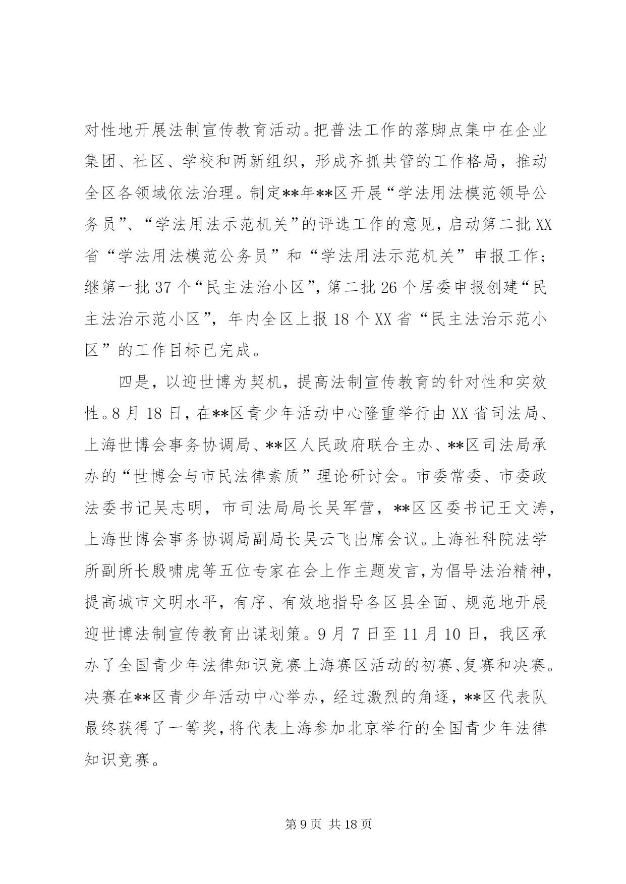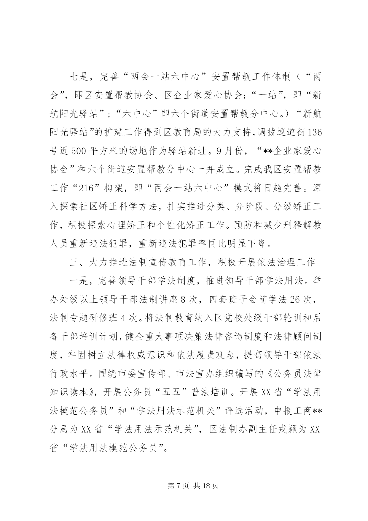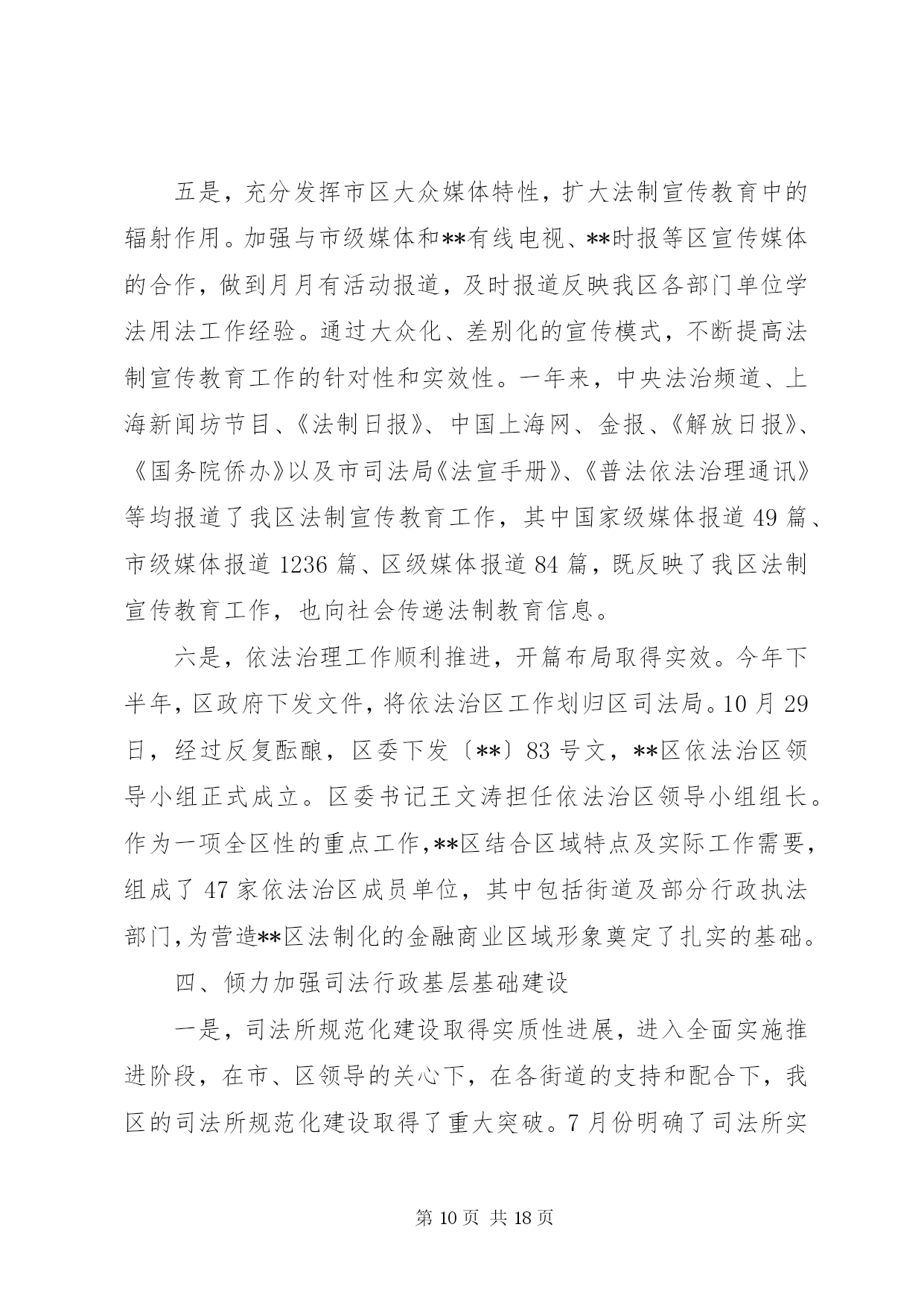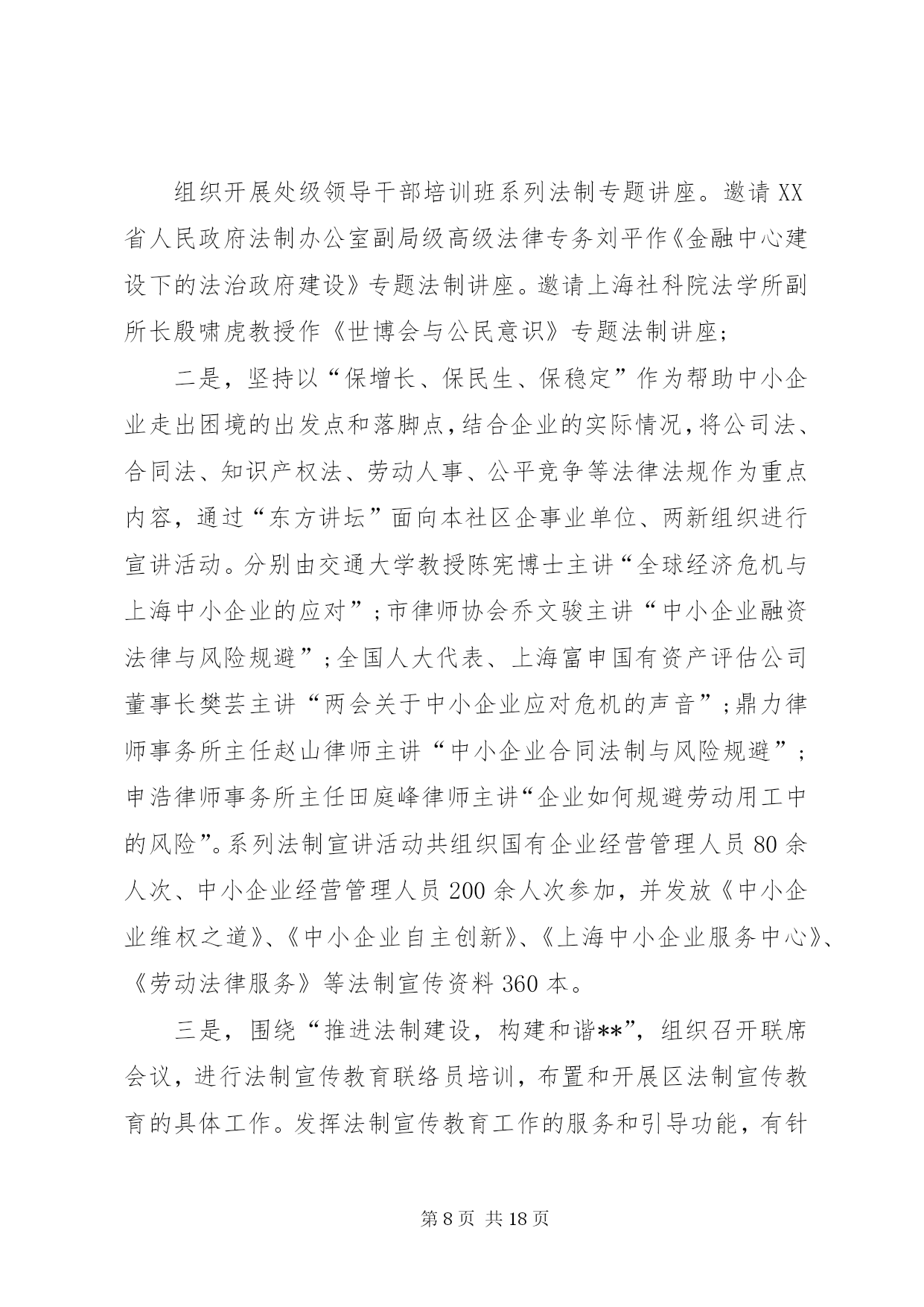 第PAGE\*Arabic\*MERGEFORMAT18页共NUMPAGES\*MERGEFORMAT18页司法局办公室创先争优总结在市司法局和区委、区政府的正确领导下,在认真开展创先争优活动的推动下,我们主要做了以下工作:一、努力为保持经济平稳较快发展提供优质高效的法律服务一是,我们注重组织引导法律服务工作者密切关注经济形势发展变化,进一步做好区委、区政府的法律顾问工作,为政府运用法律手段加强和改善宏观调控服务。1、积极参与为世博提供法律服务和法律保障的活动。6月3日,在**区委书记王文涛、区长周伟与上海世博局开展“加强合作,共办世博”共建活动协议中,确定了司法局提供优质法律服务和法律保障的内容。并且根据世博局及项目处要求,由律师参与并完成审核20多个合同项目。2、年初,我局先后制定下发了《关于推进**律师参与世博法律服务的工作意见》、《关于加强**律师为企业提供法律服务的工作意见》、《关于加强律师事务所与各街道“结对”开展律师服务工作的实施意见》等5个文件,突出重点着力扩大法律服务和法律援助,着力提高律师队伍的思想政治素质,着力增强法制宣传教育的效果,更好地为实现经济社会又好又快发展,促进社会和谐稳定,提供良好的法律保障和法律服务。并且安排律师参与区领导信访接待以及个案化解法律咨询37次。二是,鼓励支持法律服务行业中的人大代表、政协委员发挥专业优势,积极参政议政,踊跃献计献策。如建纬律师事务所主任朱树英作为市政协常委在今年上海“两会”上以个人名义献出“关于以科学发展观为指导,依法进行科学理性投资的建议”等六件提案。市有关部门已办复的四件提案,采纳其全部意见。三是,围绕“四个确保”的要求,为促进区域经济的稳定发展,会同区工商联、区国资委组织区属企业、工商业主举办4次法制讲座,当场接待法律咨询28人次,解答企业经营过程中的71个法律问题,以帮助企业防范市场风险,解决摩擦纠纷,广泛深入地参与国际经济竞争与合作。四是,不遗余力促进区域经济增长。在律师事务所招商引资工作中,今年司法局力争完成上缴区级税收同比增长11%的目标。实现全年引进新所6家的目标,突破70家律师事务所关口,达到72家律师事务所,共有820多名律师,完成全年业务创收同比增长9.3%的目标,为区域经济发展做出贡献。五是,继续扩大法律援助覆盖面,确保对困难群众的法律援助应援尽援。4月24日,区委副书记、市法律援助中心主任及区15个成员单位的分管领导、6个街道政法书记参加了**区法律援助联席会议暨第一次工作会议,进一步整合了社会资源,在我区形成法律援助的工作合力。1-11月共接待来访咨询2191人次,12348法律专线接待法律咨询4787件,受理法律援助案件498件,比去年同期增长25.7%,其中民事法律援助案件330件,比去年同期增长66.7%,刑事法律援助案件166件,比去年同期下降16.2%,收到群众锦旗18面,表扬信7封,收到来访群众《服务意见表》96张,满意91张,比较满意5张,满意率达94.8%,无服务质量投诉。1、认真做好区信访接待协调。接待信访引导前来咨询当事人21人次,为其中4名符合法律援助条件的信访当事人提供了法律援助。2、积极发挥法律援助调解作用。在民事法律援助案件代理中,认真贯彻XX省法律援助机构《法律援助调解工作实施办法》,为36名受援人通过非讼调解达成和解协议,达成诉中和解35件。3、组建本市第一支“维护农民工合法权益法律援助律师团”。选派了10位熟悉劳动法律法规和政策的青年律师组建“**区维护农民工合法权益法律援助律师团”。基本形成来沪人员法律援助“三纵三横”维权格局。“三纵”,即区、街道、居民小区的“三级维权网络”日臻完善;“三横”,即在区总工会、安全生产监督局、建委等来沪人员集中的系统(行业)设置法律援助受理点。今年以来通过非诉调解的方式为35名农民工讨回被拖欠工资。二、全力维护社会的和谐稳定1月22日,市委常委、市委政法委书记吴志明一行,在**区委书记王文涛,区委副书记、政法委书记蔡志荣等陪同下,先后走访了法院人民调解工作室、小东门司法所及人民调解工作室,详细询问了我区的司法所规范化建设和人民调解工作情况,表达了对基层司法行政和人民调解工作的高度关注,激发了人民调解干部维护社会稳定工作的积极性。在市、区领导的关心下,我区的人民调解工作不断拓展深化,创建出了具有**特色的工作品牌。一是,着力加强司法行政基层基础建设,构建以司法所为平台的基层大调解格局。坚持以化解生活矛盾为主线,深入动迁、劳动争议、房地物业、交通事故、妇女权益保护、医患关系、消费者权益保护、治安及轻伤害案件等多个领域,初步形成人民调解与行政调解相结合、与司法审理相衔接的人民调解大格局。在“6+1”调解领域中(即6个专业人民调解工作室和1个专业人民