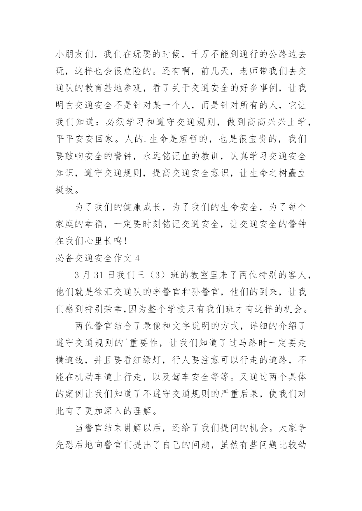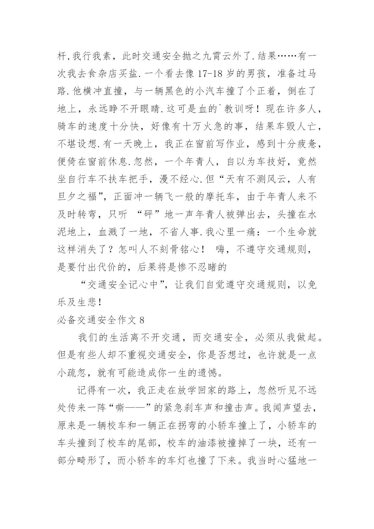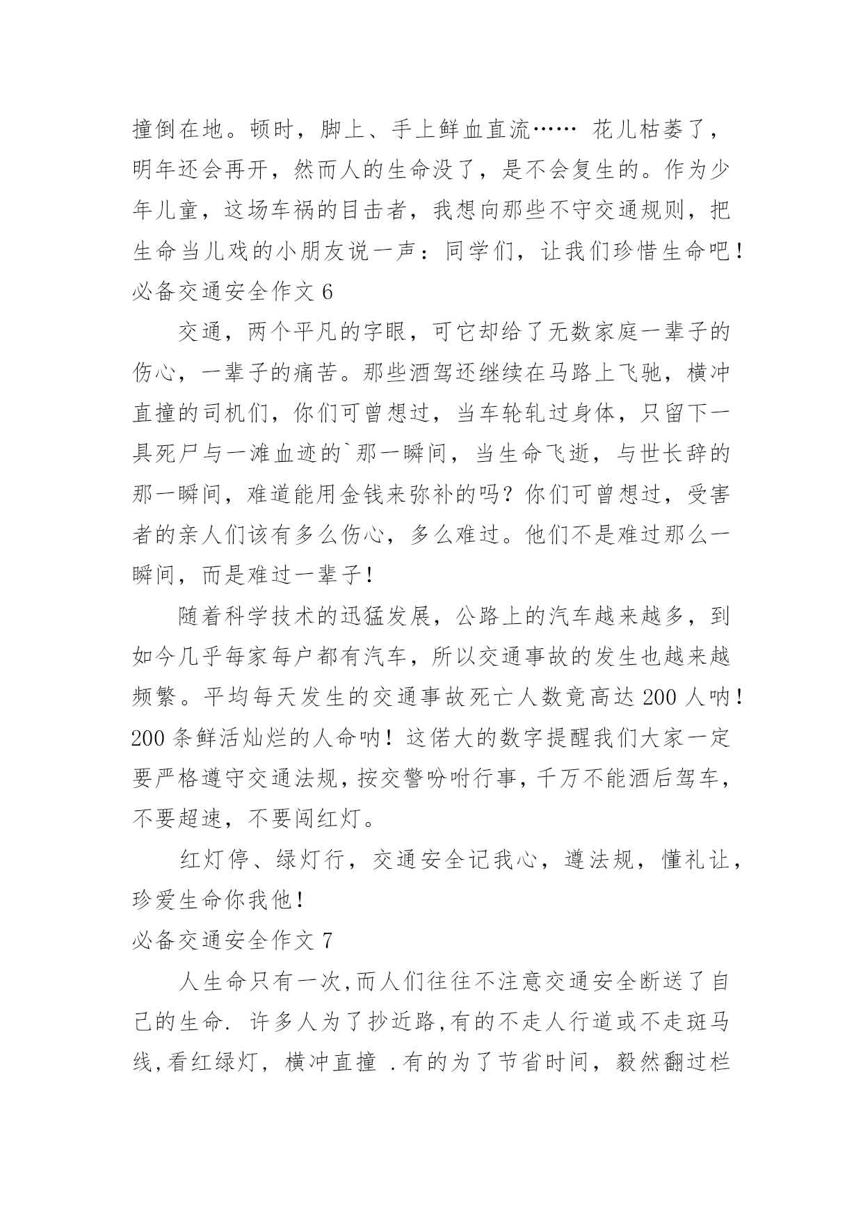 交通安全作文必备交通安全作文无论在学习、工作或是生活中,大家都有写作文的经历,对作文很是熟悉吧,作文是一种言语活动,具有高度的综合性和创造性。作文的注意事项有许多,你确定会写吗?下面是小编整理的必备交通安全作文,希望能够帮助到大家。必备交通安全作文1现在,人们越来越富有,买车的人也越来越多。车多了,自然也就难停了。现在我们小区的车也非常多,有些家庭已经有两辆以上的车了。到了晚上经常没地方停,只能停在房子与房子之间、花坛旁、人行道上或是消防通道里。我觉得这样非常不安全,万一失了火,那消防车不就进不来了吗?这可就麻烦了,而造成不必要的损失。我想是否可以像其他国家一样,比如英国,白天是个普通的行车道,而到了晚上规定时间内路上一下子停满了各式家用车辆,只留路边靠建筑物一侧的道路供车辆单道通行。又如日本,只有个人或单位在买车时能够出具拥有固定车位的.证明,才可以买到车。通过控制买车来缓减停车难的问题。小区车多了,只有开车的人和行人都遵守交通规则,相互体谅,才能让我们的小区变得更安全。必备交通安全作文2交通活动是我们生活中必不可少的一部分,我们每天都要出门,去上学、上班、买菜当我们走在马路上,交通安全是很重要的。尤其是我们小学生,更要注意、遵守交通规则,因为我们的前途还很远大,必须要有一条宝贵的生命。虽然交通,在目前已经十分发达。但每年都有不少中小学生因为交通事故而失去了宝贵的生命。统计数据表示,每年的`中小学生交通伤害发生率达48%。这意味着,在一年的时间里,每两个中小学生中,就有一人遭遇过意外伤害。中小学生伤害事故发生在学校里的占39%,发生在上下学路上的占32%。也就是说,71%的学生伤害事故,与上学有关。截至20xx年9月11日,20xx年全国共发生中小学生安全事故、事件110起,共造成学生死亡188人,受伤1266人。其中交通事故死亡占死亡人数的43.59%,居第一位。看,这是多么触目惊心的数字啊!真是一失足成千古恨!必备交通安全作文3“过马路要走斑马线,并且要往两边看;红灯停,绿灯行,黄灯亮了等一等”。这些最起码的交通安全知识,爸爸妈妈经常教育我们,目的就是让我们从小就懂得交通安全。我们现在是三年级小学生,年龄不大也不小,也要开始自立自强了;生活中处处离不开交通,同时也离不开安全,在出门前,爸爸妈妈的千叮咛万嘱咐,我们一定要记牢。在交通日益发达的今天,交通事故给人们带来的伤害也是不该承受的痛苦,这都是曾经因为忽略交通安全而尝尽的苦头。小朋友们,我们在玩耍的时候,千万不能到通行的公路边去玩,这样也会很危险的。还有啊,前几天,老师带我们去交通队的教育基地参观,看了关于交通安全的好多事例,让我明白交通安全不是针对某一个人,而是针对所有的人,它让我们知道:必须学习和遵守交通规则,做到高高兴兴上学,平平安安回家。人的.生命是短暂的,也是很宝贵的,我们要敲响安全的警钟,永远铭记血的教训,认真学习交通安全知识,遵守交通规则,提高交通安全意识,让生命之树矗立挺拔。为了我们的健康成长,为了我们的生命安全,为了每个家庭的幸福,一定要时刻铭记交通安全,让交通安全的警钟在我们心里长鸣!必备交通安全作文43月31日我们三(3)班的教室里来了两位特别的客人,他们就是徐汇交通队的李警官和孙警官,他们的到来,让我们感到特别荣幸,因为整个学校只有我们班才有这样的机会。两位警官结合了录像和文字说明的方式,详细的介绍了遵守交通规则的'重要性,让我们知道了过马路时一定要走横道线,并且要看红绿灯,行人要注意可以行走的道路,不能在机动车道上行走,以及驾车安全等等。又通过两个具体的案例让我们知道了不遵守交通规则的严重后果,使我们对此有了更加深入的理解。当警官结束讲解以后,还给了我们提问的机会。大家争先恐后地向警官们提出了自己的问题,虽然有些问题比较幼稚,但是警官们也非常耐心地回答了我们。还有一些生活中经常遇到的情况,对大家来说也非常有用。最后我们全班同学还和警官们合了影,留下了这难忘的瞬间。警官们生动的讲解让教室里笑声不断,既让我们在不知不觉中学到了交通安全的知识,又懂得了交通安全的重要性,真是一举两得。以后,我不但自己会遵守交通规则,也会提醒身边的人,只要大家都尽自己的一份力,就能使我们的城市更安全、更和谐。必备交通安全作文5遵守交通规则是每个公民的职责。谈到交通安全,我们首先会想到每天站在路中维护交通安全的警察叔叔,不管是炎炎夏日,还是刺骨的寒冬,他们都会驻守在自己的岗位上来保障道路的畅通和行人的安全。他们日复一日,年复一年,默默无闻,吃了多少苦,流多少汗……我们无法想象。为了不让交警叔叔的工作付之东流,我们应该从我做起。下面就谈谈发生在我身边的一件令我难忘的事吧!那天是星期六,我准备到学校找朋友玩。看见有两位男生骑着自行车,打我身边经过。一位高个儿男生说:“我会