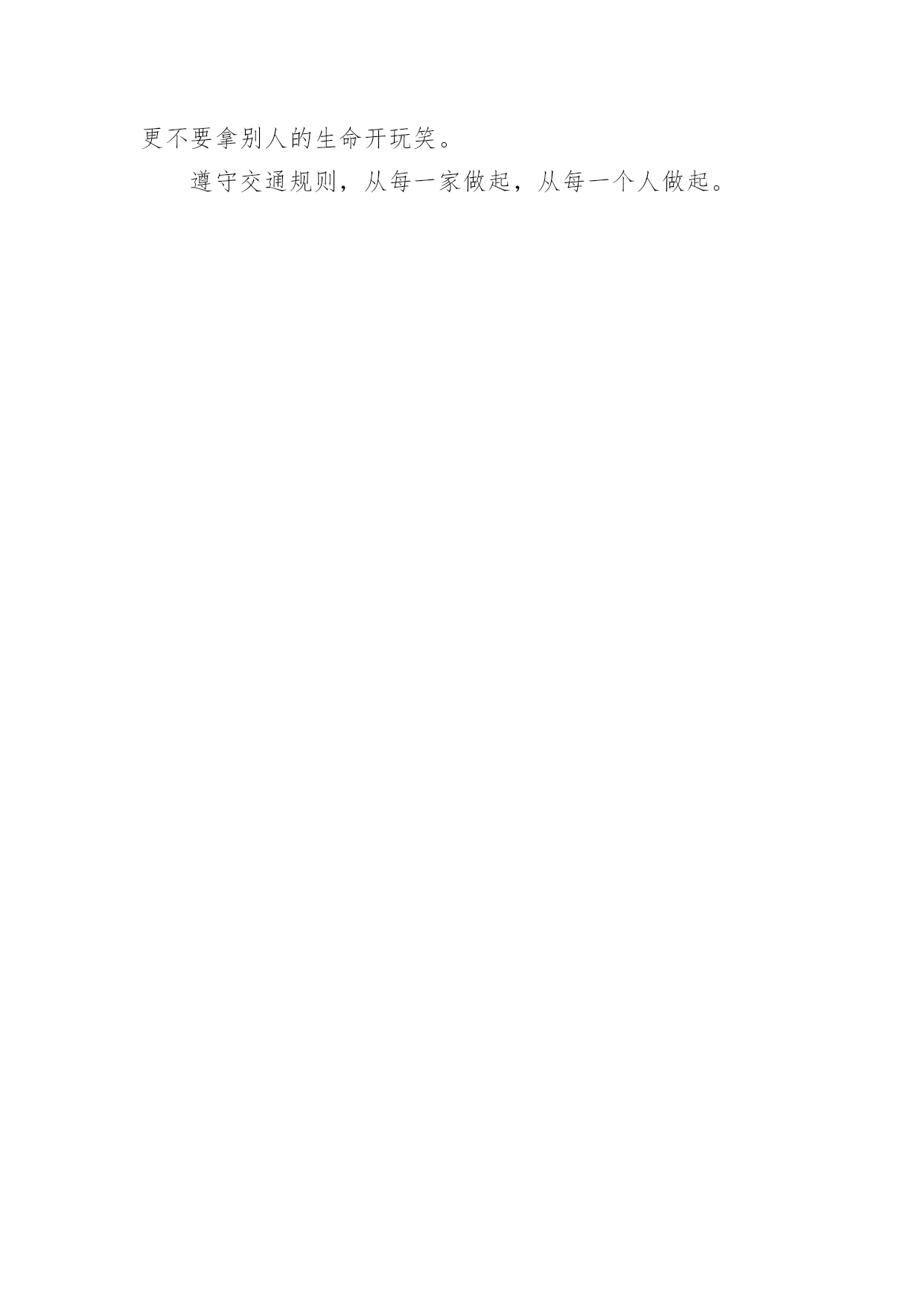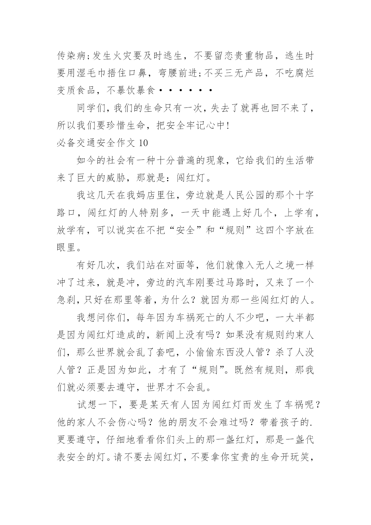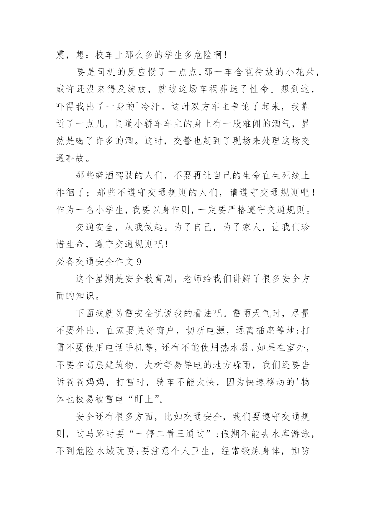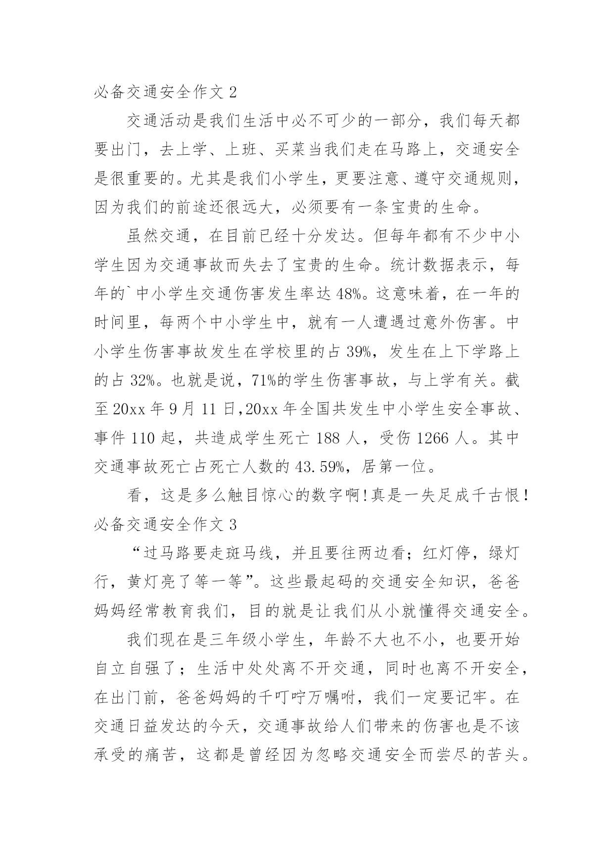 交通安全作文必备交通安全作文无论在学习、工作或是生活中,大家都有写作文的经历,对作文很是熟悉吧,作文是一种言语活动,具有高度的综合性和创造性。作文的注意事项有许多,你确定会写吗?下面是小编整理的必备交通安全作文,希望能够帮助到大家。必备交通安全作文1现在,人们越来越富有,买车的人也越来越多。车多了,自然也就难停了。现在我们小区的车也非常多,有些家庭已经有两辆以上的车了。到了晚上经常没地方停,只能停在房子与房子之间、花坛旁、人行道上或是消防通道里。我觉得这样非常不安全,万一失了火,那消防车不就进不来了吗?这可就麻烦了,而造成不必要的损失。我想是否可以像其他国家一样,比如英国,白天是个普通的行车道,而到了晚上规定时间内路上一下子停满了各式家用车辆,只留路边靠建筑物一侧的道路供车辆单道通行。又如日本,只有个人或单位在买车时能够出具拥有固定车位的.证明,才可以买到车。通过控制买车来缓减停车难的问题。小区车多了,只有开车的人和行人都遵守交通规则,相互体谅,才能让我们的小区变得更安全。必备交通安全作文2交通活动是我们生活中必不可少的一部分,我们每天都要出门,去上学、上班、买菜当我们走在马路上,交通安全是很重要的。尤其是我们小学生,更要注意、遵守交通规则,因为我们的前途还很远大,必须要有一条宝贵的生命。虽然交通,在目前已经十分发达。但每年都有不少中小学生因为交通事故而失去了宝贵的生命。统计数据表示,每年的`中小学生交通伤害发生率达48%。这意味着,在一年的时间里,每两个中小学生中,就有一人遭遇过意外伤害。中小学生伤害事故发生在学校里的占39%,发生在上下学路上的占32%。也就是说,71%的学生伤害事故,与上学有关。截至20xx年9月11日,20xx年全国共发生中小学生安全事故、事件110起,共造成学生死亡188人,受伤1266人。其中交通事故死亡占死亡人数的43.59%,居第一位。看,这是多么触目惊心的数字啊!真是一失足成千古恨!必备交通安全作文3“过马路要走斑马线,并且要往两边看;红灯停,绿灯行,黄灯亮了等一等”。这些最起码的交通安全知识,爸爸妈妈经常教育我们,目的就是让我们从小就懂得交通安全。我们现在是三年级小学生,年龄不大也不小,也要开始自立自强了;生活中处处离不开交通,同时也离不开安全,在出门前,爸爸妈妈的千叮咛万嘱咐,我们一定要记牢。在交通日益发达的今天,交通事故给人们带来的伤害也是不该承受的痛苦,这都是曾经因为忽略交通安全而尝尽的苦头。小朋友们,我们在玩耍的时候,千万不能到通行的公路边去玩,这样也会很危险的。还有啊,前几天,老师带我们去交通队的教育基地参观,看了关于交通安全的好多事例,让我明白交通安全不是针对某一个人,而是针对所有的人,它让我们知道:必须学习和遵守交通规则,做到高高兴兴上学,平平安安回家。人的.生命是短暂的,也是很宝贵的,我们要敲响安全的警钟,永远铭记血的教训,认真学习交通安全知识,遵守交通规则,提高交通安全意识,让生命之树矗立挺拔。为了我们的健康成长,为了我们的生命安全,为了每个家庭的幸福,一定要时刻铭记交通安全,让交通安全的警钟在我们心里长鸣!必备交通安全作文43月31日我们三(3)班的教室里来了两位特别的客人,他们就是徐汇交通队的李警官和孙警官,他们的到来,让我们感到特别荣幸,因为整个学校只有我们班才有这样的机会。两位警官结合了录像和文字说明的方式,详细的介绍了遵守交通规则的'重要性,让我们知道了过马路时一定要走横道线,并且要看红绿灯,行人要注意可以行走的道路,不能在机动车道上行走,以及驾车安全等等。又通过两个具体的案例让我们知道了不遵守交通规则的严重后果,使我们对此有了更加深入的理解。当警官结束讲解以后,还给了我们提问的机会。大家争先恐后地向警官们提出了自己的问题,虽然有些问题比较幼稚,但是警官们也非常耐心地回答了我们。还有一些生活中经常遇到的情况,对大家来说也非常有用。最后我们全班同学还和警官们合了影,留下了这难忘的瞬间。警官们生动的讲解让教室里笑声不断,既让我们在不知不觉中学到了交通安全的知识,又懂得了交通安全的重要性,真是一举两得。以后,我不但自己会遵守交通规则,也会提醒身边的人,只要大家都尽自己的一份力,就能使我们的城市更安全、更和谐。必备交通安全作文5遵守交通规则是每个公民的职责。谈到交通安全,我们首先会想到每天站在路中维护交通安全的警察叔叔,不管是炎炎夏日,还是刺骨的寒冬,他们都会驻守在自己的岗位上来保障道路的畅通和行人的安全。他们日复一日,年复一年,默默无闻,吃了多少苦,流多少汗……我们无法想象。为了不让交警叔叔的工作付之东流,我们应该从我做起。下面就谈谈发生在我身边的一件令我难忘的事吧!那天是星期六,我准备到学校找朋友玩。看见有两位男生骑着自行车,打我身边经过。一位高个儿男生说:“我会