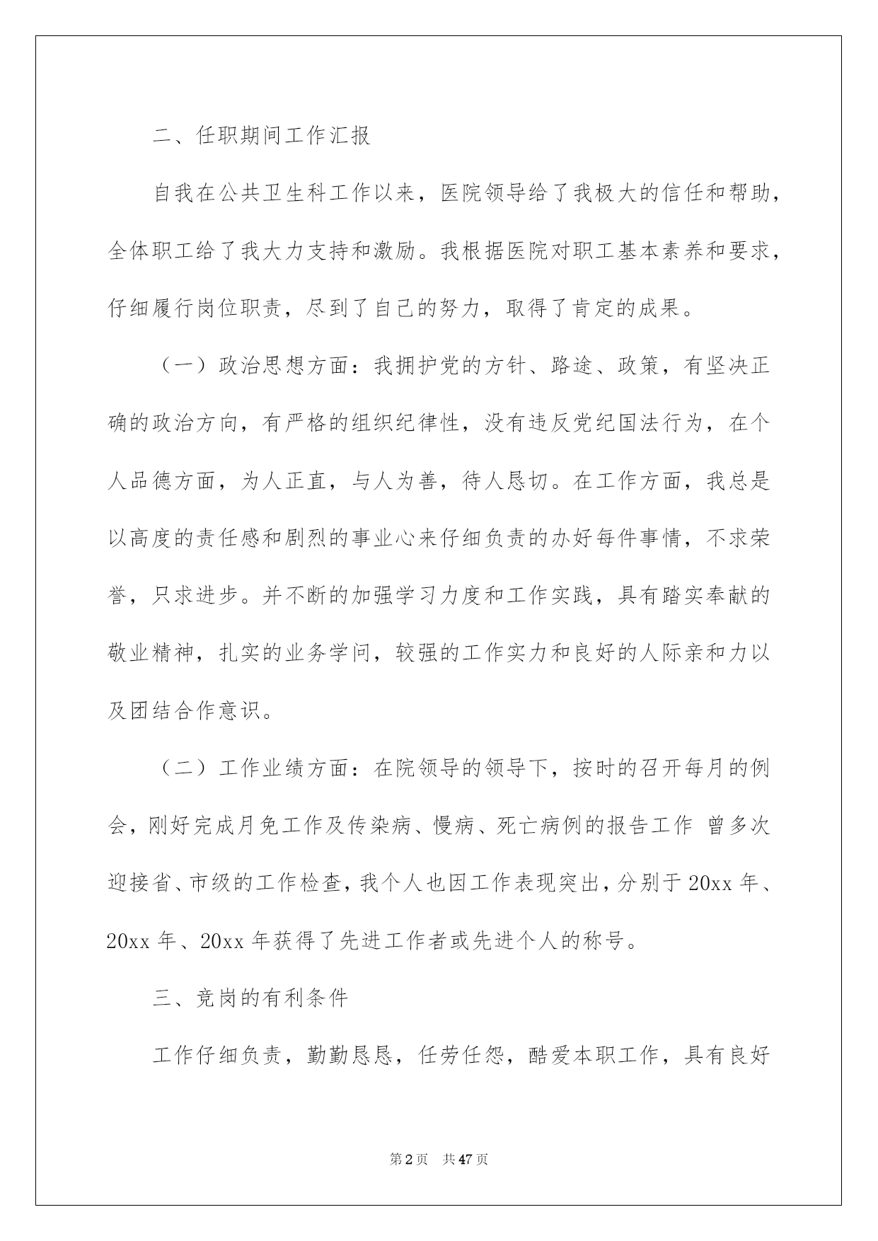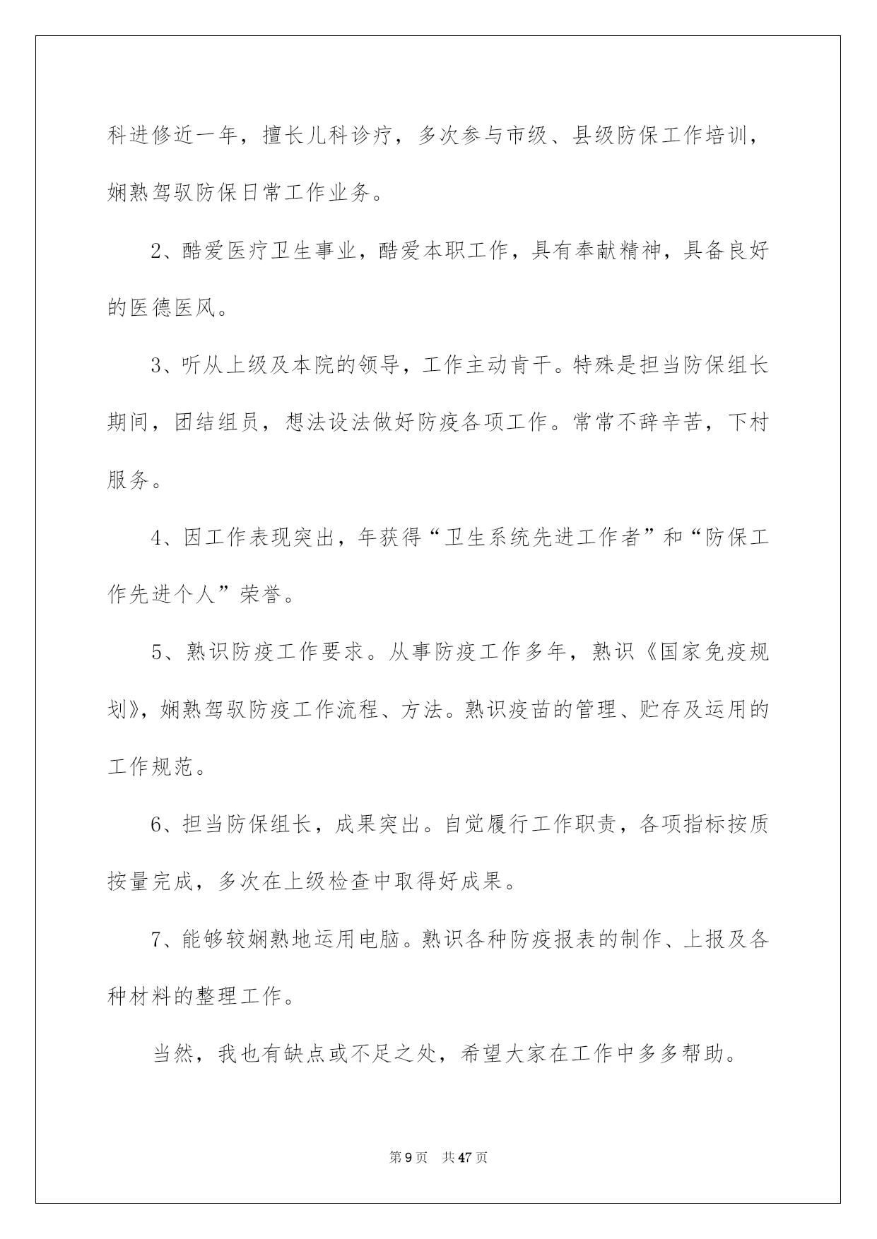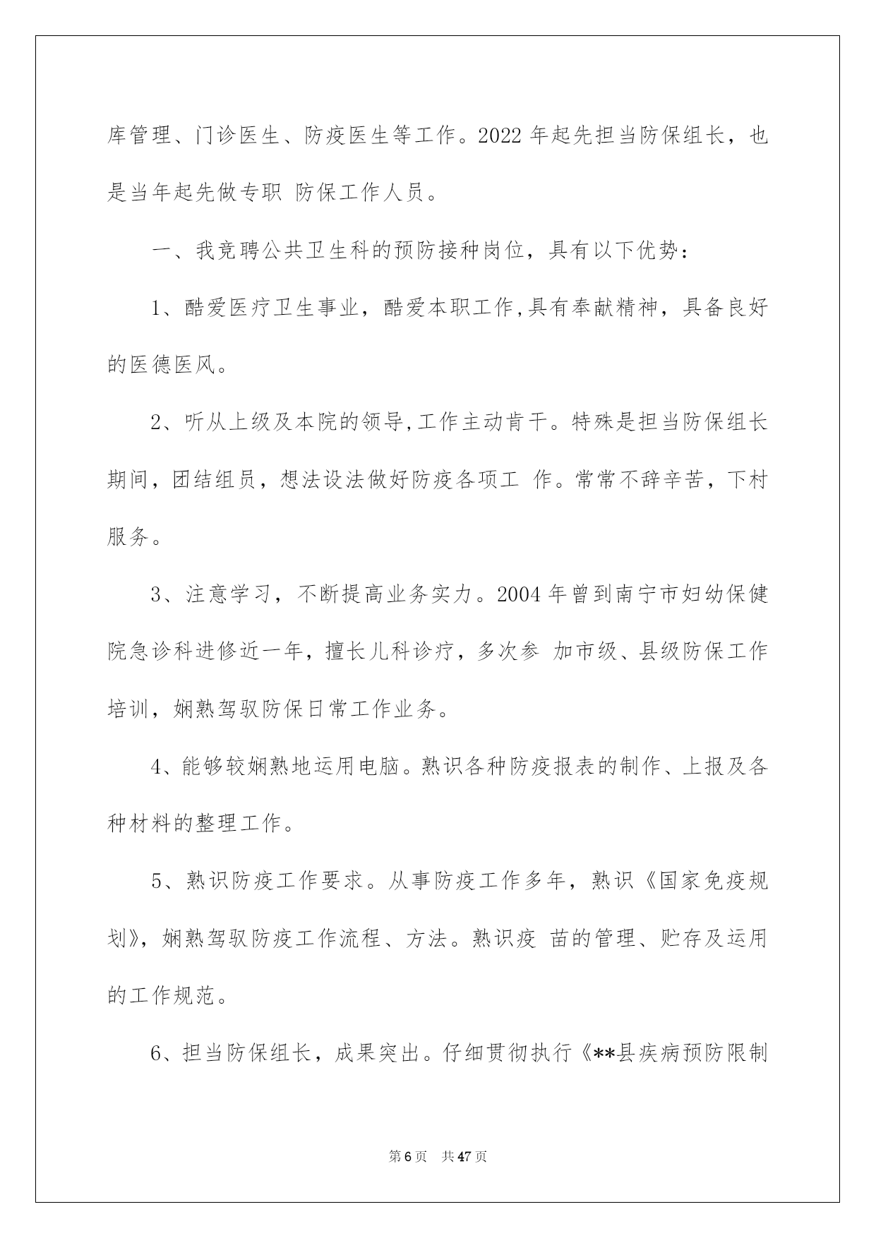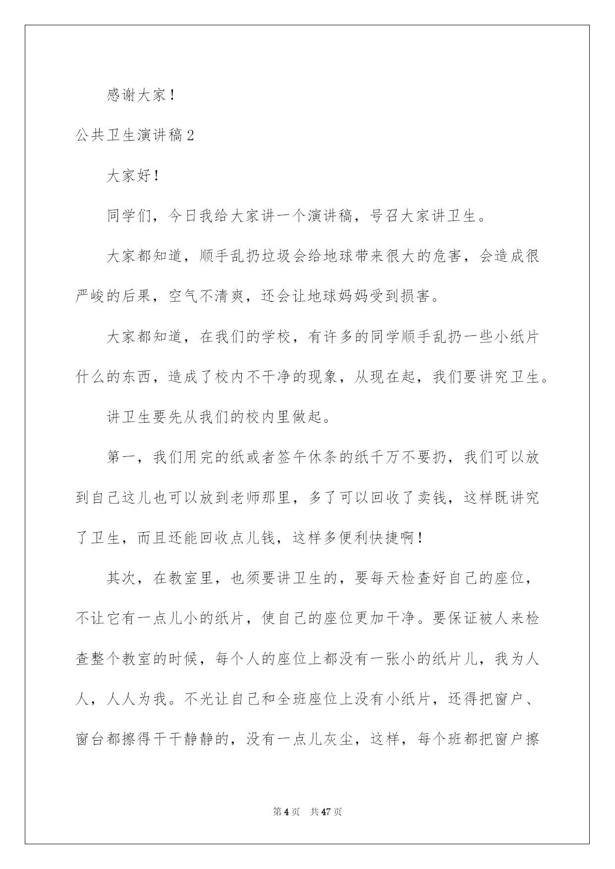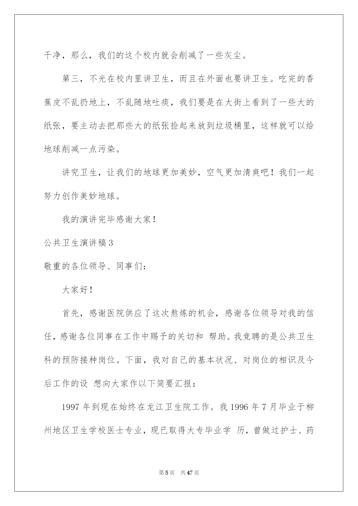 第PAGE\*Arabic\*MERGEFORMAT47页共NUMPAGES\*Arabic\*MERGEFORMAT47页第PAGE\*MERGEFORMAT47页共NUMPAGES\*MERGEFORMAT47页第PAGE\*MERGEFORMAT47页共NUMPAGES\*MERGEFORMAT47页第PAGE\*MERGEFORMAT47页共NUMPAGES\*MERGEFORMAT47页第PAGE\*MERGEFORMAT47页共NUMPAGES\*MERGEFORMAT47页第PAGE\*MERGEFORMAT47页共NUMPAGES\*MERGEFORMAT47页第PAGE\*MERGEFORMAT47页共NUMPAGES\*MERGEFORMAT47页第PAGE\*MERGEFORMAT47页共NUMPAGES\*MERGEFORMAT47页第PAGE\*MERGEFORMAT47页共NUMPAGES\*MERGEFORMAT47页第PAGE\*MERGEFORMAT47页共NUMPAGES\*MERGEFORMAT47页第PAGE\*MERGEFORMAT47页共NUMPAGES\*MERGEFORMAT47页2022公共卫生演讲稿公共卫生演讲稿好的演讲稿可以引导听众,使听众能更好地理解演讲的内容。现如今,演讲稿的运用越来越广泛,那要怎么写好演讲稿呢?下面是我为大家整理的公共卫生演讲稿,希望能够帮助到大家。公共卫生演讲稿1敬重的各位领导、同事们:大家好!首先,感谢医院供应了这次熬炼的机会,感谢各位领导对我的信任,感谢各位同事在工作中赐予的关切和帮助。我竞聘的是公共卫生岗位。也是我现在的职位。下面,我从几方面对大家作以下简要汇报:一、本人工作经验xxxx年7月毕业于黑龙江省卫生学校公共卫生专业,毕业后到现在始终在秦家镇卫生院从事公共卫生工作。在领导的关怀和培育下,我在思想上、政治上、业务上渐渐成熟起来。20xx年12月我光荣加入了中国共产党,成为了一名共产党员。二、任职期间工作汇报自我在公共卫生科工作以来,医院领导给了我极大的信任和帮助,全体职工给了我大力支持和激励。我根据医院对职工基本素养和要求,仔细履行岗位职责,尽到了自己的努力,取得了肯定的成果。(一)政治思想方面:我拥护党的方针、路途、政策,有坚决正确的政治方向,有严格的组织纪律性,没有违反党纪国法行为,在个人品德方面,为人正直,与人为善,待人恳切。在工作方面,我总是以高度的责任感和剧烈的事业心来仔细负责的办好每件事情,不求荣誉,只求进步。并不断的加强学习力度和工作实践,具有踏实奉献的敬业精神,扎实的业务学问,较强的工作实力和良好的人际亲和力以及团结合作意识。(二)工作业绩方面:在院领导的领导下,按时的召开每月的例会,刚好完成月免工作及传染病、慢病、死亡病例的报告工作曾多次迎接省、市级的工作检查,我个人也因工作表现突出,分别于20xx年、20xx年、20xx年获得了先进工作者或先进个人的称号。三、竞岗的有利条件工作仔细负责,勤勤恳恳,任劳任怨,酷爱本职工作,具有良好的医德医风。、注意学习,不断提高业务实力,熟识防疫工作要求。从事防疫工作多年,熟识《国家免疫规划》,纯熟把握防疫工作流程、方法。熟识疫苗的治理、贮存及运用的工作规范。能够较纯熟地运用电脑。熟识各种防疫报表的制作、上报及各种材料的整理工作。四、我的工作设想1、抓好防疫日常工作,严格执行《国家免疫规划》。特殊是抓好查漏补种、结核病访视、慢病、重症精神病治理等项工作。对传染病、死亡病例刚好上报。2、根据区疾控中心的要求,协作医院和上级部门完成各种专项工作任务。3、刚好做好各种档案材料并整理归档。4、主动做好业务上的传、帮、带工作,努力培育青年防疫工作骨干。5、热忱为群众服务,努力提高服务质量、效率。6、对于儿童预防接种的信息逐步纳入计算机管理。最终,我想说的是,不论能否竞聘上,我都会尽自己的实力,接着努力工作,克服自身的不足,为医院发展作贡献。感谢大家!公共卫生演讲稿2大家好!同学们,今日我给大家讲一个演讲稿,号召大家讲卫生。大家都知道,顺手乱扔垃圾会给地球带来很大的危害,会造成很严峻的后果,空气不清爽,还会让地球妈妈受到损害。大家都知道,在我们的学校,有许多的同学顺手乱扔一些小纸片什么的东西,造成了校内不干净的现象,从现在起,我们要讲究卫生。讲卫生要先从我们的校内里做起。第一,我们用完的纸或者签午休条的纸千万不要扔,我们可以放到自己这儿也可以放到老师那里,多了可以回收了卖钱,这样既讲究了卫生,而且还能回收点儿钱,这样多便利快捷啊!其次,在教室