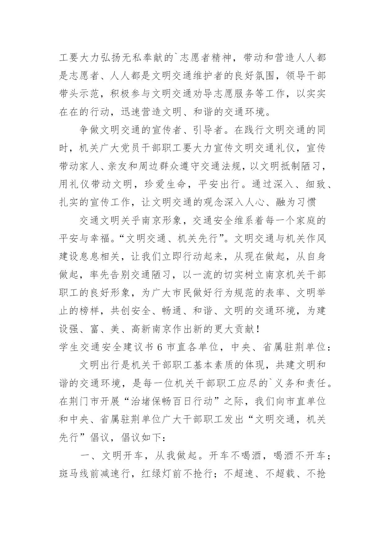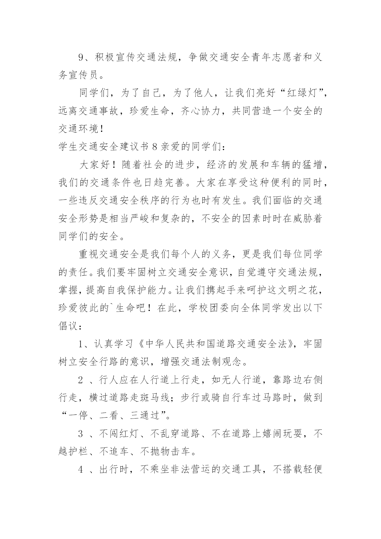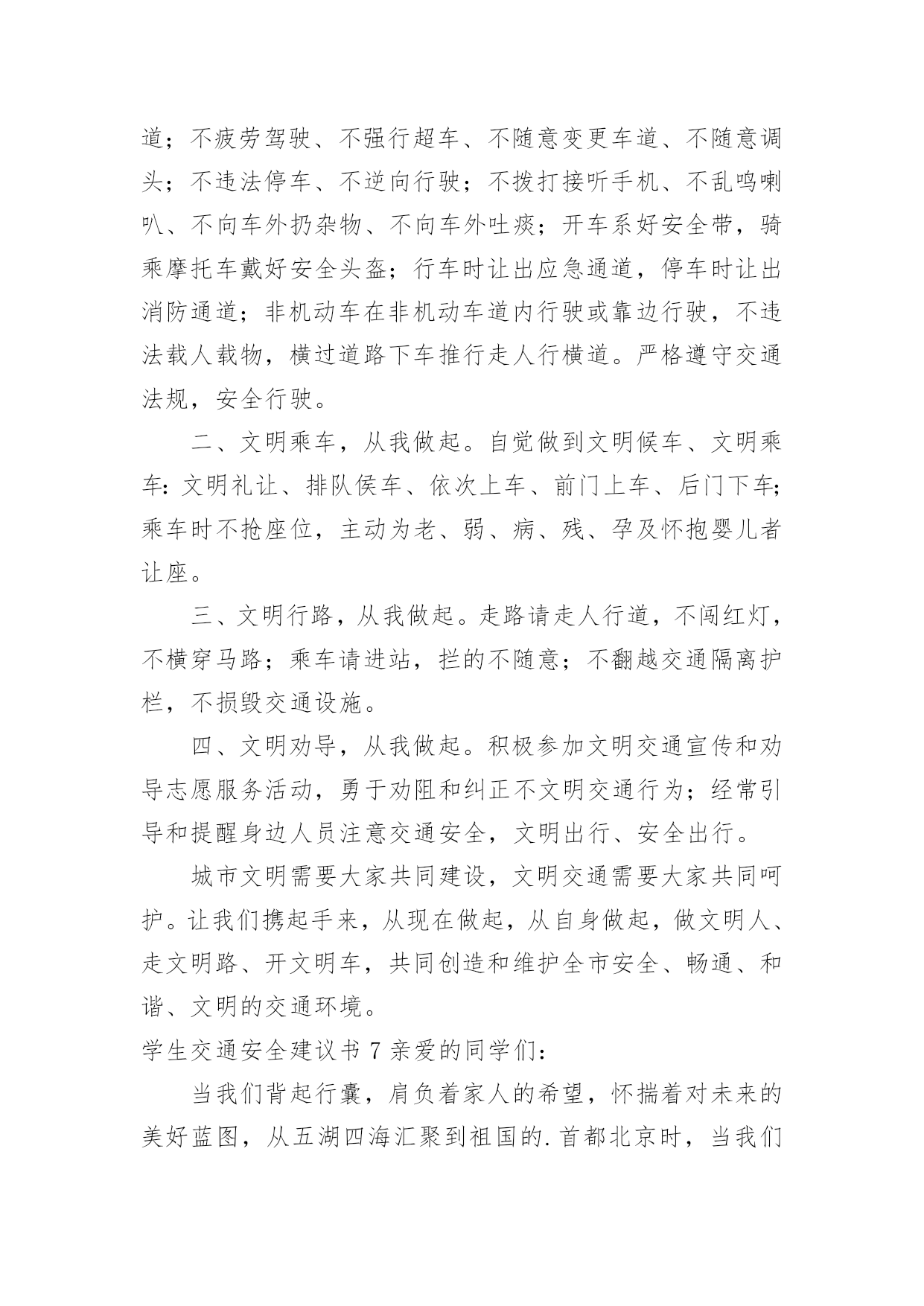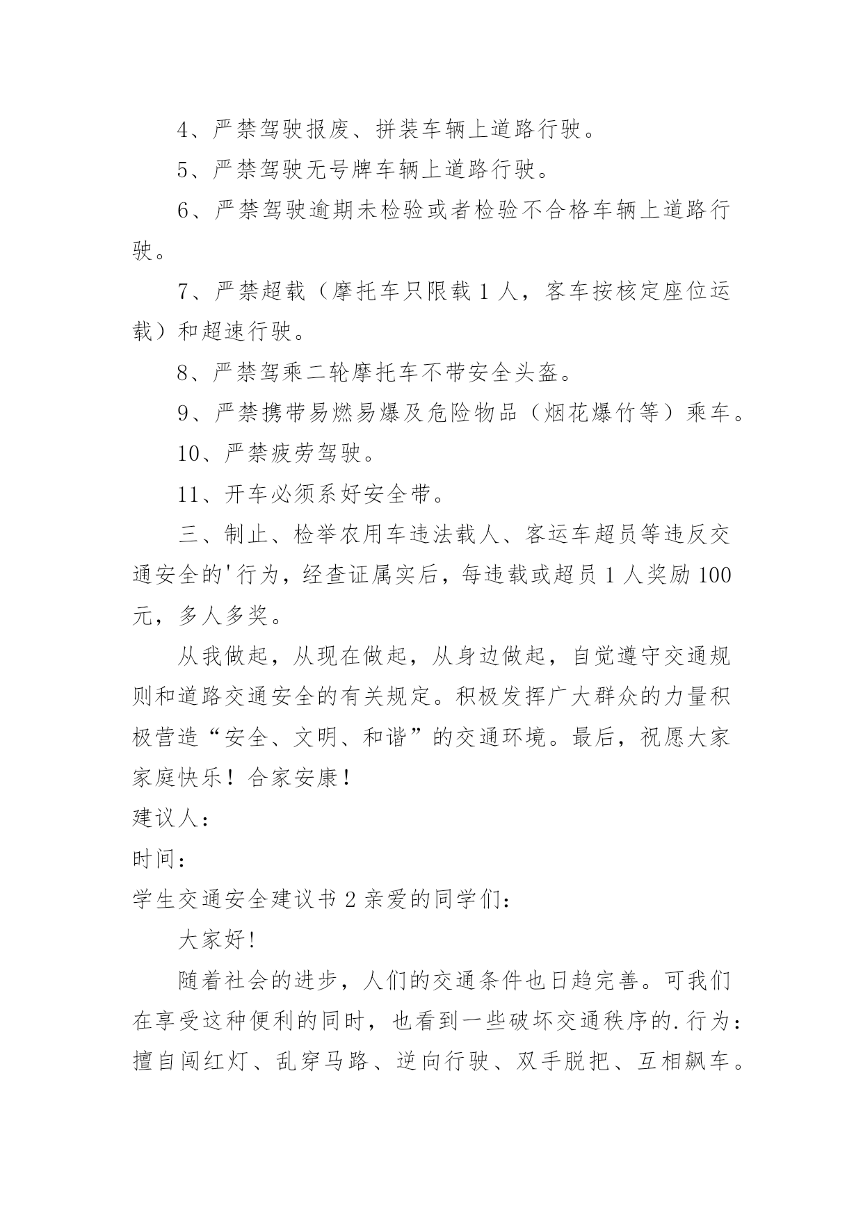学生交通安全建议书学生交通安全建议书在日常生活和工作中,建议书应用范围愈来愈广泛,当建议书是面对领导和有关部门时,可以中肯地提出自己对对方工作的意见和自己的建议。如何写一份恰当的建议书呢?下面是小编帮大家整理的学生交通安全建议书,欢迎阅读与收藏。学生交通安全建议书1生命对于我们每个人只有一次,请珍视和关爱自己和他人的生命,多少惨痛的教训和血的代价已让我们深深地体悟到交通安全的重要性。遵守交通法规是我们应尽的`责任和义务,只有遵章守法,平安才会伴您一生,只有文明交通,事故才会与您无缘。在此,为确保群众出行人身及财产安全,建议广大驾乘人员、人民群众要自觉遵守交通规则,谨慎、安全、文明驾乘车辆,杜绝事故发生。一、积极参与道路交通安全宣传,支持、理解、配合清源镇开展道路交通安全集中整治工作。二、自觉遵守交通规则和道路交通安全的有关规定。1、严禁农用三轮车、低速载货汽车、拖拉机载客。2、严禁未取得机动车驾驶证、驾驶证被吊销或者被暂扣期间驾驶车辆。3、严禁饮酒驾驶、醉酒驾驶车辆。4、严禁驾驶报废、拼装车辆上道路行驶。5、严禁驾驶无号牌车辆上道路行驶。6、严禁驾驶逾期未检验或者检验不合格车辆上道路行驶。7、严禁超载(摩托车只限载1人,客车按核定座位运载)和超速行驶。8、严禁驾乘二轮摩托车不带安全头盔。9、严禁携带易燃易爆及危险物品(烟花爆竹等)乘车。10、严禁疲劳驾驶。11、开车必须系好安全带。三、制止、检举农用车违法载人、客运车超员等违反交通安全的'行为,经查证属实后,每违载或超员1人奖励100元,多人多奖。从我做起,从现在做起,从身边做起,自觉遵守交通规则和道路交通安全的有关规定。积极发挥广大群众的力量积极营造“安全、文明、和谐”的交通环境。最后,祝愿大家家庭快乐!合家安康!建议人:时间:学生交通安全建议书2亲爱的同学们:大家好!随着社会的进步,人们的交通条件也日趋完善。可我们在享受这种便利的同时,也看到一些破坏交通秩序的.行为:擅自闯红灯、乱穿马路、逆向行驶、双手脱把、互相飙车。小学生交通安全倡议书默认分类。由此,我们联想到每天上、下学时看到的危险状况:一些学校附近人行道被占用,一些车辆驾驶员和骑车人不让行人,一些骑自行车和助动车穿越红灯甚至逆向行驶,一些家长不顾川流的车辆带孩子闯红灯,不少学校每天上下学时,无证摊贩、接送孩子的车辆拥堵在校门口,使广大同学难以安全行走。为了你我的生命安全,XX市实验小学全体同学向上海的中小学生倡议:认真学习交通安全课程,牢牢树立安全行路的意识。严格遵守交通规则,做到文明行路:必须在人行道上行走,没有人行道的靠路边行走;不在(珍惜粮食倡议书)马路上追逐打闹,急拐猛跑或游戏。在自己严格遵守交通规则的同时,要学会分辨危险,并且学会避免危险。从影响自己的家人开始,劝告自己的家人、亲戚要珍爱生命,严格遵守交通规则,文明行路。不食用、不购买校门口无证设摊上出售的食品和小玩具等商品。学生交通安全建议书3尊敬的老师、亲爱的小朋友们:大家早上好!交通安全,人人有责。交通与我们的生活密不可分。在来园、离园的路上,我们经常会看到一些人不遵守交通规则,他们闯红灯、逆向行驶、不走规定车道,这些都是不文明的交通行为。特别在我们幼儿园门前的那条小路,经常挤满了车辆,人们总是从车缝间穿行,他们淡薄的安全意识增加了许多交通隐患。本周是我园的“交通安全宣传周”,在此,向全体教职工、小朋友、家长朋友们发出如下建议:1、我们要认真学习交通安全的法律法规,遵守交通规则,加强安全意识,树立交通安全文明公德。2、当我们走在人来车往的`马路时,请时刻保持清醒的头脑,不在马路上嬉戏打闹,密切注意机动车的行驶情况,预防道路交通事故的发生。3、当我们穿过马路时,多一份谦让与耐心,不闯红灯,走人行横道,绝不能为贪一时之快横穿马路,要做到:“红灯停,绿灯行,黄灯停一停。”4、驾驶车辆要严格遵守交通法规,规范行车,规范停车。5、自觉配合交警和协管员做好规范行路、行车。6、遵守交通规则是文明学校评定的重要条件之一,因此,每个教职工都要审视自己的交通行为是否做到自觉遵守交通法规,是否做到安全出行,把遵守交通法规牢记于心。老师、小朋友们,让我们行动起来,从我做起,从小事做起,为交通的安全及畅通,为宝贵的生命,请遵守交通规则吧!此致敬礼!建议人:20xx年xx月xx日学生交通安全建议书4敬爱的同学们:随着松江大学园区基础设施的日趋完善,校园规模也在日趋扩大。繁荣的校园,不息的人流,在让我们感到蓬勃朝气的同时,也存在着一定的交通隐患:擅闯红灯、乱穿马路、逆向行驶、双手脱把、相互飙车……为了一时的便利,生命之花悄然凋谢。在一幕幕血的教训面前,我们愕然、痛惜……而随后,红灯依旧擅闯,车辆依旧逆驶,惨案依旧发生。难道,这就是我们每天面对的交通环境?这就是我们作为一名知法、
