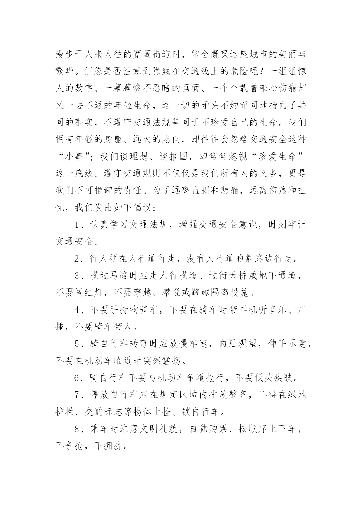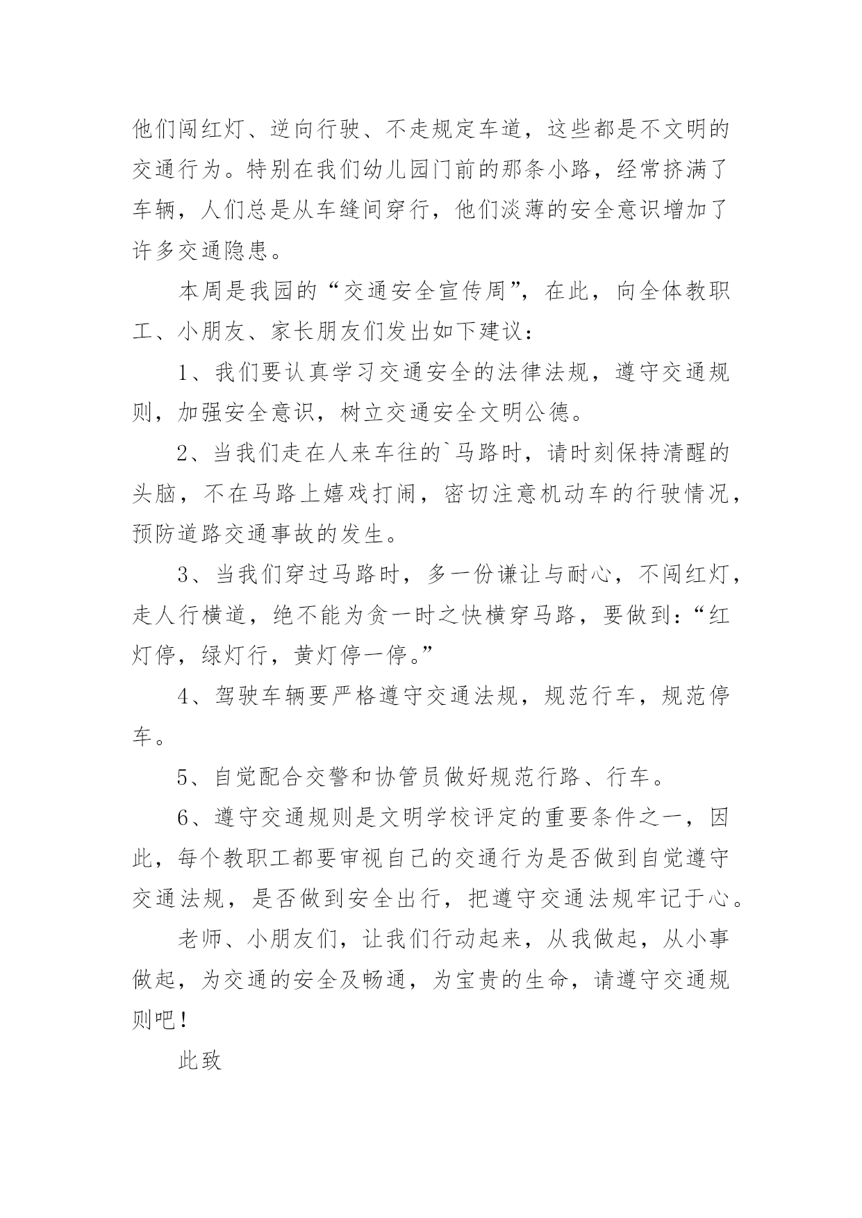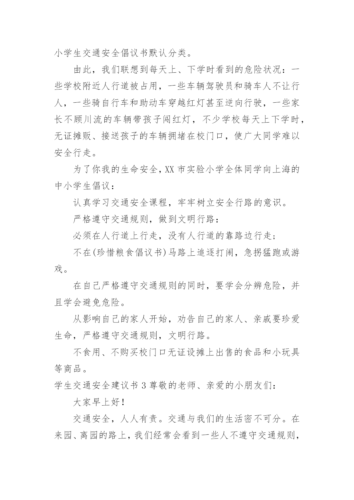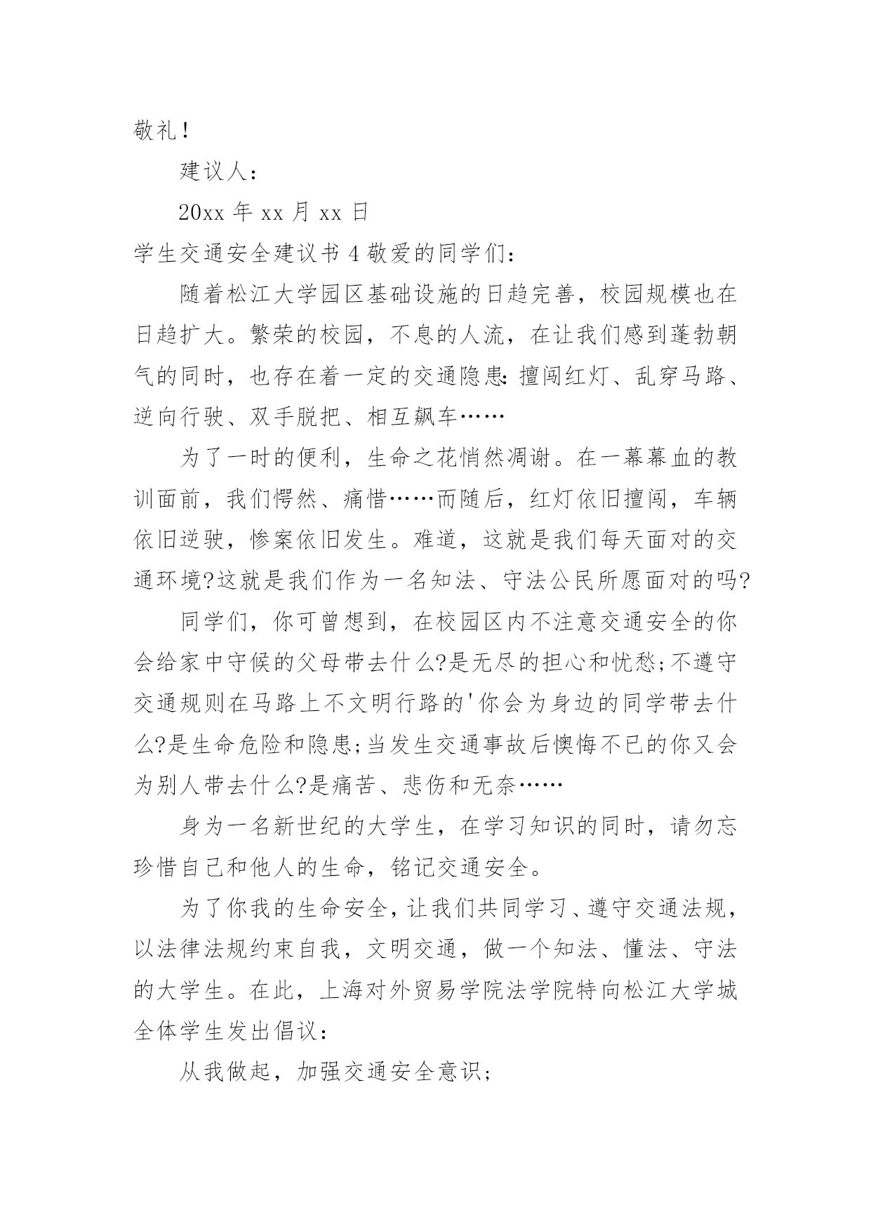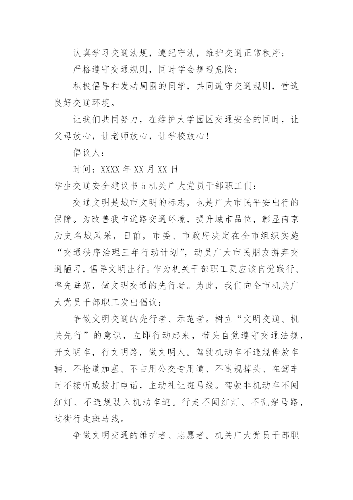 学生交通安全建议书学生交通安全建议书在日常生活和工作中,建议书应用范围愈来愈广泛,当建议书是面对领导和有关部门时,可以中肯地提出自己对对方工作的意见和自己的建议。如何写一份恰当的建议书呢?下面是小编帮大家整理的学生交通安全建议书,欢迎阅读与收藏。学生交通安全建议书1生命对于我们每个人只有一次,请珍视和关爱自己和他人的生命,多少惨痛的教训和血的代价已让我们深深地体悟到交通安全的重要性。遵守交通法规是我们应尽的`责任和义务,只有遵章守法,平安才会伴您一生,只有文明交通,事故才会与您无缘。在此,为确保群众出行人身及财产安全,建议广大驾乘人员、人民群众要自觉遵守交通规则,谨慎、安全、文明驾乘车辆,杜绝事故发生。一、积极参与道路交通安全宣传,支持、理解、配合清源镇开展道路交通安全集中整治工作。二、自觉遵守交通规则和道路交通安全的有关规定。1、严禁农用三轮车、低速载货汽车、拖拉机载客。2、严禁未取得机动车驾驶证、驾驶证被吊销或者被暂扣期间驾驶车辆。3、严禁饮酒驾驶、醉酒驾驶车辆。4、严禁驾驶报废、拼装车辆上道路行驶。5、严禁驾驶无号牌车辆上道路行驶。6、严禁驾驶逾期未检验或者检验不合格车辆上道路行驶。7、严禁超载(摩托车只限载1人,客车按核定座位运载)和超速行驶。8、严禁驾乘二轮摩托车不带安全头盔。9、严禁携带易燃易爆及危险物品(烟花爆竹等)乘车。10、严禁疲劳驾驶。11、开车必须系好安全带。三、制止、检举农用车违法载人、客运车超员等违反交通安全的'行为,经查证属实后,每违载或超员1人奖励100元,多人多奖。从我做起,从现在做起,从身边做起,自觉遵守交通规则和道路交通安全的有关规定。积极发挥广大群众的力量积极营造“安全、文明、和谐”的交通环境。最后,祝愿大家家庭快乐!合家安康!建议人:时间:学生交通安全建议书2亲爱的同学们:大家好!随着社会的进步,人们的交通条件也日趋完善。可我们在享受这种便利的同时,也看到一些破坏交通秩序的.行为:擅自闯红灯、乱穿马路、逆向行驶、双手脱把、互相飙车。小学生交通安全倡议书默认分类。由此,我们联想到每天上、下学时看到的危险状况:一些学校附近人行道被占用,一些车辆驾驶员和骑车人不让行人,一些骑自行车和助动车穿越红灯甚至逆向行驶,一些家长不顾川流的车辆带孩子闯红灯,不少学校每天上下学时,无证摊贩、接送孩子的车辆拥堵在校门口,使广大同学难以安全行走。为了你我的生命安全,XX市实验小学全体同学向上海的中小学生倡议:认真学习交通安全课程,牢牢树立安全行路的意识。严格遵守交通规则,做到文明行路:必须在人行道上行走,没有人行道的靠路边行走;不在(珍惜粮食倡议书)马路上追逐打闹,急拐猛跑或游戏。在自己严格遵守交通规则的同时,要学会分辨危险,并且学会避免危险。从影响自己的家人开始,劝告自己的家人、亲戚要珍爱生命,严格遵守交通规则,文明行路。不食用、不购买校门口无证设摊上出售的食品和小玩具等商品。学生交通安全建议书3尊敬的老师、亲爱的小朋友们:大家早上好!交通安全,人人有责。交通与我们的生活密不可分。在来园、离园的路上,我们经常会看到一些人不遵守交通规则,他们闯红灯、逆向行驶、不走规定车道,这些都是不文明的交通行为。特别在我们幼儿园门前的那条小路,经常挤满了车辆,人们总是从车缝间穿行,他们淡薄的安全意识增加了许多交通隐患。本周是我园的“交通安全宣传周”,在此,向全体教职工、小朋友、家长朋友们发出如下建议:1、我们要认真学习交通安全的法律法规,遵守交通规则,加强安全意识,树立交通安全文明公德。2、当我们走在人来车往的`马路时,请时刻保持清醒的头脑,不在马路上嬉戏打闹,密切注意机动车的行驶情况,预防道路交通事故的发生。3、当我们穿过马路时,多一份谦让与耐心,不闯红灯,走人行横道,绝不能为贪一时之快横穿马路,要做到:“红灯停,绿灯行,黄灯停一停。”4、驾驶车辆要严格遵守交通法规,规范行车,规范停车。5、自觉配合交警和协管员做好规范行路、行车。6、遵守交通规则是文明学校评定的重要条件之一,因此,每个教职工都要审视自己的交通行为是否做到自觉遵守交通法规,是否做到安全出行,把遵守交通法规牢记于心。老师、小朋友们,让我们行动起来,从我做起,从小事做起,为交通的安全及畅通,为宝贵的生命,请遵守交通规则吧!此致敬礼!建议人:20xx年xx月xx日学生交通安全建议书4敬爱的同学们:随着松江大学园区基础设施的日趋完善,校园规模也在日趋扩大。繁荣的校园,不息的人流,在让我们感到蓬勃朝气的同时,也存在着一定的交通隐患:擅闯红灯、乱穿马路、逆向行驶、双手脱把、相互飙车……为了一时的便利,生命之花悄然凋谢。在一幕幕血的教训面前,我们愕然、痛惜……而随后,红灯依旧擅闯,车辆依旧逆驶,惨案依旧发生。难道,这就是我们每天面对的交通环境?这就是我们作为一名知法、