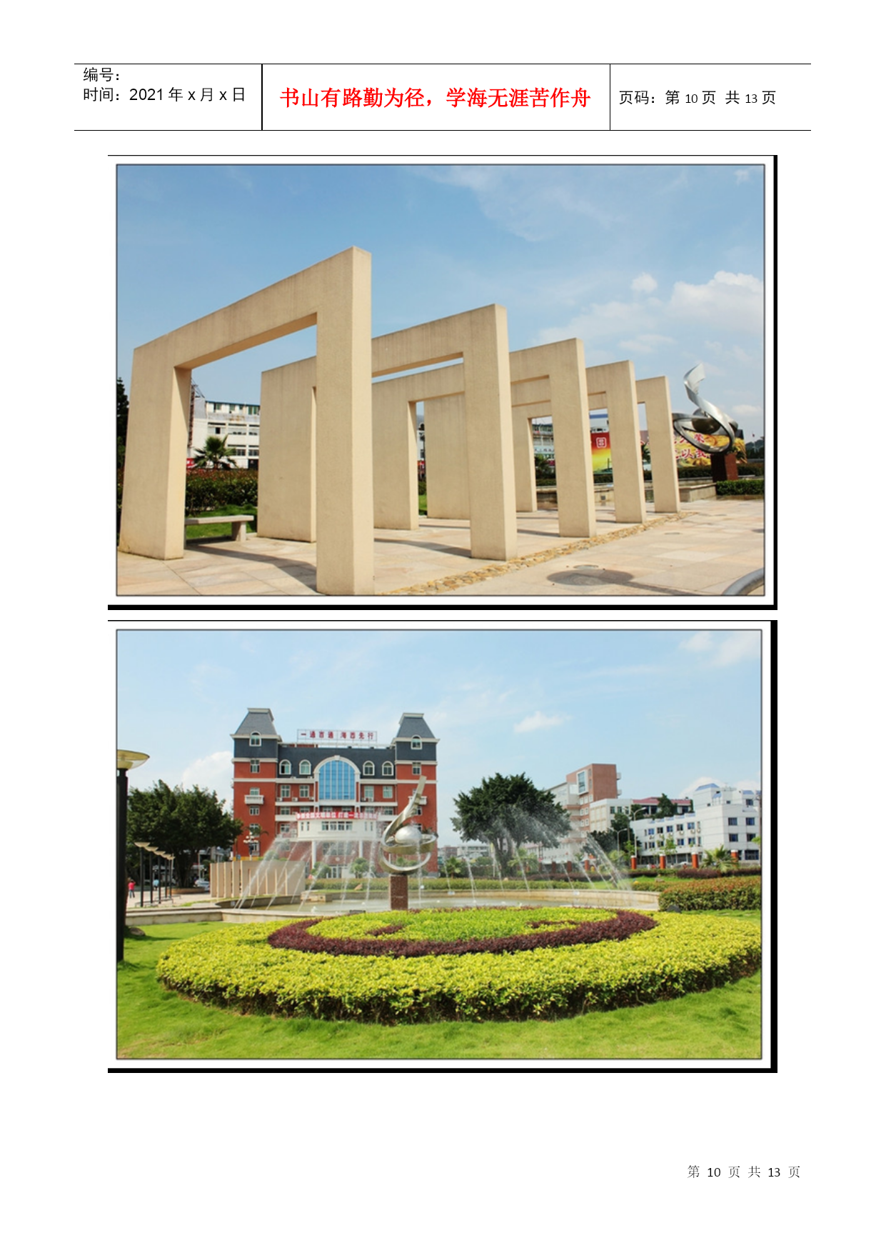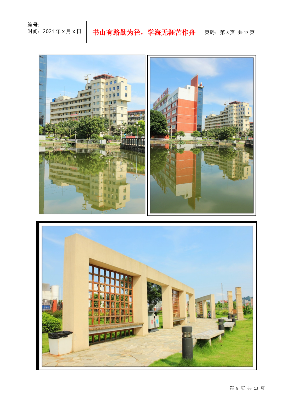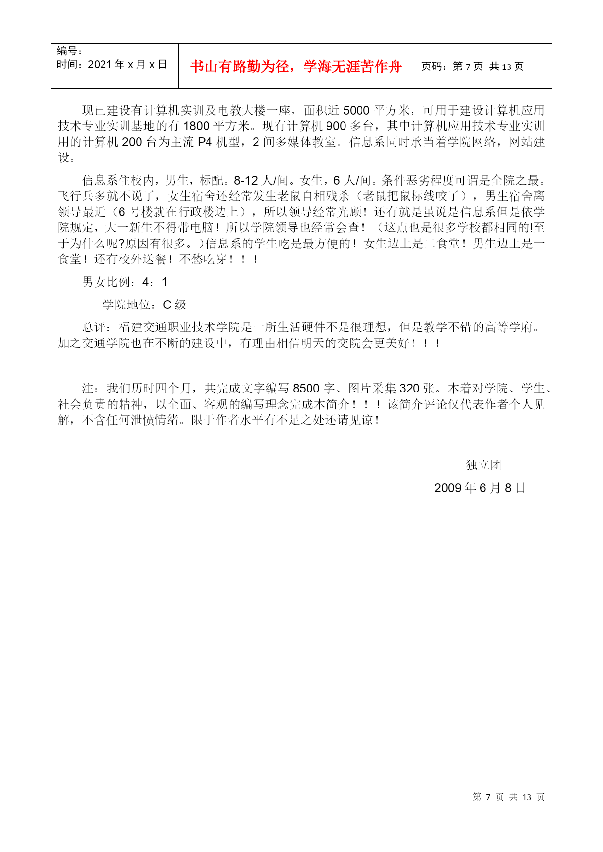 编号:时间:2021年x月x日书山有路勤为径,学海无涯苦作舟页码:第PAGE13页共NUMPAGES13页第PAGE\*MERGEFORMAT13页共NUMPAGES\*MERGEFORMAT13页福建交通职业技术学院大名:福建交通职业技术学院小名:福建交通学院(缩写:交院)地理位置:中华人民共和国福建省福州市仓山区首山路80号(主校区)和螺洲镇119号(排下校区)创校历史:1999年7月经国家教育部批准,由原福建交通学校(1974年创办)、福建船政学校(1866年创办)、福建交通干部学校(1954年创办)、福建公路工程技工学校(1978年创办)等四校合并成立并组建。现在都以船政学校创办时间为建校时间,故到2009年就有143年的历史了!学院概况:福建交通职业技术学院为福建交通厅直属单位!2003年11月,交通学院在福建省高职高专院校中首家通过“教育部高职高专院校人才培养工作水平评估”。是福建省高职高专院校长联席会议的主席单位。2006年,学院又做为福建省的唯一代表被确定为全国首批28所“国家示范性高等职业院校”(类似本科院校中的‘211工程’)建设单位。2008年在全国高职院校排名13(1天津职大2邢台职院3山西财税专科4辽宁交通专科5长春汽工高专6黑龙江建筑职学院7上海医专8南京工业职院9无锡职院10宁波职院11浙江金融职院12芜湖职院)。学院现有教职工753人,其中专任教师571人,有教授、博士生导师2人,享受国务院特殊津贴专家1人,福建省优秀专家1人,福建省高校教学名师2人,高级职称占教师总数的20.9%,拥有一支专业理论水平高、教学和实践经验丰富的“双师素质”师资队伍。现有在校生13000多人。人多力量大!!!学院党政领导:党委书记:江定涛院长:沈斐敏党委副书记:陈炎生副院长:傅高升、王兴中、赵平校训:求是自强求实创新学院内环境:占地面积580亩(包括属学院旗下的一块90多亩的“实验农田”,且学院特殊的地理位置限制了它的规模)。建筑面积22万多平方米。学院有自己的“水立方”(游泳池,船政学院教学需要,其他学生下水—-交钱!)、“鸟巢”(400m标准田径场)、有540个固定座位的室内体育馆、还有一条“未名湖”(过境的臭水沟,谁知道是什么河,所以还未命名,夏天恶臭七里香!)至于绿化,不敢说绿树成荫,繁花似锦,但该有的都有(有树、有花、有草),现有小花园4个(大门一个,汽车系一个,船政学院一个,排下校区一个,这对于众多情侣是严重的资源匮乏!场地有限!!)。卫生有时好有时坏,幸好学院有一支庞大的保洁队伍—勤工俭学!值得一提的是学院内老鼠特多,尤其是几栋宿舍楼!特别是女生宿舍!老鼠饿的时候就连同类“鼠标”的尾巴都咬!在交院有句俗话“老鼠比猫大!”所以你在交院看到老鼠千万别叫出来免得被说大惊小怪!!学院缺乏有效的整治方案,故泛滥成灾!!!排下校区条件艰苦,建筑陈旧,如果是住在高层的还经常停水,学校周边环境还很恶劣,没有大型的商业点,离市区远。故在排下流传着这样的一句:“白天停水,晚上停电,四处施工,尘土飞溅,一个超市,还是黑店,两层食堂,像个猪圈,早上叠被,晚上泡面,旷课不许,恋爱受限,设施不好,交通不便,前不着村,后不着店,抬头一看,交通学院!”,很形象的概述了排下校区的环境。学院外环境:周围分布众多高校!大门正对面—福建警察学院(在交院人口中称他们为公安专,他们同样称咱们交技院。传说两校战火不断!但近年来还算和平!);交院左侧门是工程学院和福建师范大学旧校区(历史原因,联系紧密);交院右侧是师大协和学院、音乐学院以及金融学院遗址;排下边上还有信息学院,条件比咱好!交院可谓是仓山高校中心点,占据了半条首山路!!绵延800米啊!!!交通学院交通便利(主要公交有:20路交通学院——火车站;50路交院-义序机场;66路交院-总院分院途经中亭街东街口;106路交院—金鸡山公园途经冠亚广场五一广场;87路交院—森林公园;城洋小巴交院—排下似乎为我们交院特意开的!),商业繁华(学院边上白天看上去就数十家店面,但晚上可是蜂拥而出啊!二十米宽的街道就成两米了!离学院不到200米远的一条街无论是白天还是晚上都人群爆满!这就是传说中的福建乃至全国人流量最大的——新旧学生街!在这里无奇不有!福州人有句古话:福州人半半价!在学生街只要有勇气,砍吧!!!)学院制度:关于学院制度和大多高校一样都有好多的规矩!这是必不可少的!如果要列下来,要好几天才会完啊!!那就简单小说一下吧!首先,注册时你可以直接交钱这也是最明智的!那另一种就是通过“绿色通道”进来的(也许很多人不明白什么是“绿色通道”,所谓“绿色通道”就是一些学生因家里经济不行需要向学校申请缓交学费或向银行贷款由银行直接打入学校账户!)