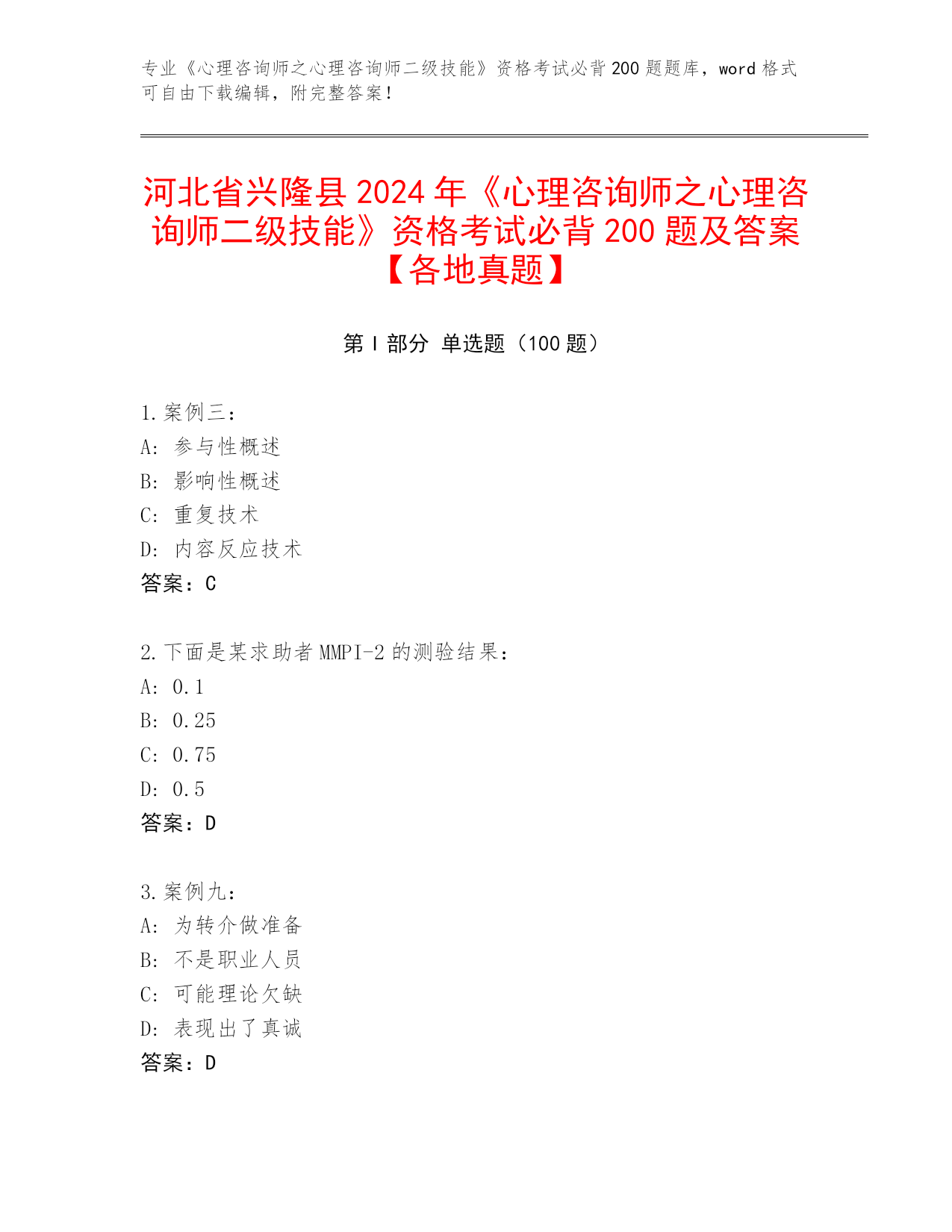 河北省兴隆县2024年《心理咨询师之心理咨询师二级技能》资格考试必背200题及答案【各地真题】