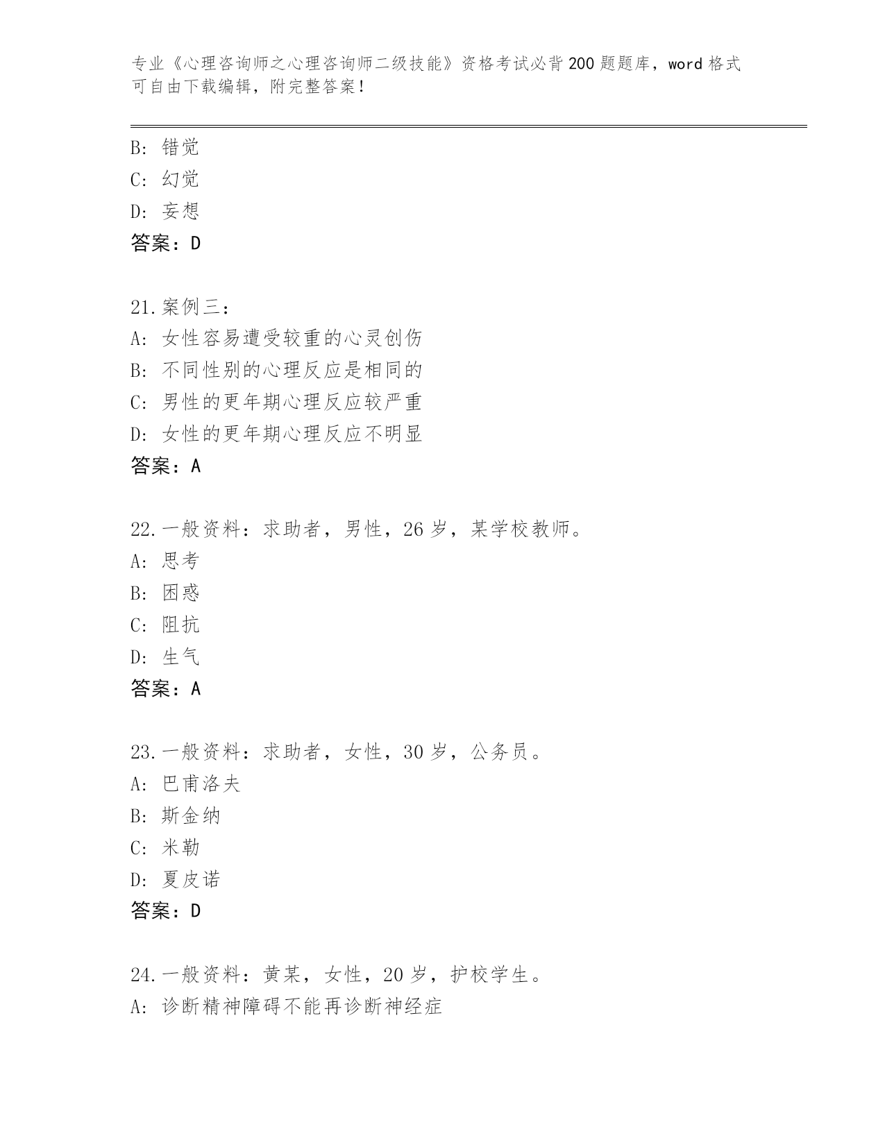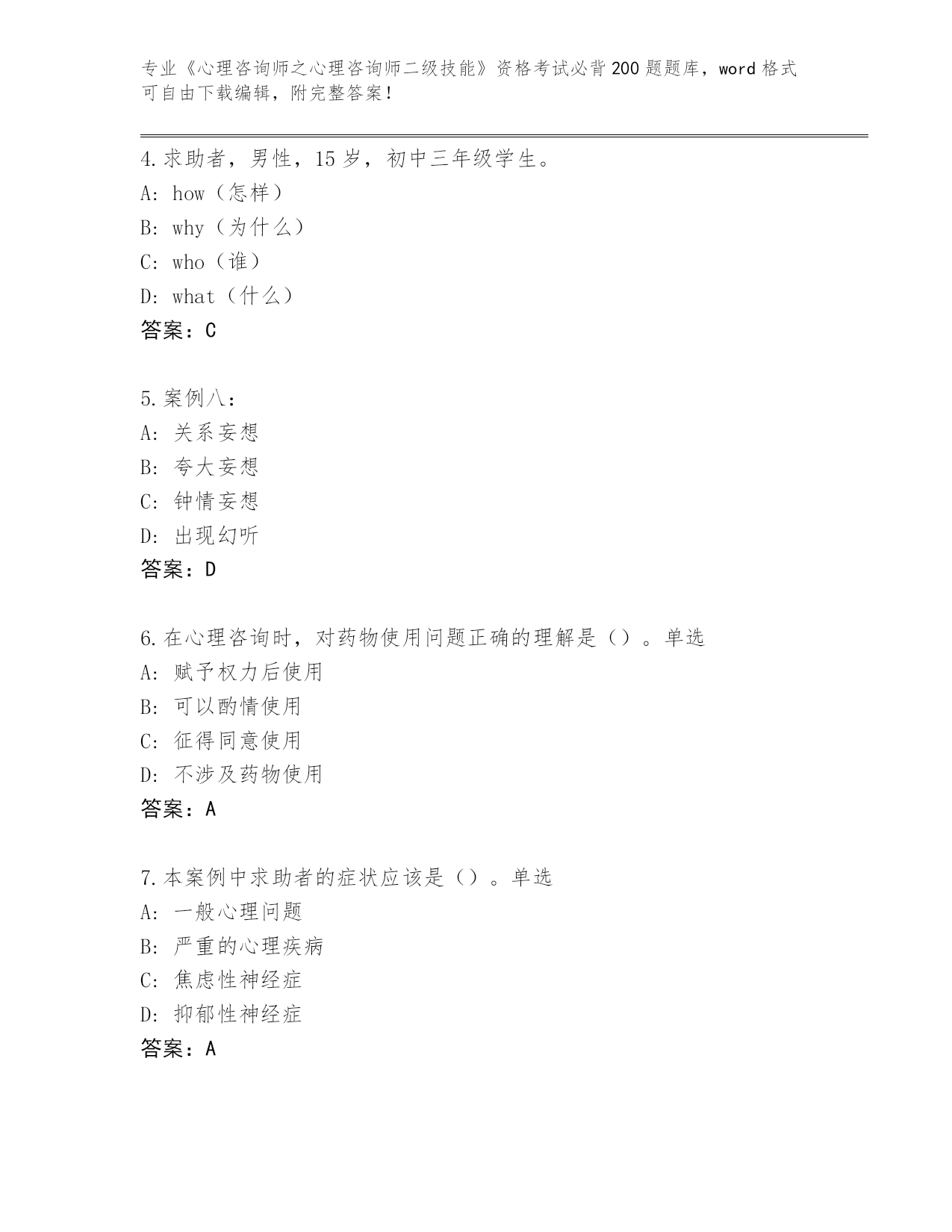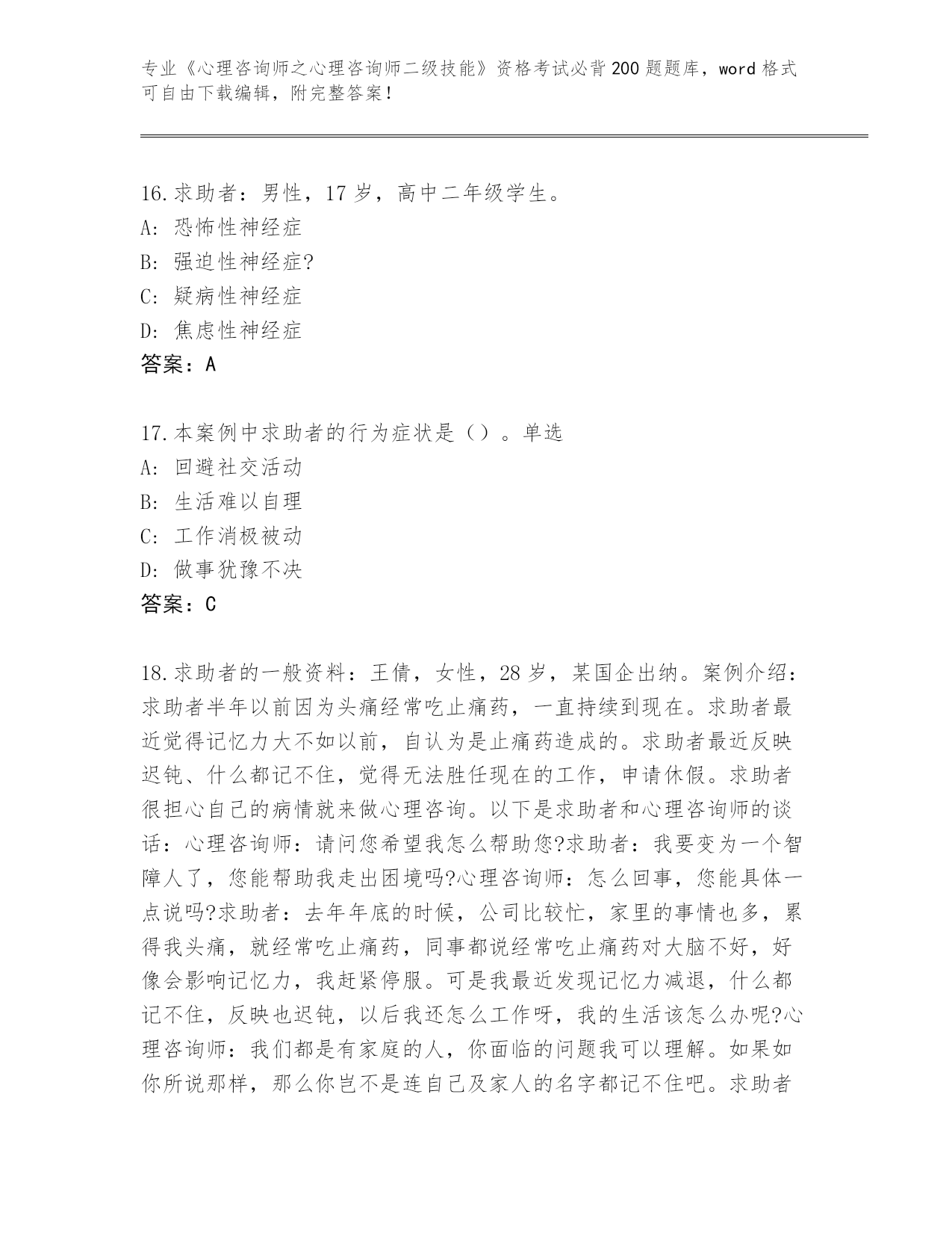 河北省柏乡县2024年《心理咨询师之心理咨询师二级技能》资格考试必背200题题库及答案【各地真题】