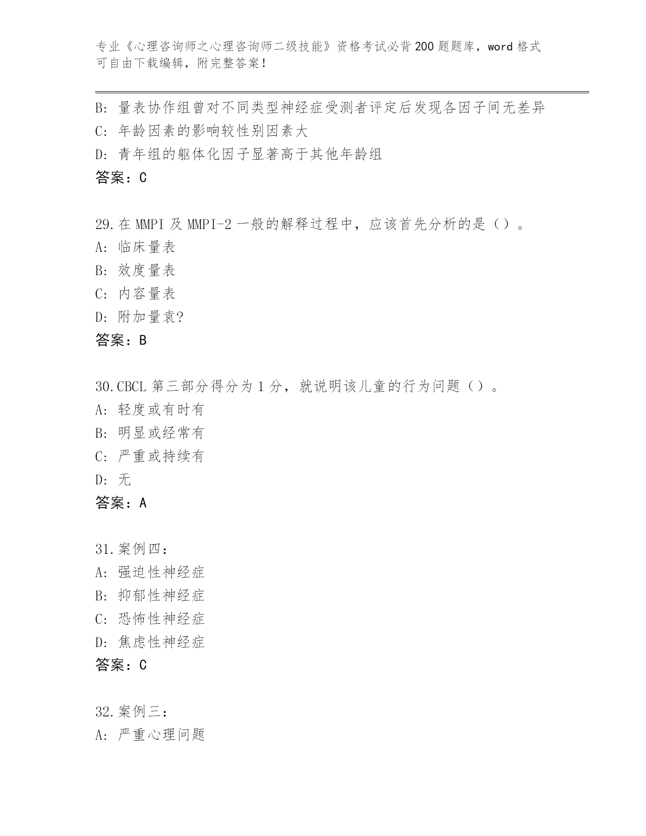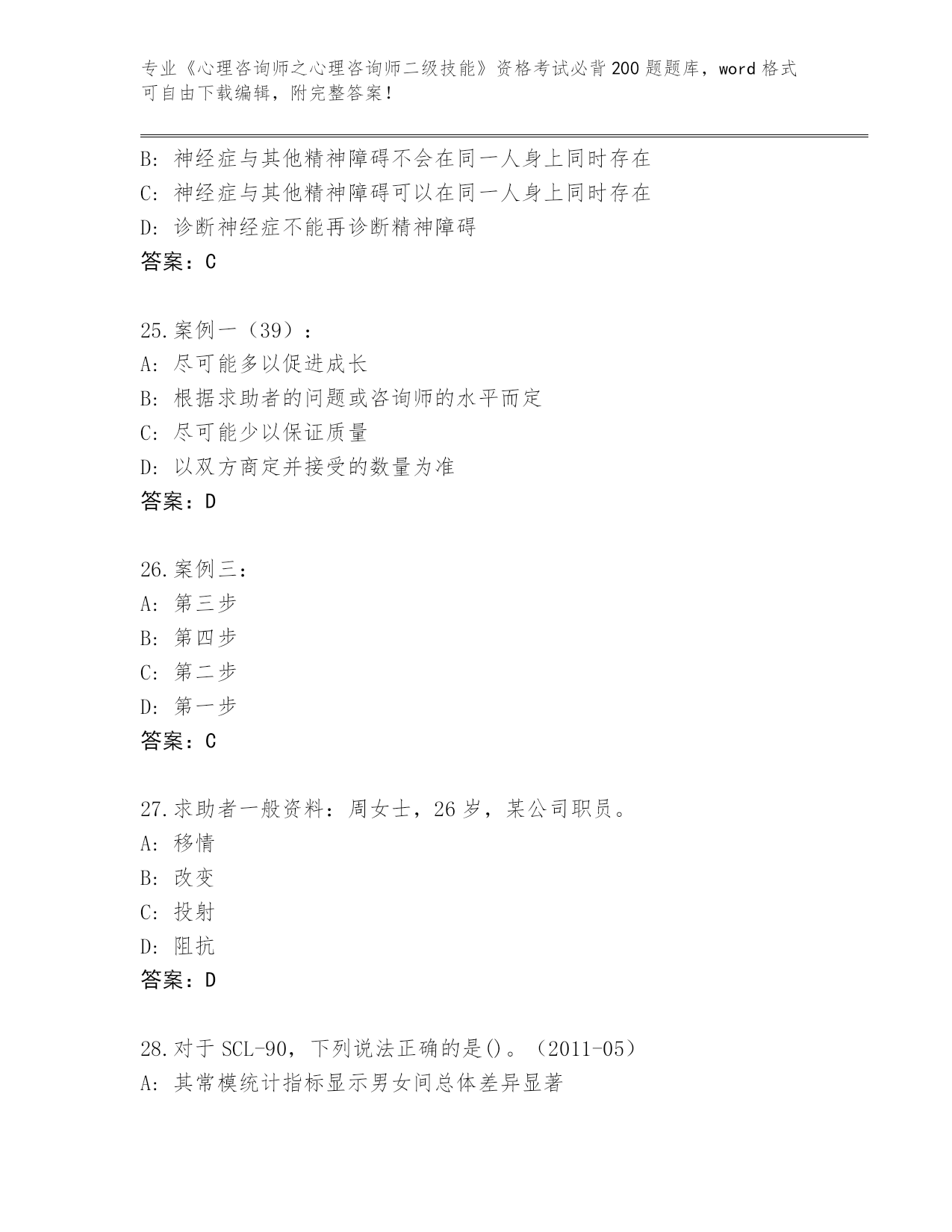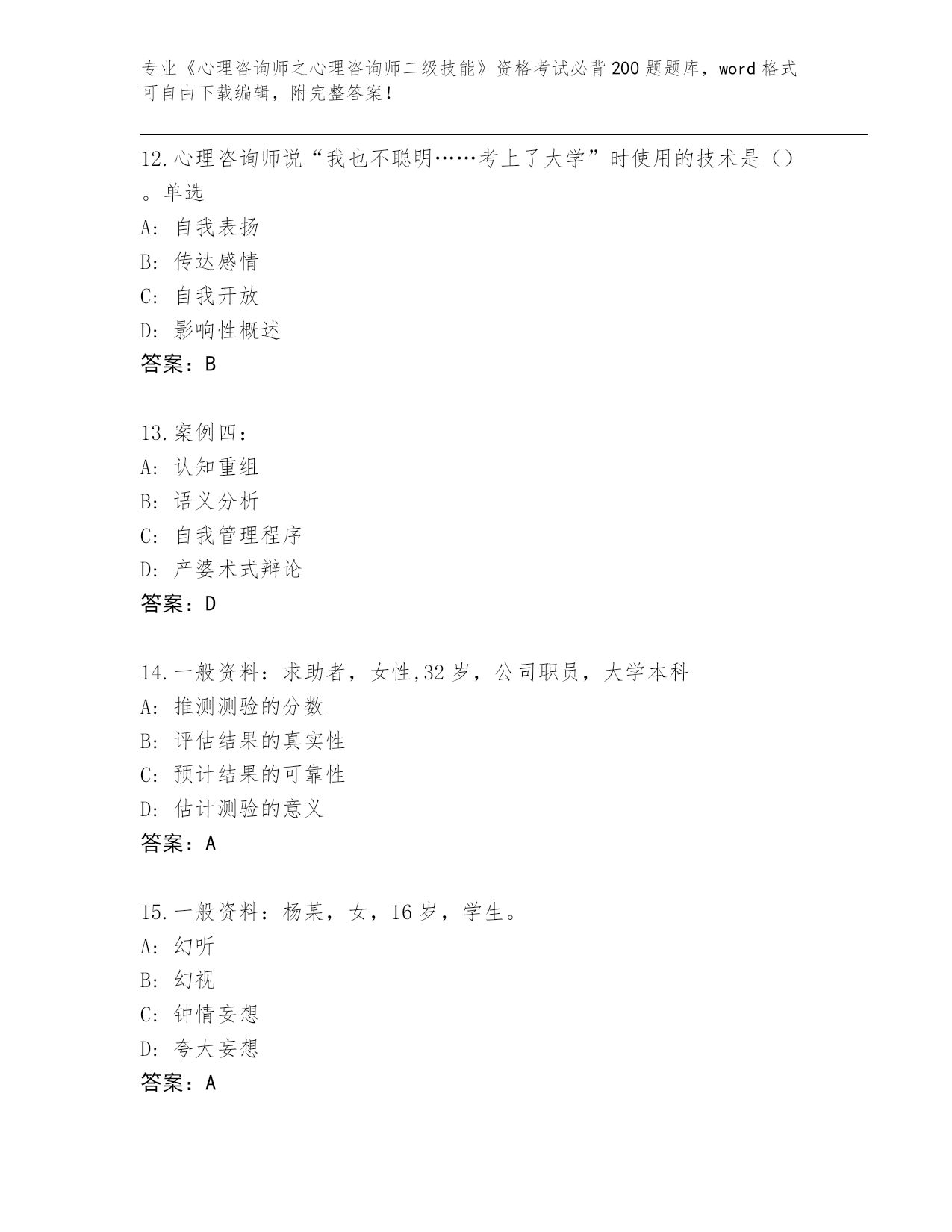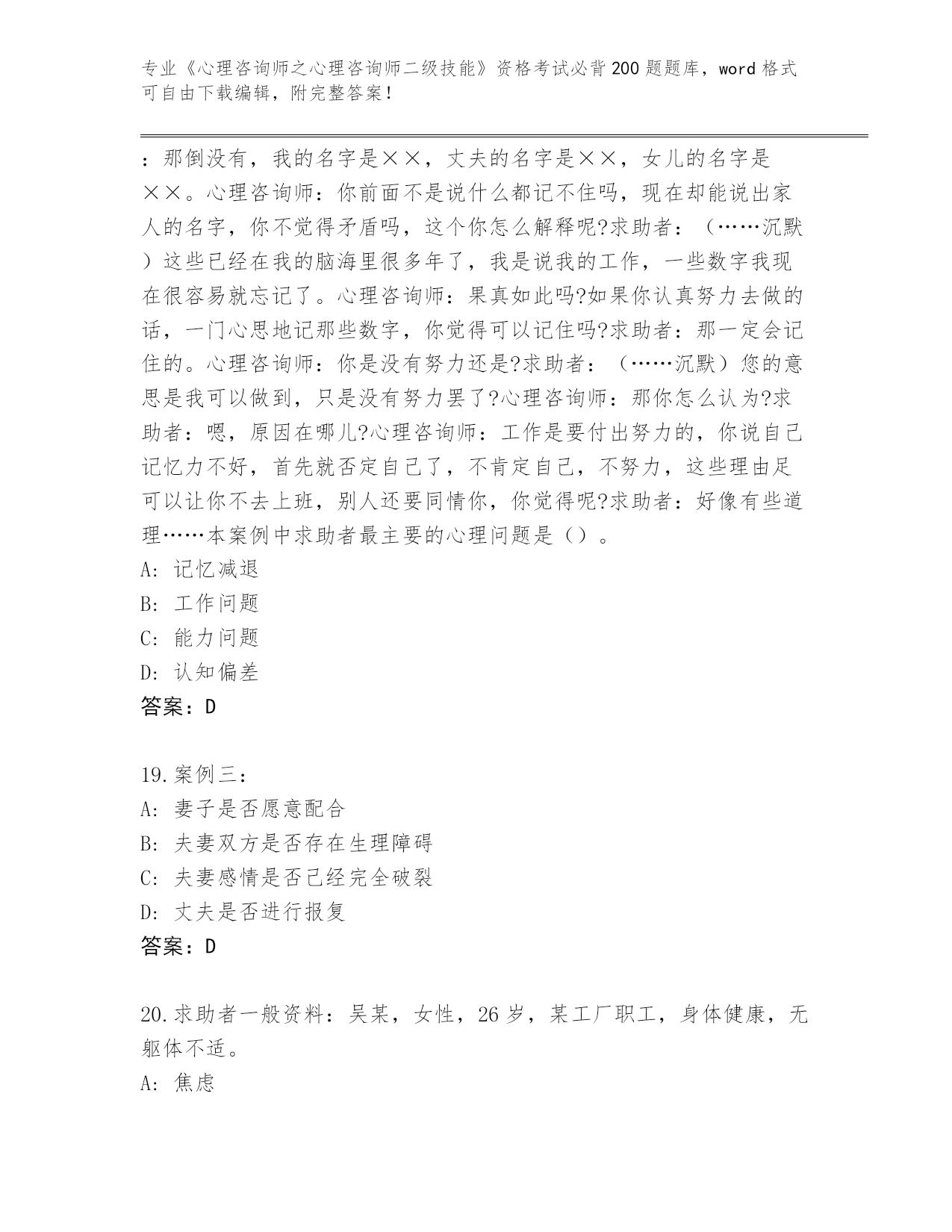 河北省柏乡县2024年《心理咨询师之心理咨询师二级技能》资格考试必背200题题库及答案【各地真题】