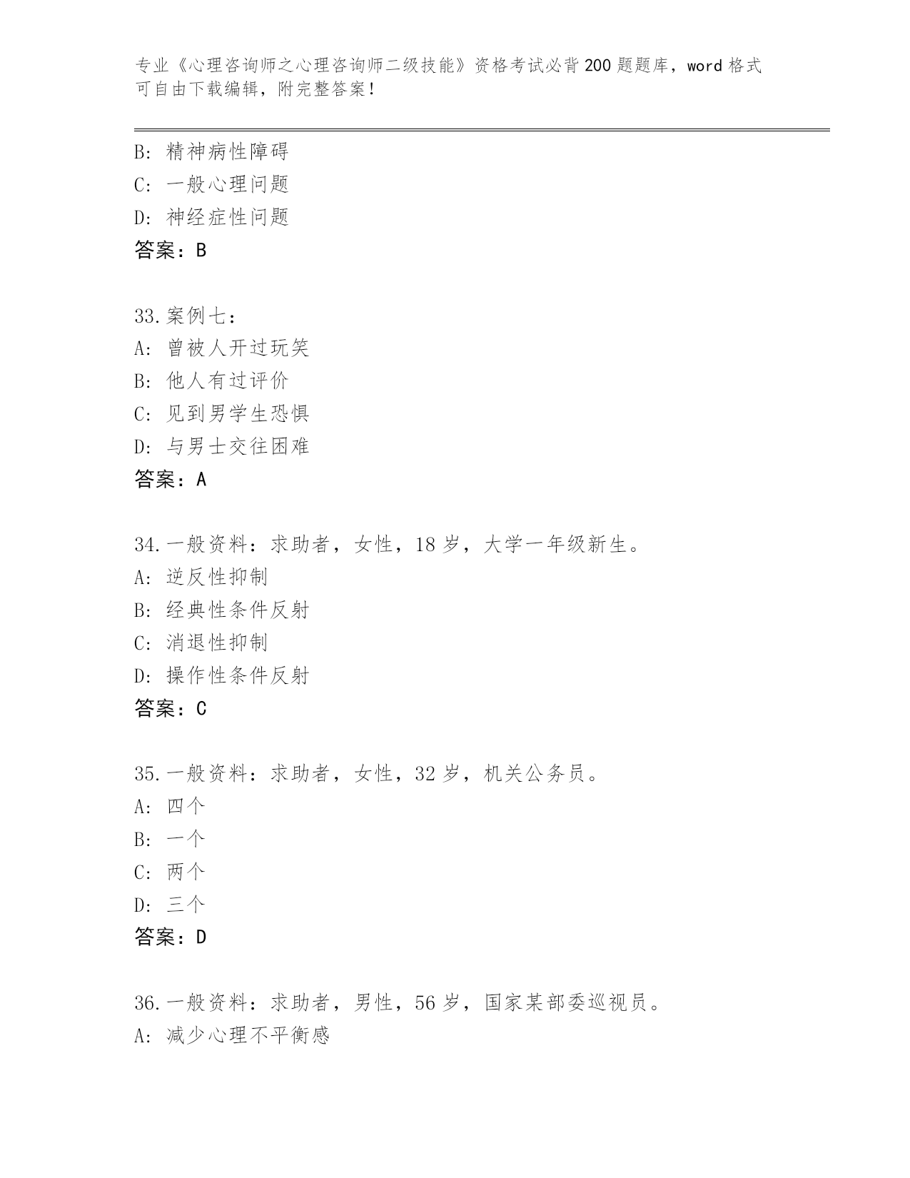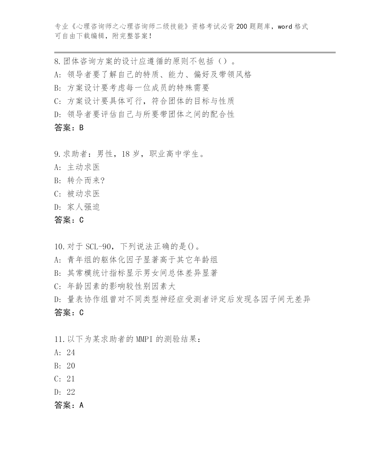 河北省雄县2024《心理咨询师之心理咨询师二级技能》资格考试必背200题完整题库【各地真题】