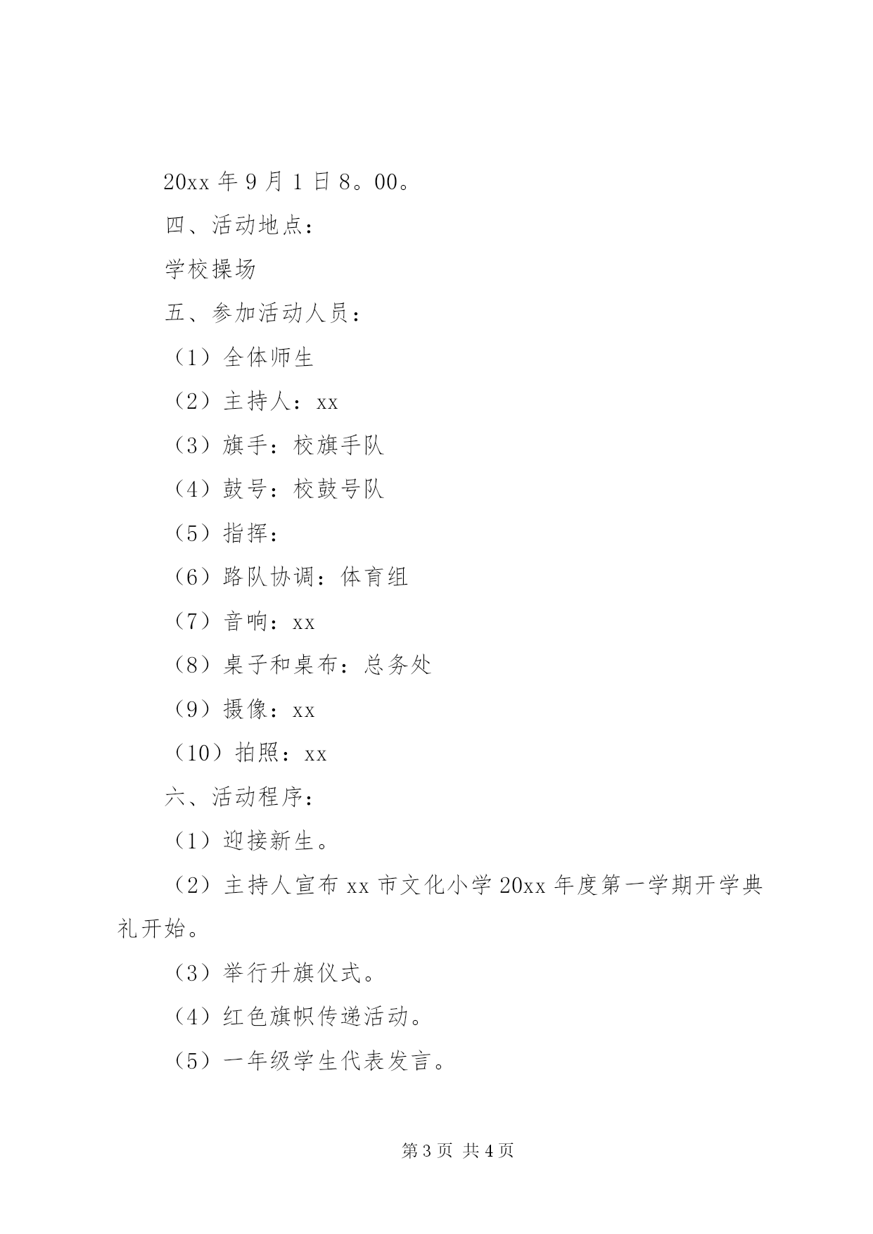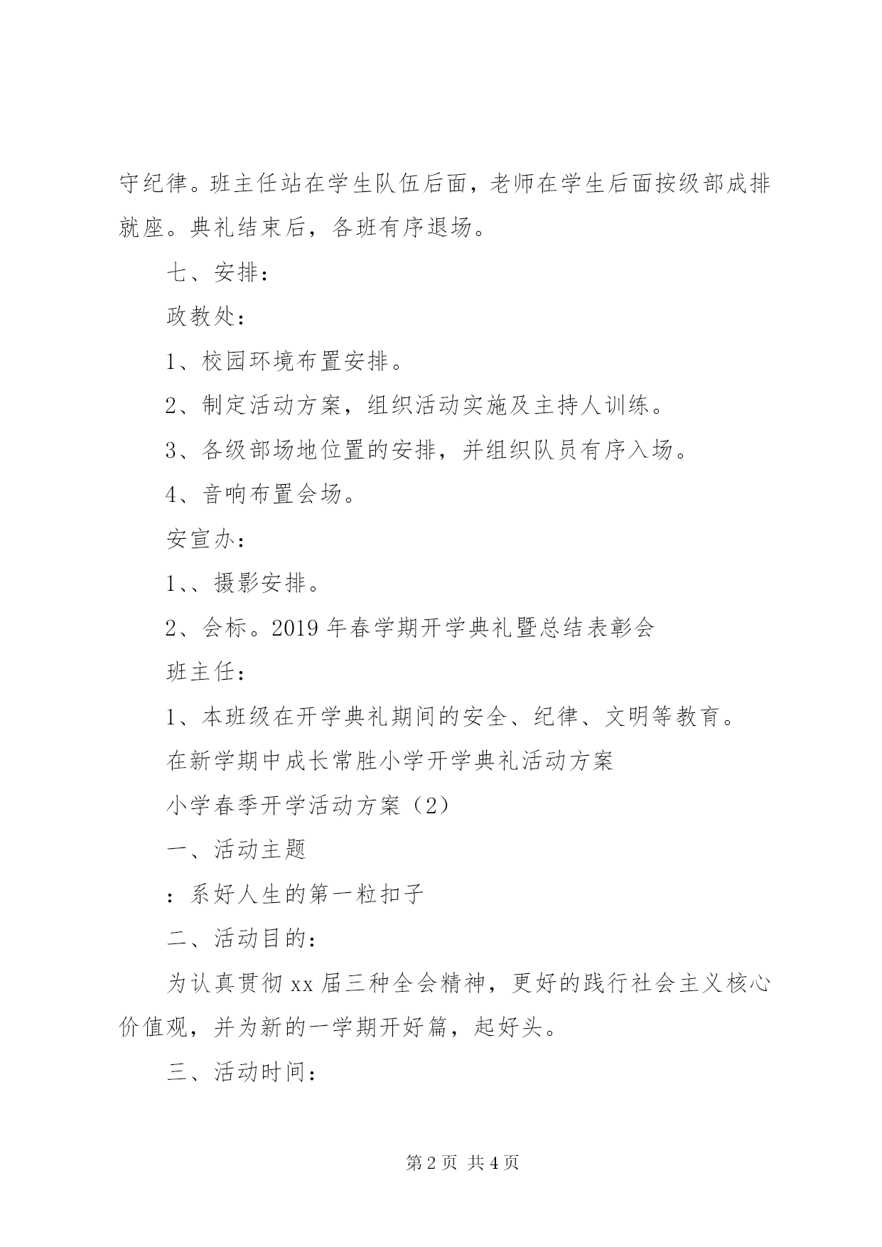 第PAGE\*Arabic\*MERGEFORMAT4页共NUMPAGES\*MERGEFORMAT4页小学春季开学活动方案小学春季开学活动方案(1)一、活动:学生养成教育,师生责任感和使命感,营造校园有序的,为新学期的开端。二、活动:下午三、活动地点:楼前广场四、活动主持:五、议程:(一)主持人宣布开学典礼开始。全体起立,奏国歌。(二)表彰优秀学生。(三)颁奖。(四)校长致辞和讲话和讲话和讲话。(五)每日两问三反思活动启动仪式。宣读活动倡议书。(六)第五项集体宣誓。(七)宣布结束,各班退场。六、活动要求:1、全员,教师、学生情绪饱满,精神振奋。2、全体学生准时整队进场,班级学生制定的位置站好,遵守纪律。班主任站在学生队伍后面,老师在学生后面按级部成排就座。典礼结束后,各班有序退场。七、安排:政教处:1、校园环境布置安排。2、制定活动方案,组织活动实施及主持人训练。3、各级部场地位置的安排,并组织队员有序入场。4、音响布置会场。安宣办:1、、摄影安排。2、会标。2019年春学期开学典礼暨总结表彰会班主任:1、本班级在开学典礼期间的安全、纪律、文明等教育。在新学期中成长常胜小学开学典礼活动方案小学春季开学活动方案(2)一、活动主题:系好人生的第一粒扣子二、活动目的:为认真贯彻xx届三种全会精神,更好的践行社会主义核心价值观,并为新的一学期开好篇,起好头。三、活动时间:20xx年9月1日8。00。四、活动地点:学校操场五、参加活动人员:(1)全体师生(2)主持人:xx(3)旗手:校旗手队(4)鼓号:校鼓号队(5)指挥:(6)路队协调:体育组(7)音响:xx(8)桌子和桌布:总务处(9)摄像:xx(10)拍照:xx六、活动程序:(1)迎接新生。(2)主持人宣布xx市文化小学20xx年度第一学期开学典礼开始。(3)举行升旗仪式。(4)红色旗帜传递活动。(5)一年级学生代表发言。(6)新教师介绍,新教师宣誓。(7)林校长讲话(8)主持人宣布开学典礼结束。