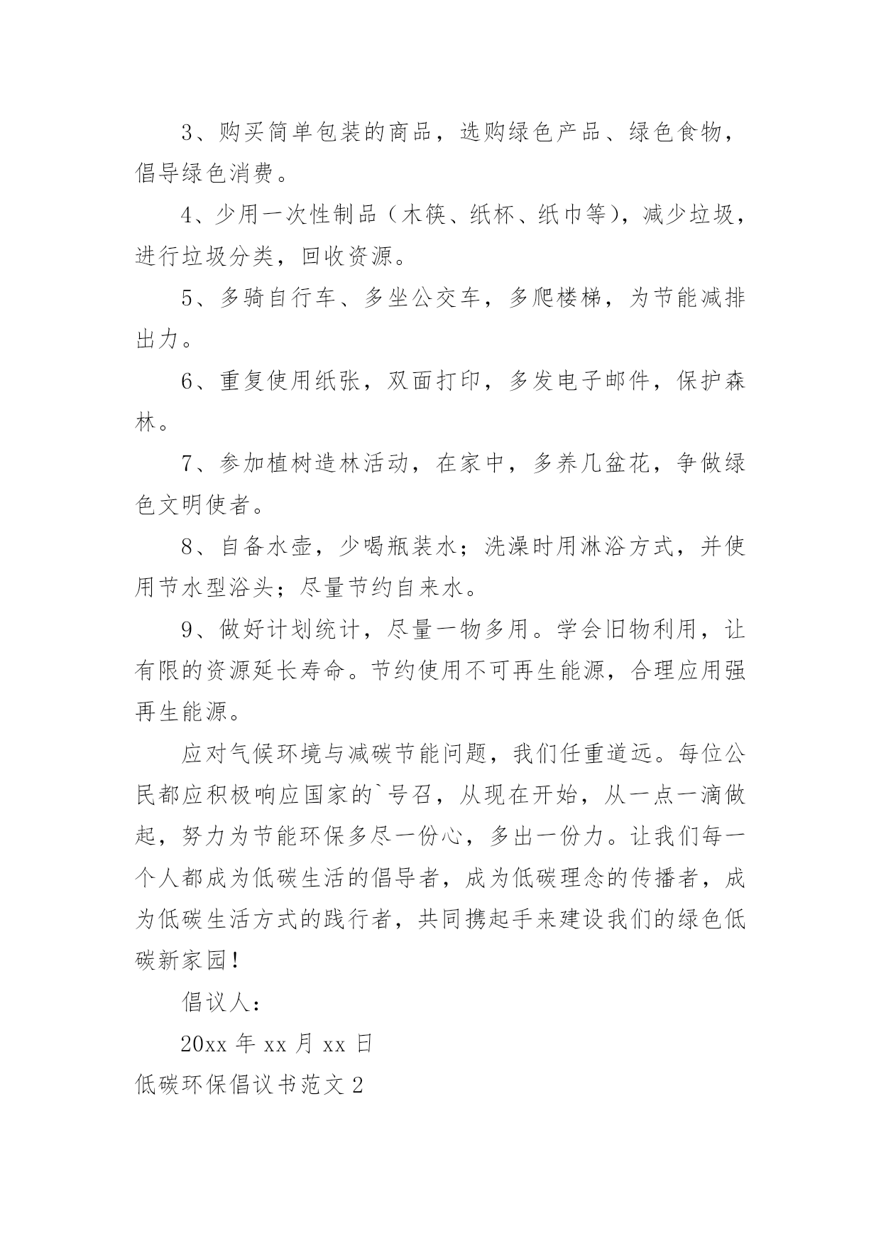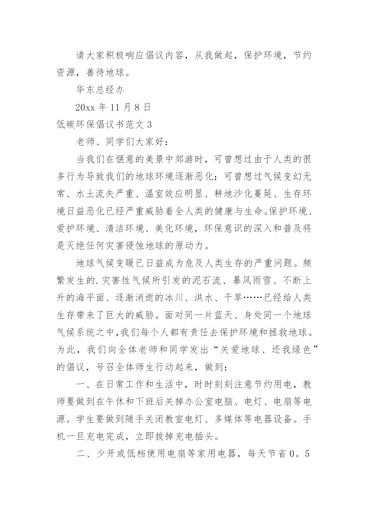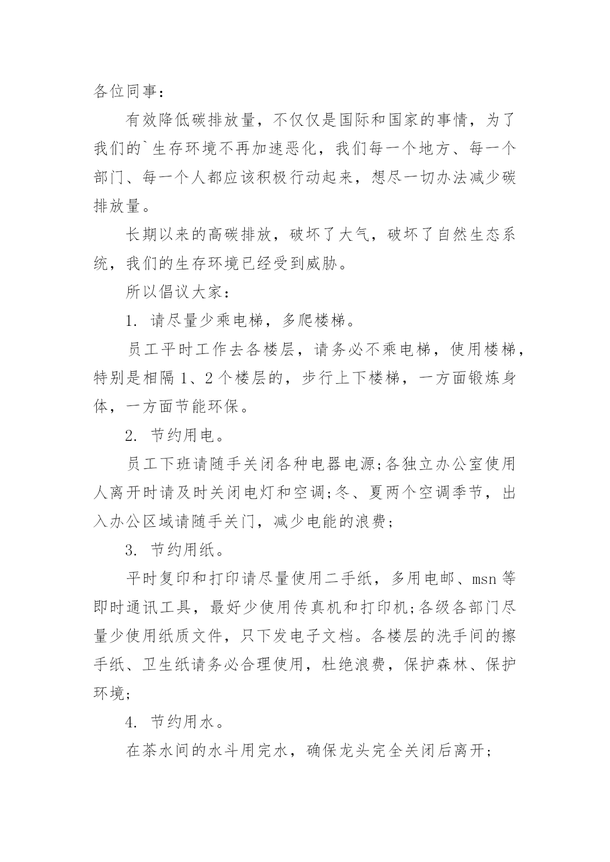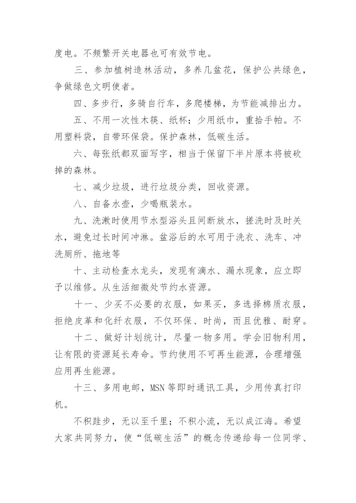 低碳环保倡议书低碳环保倡议书范文在当今社会生活中,用到倡议书的地方越来越多,倡议书不是对某个人或某一小集体而发的,它的受众往往是广大群众,或是部门的所有人,或是一个地区的所有人,甚至是全国人民。相信写倡议书是一个让许多人都头痛的问题,下面是小编为大家整理的低碳环保倡议书范文,仅供参考,欢迎大家阅读。低碳环保倡议书范文1全体师生:近年,气候变化是当今全球面临的重大挑战。遏制气候变暖,是全人类共同的使命。为了你、为了我、为了他,也为了我们这个赖以生存的地球大家庭,更是为了明天的美好生活,作为当代公民,我们应该积极行动起来,身体力行,共同遏制全球气候变暖。为此,xx市四中向全体师生发出低碳生活,我们行动起来的倡议,号召全体师生要做到:1、在日常工作和生活中,我们每个人都应该主动增强危机意识、节约意识与环保意识,真正了解节能环保对国家及个人的意义。2、时时刻刻注意节约用电,要做到随手关闭电灯、电脑、电视、空调、饮水机等电器设备,做到人走电停。3、购买简单包装的商品,选购绿色产品、绿色食物,倡导绿色消费。4、少用一次性制品(木筷、纸杯、纸巾等),减少垃圾,进行垃圾分类,回收资源。5、多骑自行车、多坐公交车,多爬楼梯,为节能减排出力。6、重复使用纸张,双面打印,多发电子邮件,保护森林。7、参加植树造林活动,在家中,多养几盆花,争做绿色文明使者。8、自备水壶,少喝瓶装水;洗澡时用淋浴方式,并使用节水型浴头;尽量节约自来水。9、做好计划统计,尽量一物多用。学会旧物利用,让有限的资源延长寿命。节约使用不可再生能源,合理应用强再生能源。应对气候环境与减碳节能问题,我们任重道远。每位公民都应积极响应国家的`号召,从现在开始,从一点一滴做起,努力为节能环保多尽一份心,多出一份力。让我们每一个人都成为低碳生活的倡导者,成为低碳理念的传播者,成为低碳生活方式的践行者,共同携起手来建设我们的绿色低碳新家园!倡议人:20xx年xx月xx日低碳环保倡议书范文2各位同事:有效降低碳排放量,不仅仅是国际和国家的事情,为了我们的`生存环境不再加速恶化,我们每一个地方、每一个部门、每一个人都应该积极行动起来,想尽一切办法减少碳排放量。长期以来的高碳排放,破坏了大气,破坏了自然生态系统,我们的生存环境已经受到威胁。所以倡议大家:1.请尽量少乘电梯,多爬楼梯。员工平时工作去各楼层,请务必不乘电梯,使用楼梯,特别是相隔1、2个楼层的,步行上下楼梯,一方面锻炼身体,一方面节能环保。2.节约用电。员工下班请随手关闭各种电器电源;各独立办公室使用人离开时请及时关闭电灯和空调;冬、夏两个空调季节,出入办公区域请随手关门,减少电能的浪费;3.节约用纸。平时复印和打印请尽量使用二手纸,多用电邮、msn等即时通讯工具,最好少使用传真机和打印机;各级各部门尽量少使用纸质文件,只下发电子文档。各楼层的洗手间的擦手纸、卫生纸请务必合理使用,杜绝浪费,保护森林、保护环境;4.节约用水。在茶水间的水斗用完水,确保龙头完全关闭后离开;请大家积极响应倡议内容,从我做起,保护环境,节约资源,善待地球。华东总经办20xx年11月8日低碳环保倡议书范文3老师、同学们大家好:当我们在惬意的美景中郊游时,可曾想过由于人类的很多行为导致我们的地球环境逐渐恶化;可曾想过气候变幻无常、水土流失严重、温室效应明显、耕地沙化蔓延、生存环境日益恶化已经严重威胁着全人类的健康与生命。保护环境、爱护环境、清洁环境、美化环境,环保意识的深入和普及将是灭绝任何灾害侵蚀地球的原动力。地球气候变暖已日益成为危及人类生存的严重问题。频繁发生的.灾害性气候所引发的泥石流、暴风雨雪、不断上升的海平面、逐渐消逝的冰川、洪水、干旱……已经给人类生存带来了巨大的威胁。面对同一片蓝天、身处同一个地球气候系统之中,我们每个人都有责任去保护环境和拯救地球。为此,我们向全体老师和同学发出“关爱地球、还我绿色”的倡议,号召全体师生行动起来,做到:一、在日常工作和生活中,时时刻刻注意节约用电,教师要做到在午休和下班后关掉办公室电脑、电灯、电扇等电源。学生要做到随手关闭教室电灯、多媒体等电器设备。手机一旦充电完成,立即拔掉充电插头。二、少开或低档使用电扇等家用电器,每天节省0。5度电。不频繁开关电器也可有效节电。三、参加植树造林活动,多养几盆花,保护公共绿色,争做绿色文明使者。四、多步行,多骑自行车,多爬楼梯,为节能减排出力。五、不用一次性木筷、纸杯;少用纸巾,重拾手帕。不用塑料袋,自带环保袋。保护森林,低碳生活。六、每张纸都双面写字,相当于保留下半片原本将被砍掉的森林。七、减少垃圾,进行垃圾分类,回收资源。八、自备水壶,少喝瓶装水。九、洗漱时使用节水型浴头且间断放水,搓洗时及时关水,避免过长时间冲淋。盆浴后的水可用于洗衣、洗车、冲洗厕所、拖地等十、主动检