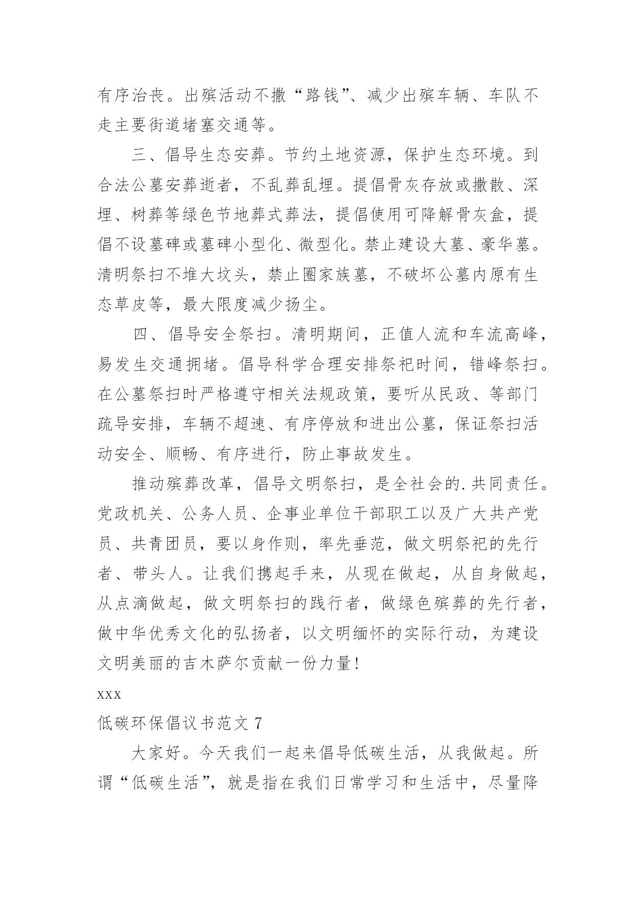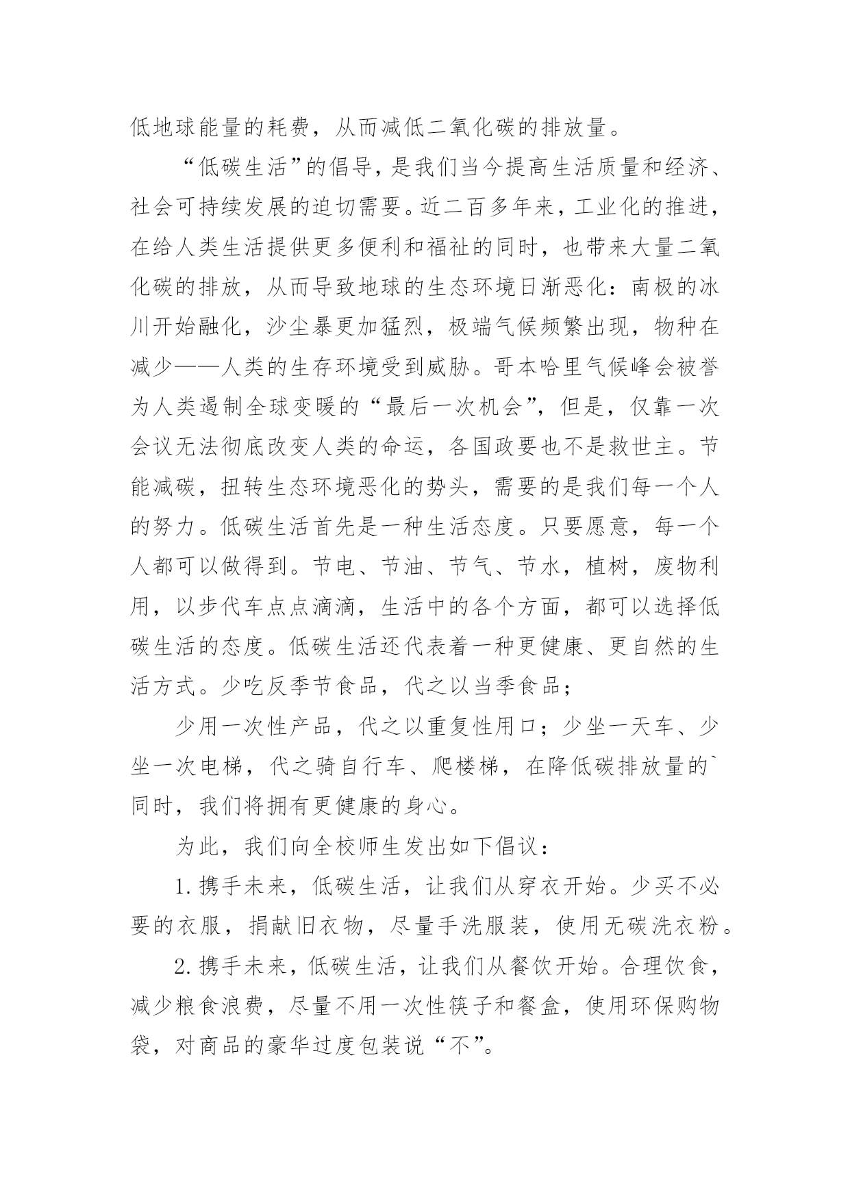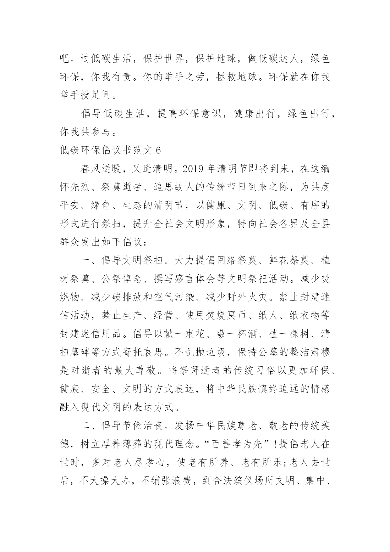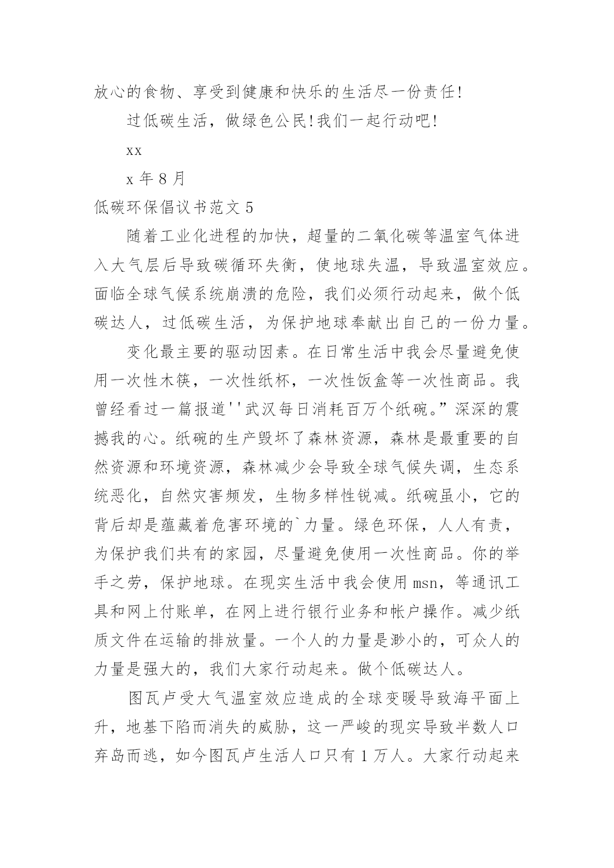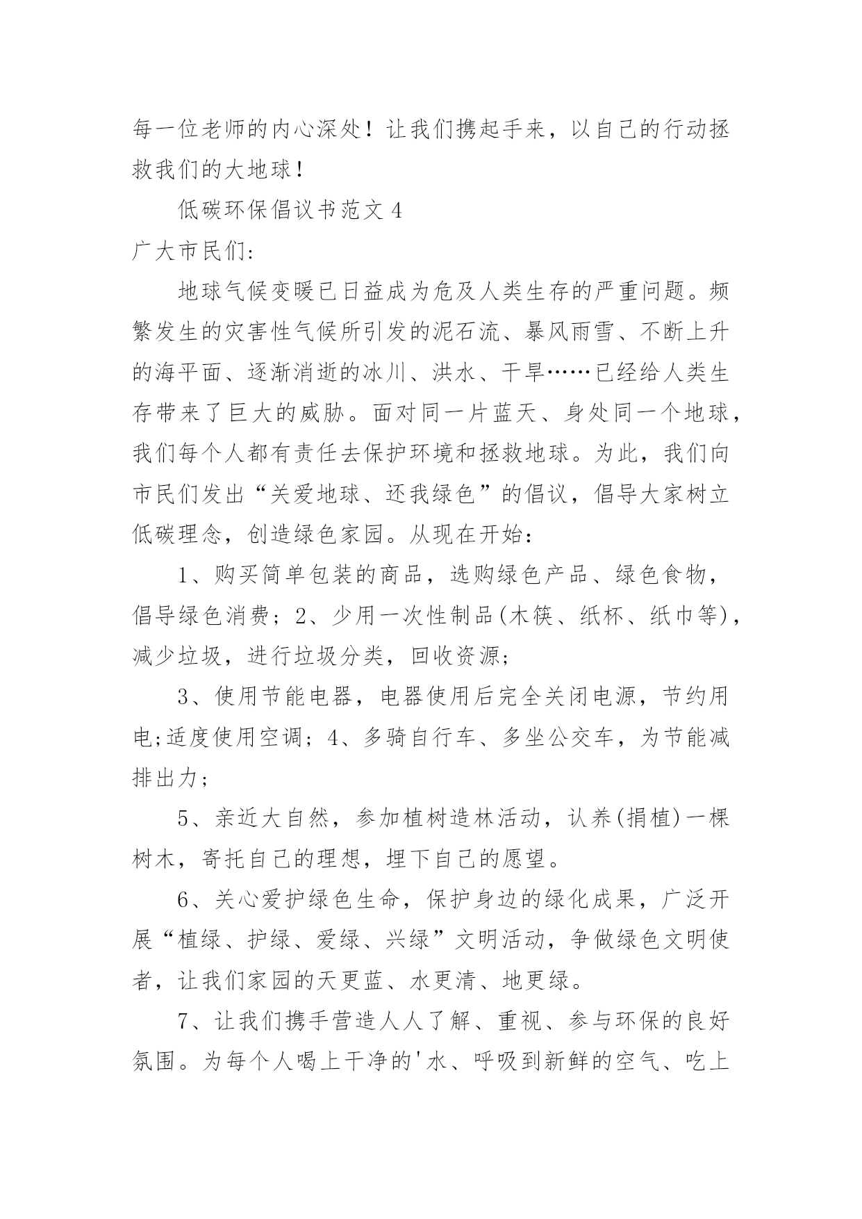 低碳环保倡议书低碳环保倡议书范文在当今社会生活中,用到倡议书的地方越来越多,倡议书不是对某个人或某一小集体而发的,它的受众往往是广大群众,或是部门的所有人,或是一个地区的所有人,甚至是全国人民。相信写倡议书是一个让许多人都头痛的问题,下面是小编为大家整理的低碳环保倡议书范文,仅供参考,欢迎大家阅读。低碳环保倡议书范文1全体师生:近年,气候变化是当今全球面临的重大挑战。遏制气候变暖,是全人类共同的使命。为了你、为了我、为了他,也为了我们这个赖以生存的地球大家庭,更是为了明天的美好生活,作为当代公民,我们应该积极行动起来,身体力行,共同遏制全球气候变暖。为此,xx市四中向全体师生发出低碳生活,我们行动起来的倡议,号召全体师生要做到:1、在日常工作和生活中,我们每个人都应该主动增强危机意识、节约意识与环保意识,真正了解节能环保对国家及个人的意义。2、时时刻刻注意节约用电,要做到随手关闭电灯、电脑、电视、空调、饮水机等电器设备,做到人走电停。3、购买简单包装的商品,选购绿色产品、绿色食物,倡导绿色消费。4、少用一次性制品(木筷、纸杯、纸巾等),减少垃圾,进行垃圾分类,回收资源。5、多骑自行车、多坐公交车,多爬楼梯,为节能减排出力。6、重复使用纸张,双面打印,多发电子邮件,保护森林。7、参加植树造林活动,在家中,多养几盆花,争做绿色文明使者。8、自备水壶,少喝瓶装水;洗澡时用淋浴方式,并使用节水型浴头;尽量节约自来水。9、做好计划统计,尽量一物多用。学会旧物利用,让有限的资源延长寿命。节约使用不可再生能源,合理应用强再生能源。应对气候环境与减碳节能问题,我们任重道远。每位公民都应积极响应国家的`号召,从现在开始,从一点一滴做起,努力为节能环保多尽一份心,多出一份力。让我们每一个人都成为低碳生活的倡导者,成为低碳理念的传播者,成为低碳生活方式的践行者,共同携起手来建设我们的绿色低碳新家园!倡议人:20xx年xx月xx日低碳环保倡议书范文2各位同事:有效降低碳排放量,不仅仅是国际和国家的事情,为了我们的`生存环境不再加速恶化,我们每一个地方、每一个部门、每一个人都应该积极行动起来,想尽一切办法减少碳排放量。长期以来的高碳排放,破坏了大气,破坏了自然生态系统,我们的生存环境已经受到威胁。所以倡议大家:1.请尽量少乘电梯,多爬楼梯。员工平时工作去各楼层,请务必不乘电梯,使用楼梯,特别是相隔1、2个楼层的,步行上下楼梯,一方面锻炼身体,一方面节能环保。2.节约用电。员工下班请随手关闭各种电器电源;各独立办公室使用人离开时请及时关闭电灯和空调;冬、夏两个空调季节,出入办公区域请随手关门,减少电能的浪费;3.节约用纸。平时复印和打印请尽量使用二手纸,多用电邮、msn等即时通讯工具,最好少使用传真机和打印机;各级各部门尽量少使用纸质文件,只下发电子文档。各楼层的洗手间的擦手纸、卫生纸请务必合理使用,杜绝浪费,保护森林、保护环境;4.节约用水。在茶水间的水斗用完水,确保龙头完全关闭后离开;请大家积极响应倡议内容,从我做起,保护环境,节约资源,善待地球。华东总经办20xx年11月8日低碳环保倡议书范文3老师、同学们大家好:当我们在惬意的美景中郊游时,可曾想过由于人类的很多行为导致我们的地球环境逐渐恶化;可曾想过气候变幻无常、水土流失严重、温室效应明显、耕地沙化蔓延、生存环境日益恶化已经严重威胁着全人类的健康与生命。保护环境、爱护环境、清洁环境、美化环境,环保意识的深入和普及将是灭绝任何灾害侵蚀地球的原动力。地球气候变暖已日益成为危及人类生存的严重问题。频繁发生的.灾害性气候所引发的泥石流、暴风雨雪、不断上升的海平面、逐渐消逝的冰川、洪水、干旱……已经给人类生存带来了巨大的威胁。面对同一片蓝天、身处同一个地球气候系统之中,我们每个人都有责任去保护环境和拯救地球。为此,我们向全体老师和同学发出“关爱地球、还我绿色”的倡议,号召全体师生行动起来,做到:一、在日常工作和生活中,时时刻刻注意节约用电,教师要做到在午休和下班后关掉办公室电脑、电灯、电扇等电源。学生要做到随手关闭教室电灯、多媒体等电器设备。手机一旦充电完成,立即拔掉充电插头。二、少开或低档使用电扇等家用电器,每天节省0。5度电。不频繁开关电器也可有效节电。三、参加植树造林活动,多养几盆花,保护公共绿色,争做绿色文明使者。四、多步行,多骑自行车,多爬楼梯,为节能减排出力。五、不用一次性木筷、纸杯;少用纸巾,重拾手帕。不用塑料袋,自带环保袋。保护森林,低碳生活。六、每张纸都双面写字,相当于保留下半片原本将被砍掉的森林。七、减少垃圾,进行垃圾分类,回收资源。八、自备水壶,少喝瓶装水。九、洗漱时使用节水型浴头且间断放水,搓洗时及时关水,避免过长时间冲淋。盆浴后的水可用于洗衣、洗车、冲洗厕所、拖地等十、主动检