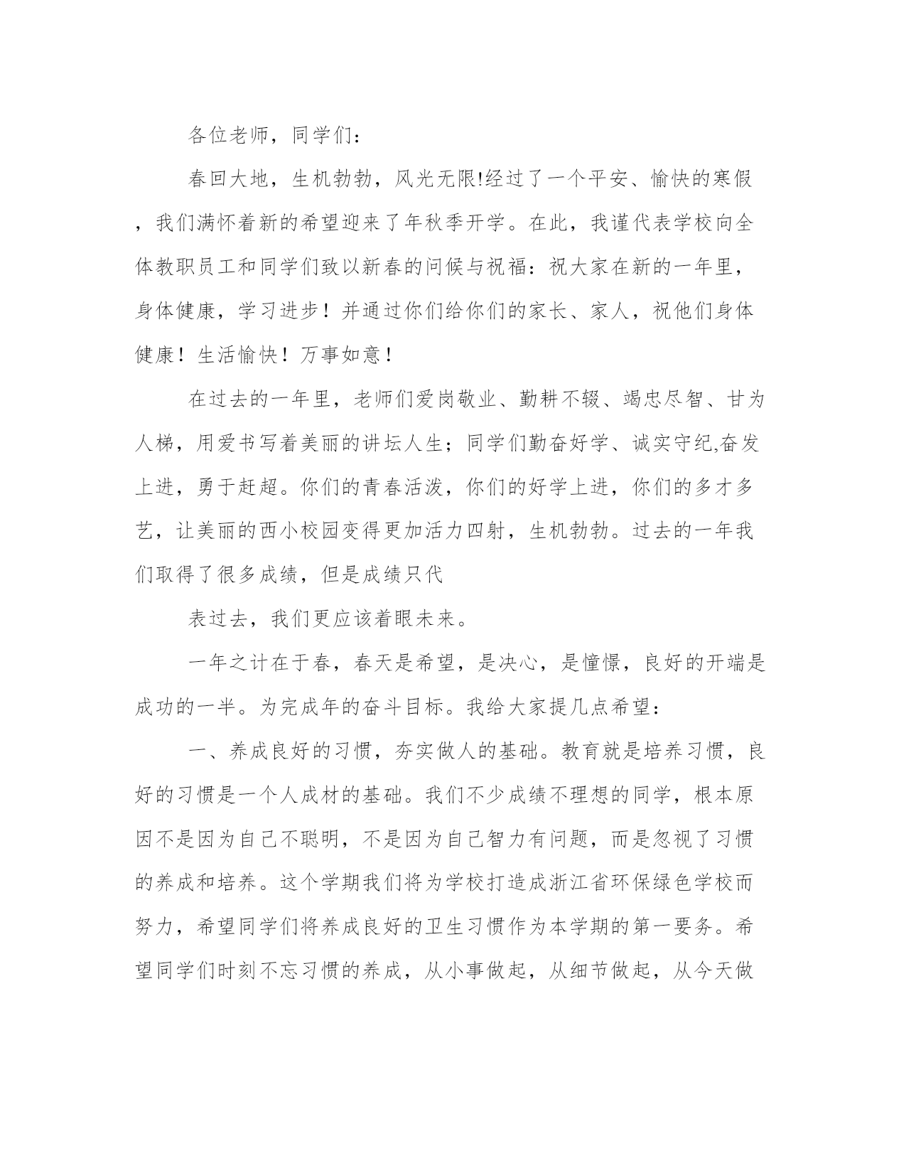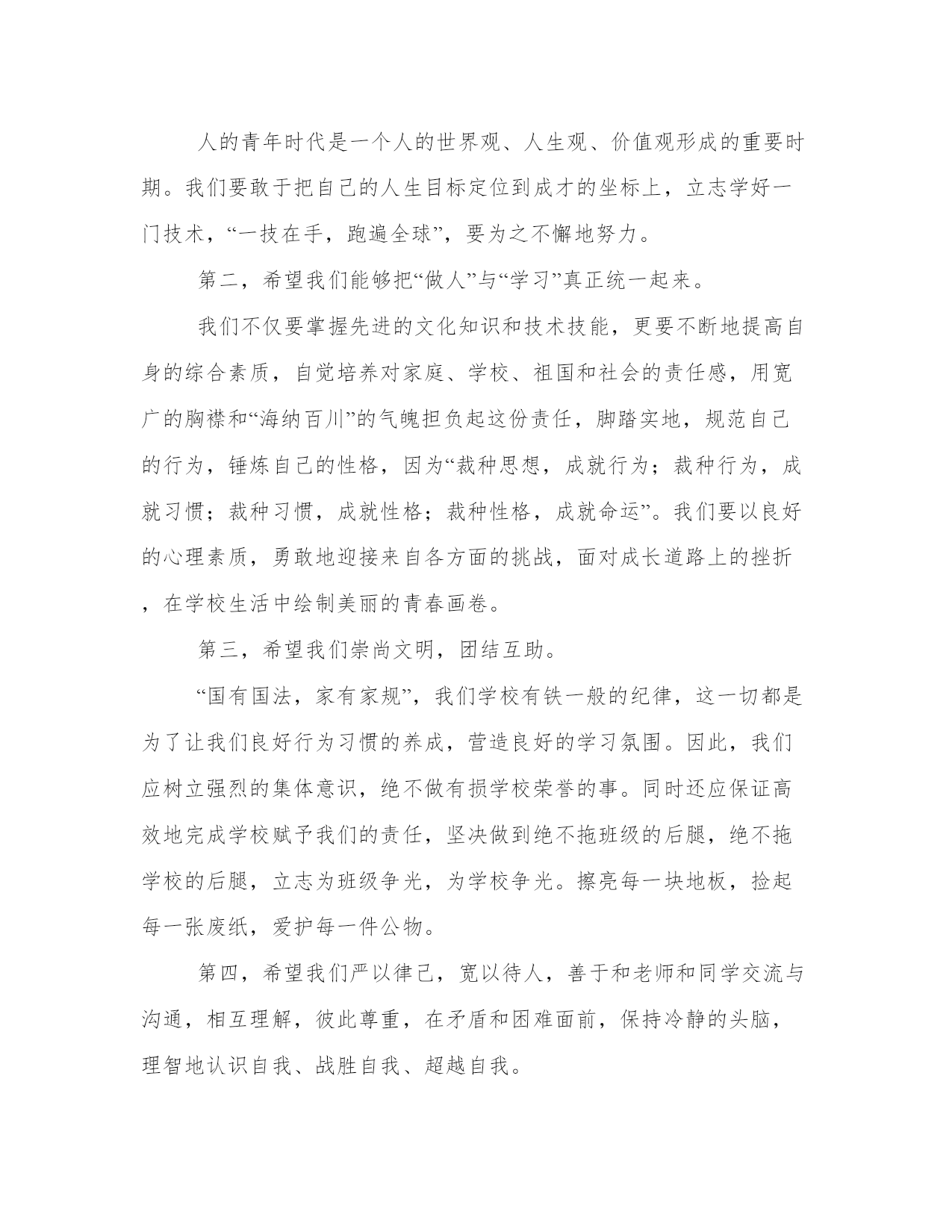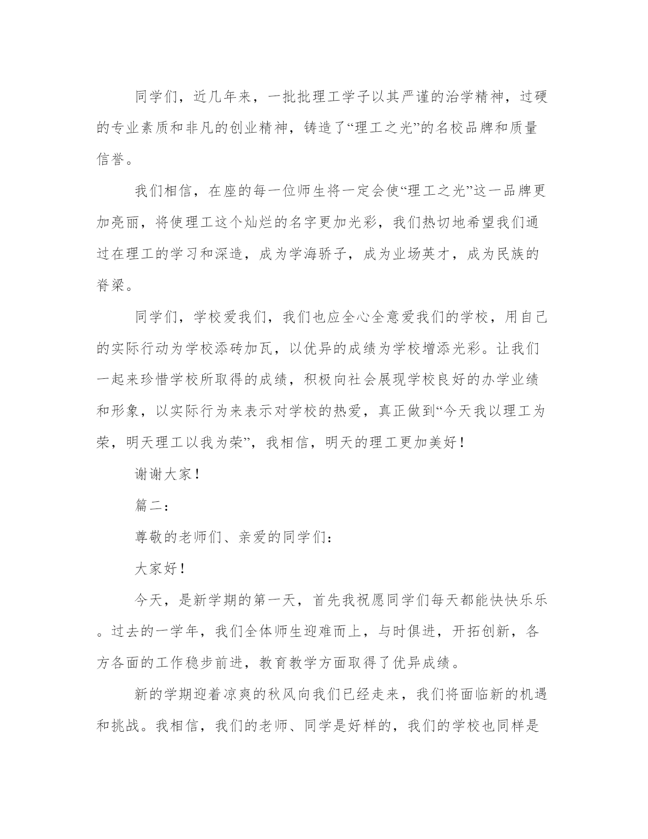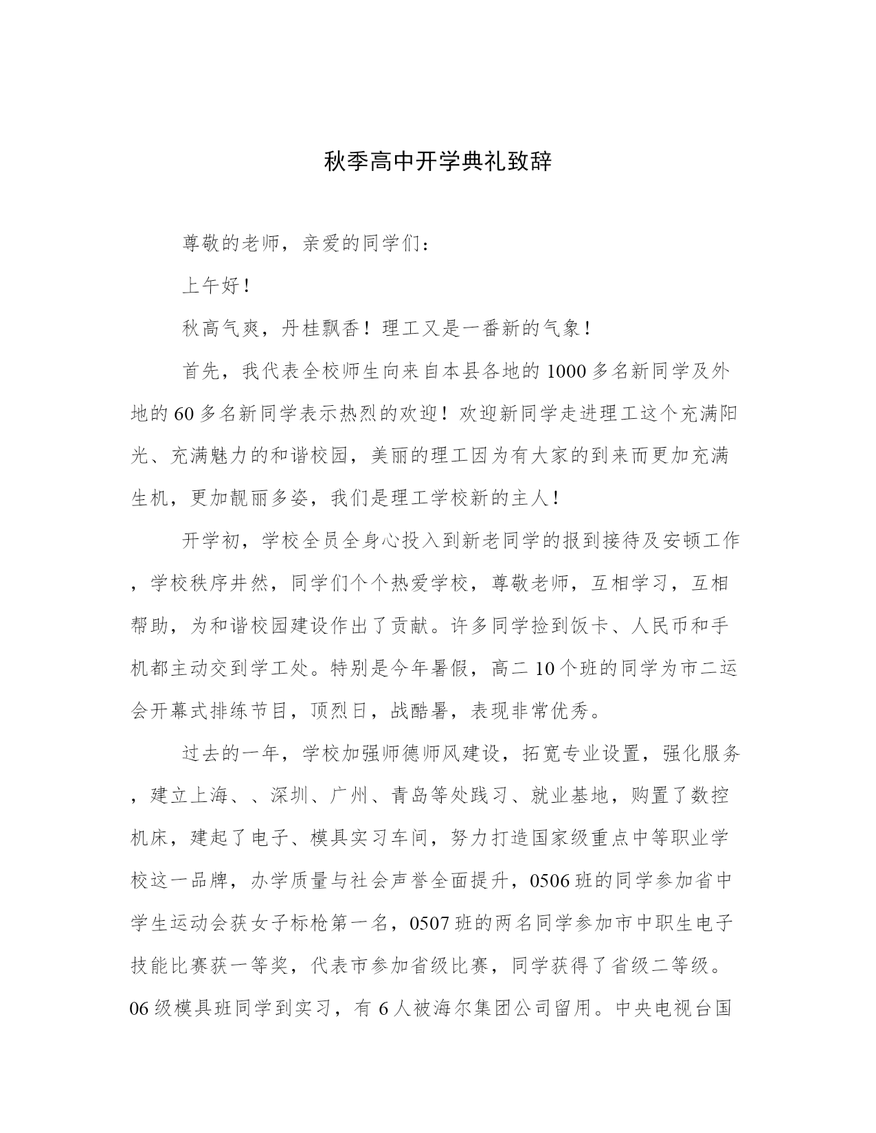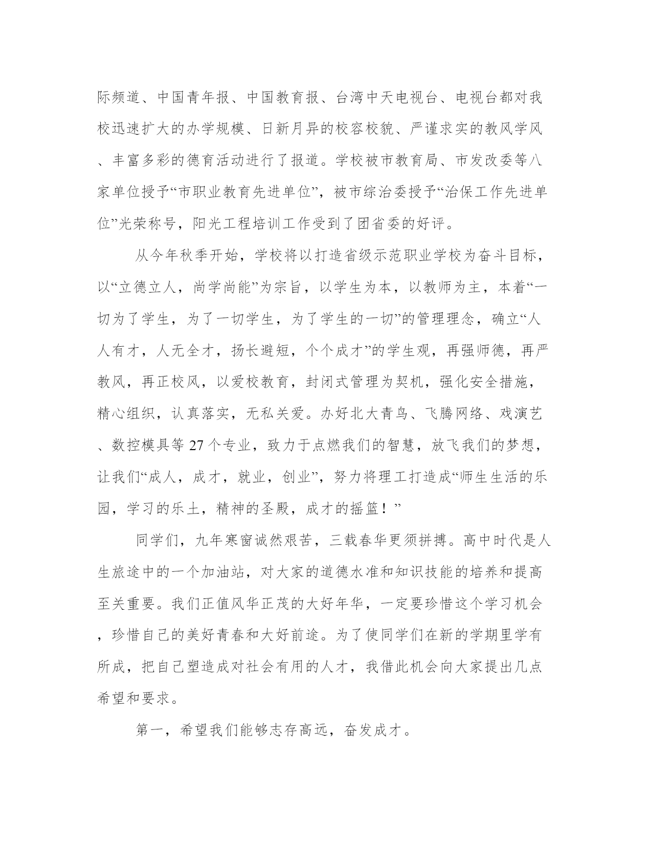 秋季高中开学典礼致辞尊敬的老师,亲爱的同学们:上午好!秋高气爽,丹桂飘香!理工又是一番新的气象!首先,我代表全校师生向来自本县各地的1000多名新同学及外地的60多名新同学表示热烈的欢迎!欢迎新同学走进理工这个充满阳光、充满魅力的和谐校园,美丽的理工因为有大家的到来而更加充满生机,更加靓丽多姿,我们是理工学校新的主人!开学初,学校全员全身心投入到新老同学的报到接待及安顿工作,学校秩序井然,同学们个个热爱学校,尊敬老师,互相学习,互相帮助,为和谐校园建设作出了贡献。许多同学捡到饭卡、人民币和手机都主动交到学工处。特别是今年暑假,高二10个班的同学为市二运会开幕式排练节目,顶烈日,战酷暑,表现非常优秀。过去的一年,学校加强师德师风建设,拓宽专业设置,强化服务,建立上海、、深圳、广州、青岛等处践习、就业基地,购置了数控机床,建起了电子、模具实习车间,努力打造国家级重点中等职业学校这一品牌,办学质量与社会声誉全面提升,0506班的同学参加省中学生运动会获女子标枪第一名,0507班的两名同学参加市中职生电子技能比赛获一等奖,代表市参加省级比赛,同学获得了省级二等级。06级模具班同学到实习,有6人被海尔集团公司留用。中央电视台国际频道、中国青年报、中国教育报、台湾中天电视台、电视台都对我校迅速扩大的办学规模、日新月异的校容校貌、严谨求实的教风学风、丰富多彩的德育活动进行了报道。学校被市教育局、市发改委等八家单位授予“市职业教育先进单位”,被市综治委授予“治保工作先进单位”光荣称号,阳光工程培训工作受到了团省委的好评。从今年秋季开始,学校将以打造省级示范职业学校为奋斗目标,以“立德立人,尚学尚能”为宗旨,以学生为本,以教师为主,本着“一切为了学生,为了一切学生,为了学生的一切”的管理理念,确立“人人有才,人无全才,扬长避短,个个成才”的学生观,再强师德,再严教风,再正校风,以爱校教育,封闭式管理为契机,强化安全措施,精心组织,认真落实,无私关爱。办好北大青鸟、飞腾网络、戏演艺、数控模具等27个专业,致力于点燃我们的智慧,放飞我们的梦想,让我们“成人,成才,就业,创业”,努力将理工打造成“师生生活的乐园,学习的乐土,精神的圣殿,成才的摇篮!”同学们,九年寒窗诚然艰苦,三载春华更须拼搏。高中时代是人生旅途中的一个加油站,对大家的道德水准和知识技能的培养和提高至关重要。我们正值风华正茂的大好年华,一定要珍惜这个学习机会,珍惜自己的美好青春和大好前途。为了使同学们在新的学期里学有所成,把自己塑造成对社会有用的人才,我借此机会向大家提出几点希望和要求。第一,希望我们能够志存高远,奋发成才。人的青年时代是一个人的世界观、人生观、价值观形成的重要时期。我们要敢于把自己的人生目标定位到成才的坐标上,立志学好一门技术,“一技在手,跑遍全球”,要为之不懈地努力。第二,希望我们能够把“做人”与“学习”真正统一起来。我们不仅要掌握先进的文化知识和技术技能,更要不断地提高自身的综合素质,自觉培养对家庭、学校、祖国和社会的责任感,用宽广的胸襟和“海纳百川”的气魄担负起这份责任,脚踏实地,规范自己的行为,锤炼自己的性格,因为“裁种思想,成就行为;裁种行为,成就习惯;裁种习惯,成就性格;裁种性格,成就命运”。我们要以良好的心理素质,勇敢地迎接来自各方面的挑战,面对成长道路上的挫折,在学校生活中绘制美丽的青春画卷。第三,希望我们崇尚文明,团结互助。“国有国法,家有家规”,我们学校有铁一般的纪律,这一切都是为了让我们良好行为习惯的养成,营造良好的学习氛围。因此,我们应树立强烈的集体意识,绝不做有损学校荣誉的事。同时还应保证高效地完成学校赋予我们的责任,坚决做到绝不拖班级的后腿,绝不拖学校的后腿,立志为班级争光,为学校争光。擦亮每一块地板,捡起每一张废纸,爱护每一件公物。第四,希望我们严以律己,宽以待人,善于和老师和同学交流与沟通,相互理解,彼此尊重,在矛盾和困难面前,保持冷静的头脑,理智地认识自我、战胜自我、超越自我。同学们,近几年来,一批批理工学子以其严谨的治学精神,过硬的专业素质和非凡的创业精神,铸造了“理工之光”的名校品牌和质量信誉。我们相信,在座的每一位师生将一定会使“理工之光”这一品牌更加亮丽,将使理工这个灿烂的名字更加光彩,我们热切地希望我们通过在理工的学习和深造,成为学海骄子,成为业场英才,成为民族的脊梁。同学们,学校爱我们,我们也应全心全意爱我们的学校,用自己的实际行动为学校添砖加瓦,以优异的成绩为学校增添光彩。让我们一起来珍惜学校所取得的成绩,积极向社会展现学校良好的办学业绩和形象,以实际行为来表示对学校的热爱,真正做到“今天我以理工为荣,明天理工以我为荣”,我相信,明天的理工更加美好!谢谢大家!篇二:尊敬的老师们