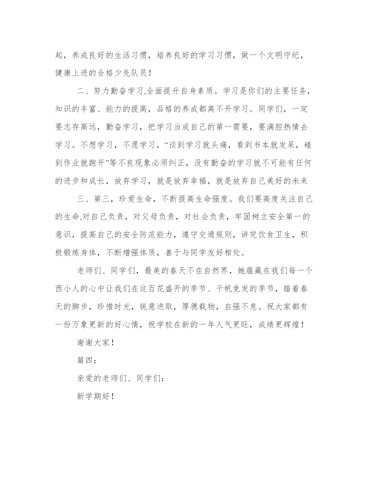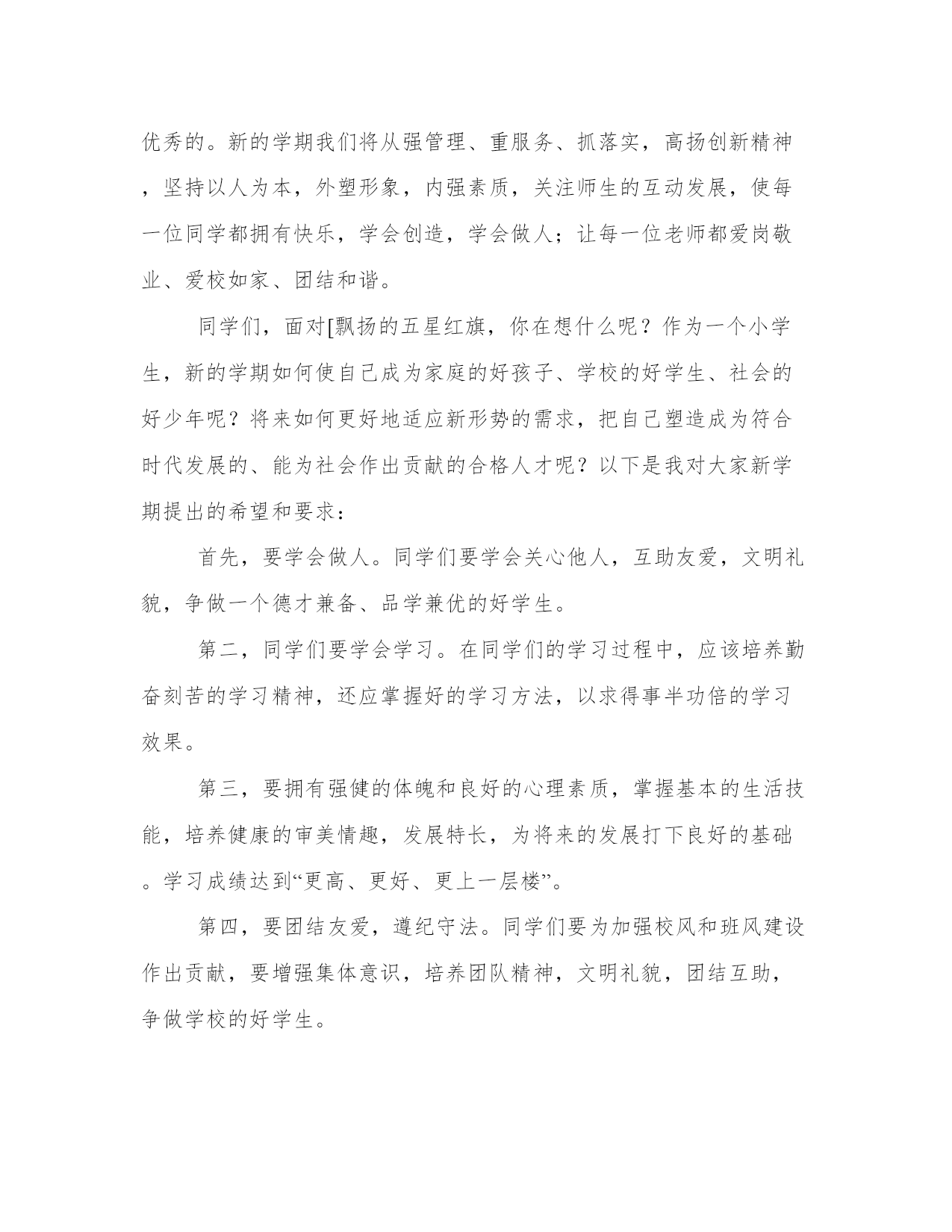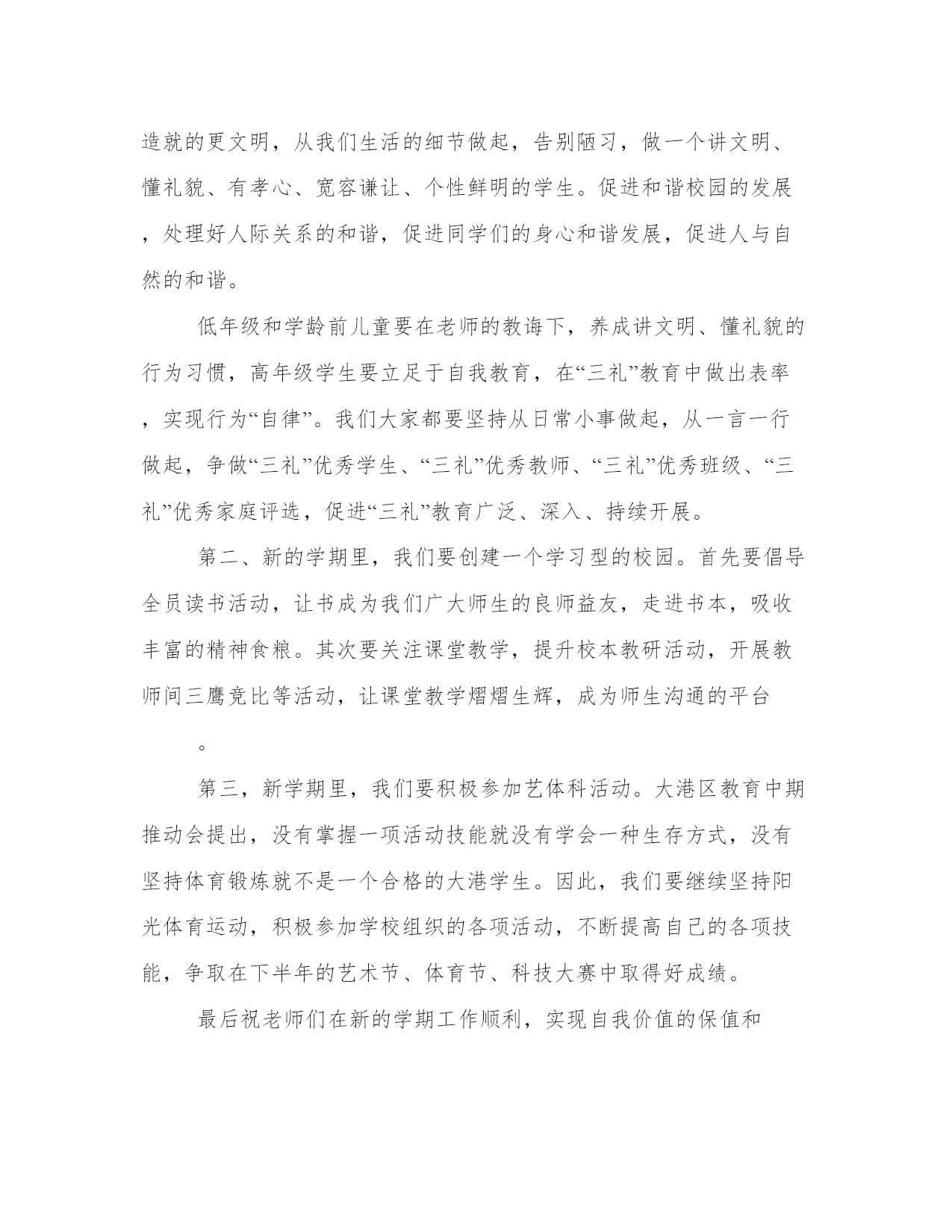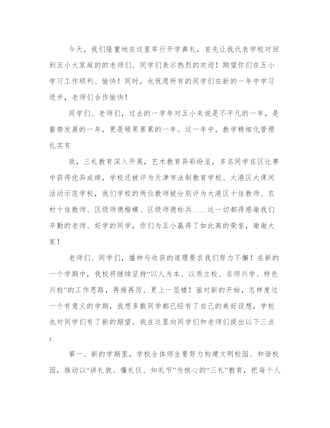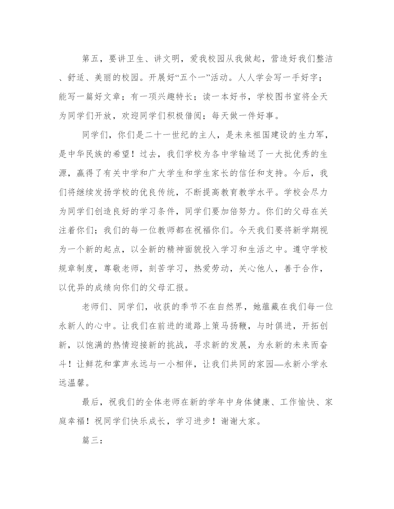 秋季高中开学典礼致辞尊敬的老师,亲爱的同学们:上午好!秋高气爽,丹桂飘香!理工又是一番新的气象!首先,我代表全校师生向来自本县各地的1000多名新同学及外地的60多名新同学表示热烈的欢迎!欢迎新同学走进理工这个充满阳光、充满魅力的和谐校园,美丽的理工因为有大家的到来而更加充满生机,更加靓丽多姿,我们是理工学校新的主人!开学初,学校全员全身心投入到新老同学的报到接待及安顿工作,学校秩序井然,同学们个个热爱学校,尊敬老师,互相学习,互相帮助,为和谐校园建设作出了贡献。许多同学捡到饭卡、人民币和手机都主动交到学工处。特别是今年暑假,高二10个班的同学为市二运会开幕式排练节目,顶烈日,战酷暑,表现非常优秀。过去的一年,学校加强师德师风建设,拓宽专业设置,强化服务,建立上海、、深圳、广州、青岛等处践习、就业基地,购置了数控机床,建起了电子、模具实习车间,努力打造国家级重点中等职业学校这一品牌,办学质量与社会声誉全面提升,0506班的同学参加省中学生运动会获女子标枪第一名,0507班的两名同学参加市中职生电子技能比赛获一等奖,代表市参加省级比赛,同学获得了省级二等级。06级模具班同学到实习,有6人被海尔集团公司留用。中央电视台国际频道、中国青年报、中国教育报、台湾中天电视台、电视台都对我校迅速扩大的办学规模、日新月异的校容校貌、严谨求实的教风学风、丰富多彩的德育活动进行了报道。学校被市教育局、市发改委等八家单位授予“市职业教育先进单位”,被市综治委授予“治保工作先进单位”光荣称号,阳光工程培训工作受到了团省委的好评。从今年秋季开始,学校将以打造省级示范职业学校为奋斗目标,以“立德立人,尚学尚能”为宗旨,以学生为本,以教师为主,本着“一切为了学生,为了一切学生,为了学生的一切”的管理理念,确立“人人有才,人无全才,扬长避短,个个成才”的学生观,再强师德,再严教风,再正校风,以爱校教育,封闭式管理为契机,强化安全措施,精心组织,认真落实,无私关爱。办好北大青鸟、飞腾网络、戏演艺、数控模具等27个专业,致力于点燃我们的智慧,放飞我们的梦想,让我们“成人,成才,就业,创业”,努力将理工打造成“师生生活的乐园,学习的乐土,精神的圣殿,成才的摇篮!”同学们,九年寒窗诚然艰苦,三载春华更须拼搏。高中时代是人生旅途中的一个加油站,对大家的道德水准和知识技能的培养和提高至关重要。我们正值风华正茂的大好年华,一定要珍惜这个学习机会,珍惜自己的美好青春和大好前途。为了使同学们在新的学期里学有所成,把自己塑造成对社会有用的人才,我借此机会向大家提出几点希望和要求。第一,希望我们能够志存高远,奋发成才。人的青年时代是一个人的世界观、人生观、价值观形成的重要时期。我们要敢于把自己的人生目标定位到成才的坐标上,立志学好一门技术,“一技在手,跑遍全球”,要为之不懈地努力。第二,希望我们能够把“做人”与“学习”真正统一起来。我们不仅要掌握先进的文化知识和技术技能,更要不断地提高自身的综合素质,自觉培养对家庭、学校、祖国和社会的责任感,用宽广的胸襟和“海纳百川”的气魄担负起这份责任,脚踏实地,规范自己的行为,锤炼自己的性格,因为“裁种思想,成就行为;裁种行为,成就习惯;裁种习惯,成就性格;裁种性格,成就命运”。我们要以良好的心理素质,勇敢地迎接来自各方面的挑战,面对成长道路上的挫折,在学校生活中绘制美丽的青春画卷。第三,希望我们崇尚文明,团结互助。“国有国法,家有家规”,我们学校有铁一般的纪律,这一切都是为了让我们良好行为习惯的养成,营造良好的学习氛围。因此,我们应树立强烈的集体意识,绝不做有损学校荣誉的事。同时还应保证高效地完成学校赋予我们的责任,坚决做到绝不拖班级的后腿,绝不拖学校的后腿,立志为班级争光,为学校争光。擦亮每一块地板,捡起每一张废纸,爱护每一件公物。第四,希望我们严以律己,宽以待人,善于和老师和同学交流与沟通,相互理解,彼此尊重,在矛盾和困难面前,保持冷静的头脑,理智地认识自我、战胜自我、超越自我。同学们,近几年来,一批批理工学子以其严谨的治学精神,过硬的专业素质和非凡的创业精神,铸造了“理工之光”的名校品牌和质量信誉。我们相信,在座的每一位师生将一定会使“理工之光”这一品牌更加亮丽,将使理工这个灿烂的名字更加光彩,我们热切地希望我们通过在理工的学习和深造,成为学海骄子,成为业场英才,成为民族的脊梁。同学们,学校爱我们,我们也应全心全意爱我们的学校,用自己的实际行动为学校添砖加瓦,以优异的成绩为学校增添光彩。让我们一起来珍惜学校所取得的成绩,积极向社会展现学校良好的办学业绩和形象,以实际行为来表示对学校的热爱,真正做到“今天我以理工为荣,明天理工以我为荣”,我相信,明天的理工更加美好!谢谢大家!篇二:尊敬的老师们